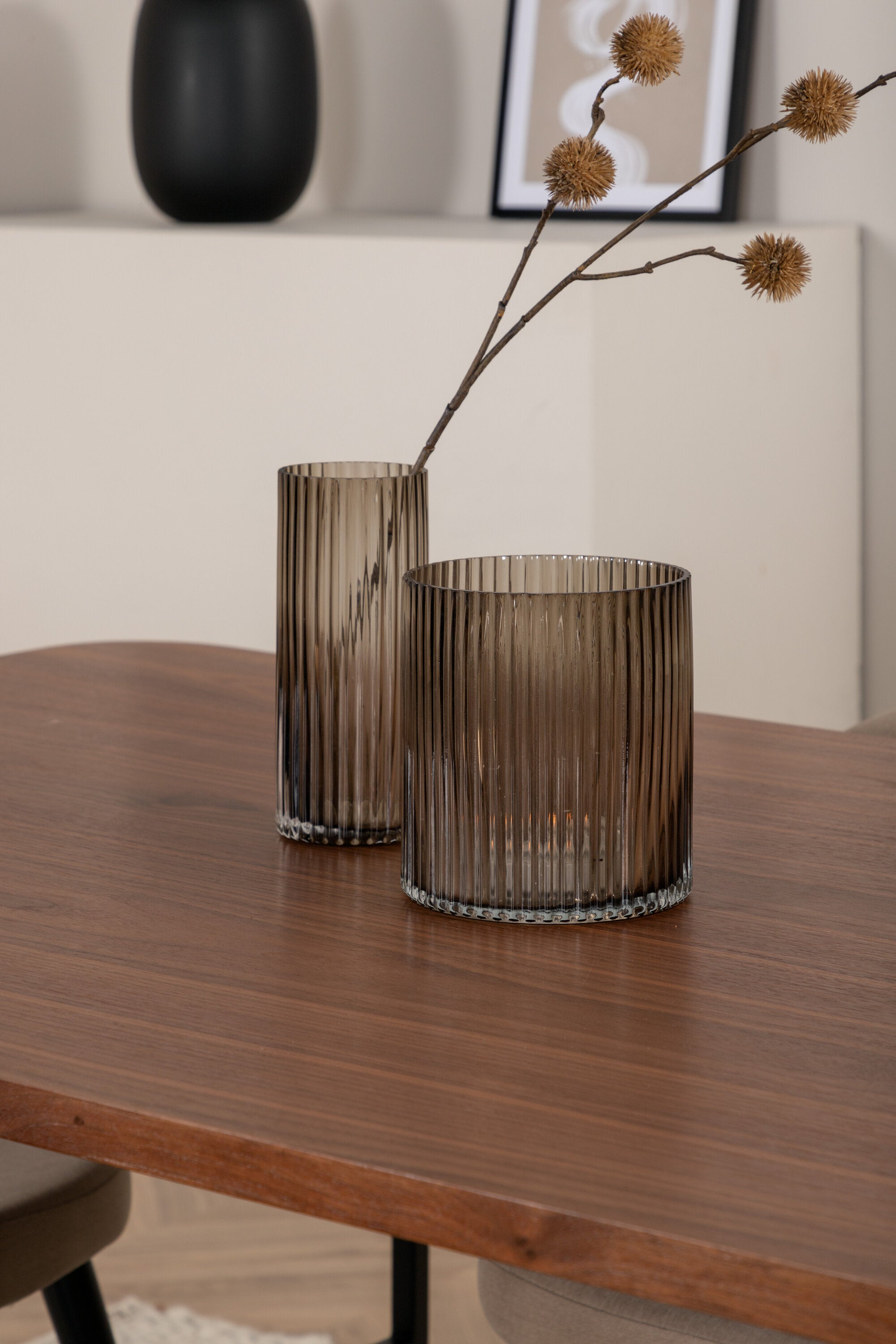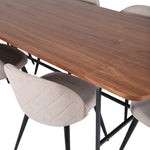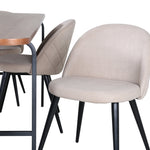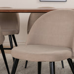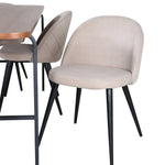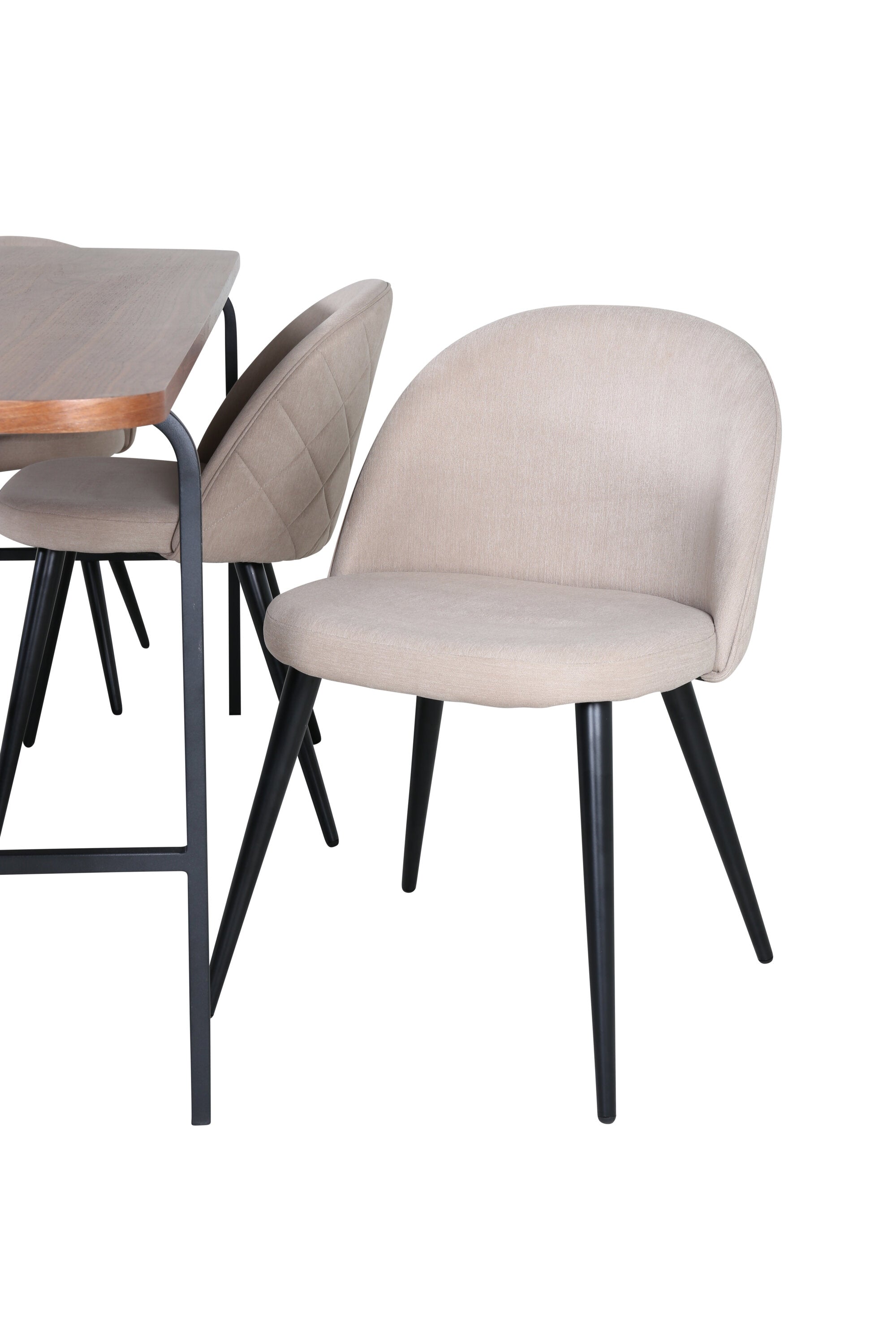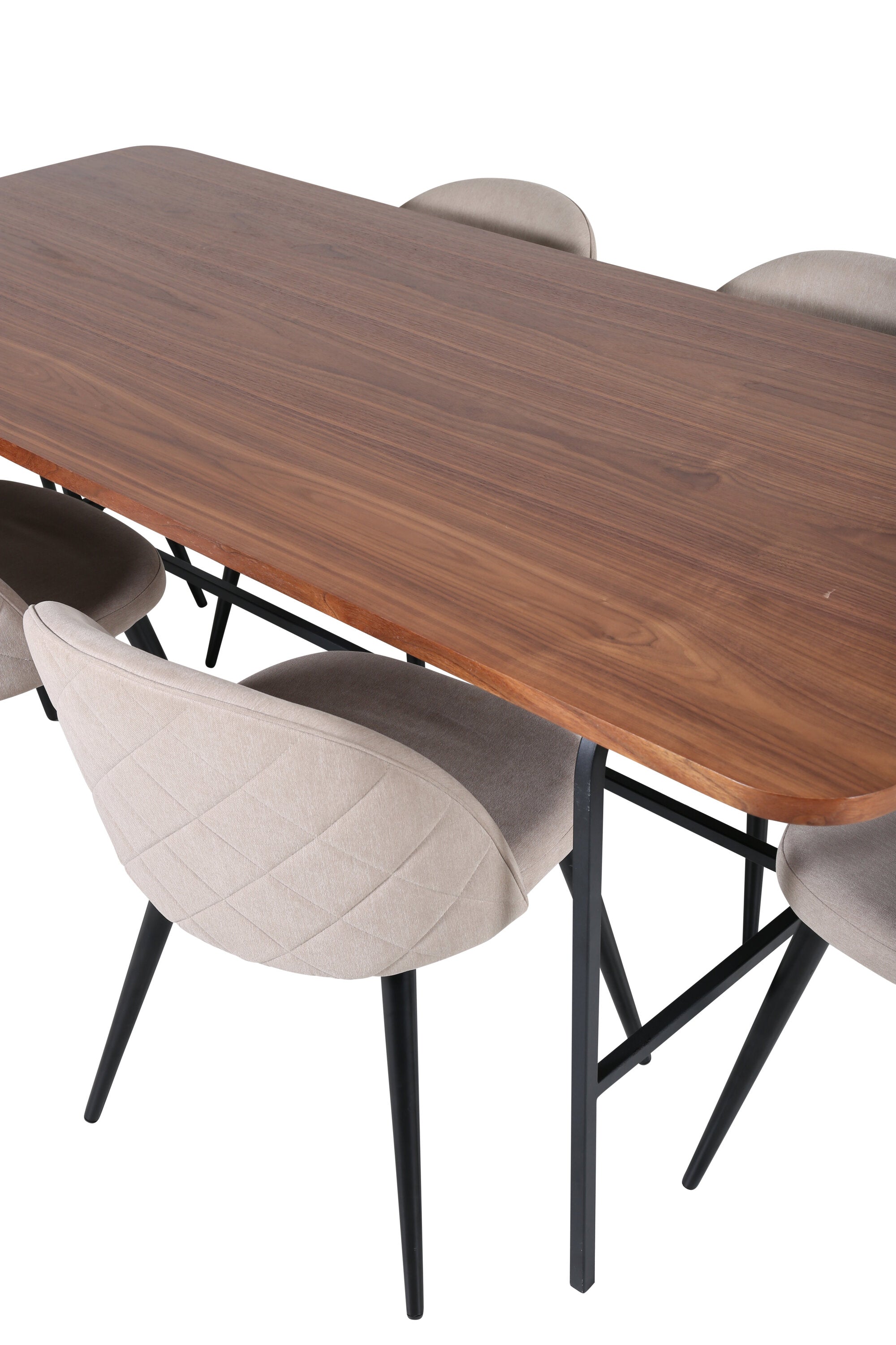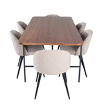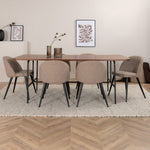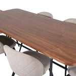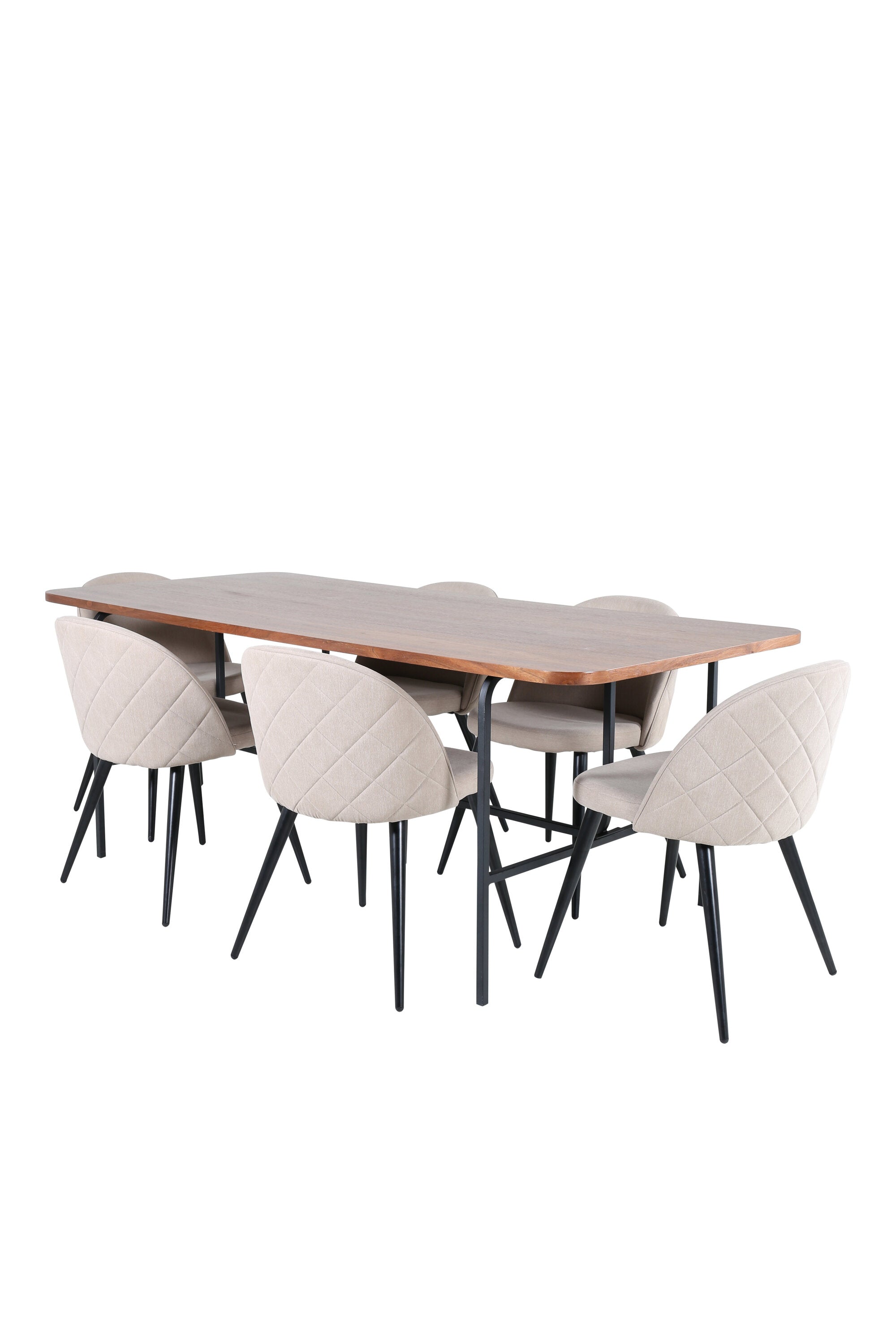 S klasickým a moderním jídelním stolem Uno se může celá rodina sejít k večeři a společenskému setkání. Stůl má obdélníkový design s lehce zaoblenými rohy, horní deskou z MDF v barvě ořechu s dýhou a stylovým podvozkem v černém kovu. Rozměry stolu: Délka: 200 cm, Šířka: 90 cm, Výška: 74 cm. Sladěno s 6 jídelními židlemi Velvet Stitches s rozšířenými černými kostmi z kovu a sedáky z béžového polyesterového plátna s dekorativním stehem. Rozměry židle: Výška: 76,5 cm, výška sedáku: 46,5 cm, šířka: 50 cm, hloubka: 57 cm. Nechte se inspirovat poutavou skupinou jídel!