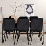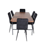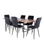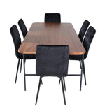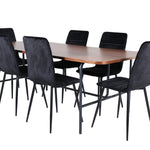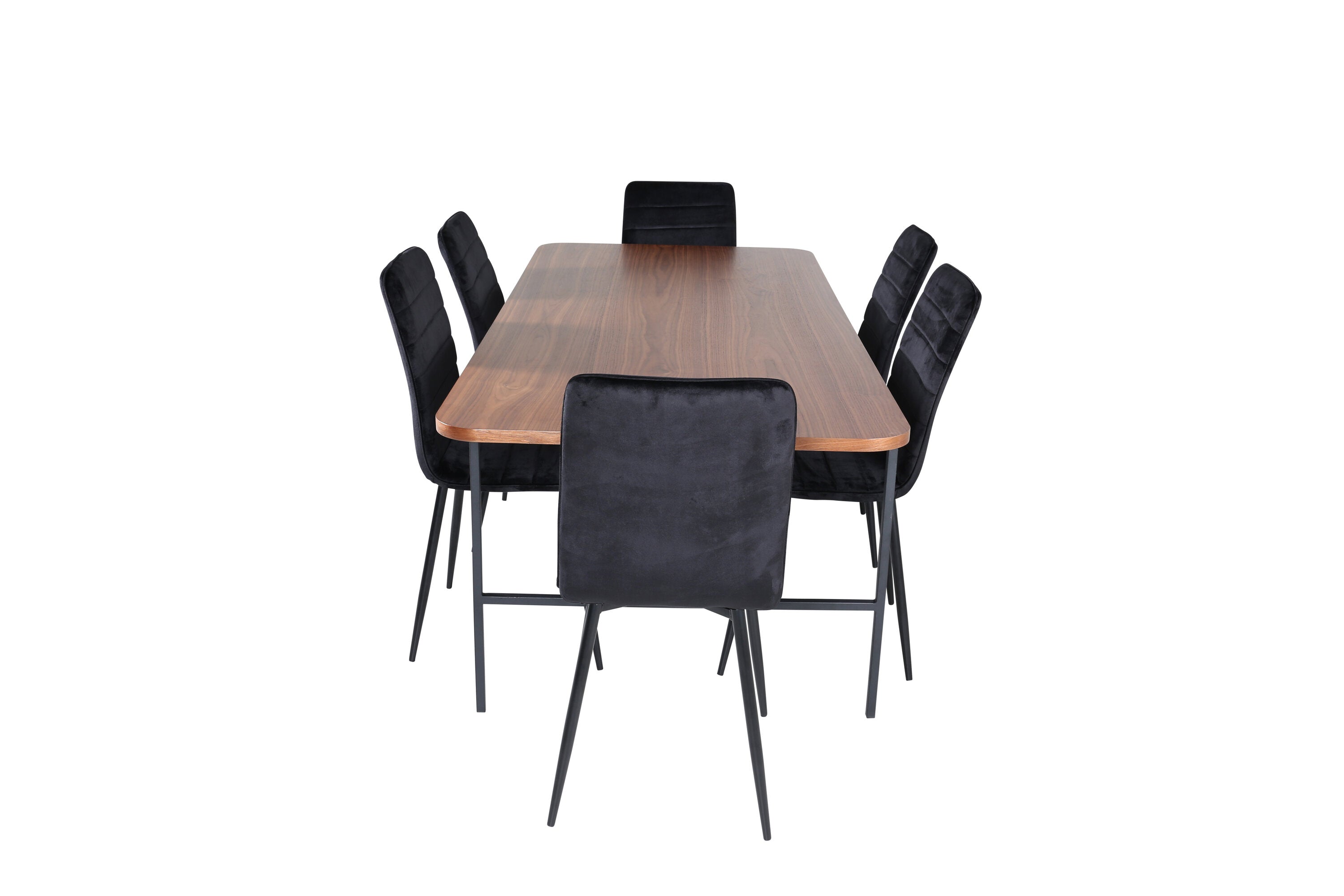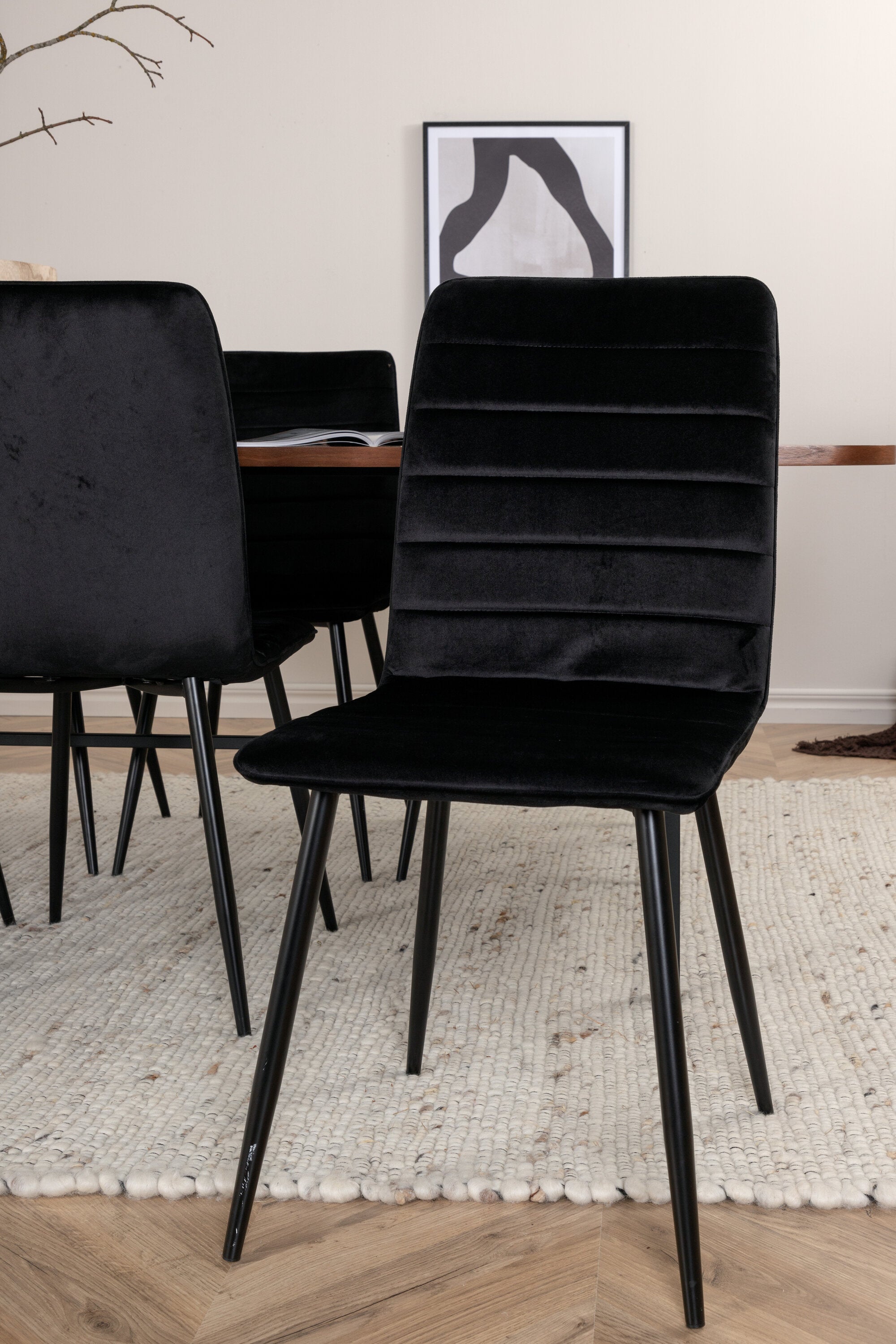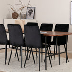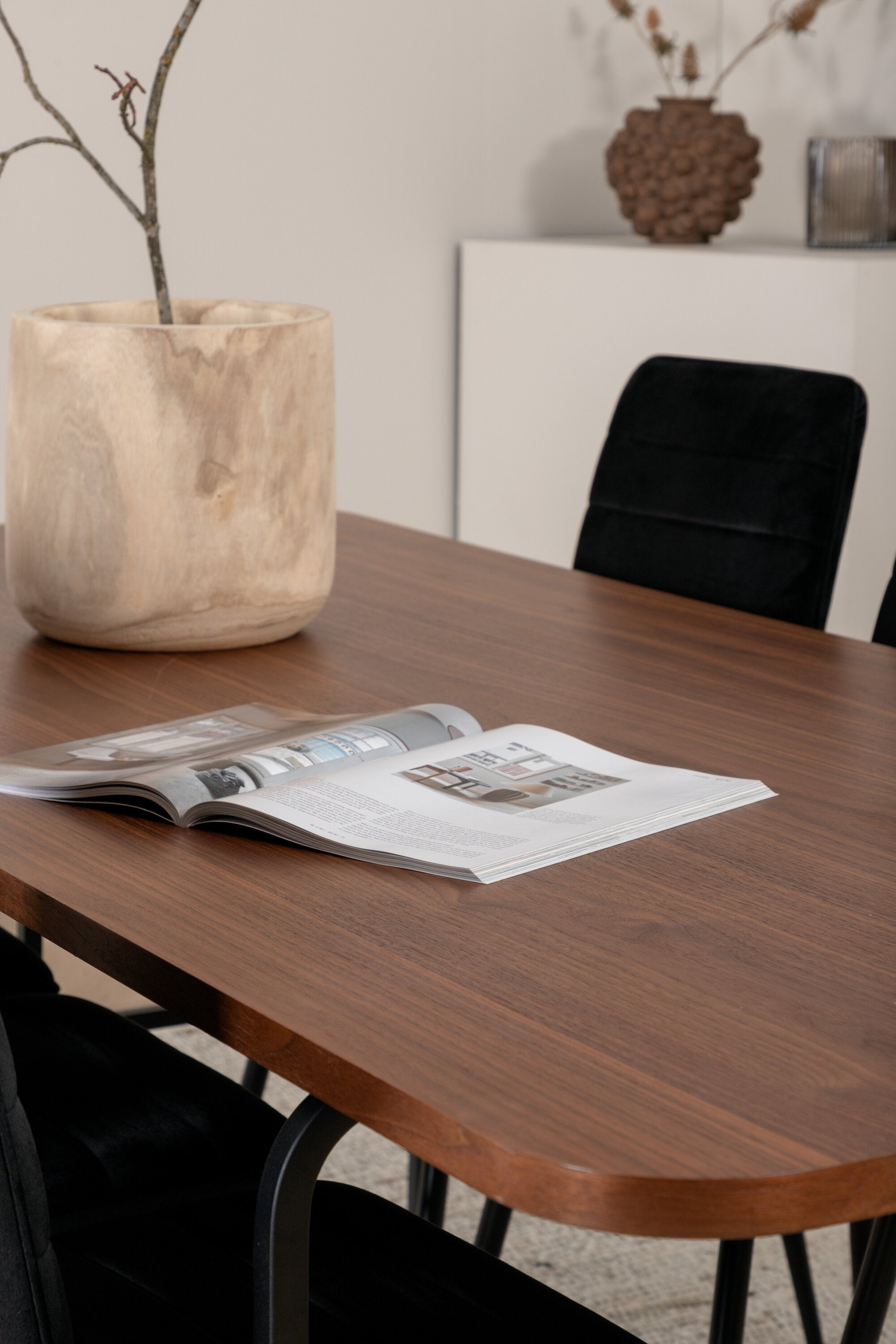 Poutavá skupina potravin se zaměřením na pohodlí a eleganci! Jídelní stůl Uno má obdélníkový design s lehce zaoblenými rohy, horní deskou z MDF v barvě ořechu s dýhou a stylovým podvozkem v černém kovu. Rozměry stolu: Délka: 200 cm, Šířka: 90 cm, Výška: 74 cm. Zde je stůl dokonale sladěn se 6 luxusními jídelními židlemi Windu v nafoukané černé sametové látce a nohami židle ze železa. Rozměry židle: Výška: 94 cm, výška sedáku: 47 cm, šířka: 43 cm, hloubka: 49 cm. Nechte toto krásně sladěné jídlo s moderním nádechem stát se přirozeným místem setkávání u vás doma.