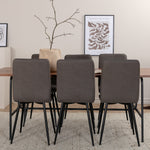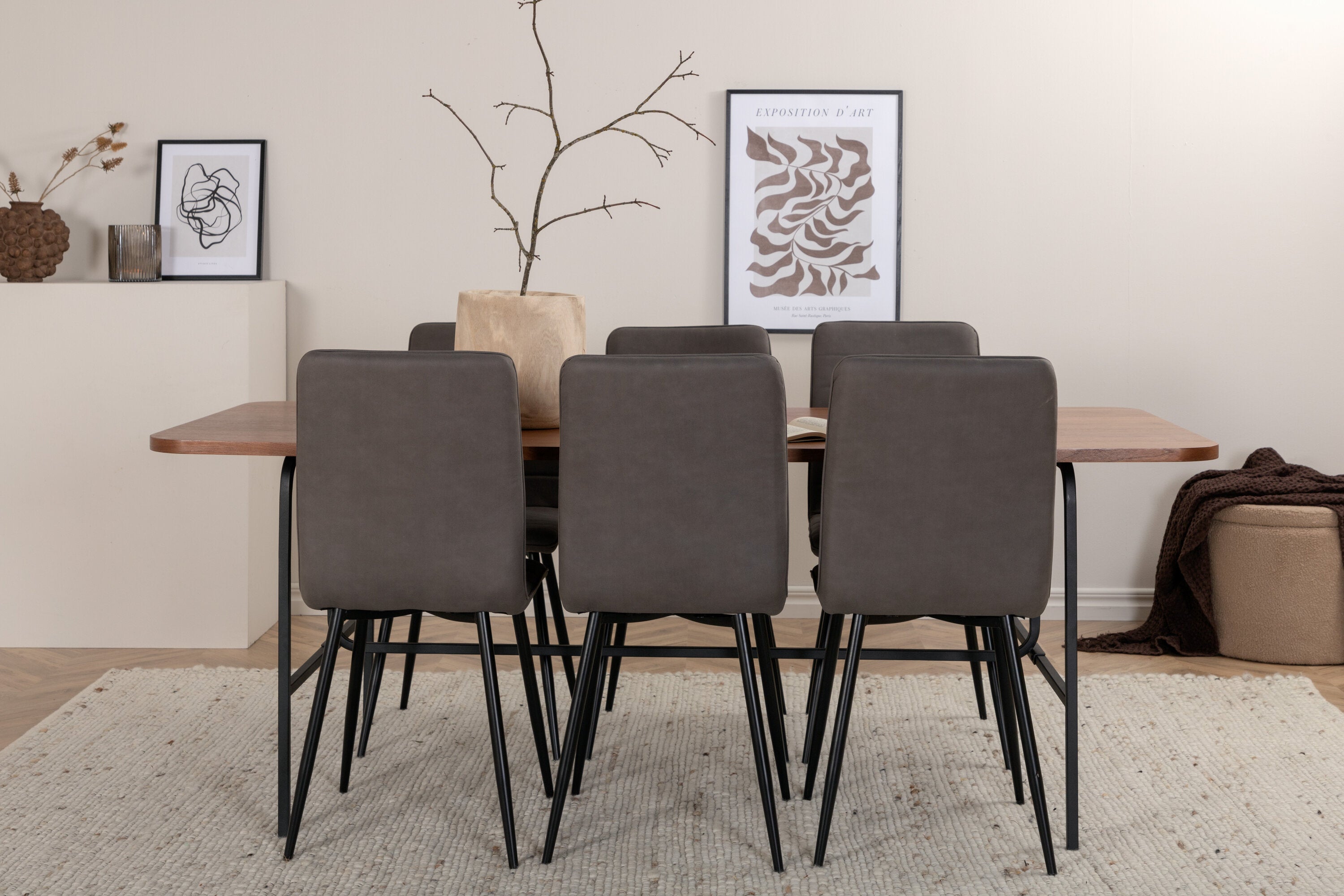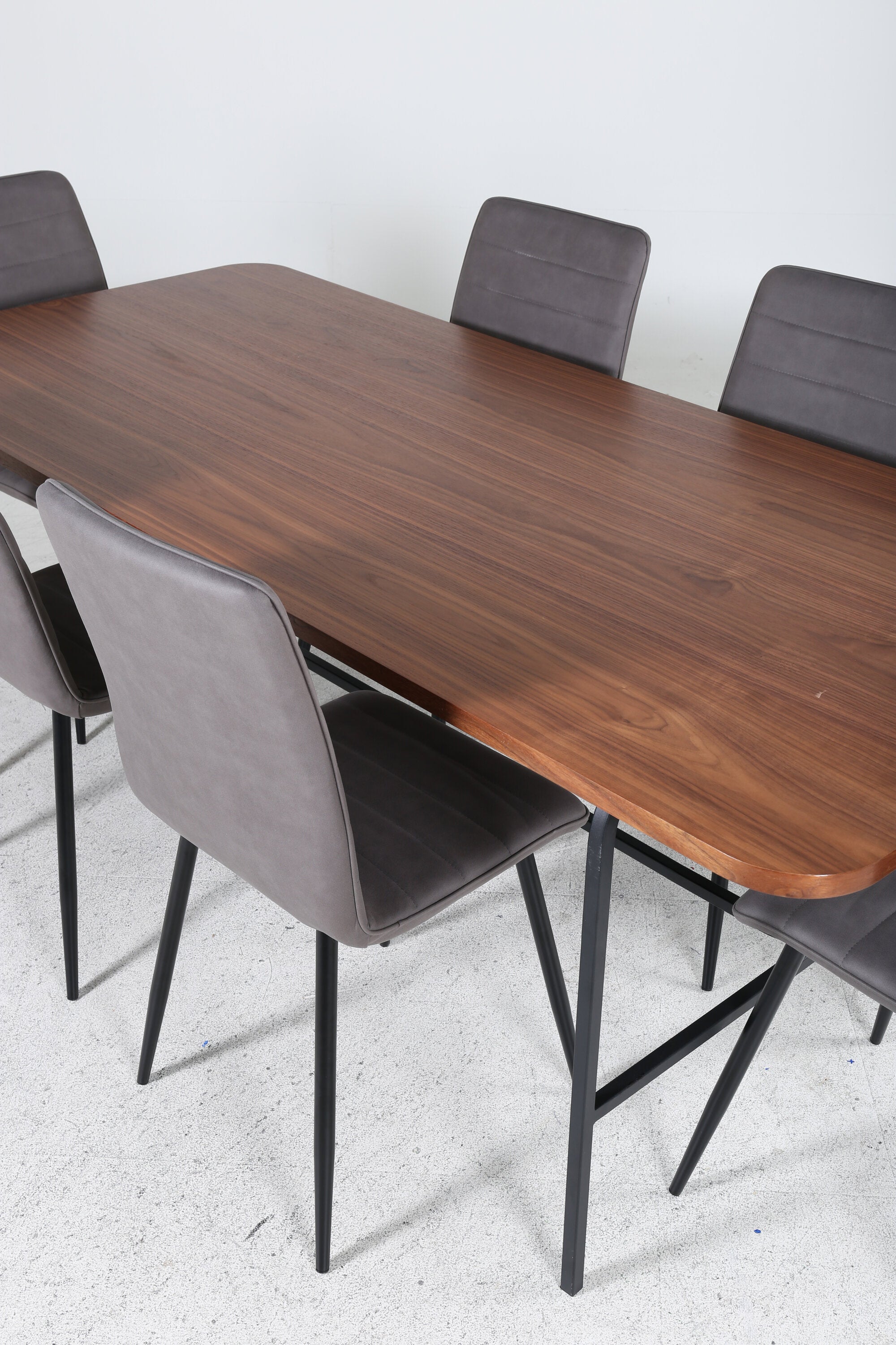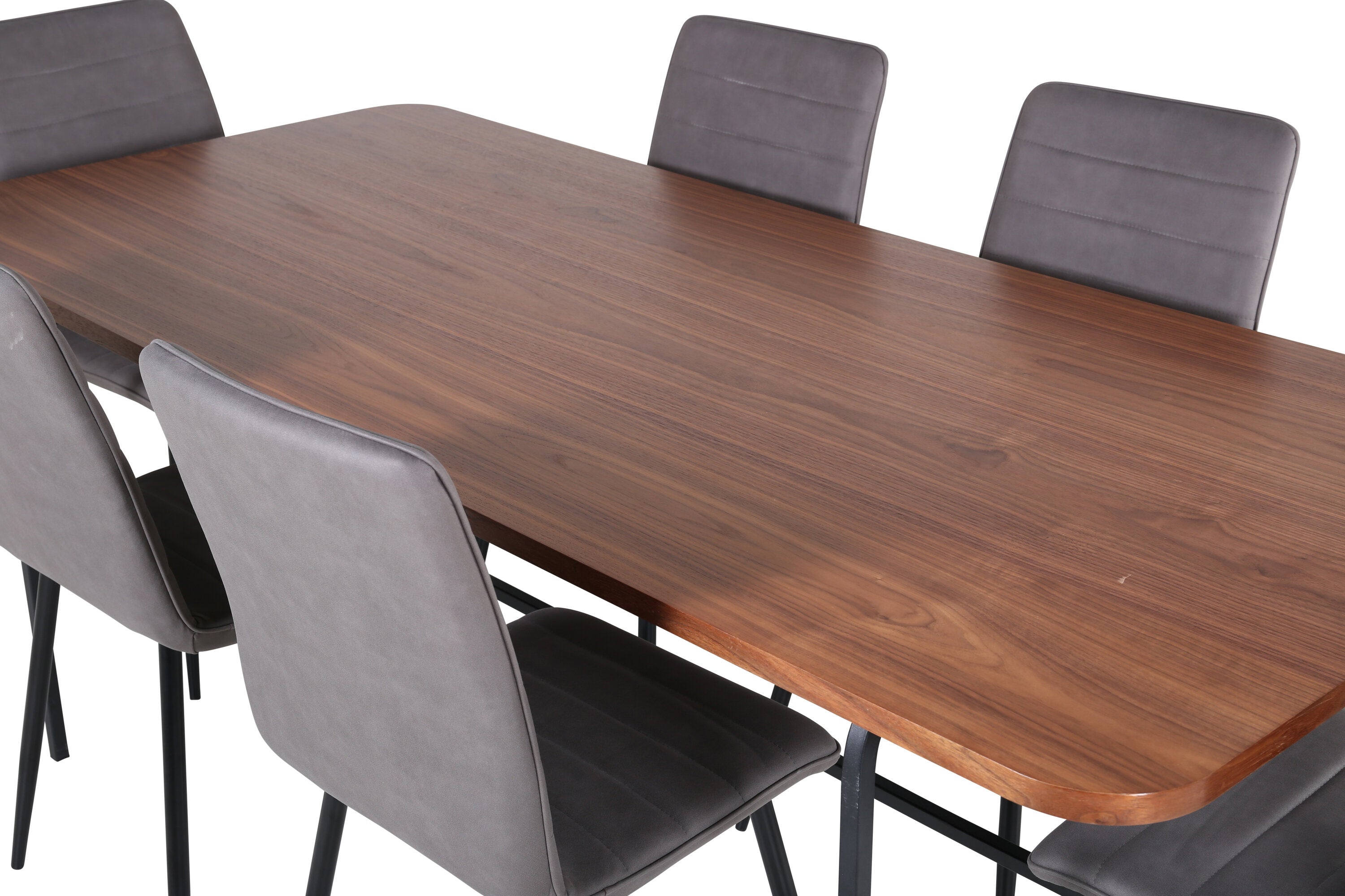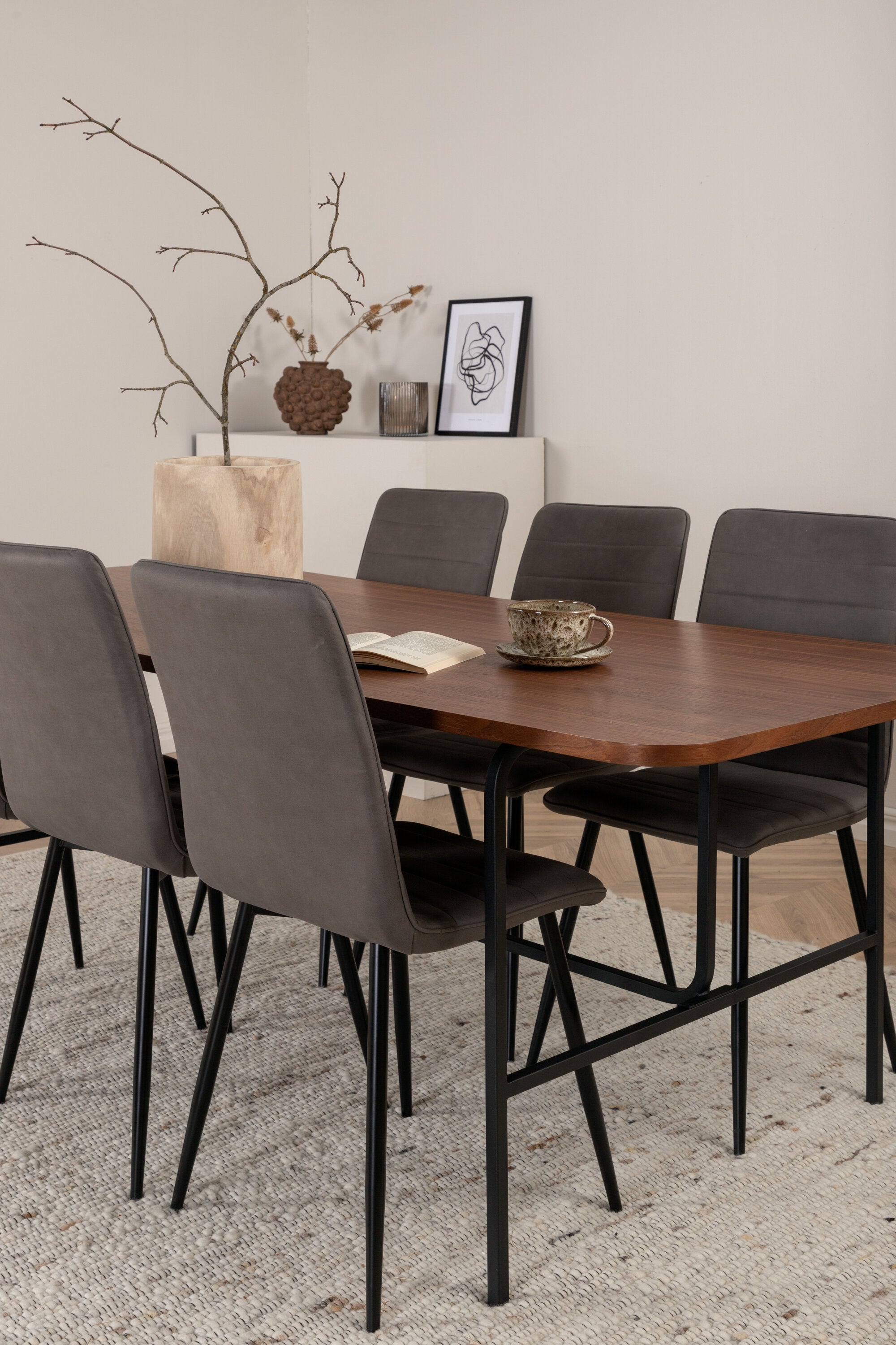 Poutavá skupina potravin se zaměřením na pohodlí a eleganci! Jídelní stůl Uno má obdélníkový design s lehce zaoblenými rohy, horní deskou z MDF v barvě ořechu s dýhou a stylovým podvozkem v černém kovu. Rozměry stolu: Délka: 200 cm, Šířka: 90 cm, Výška: 74 cm. Zde se stůl dokonale hodí k 6 luxusním jídelním židlím Windu. Nohy židle jsou z černého železa a sedáky z lahodného šedého mikrovlákna. Rozměry židle: Výška: 94 cm, výška sedáku: 47 cm, šířka: 43 cm, hloubka: 49 cm. Nechte toto krásně sladěné jídlo s moderním nádechem stát se přirozeným místem setkávání u vás doma.