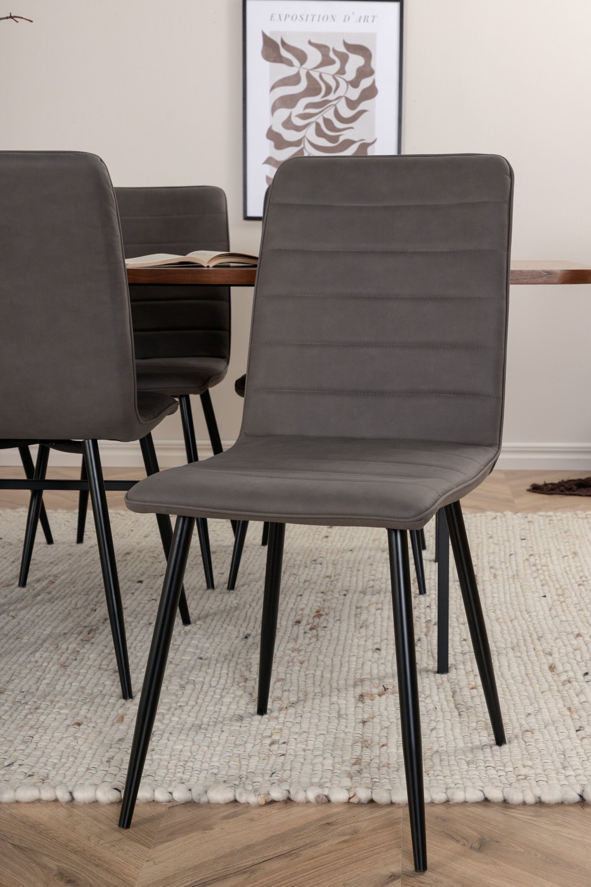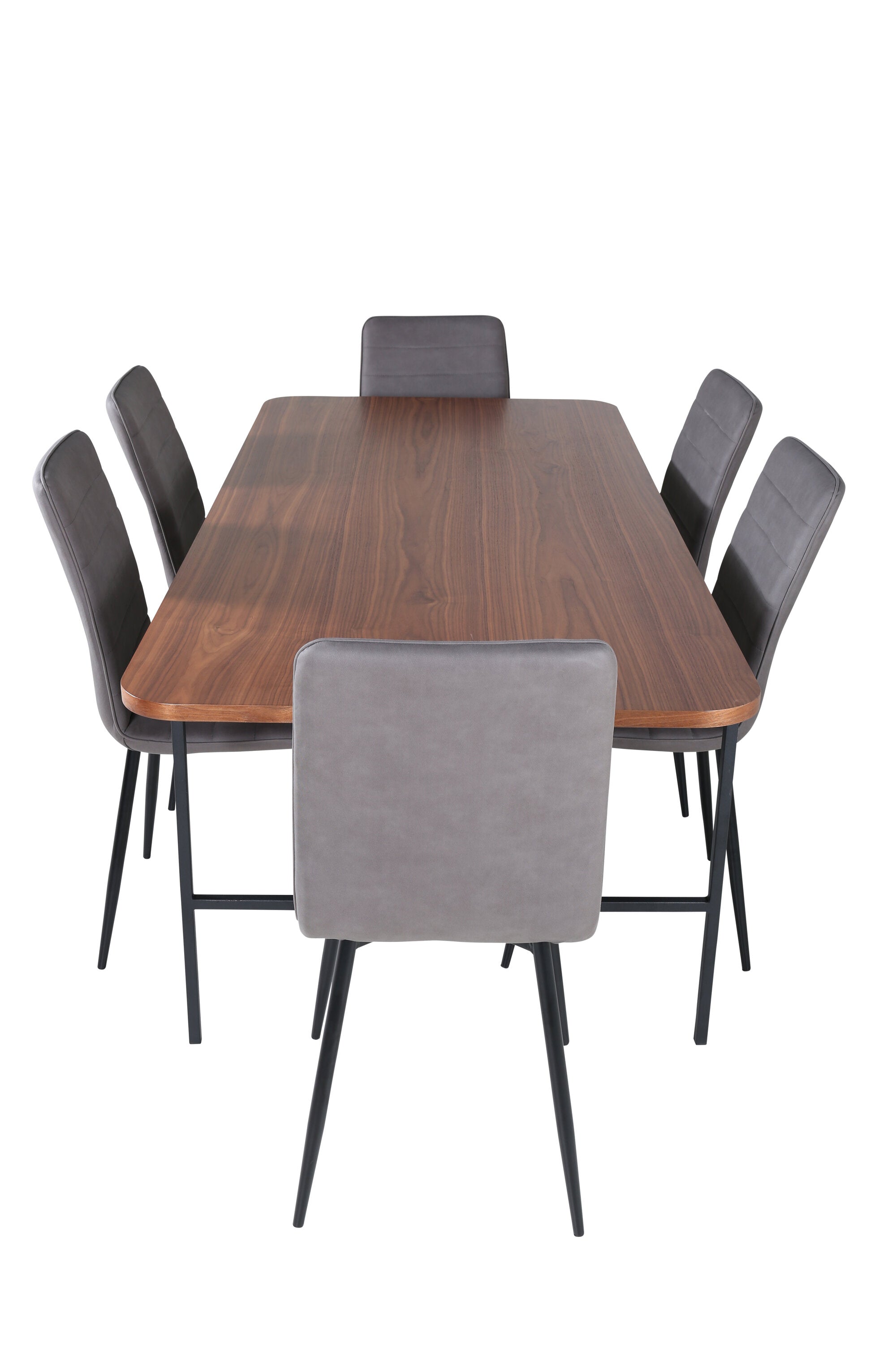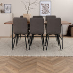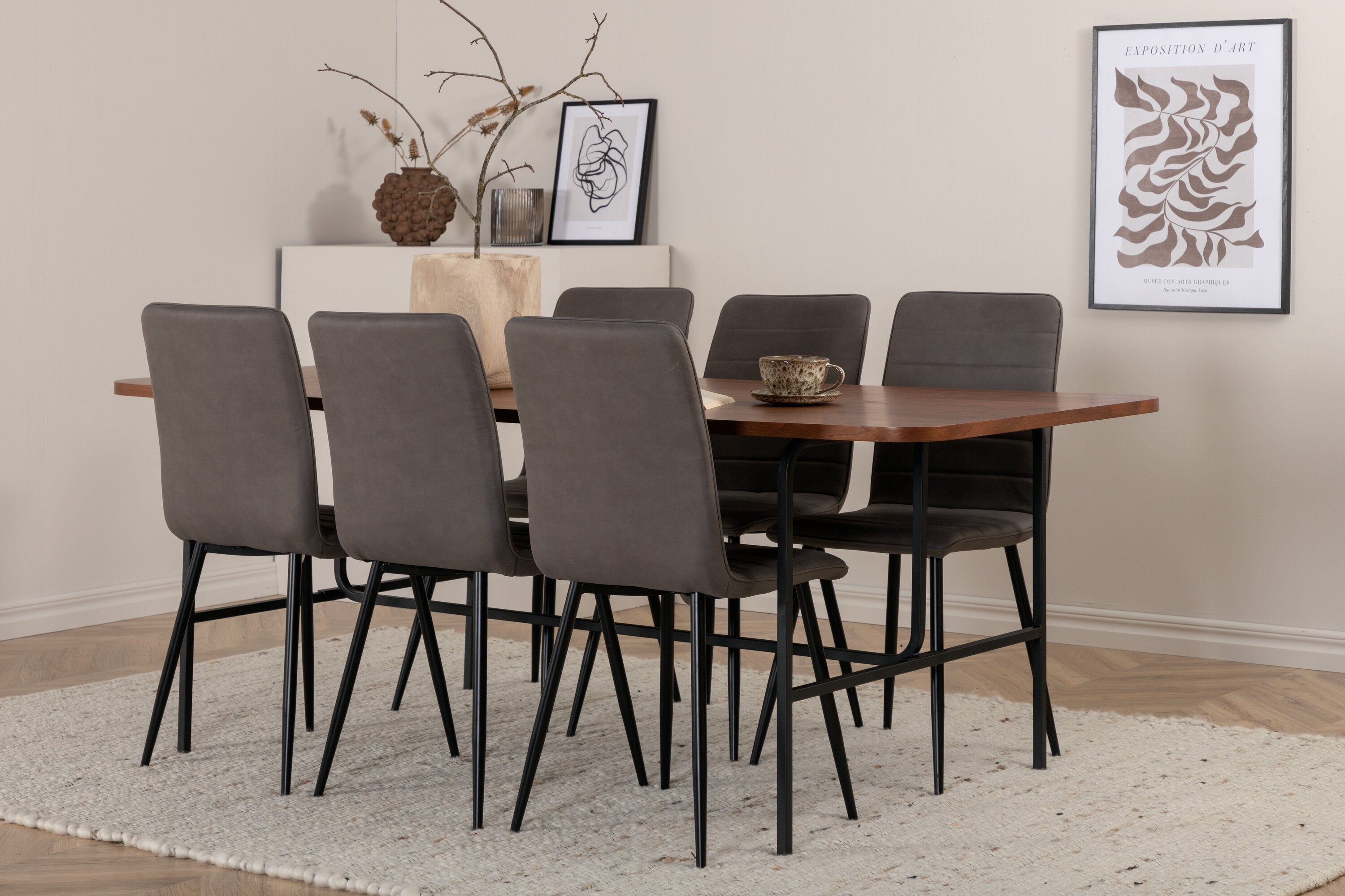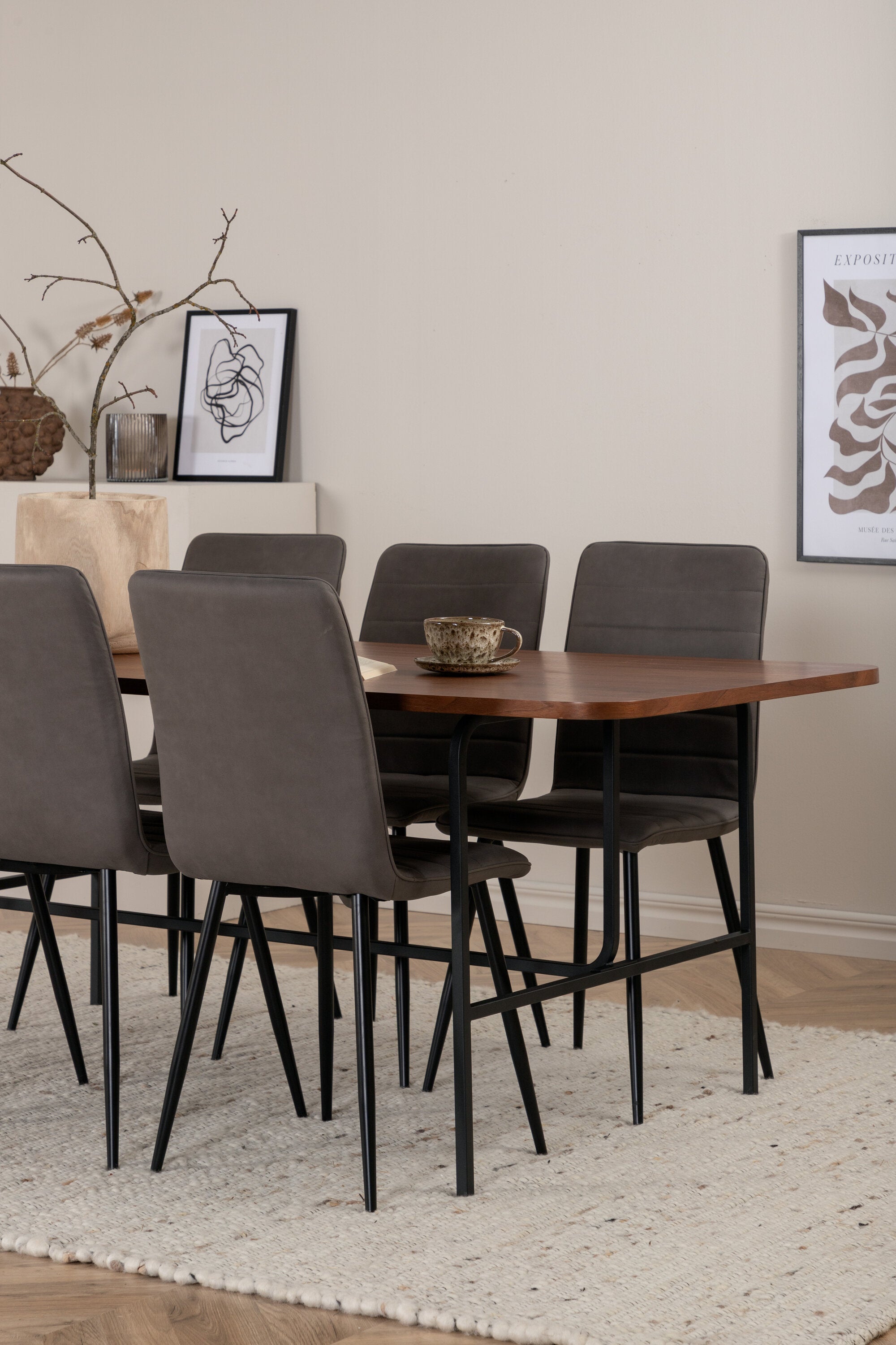 Poutavá skupina potravin se zaměřením na pohodlí a eleganci! Jídelní stůl Uno má obdélníkový design s lehce zaoblenými rohy, horní deskou z MDF v barvě ořechu s dýhou a stylovým podvozkem v černém kovu. Rozměry stolu: Délka: 200 cm, Šířka: 90 cm, Výška: 74 cm. Zde se stůl dokonale hodí k 6 luxusním jídelním židlím Windu. Nohy židle jsou z černého železa a sedáky z lahodného šedého mikrovlákna. Rozměry židle: Výška: 94 cm, výška sedáku: 47 cm, šířka: 43 cm, hloubka: 49 cm. Nechte toto krásně sladěné jídlo s moderním nádechem stát se přirozeným místem setkávání u vás doma.