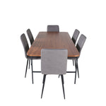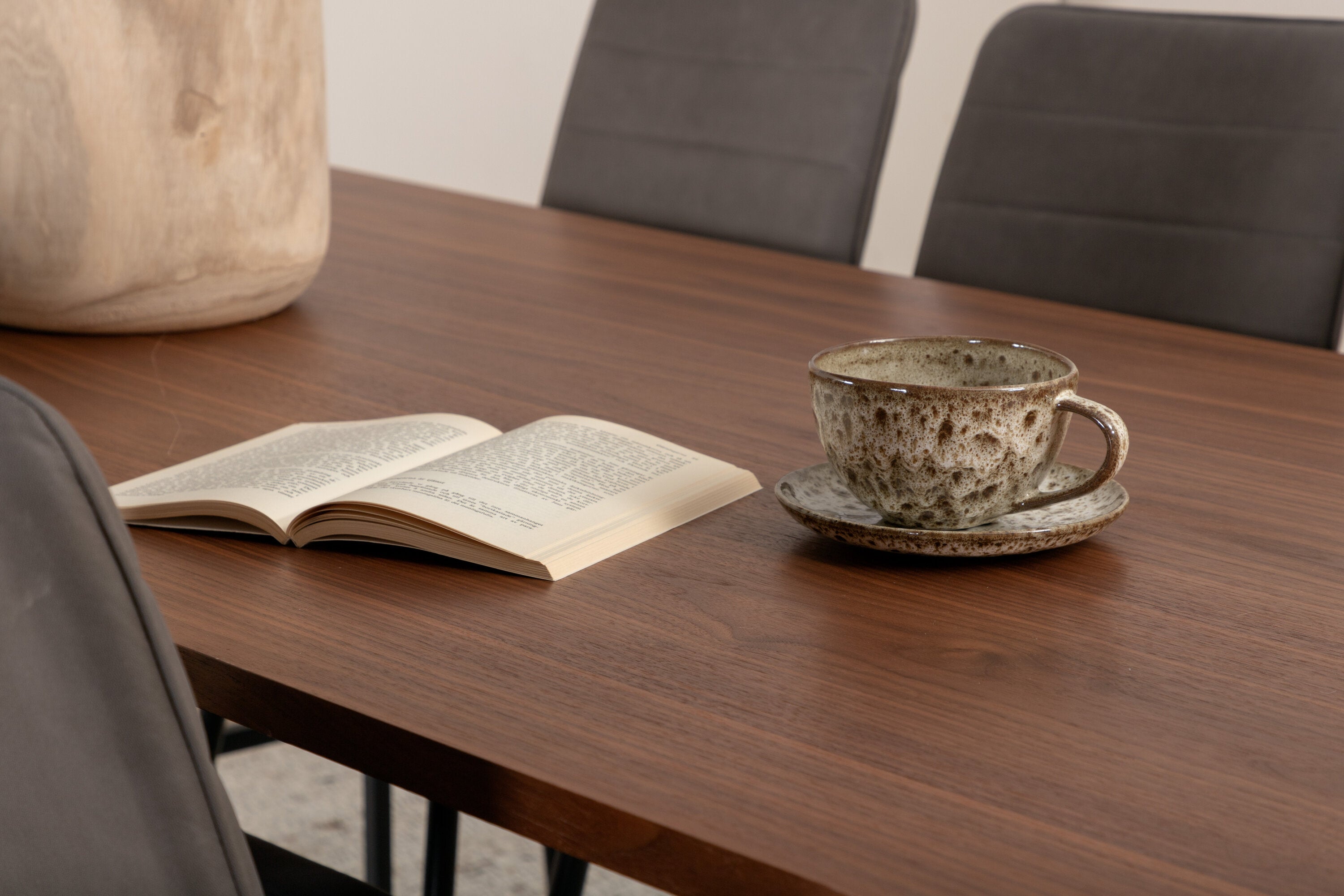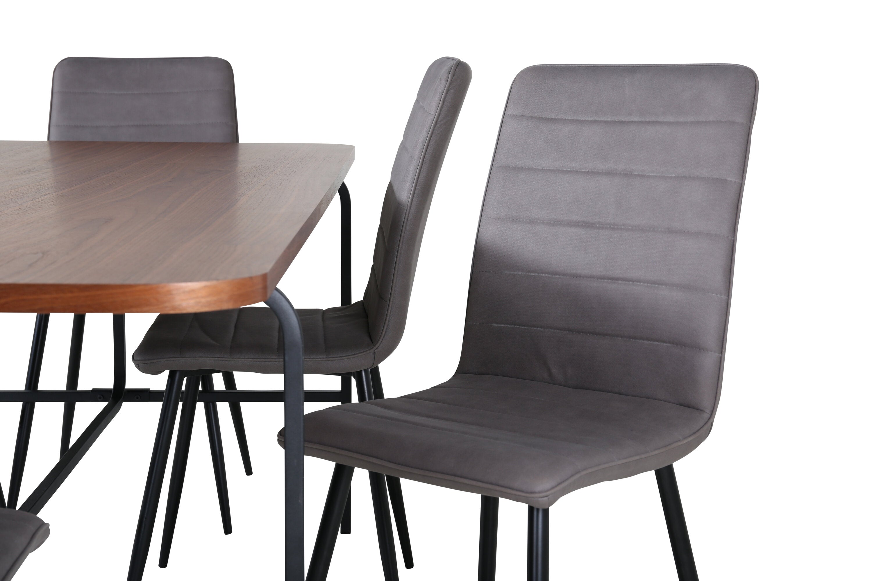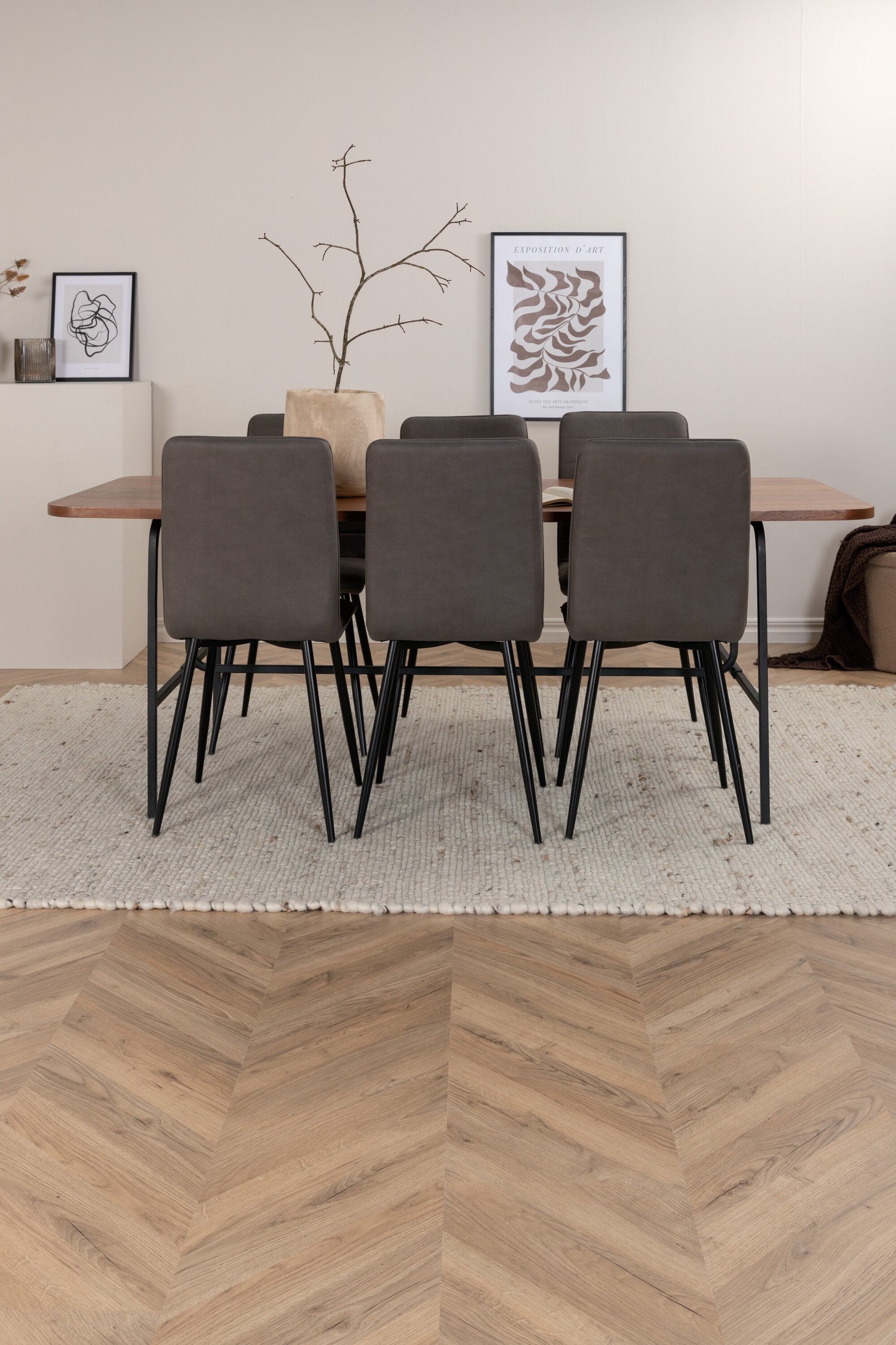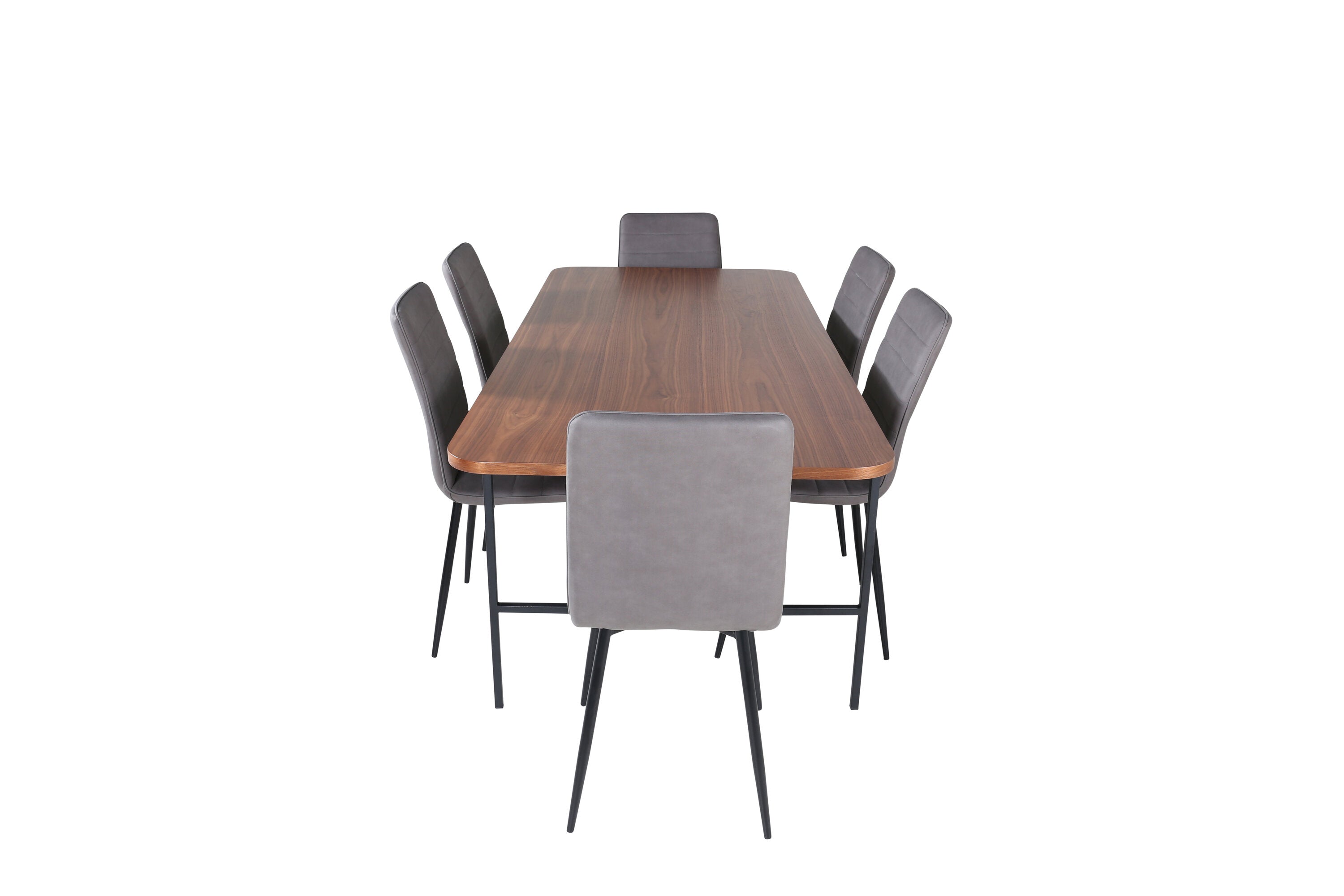 Poutavá skupina potravin se zaměřením na pohodlí a eleganci! Jídelní stůl Uno má obdélníkový design s lehce zaoblenými rohy, horní deskou z MDF v barvě ořechu s dýhou a stylovým podvozkem v černém kovu. Rozměry stolu: Délka: 200 cm, Šířka: 90 cm, Výška: 74 cm. Zde se stůl dokonale hodí k 6 luxusním jídelním židlím Windu. Nohy židle jsou z černého železa a sedáky z lahodného šedého mikrovlákna. Rozměry židle: Výška: 94 cm, výška sedáku: 47 cm, šířka: 43 cm, hloubka: 49 cm. Nechte toto krásně sladěné jídlo s moderním nádechem stát se přirozeným místem setkávání u vás doma.