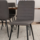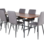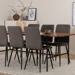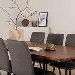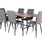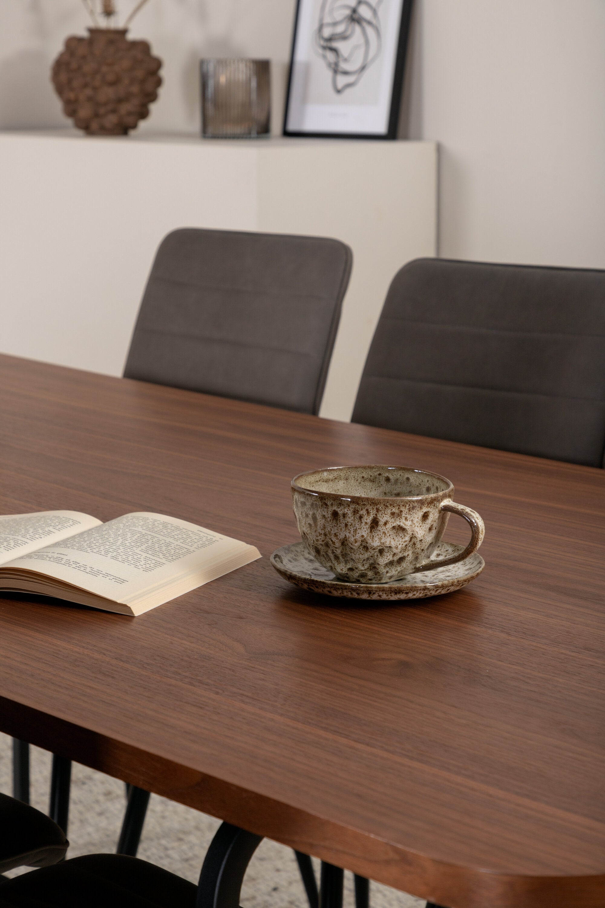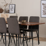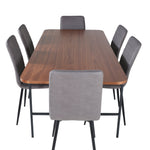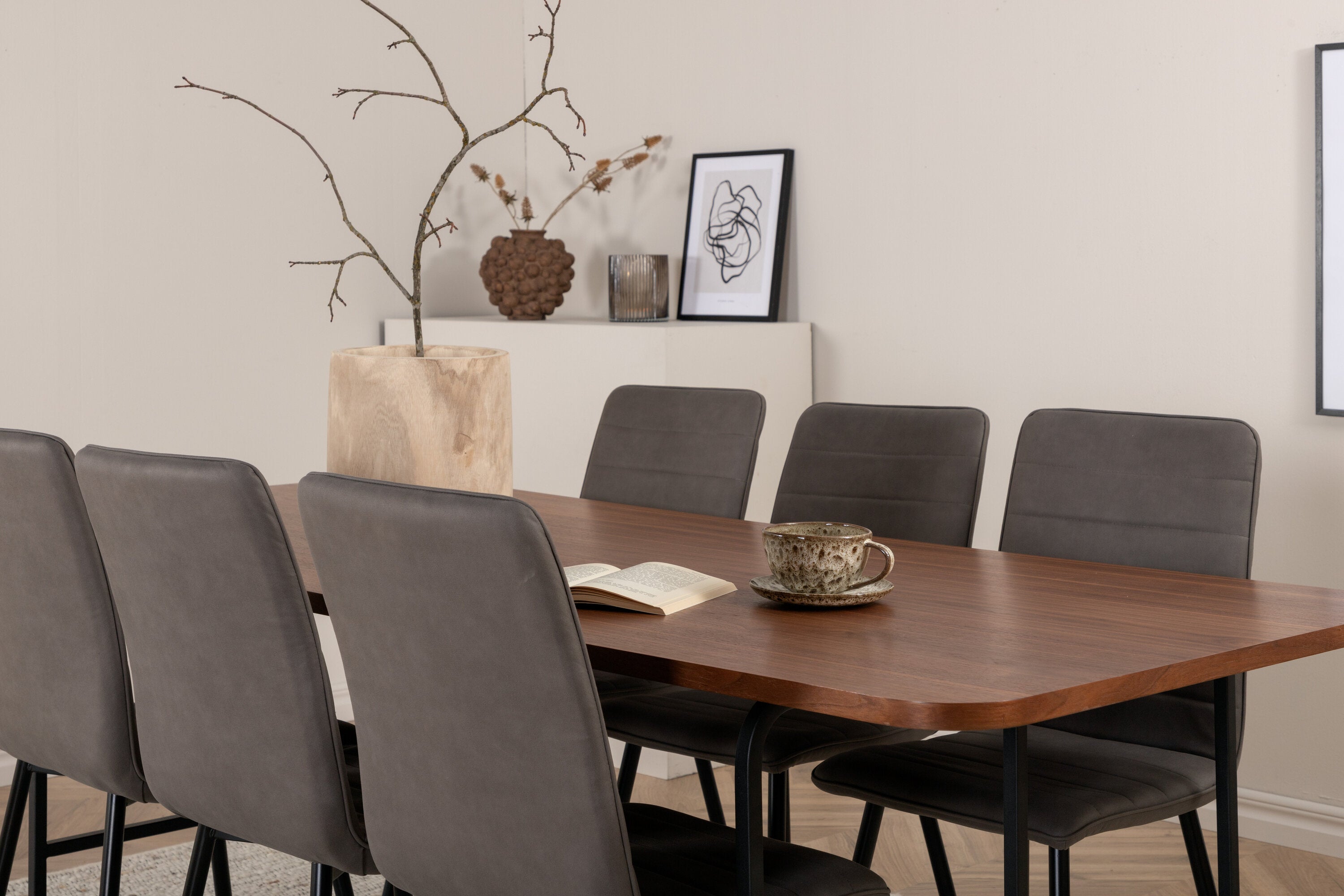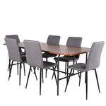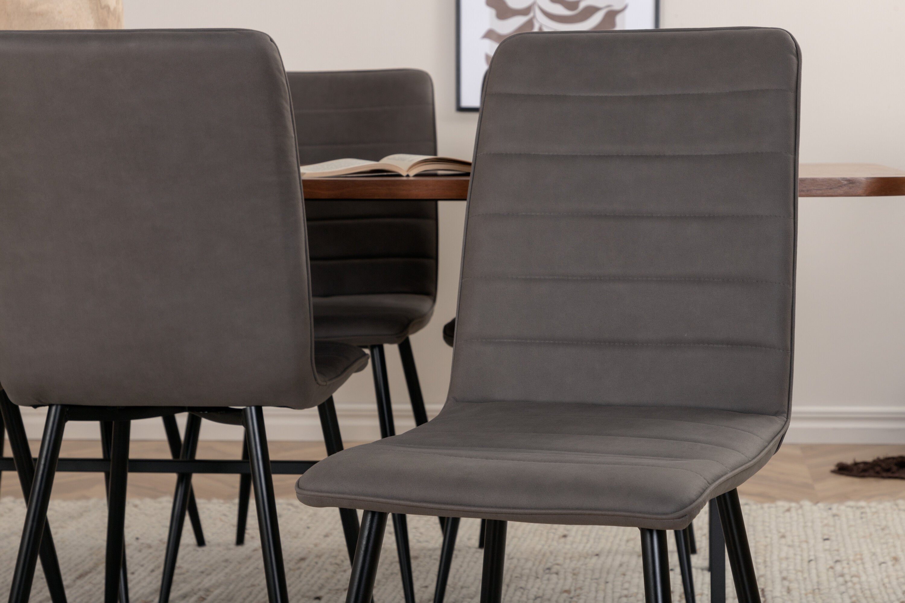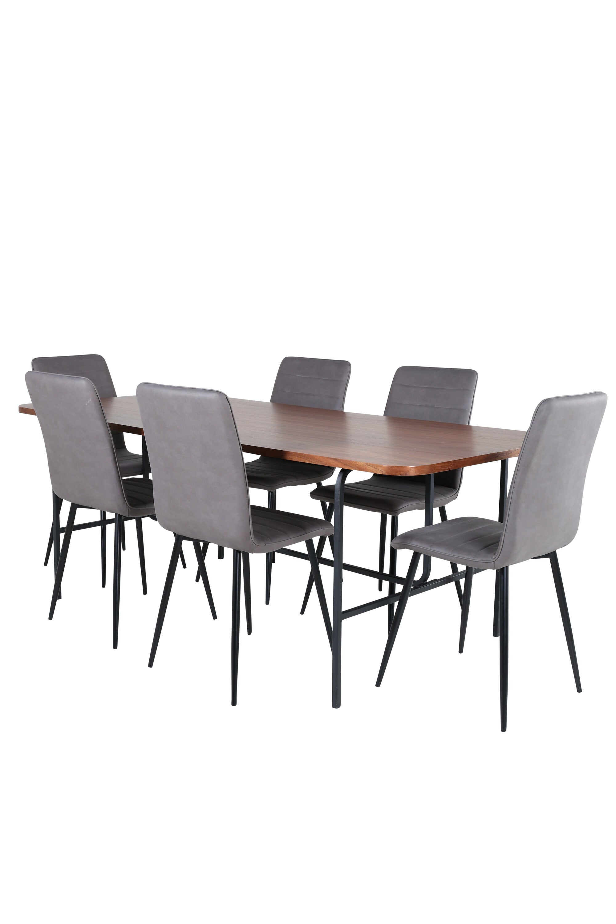 Poutavá skupina potravin se zaměřením na pohodlí a eleganci! Jídelní stůl Uno má obdélníkový design s lehce zaoblenými rohy, horní deskou z MDF v barvě ořechu s dýhou a stylovým podvozkem v černém kovu. Rozměry stolu: Délka: 200 cm, Šířka: 90 cm, Výška: 74 cm. Zde se stůl dokonale hodí k 6 luxusním jídelním židlím Windu. Nohy židle jsou z černého železa a sedáky z lahodného šedého mikrovlákna. Rozměry židle: Výška: 94 cm, výška sedáku: 47 cm, šířka: 43 cm, hloubka: 49 cm. Nechte toto krásně sladěné jídlo s moderním nádechem stát se přirozeným místem setkávání u vás doma.