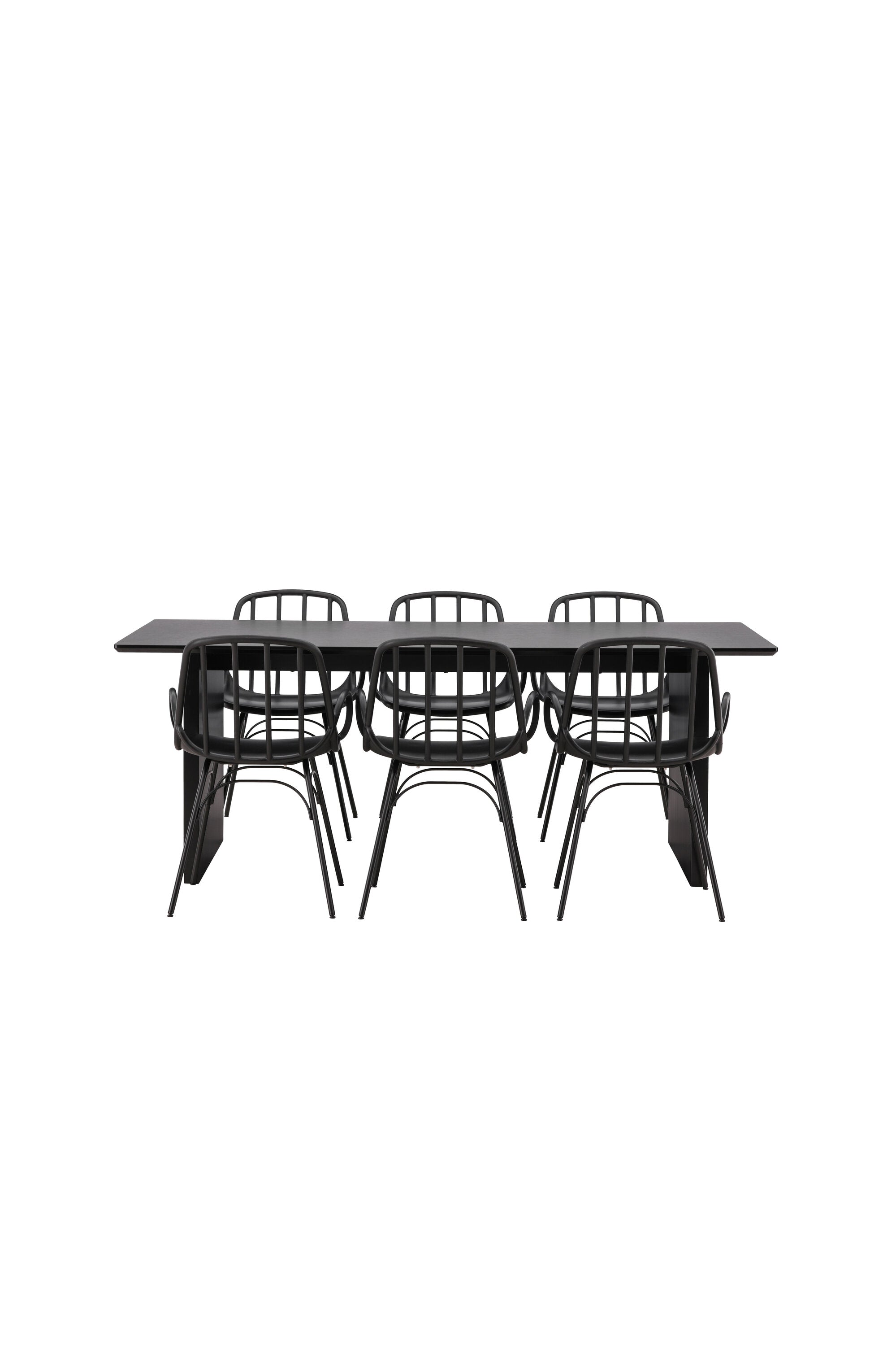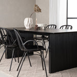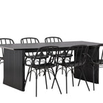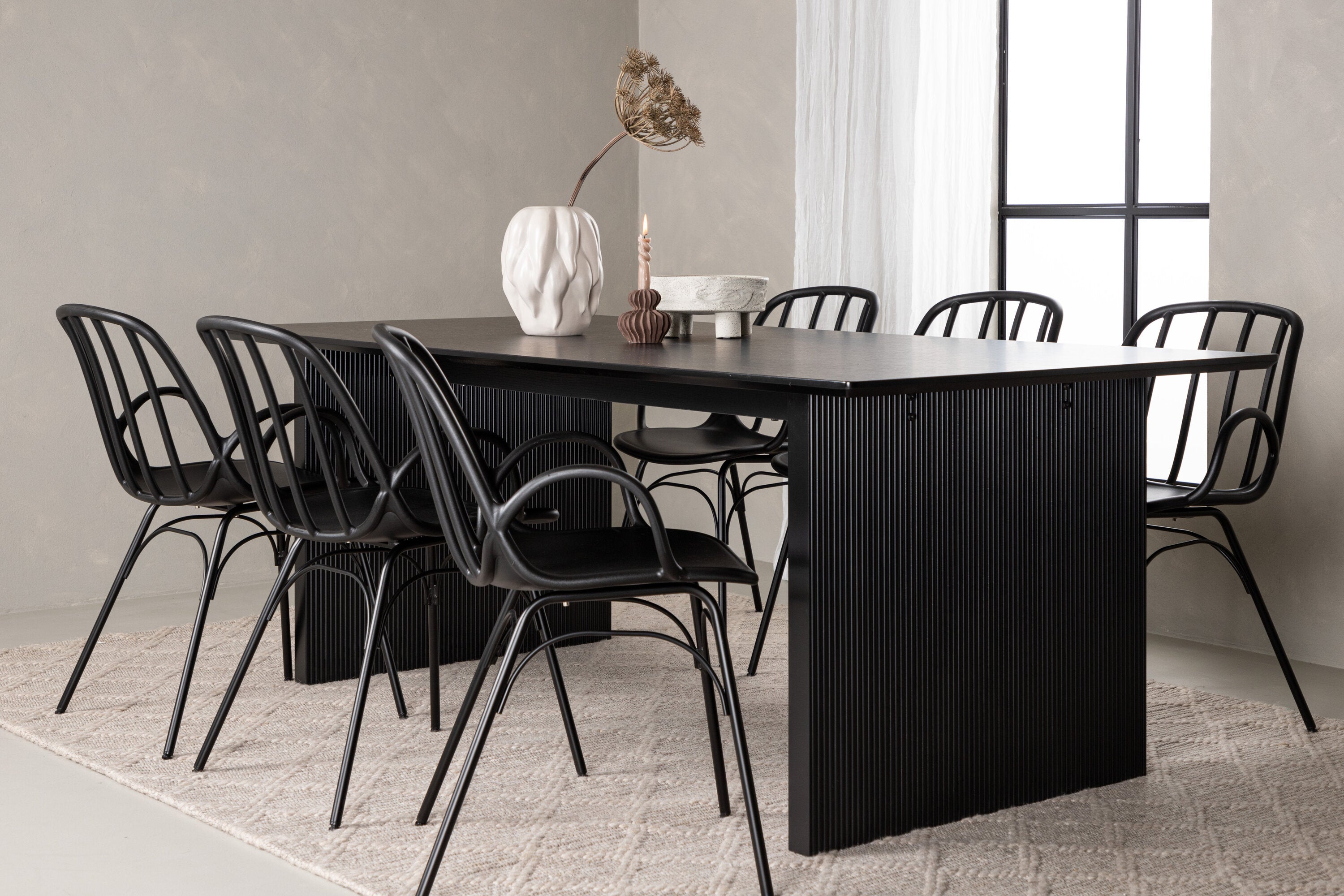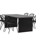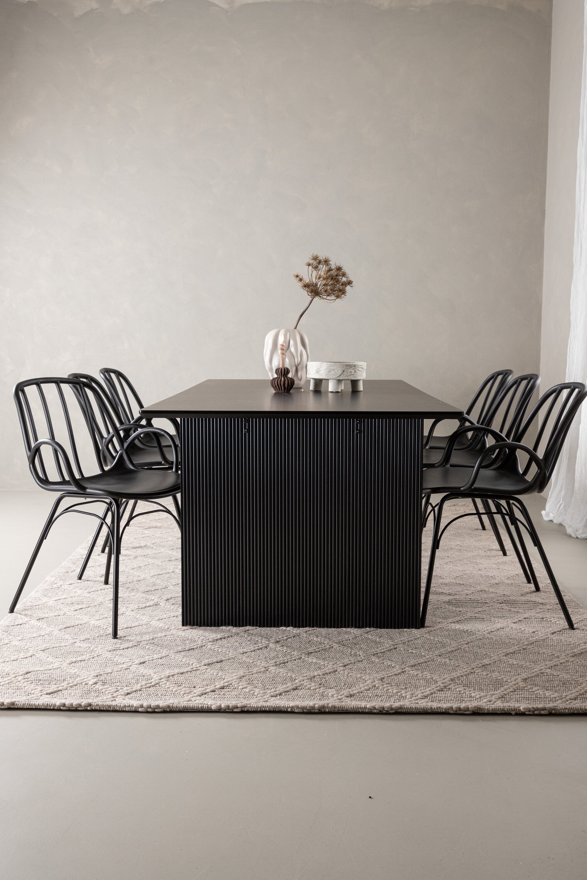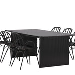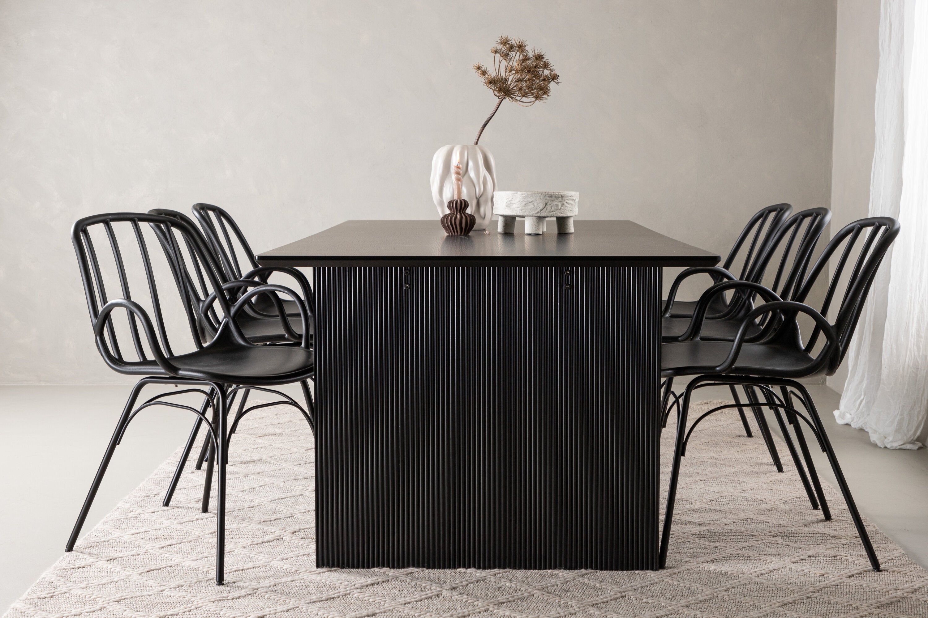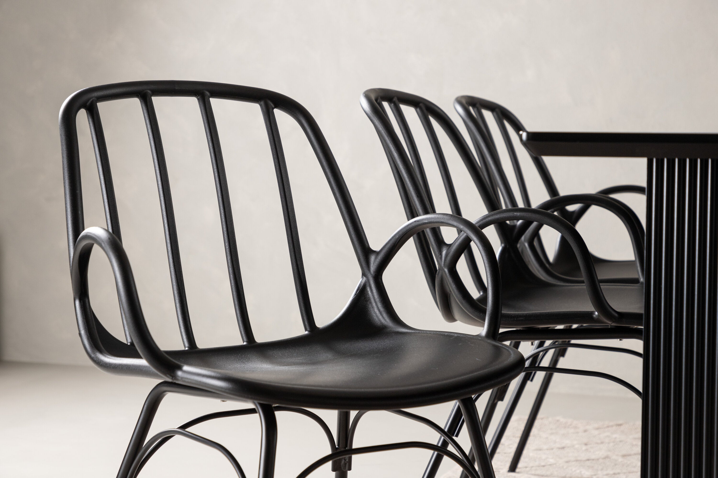 Černá jídelní skupina, která obstojí ve zkoušce času! Jídelní stoly Vail mají rovné severské tvary a jsou vyrobeny z odolné černé MDF - stylové i praktické. Deska stolu je tenká v obdélníkovém provedení a balancuje na dvou pevných dřevěných deskách, které tvoří podvozek. Zde v dokonalém souladu s našimi moderními jídelními židlemi ze série Dyrön. Židle je stylová i praktická, vyrobena z černého plastu a oceli. Židle má integrované područky a žebrovaný design v mírně zaoblené zadní části. Pozvěte své blízké na několik společenských chvil!