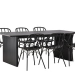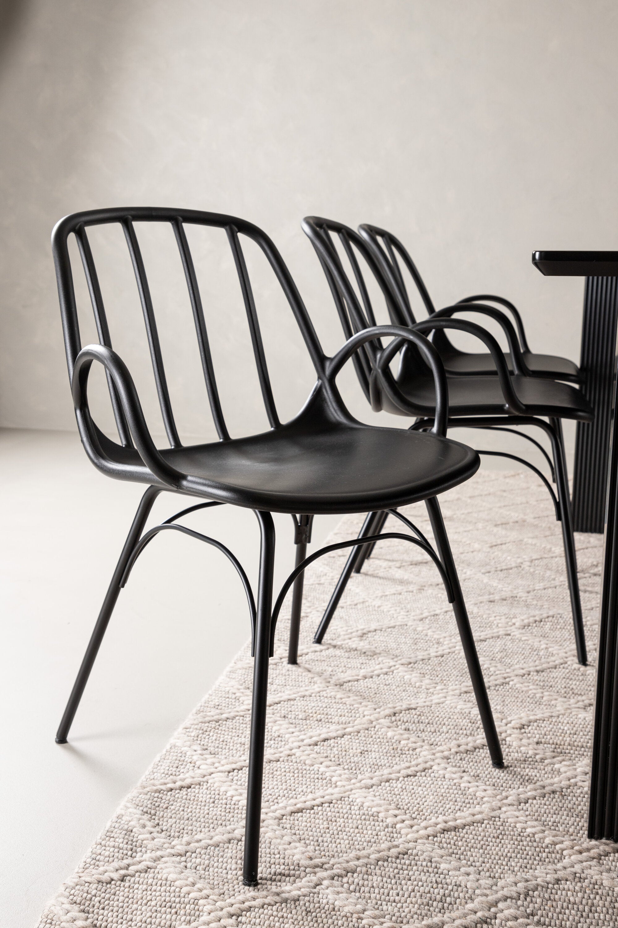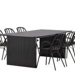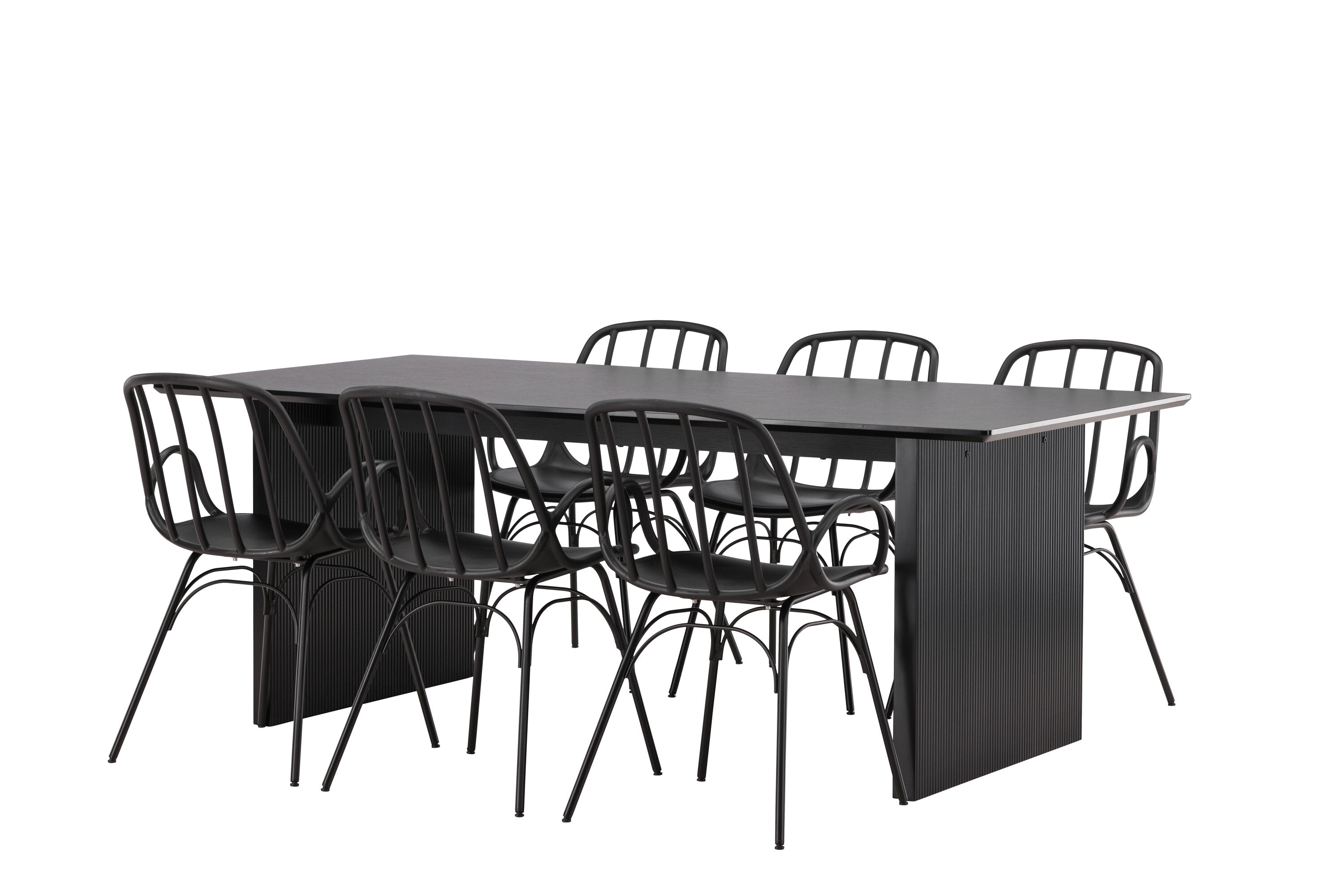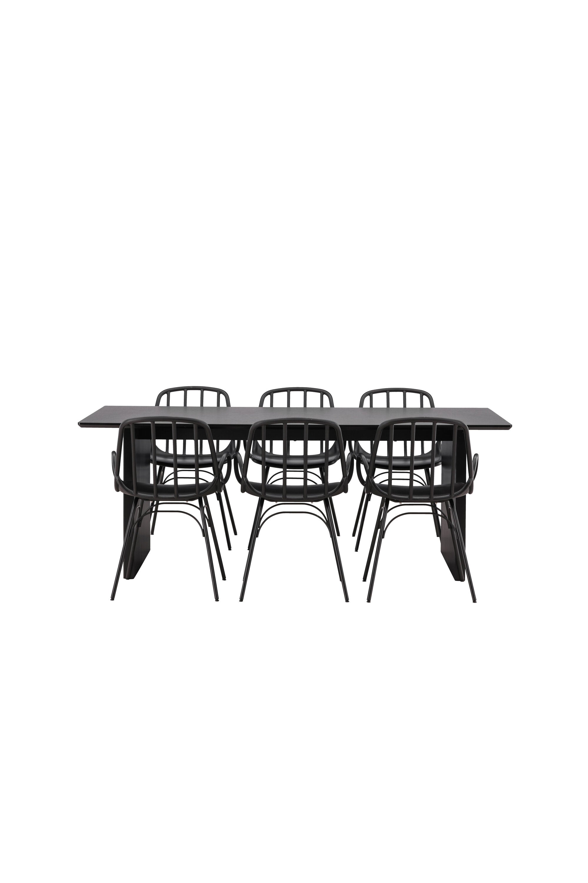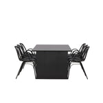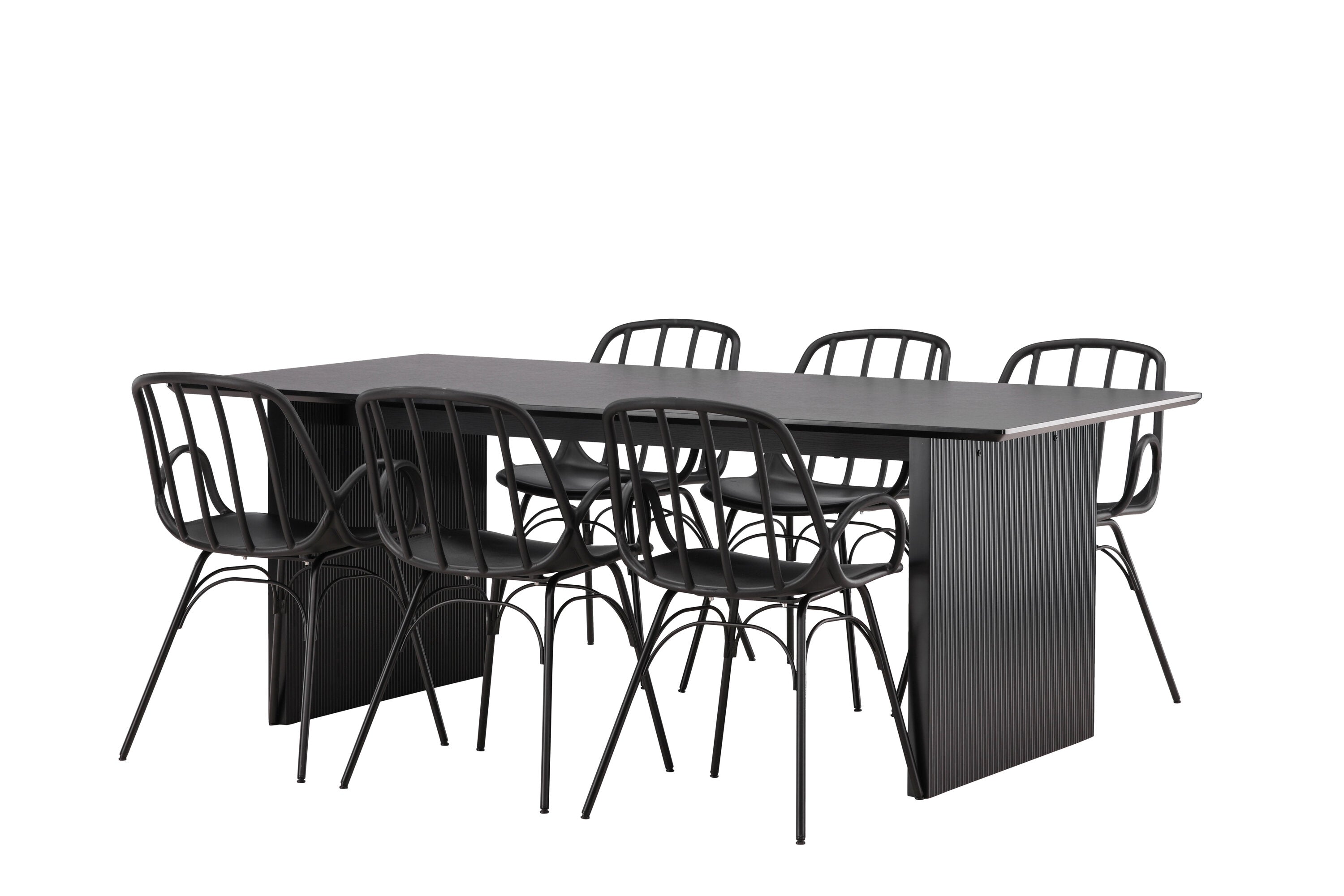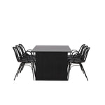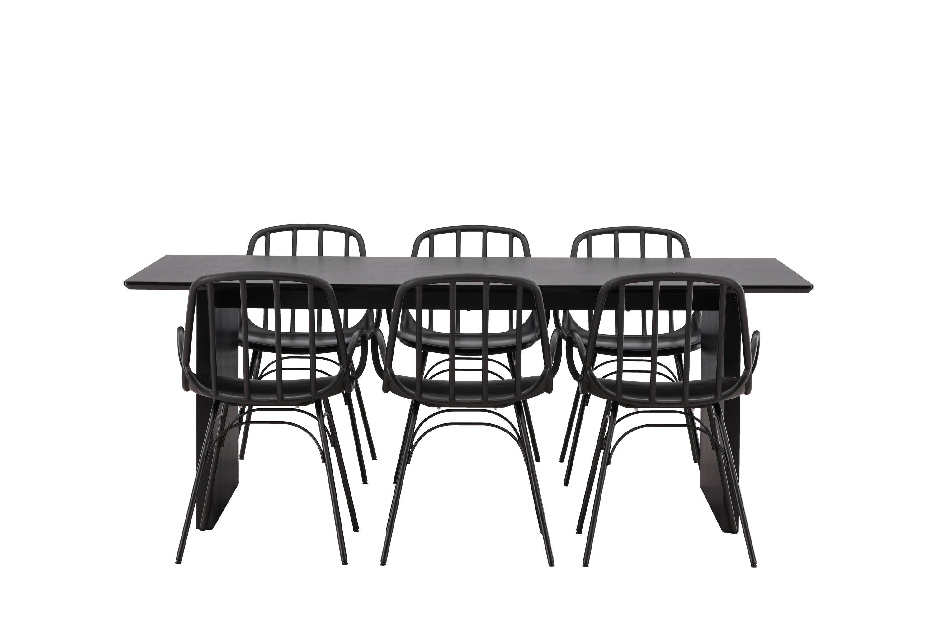 Černá jídelní skupina, která obstojí ve zkoušce času! Jídelní stoly Vail mají rovné severské tvary a jsou vyrobeny z odolné černé MDF - stylové i praktické. Deska stolu je tenká v obdélníkovém provedení a balancuje na dvou pevných dřevěných deskách, které tvoří podvozek. Zde v dokonalém souladu s našimi moderními jídelními židlemi ze série Dyrön. Židle je stylová i praktická, vyrobena z černého plastu a oceli. Židle má integrované područky a žebrovaný design v mírně zaoblené zadní části. Pozvěte své blízké na několik společenských chvil!