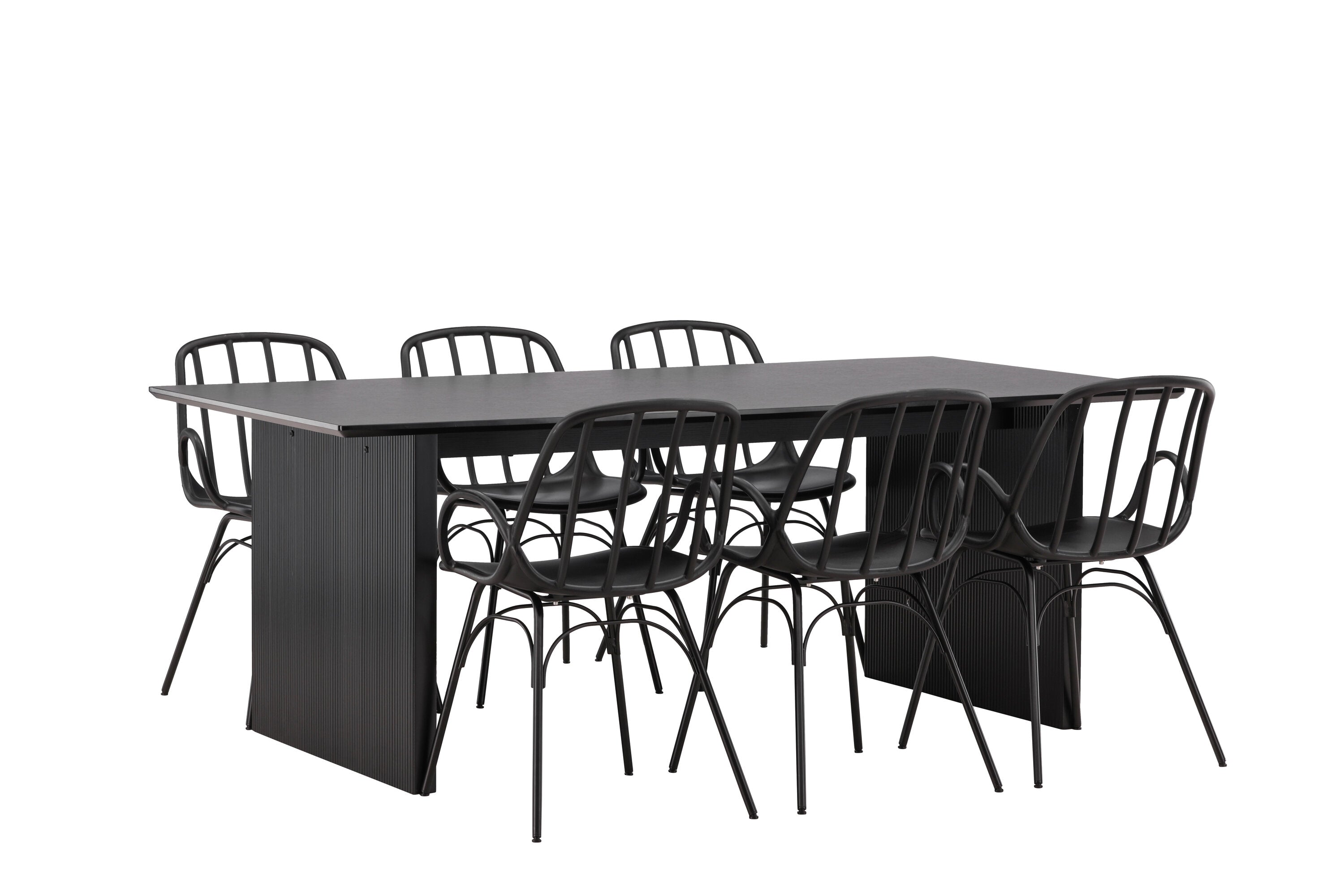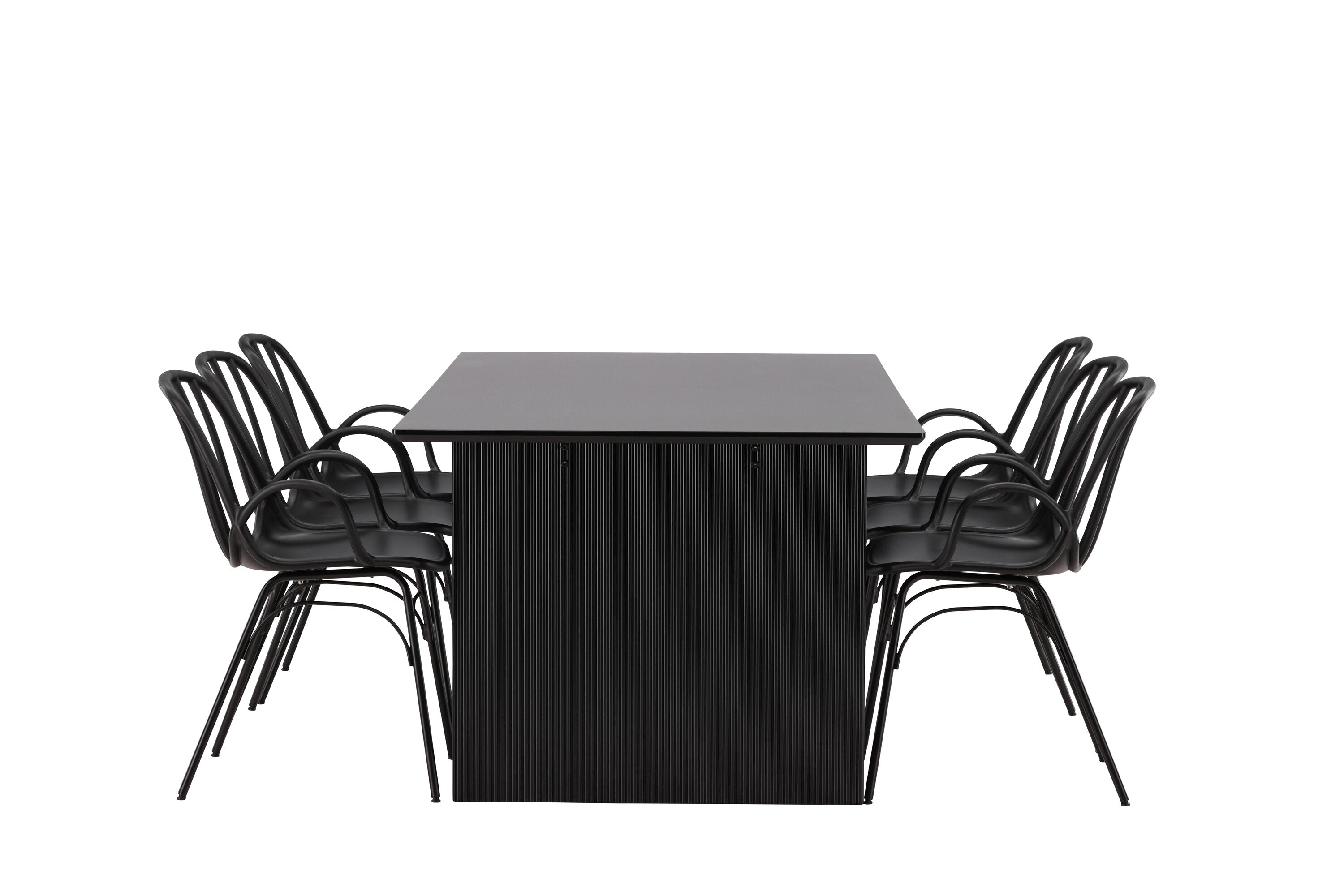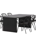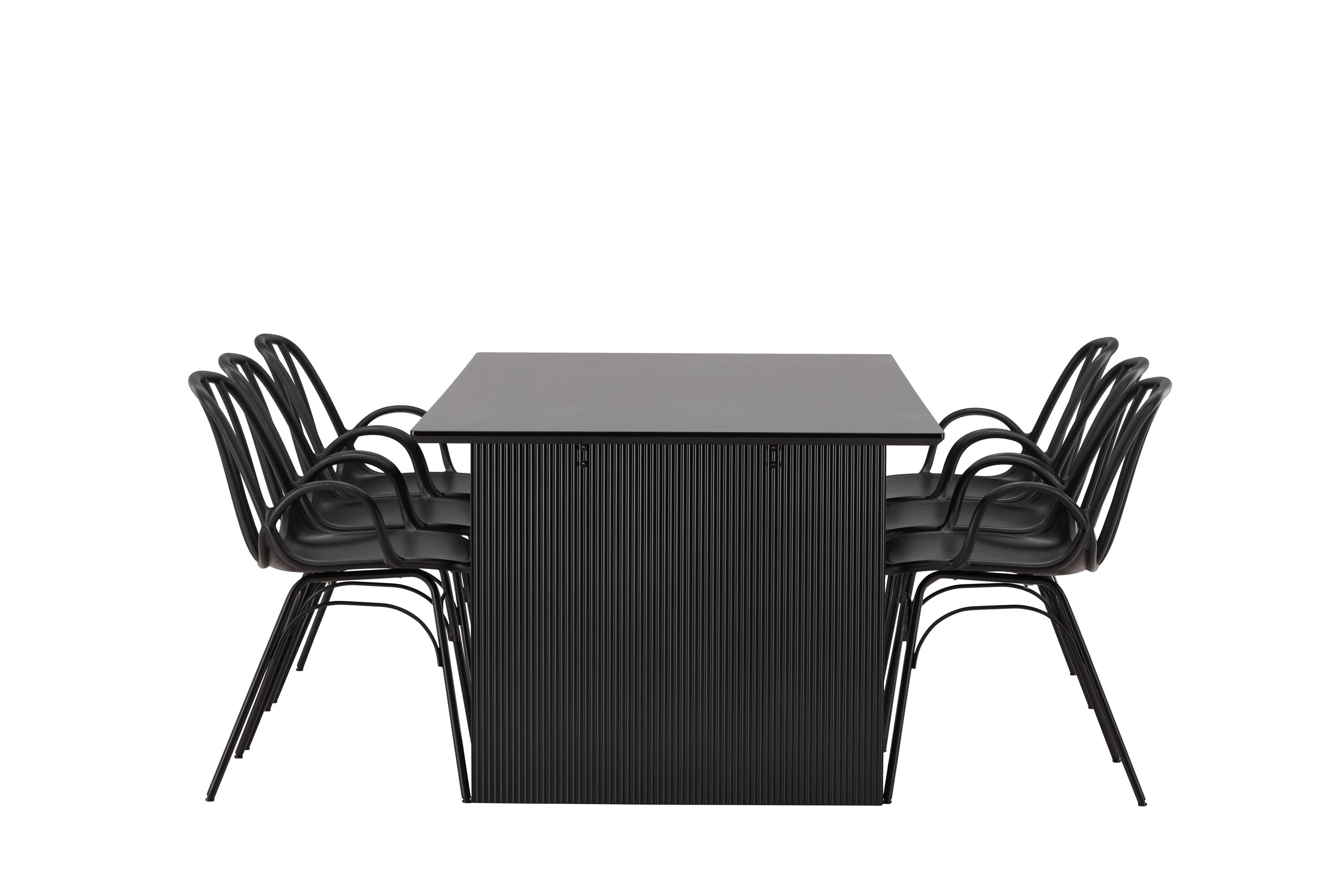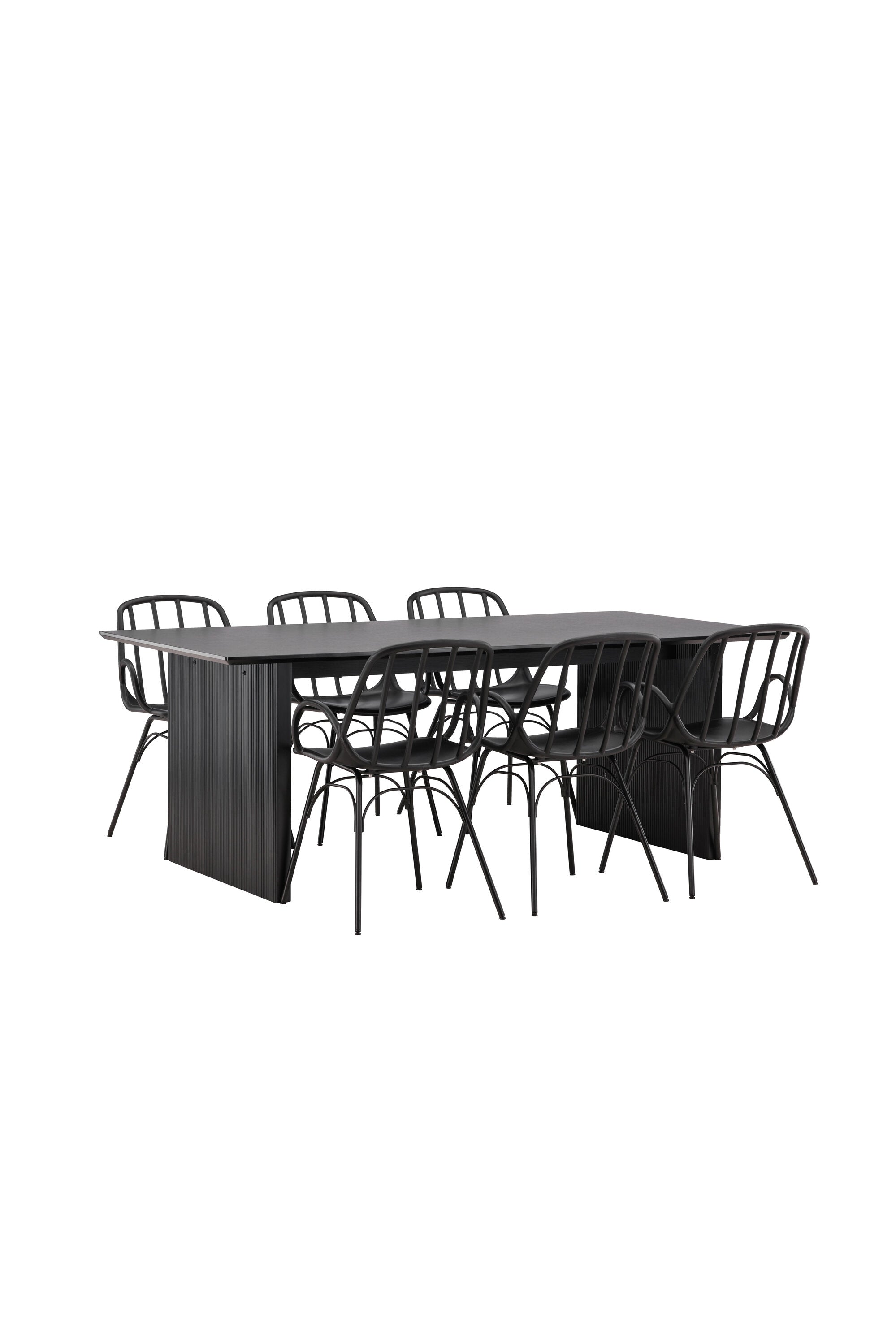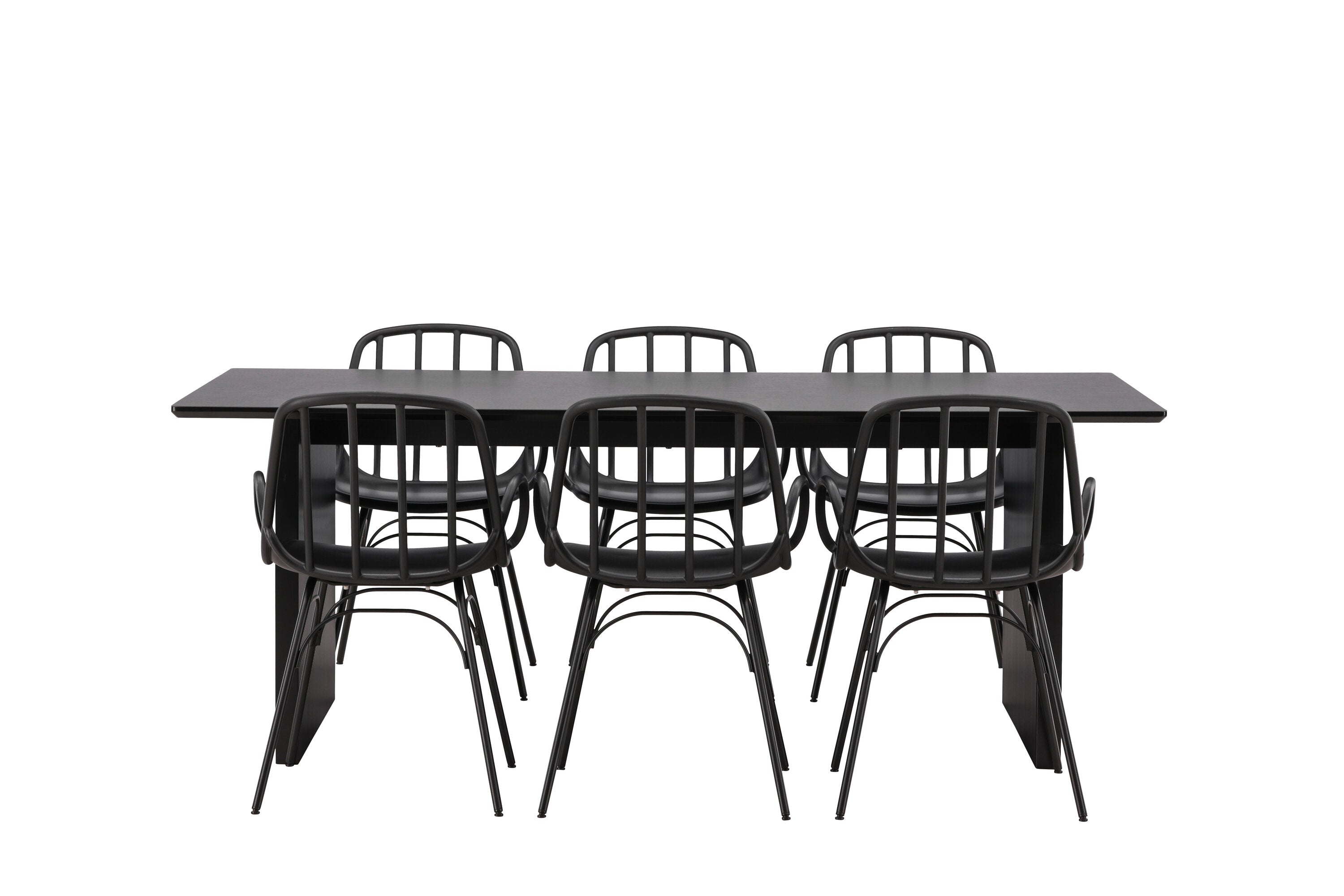 Černá jídelní skupina, která obstojí ve zkoušce času! Jídelní stoly Vail mají rovné severské tvary a jsou vyrobeny z odolné černé MDF - stylové i praktické. Deska stolu je tenká v obdélníkovém provedení a balancuje na dvou pevných dřevěných deskách, které tvoří podvozek. Zde v dokonalém souladu s našimi moderními jídelními židlemi ze série Dyrön. Židle je stylová i praktická, vyrobena z černého plastu a oceli. Židle má integrované područky a žebrovaný design v mírně zaoblené zadní části. Pozvěte své blízké na několik společenských chvil!