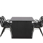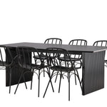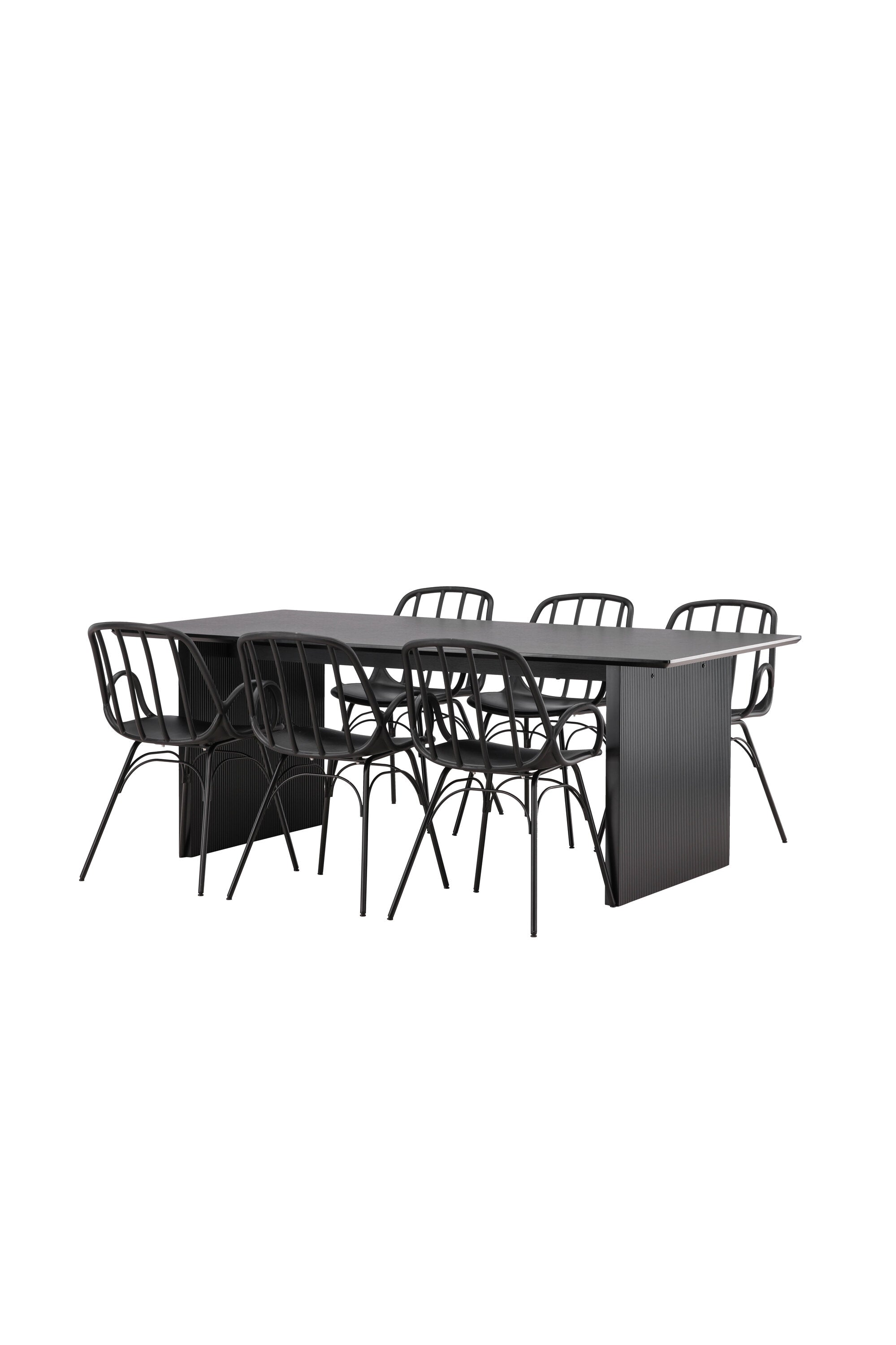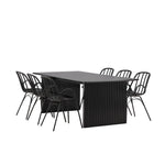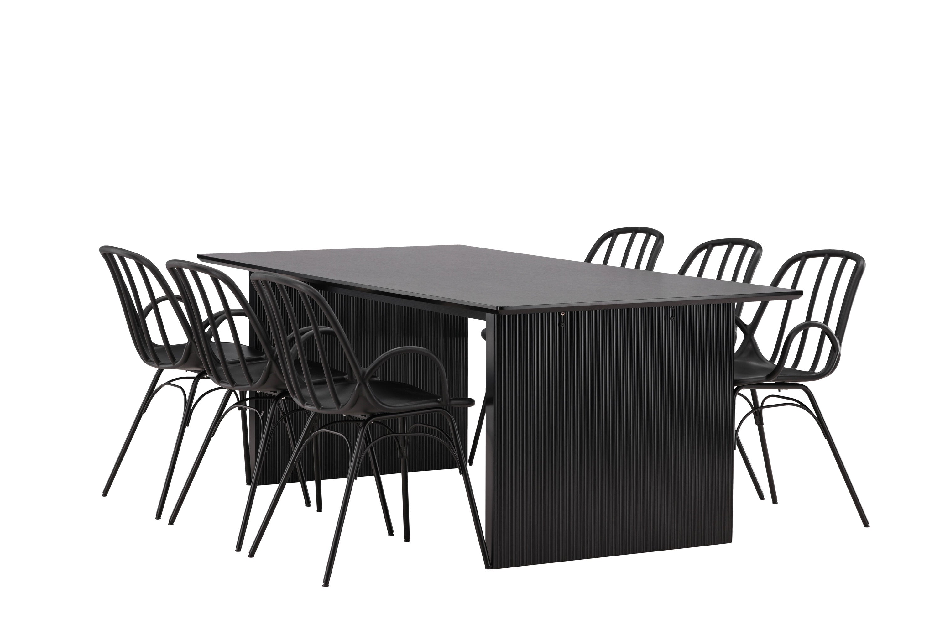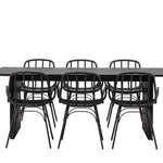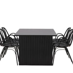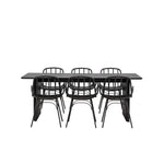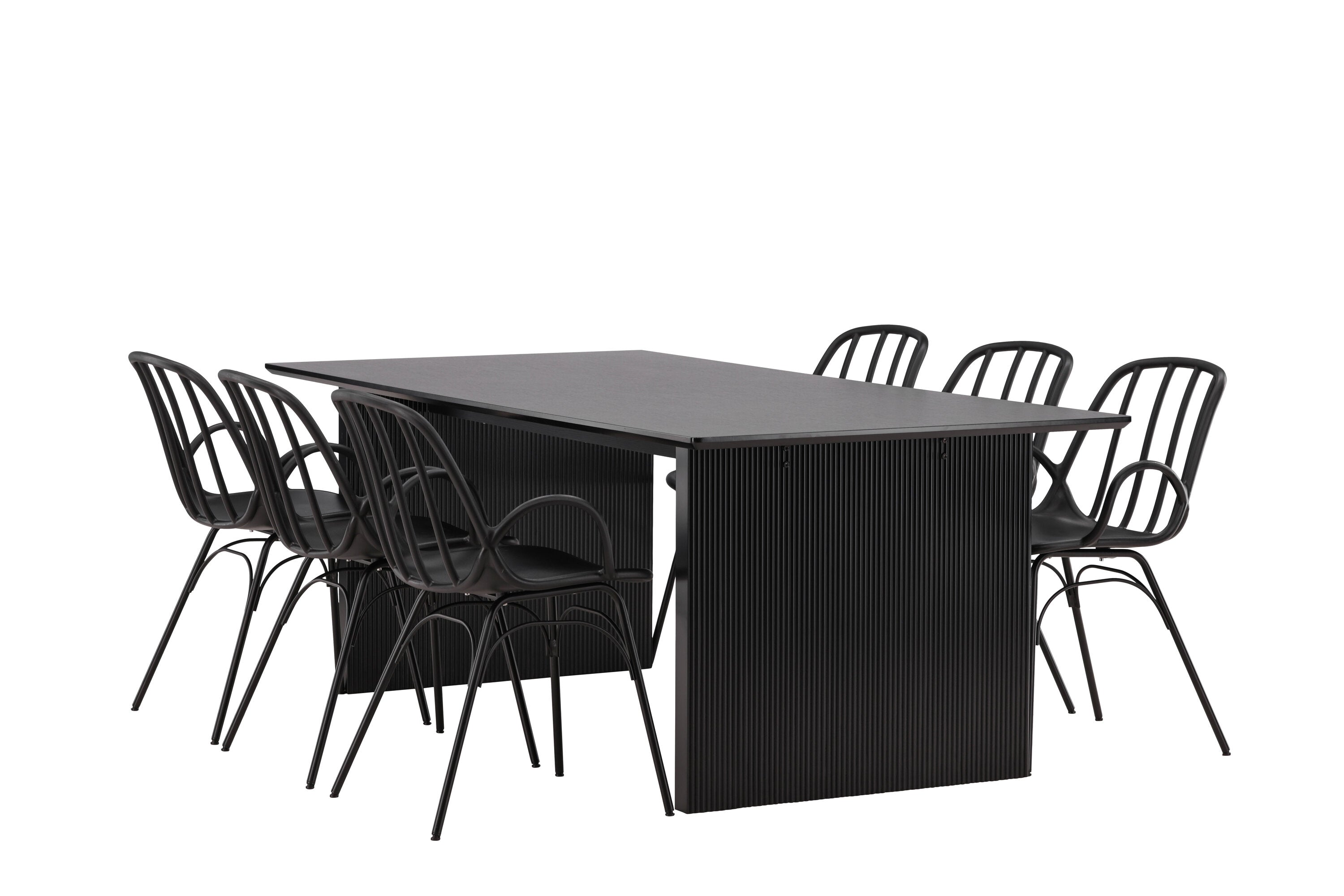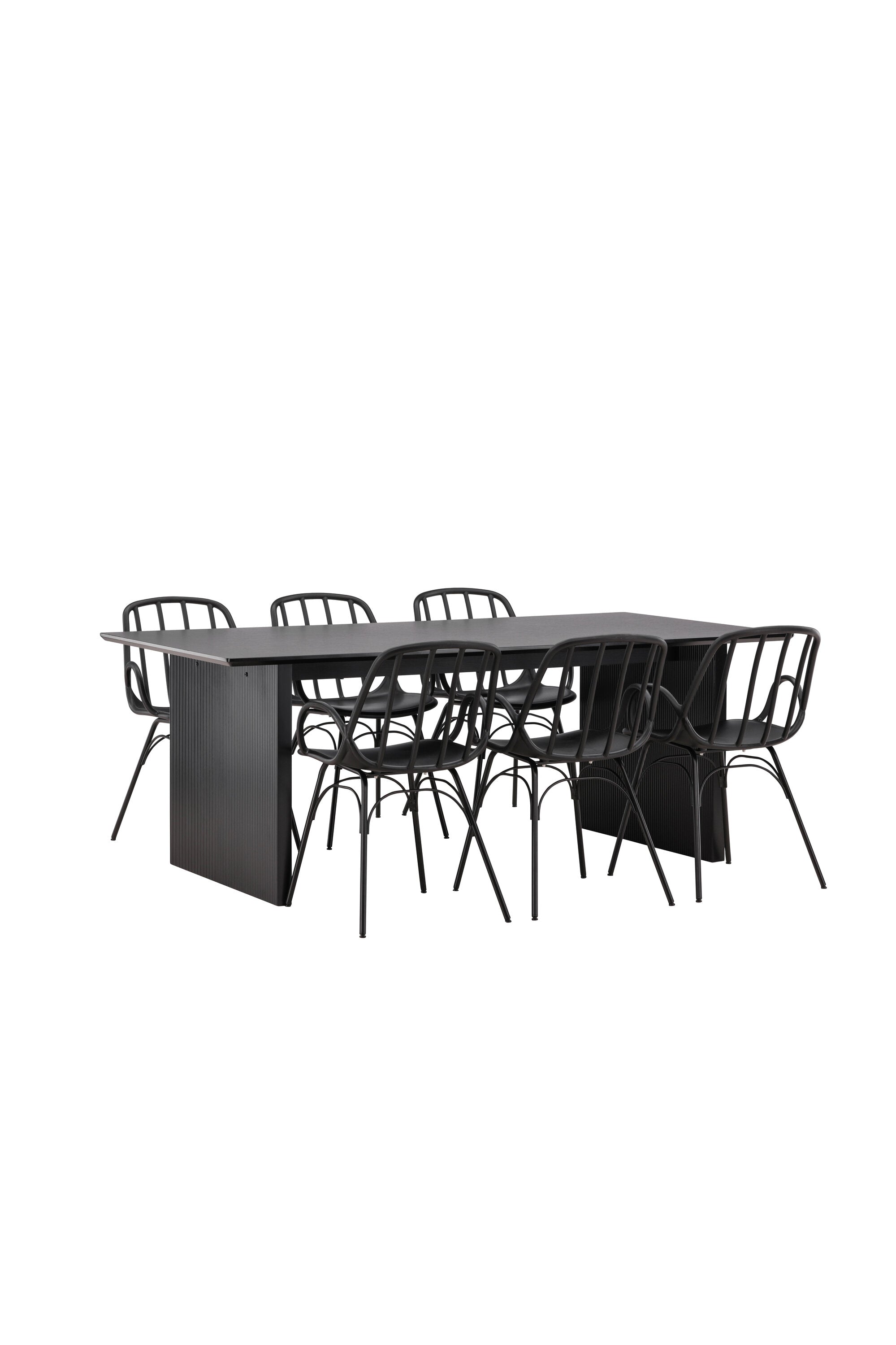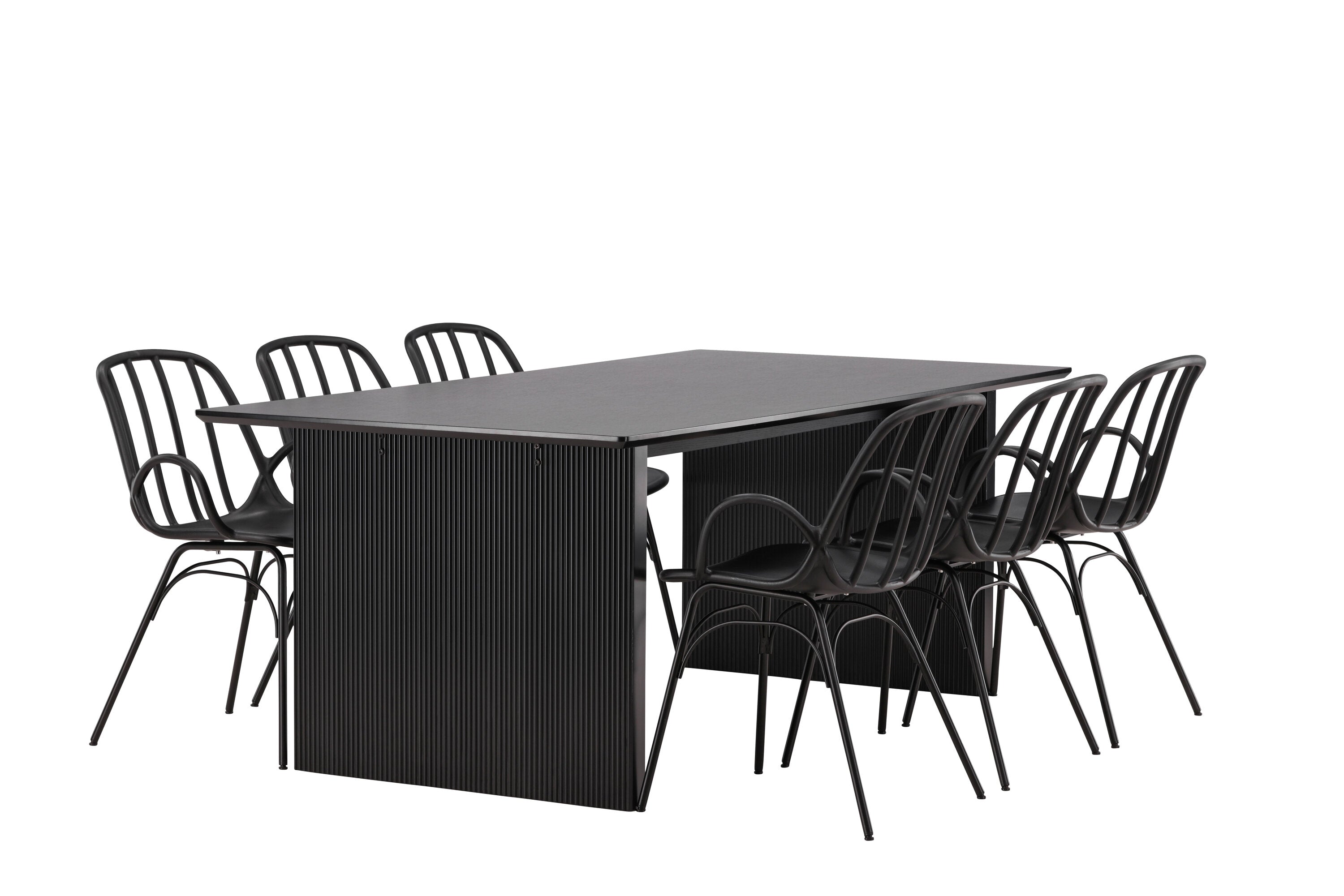Černá jídelní skupina, která obstojí ve zkoušce času! Jídelní stoly Vail mají rovné severské tvary a jsou vyrobeny z odolné černé MDF - stylové i praktické. Deska stolu je tenká v obdélníkovém provedení a balancuje na dvou pevných dřevěných deskách, které tvoří podvozek. Zde v dokonalém souladu s našimi moderními jídelními židlemi ze série Dyrön. Židle je stylová i praktická, vyrobena z černého plastu a oceli. Židle má integrované područky a žebrovaný design v mírně zaoblené zadní části. Pozvěte své blízké na několik společenských chvil!