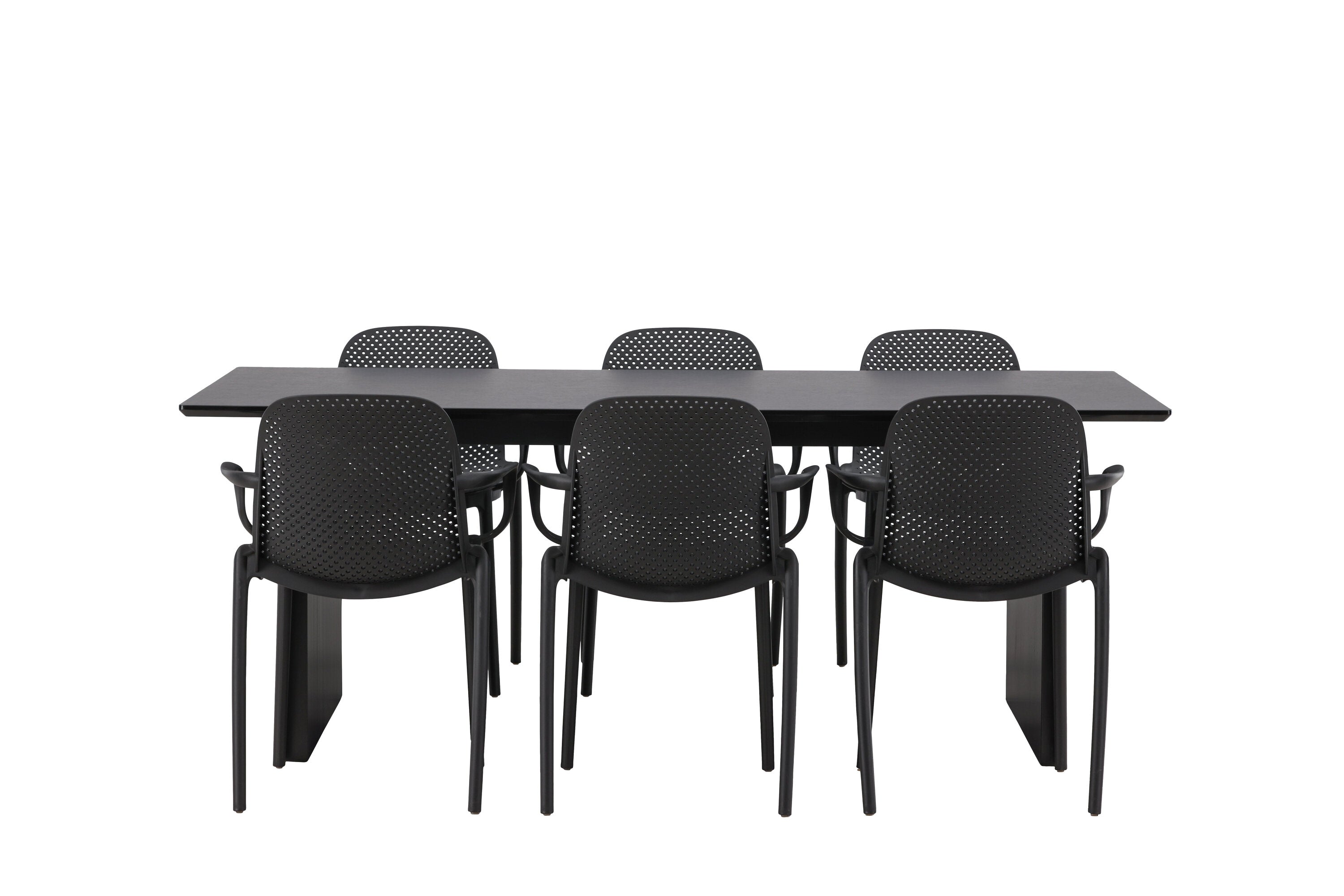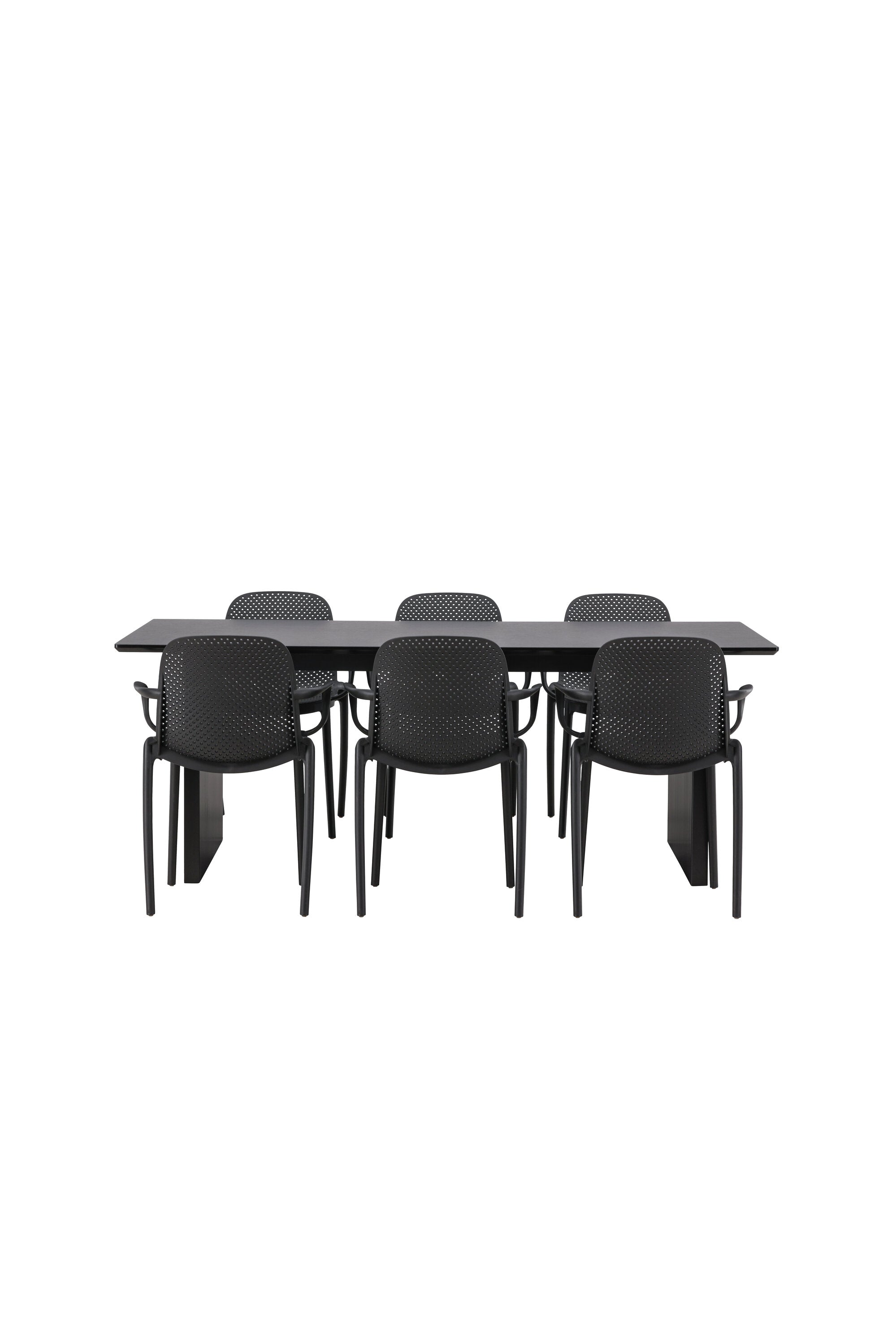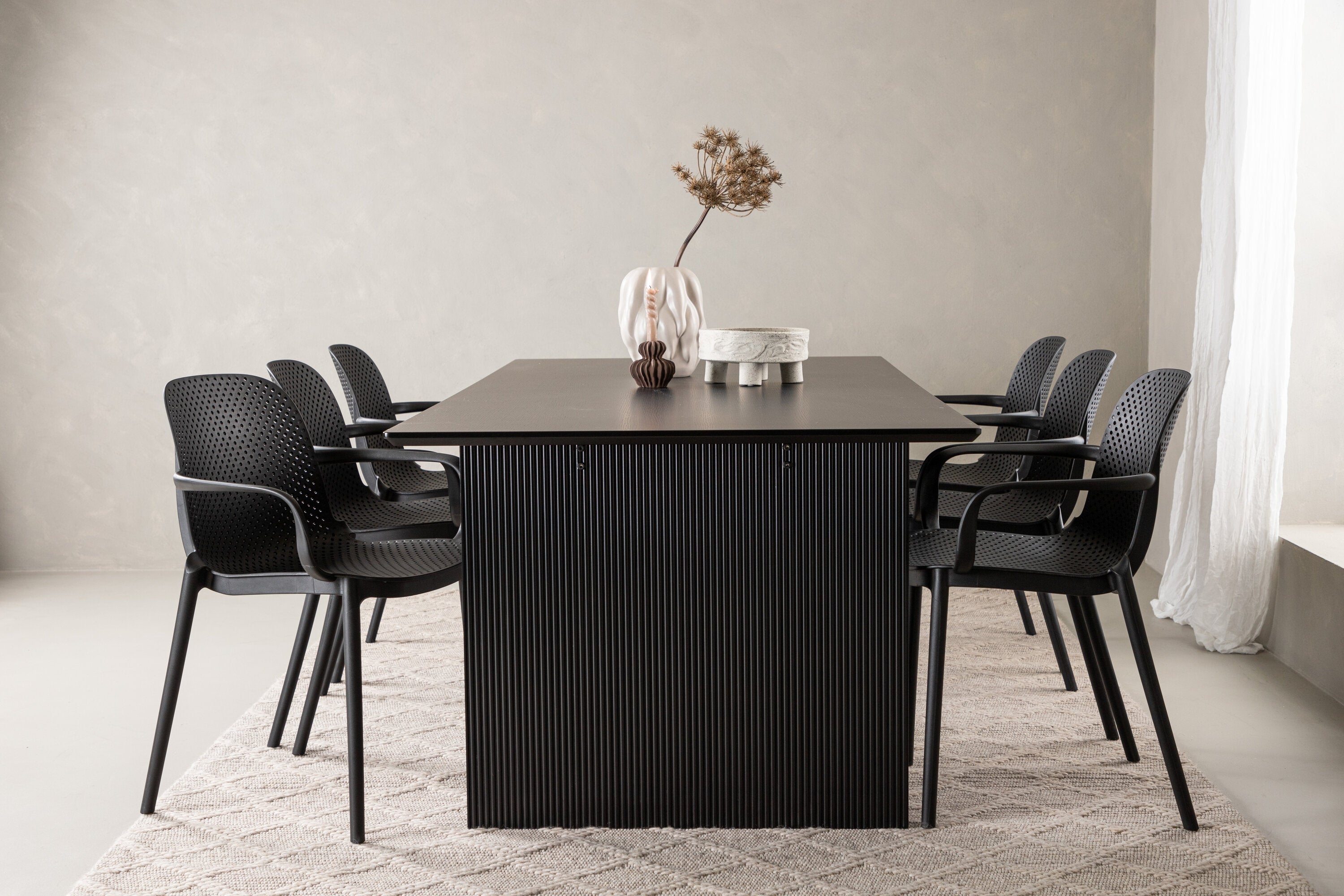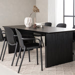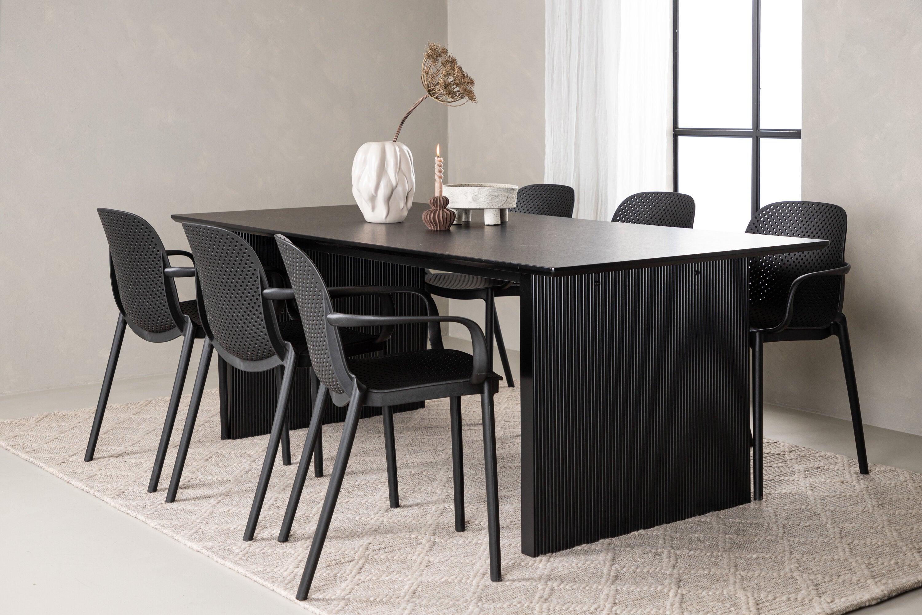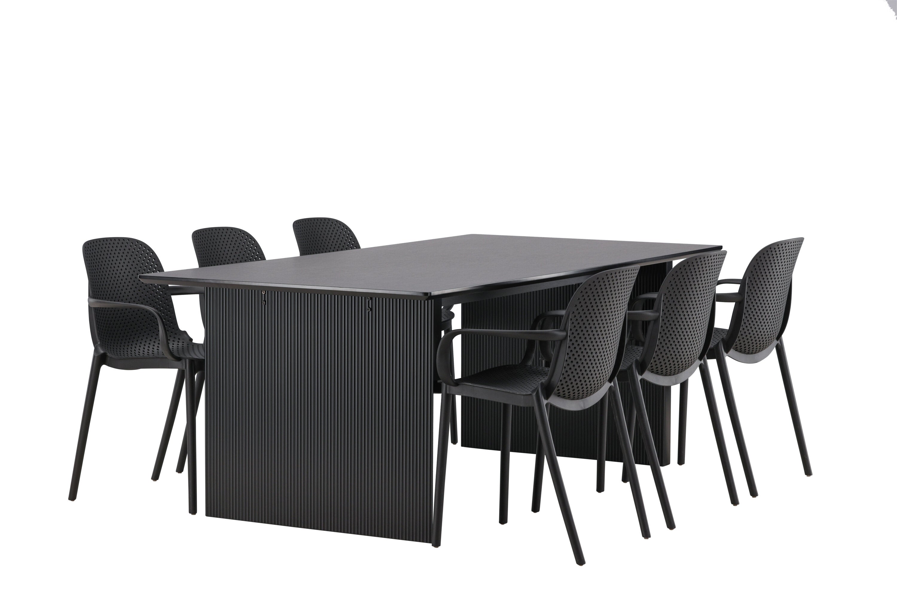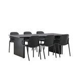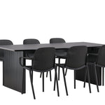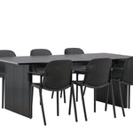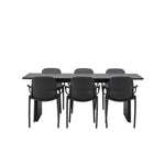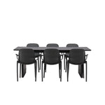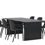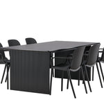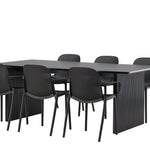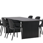 Tato jídelní skupina se perfektně hodí a rychle splyne se zbytkem dekorace! Náš obdélníkový jídelní stůl ze série Vail má rovné severské tvary a je vyroben z odolné MDF v ušpiněné černé barvě. Deska stolu je tenká a balancuje na dvou pevných dřevěných deskách, které tvoří podvozek – stejně úhledné a odolné. Zde spolu s jídelními židlemi ze série Baltimore. Židle mají průmyslový design v černém plastu, díky čemuž jsou stylové a zároveň odolné. Vytvořte si okouzlující středobod svého domova!