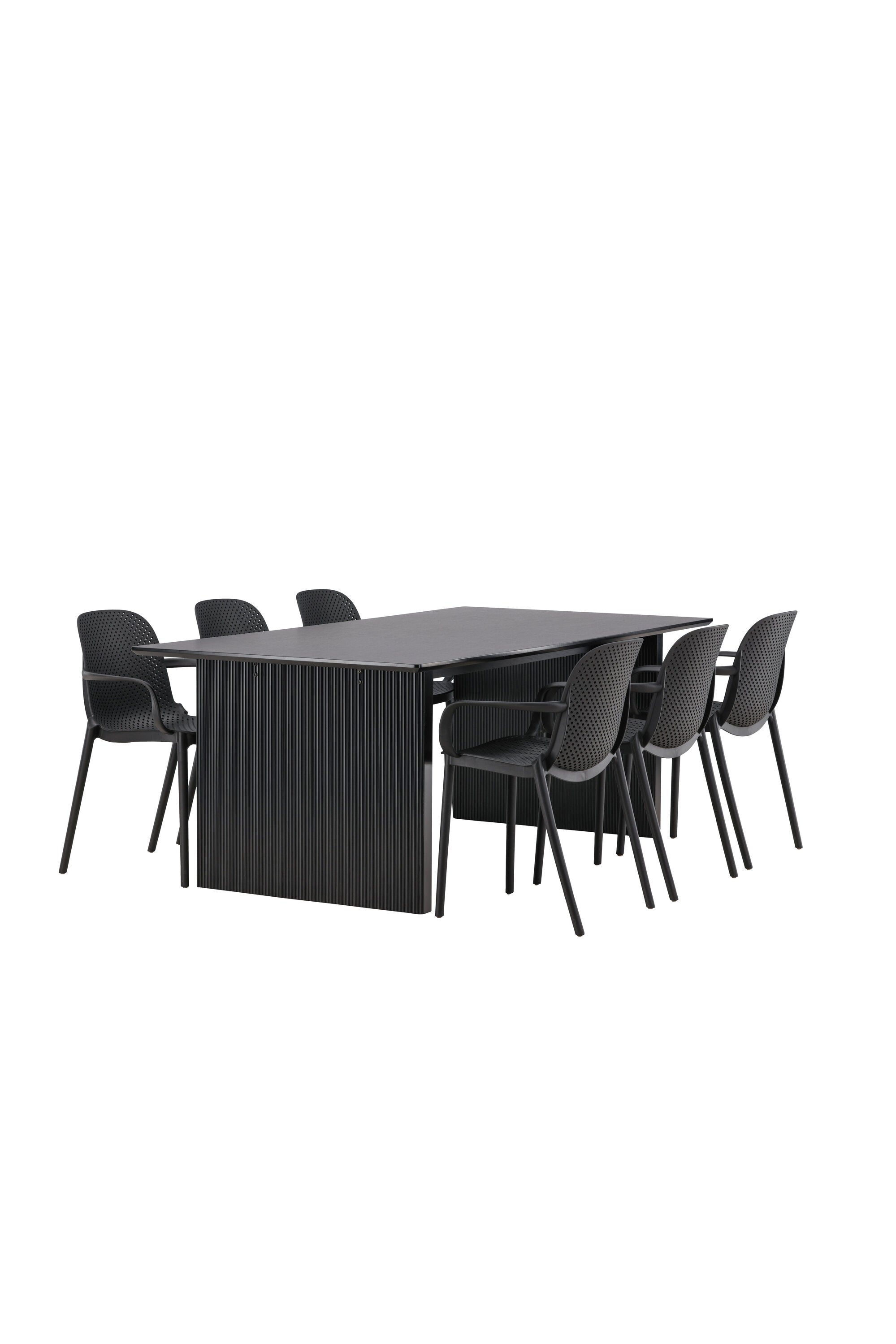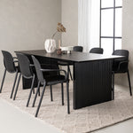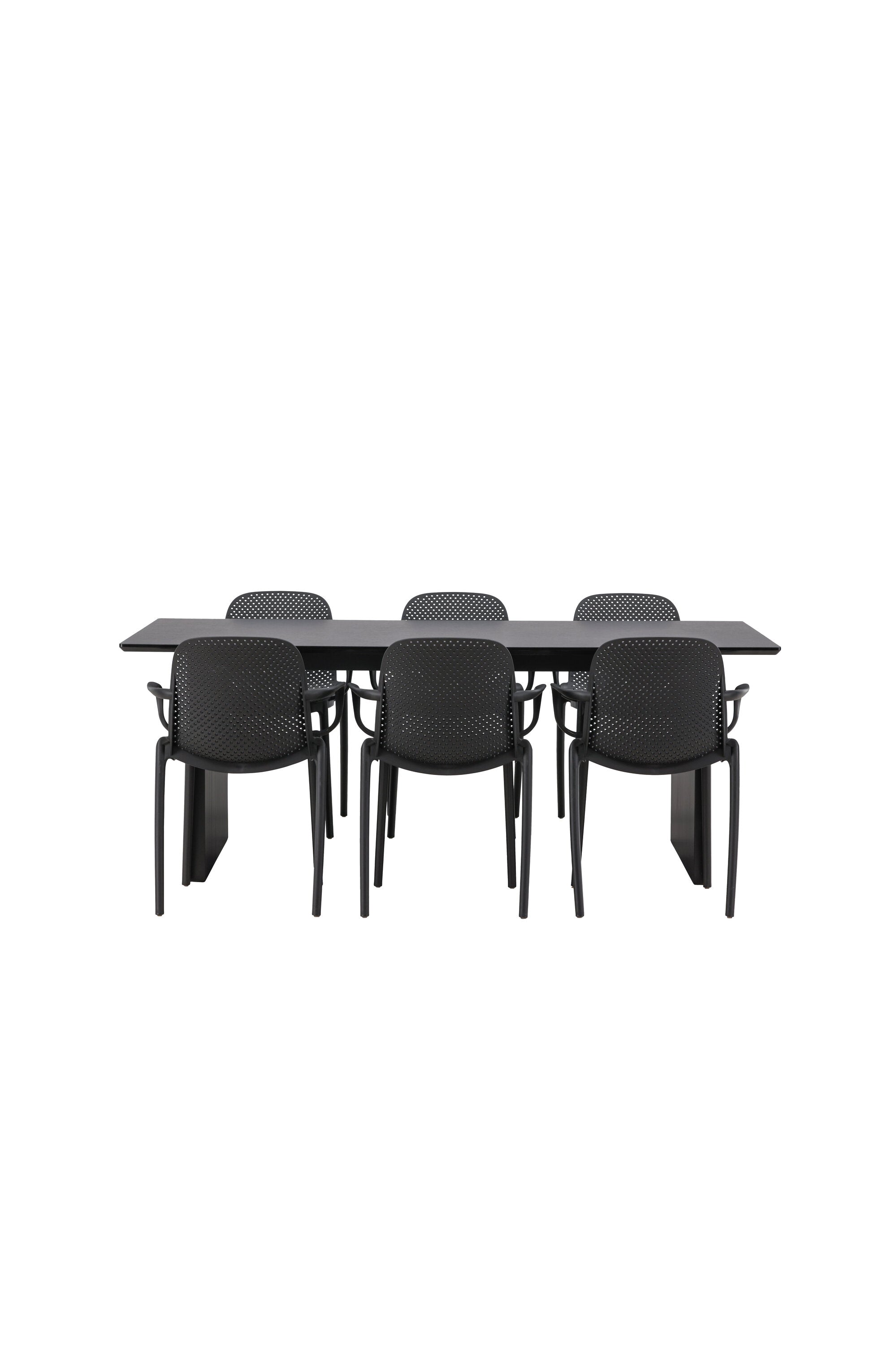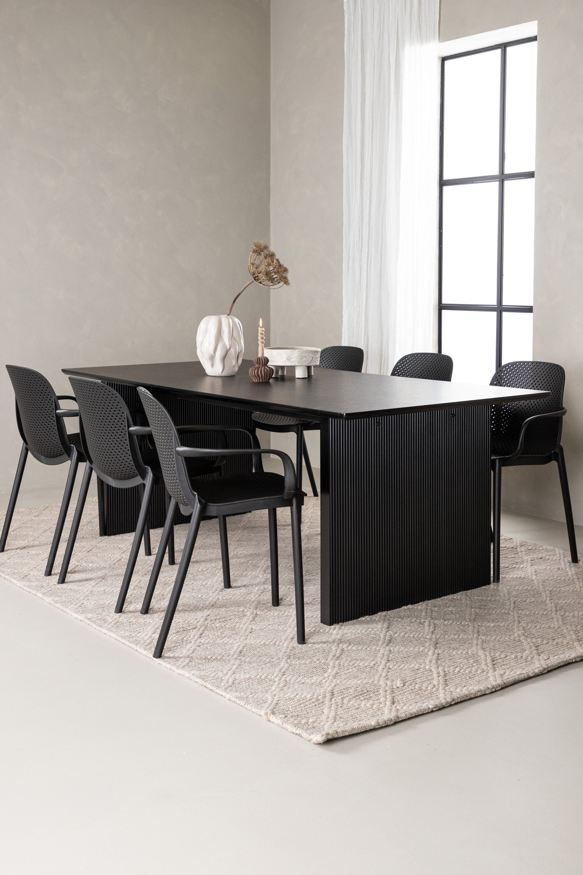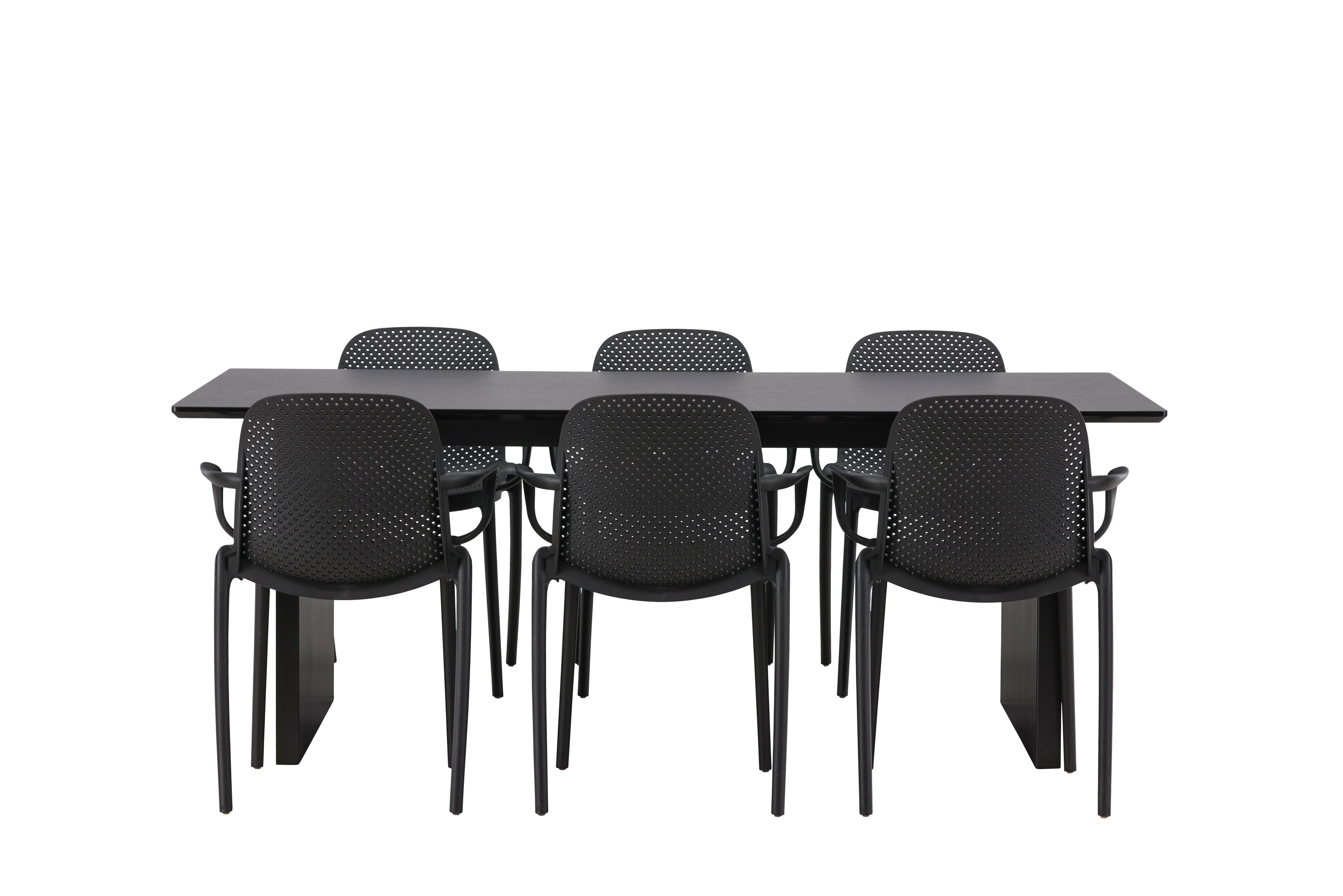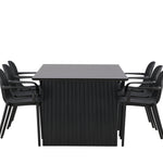 Tato jídelní skupina se perfektně hodí a rychle splyne se zbytkem dekorace! Náš obdélníkový jídelní stůl ze série Vail má rovné severské tvary a je vyroben z odolné MDF v ušpiněné černé barvě. Deska stolu je tenká a balancuje na dvou pevných dřevěných deskách, které tvoří podvozek – stejně úhledné a odolné. Zde spolu s jídelními židlemi ze série Baltimore. Židle mají průmyslový design v černém plastu, díky čemuž jsou stylové a zároveň odolné. Vytvořte si okouzlující středobod svého domova!