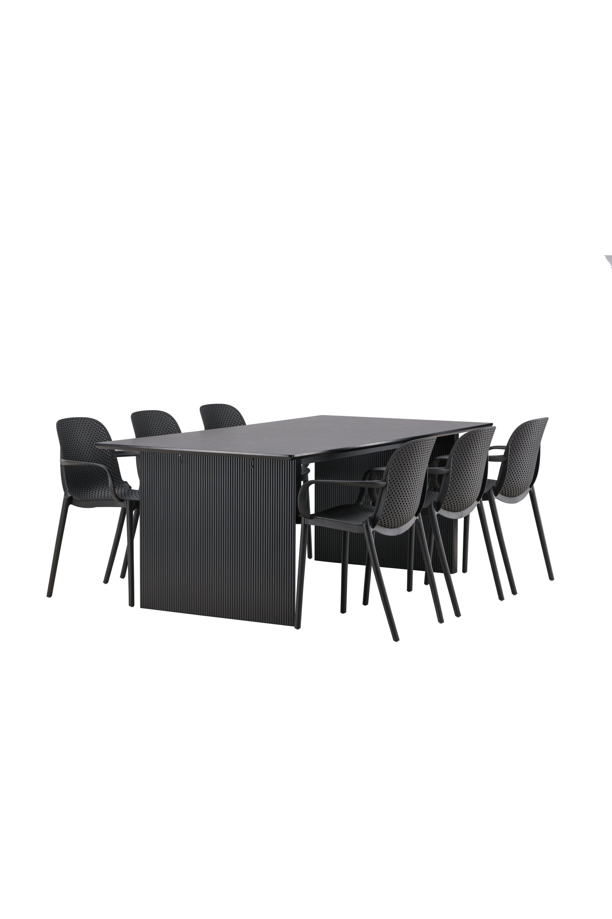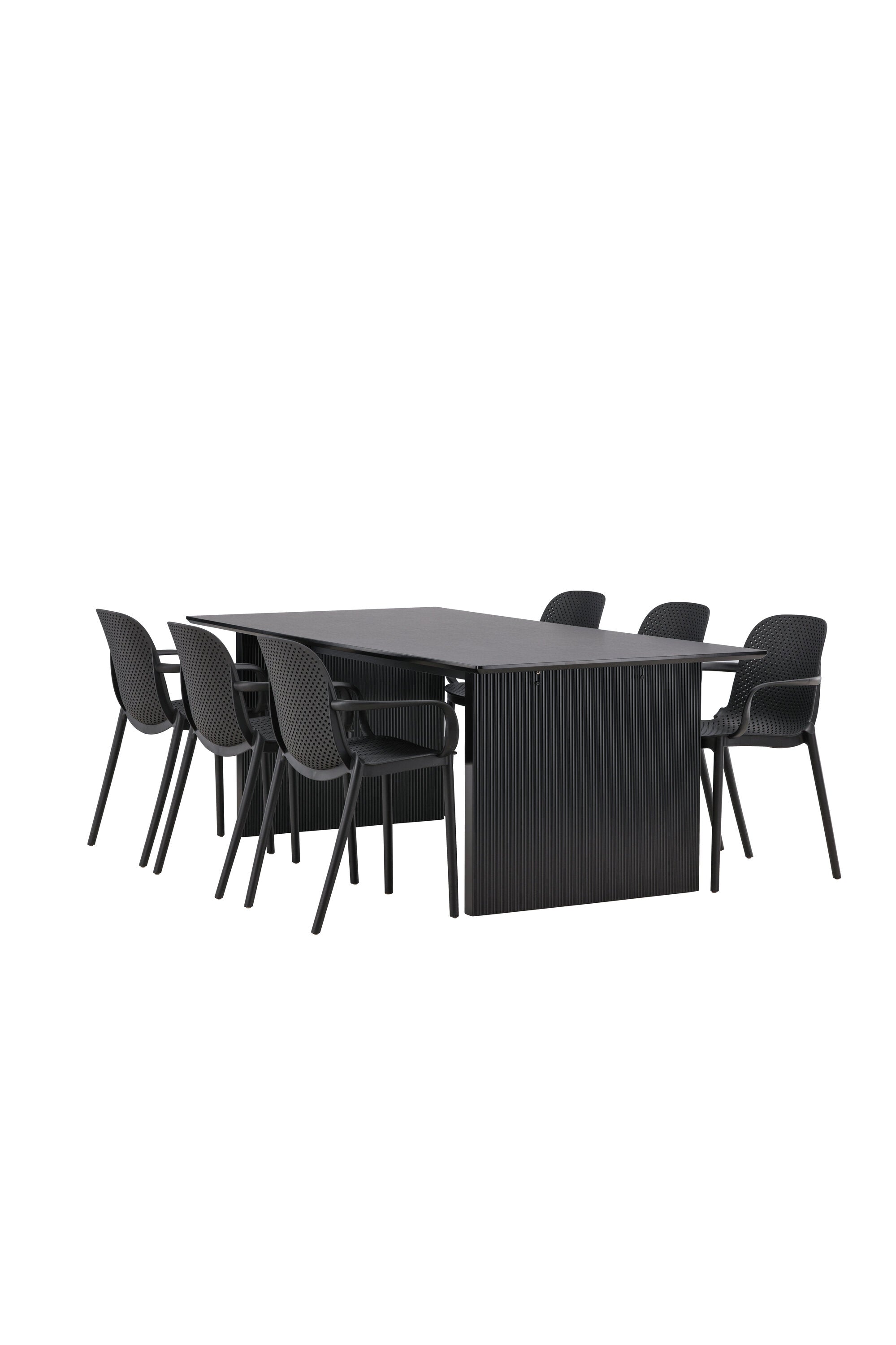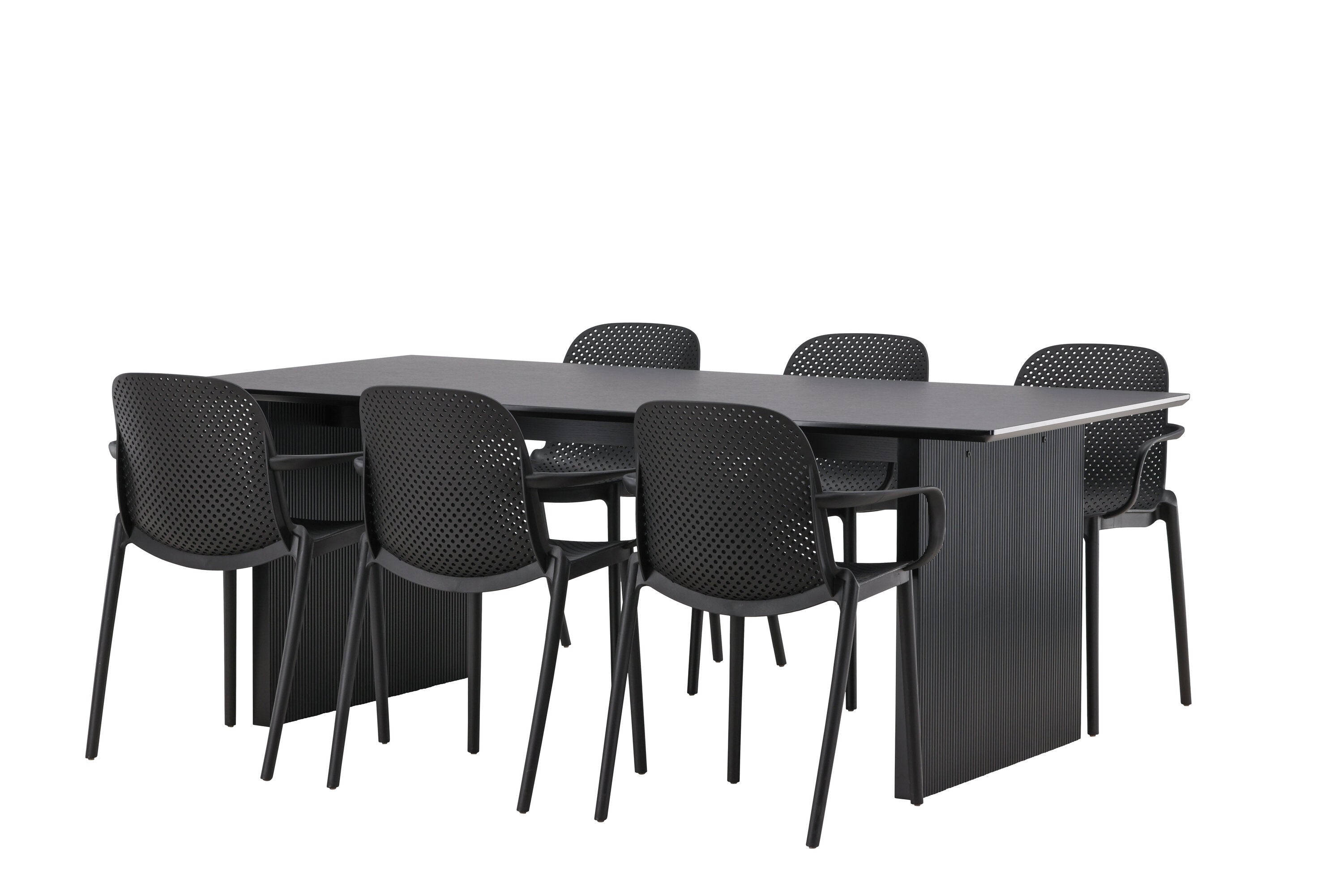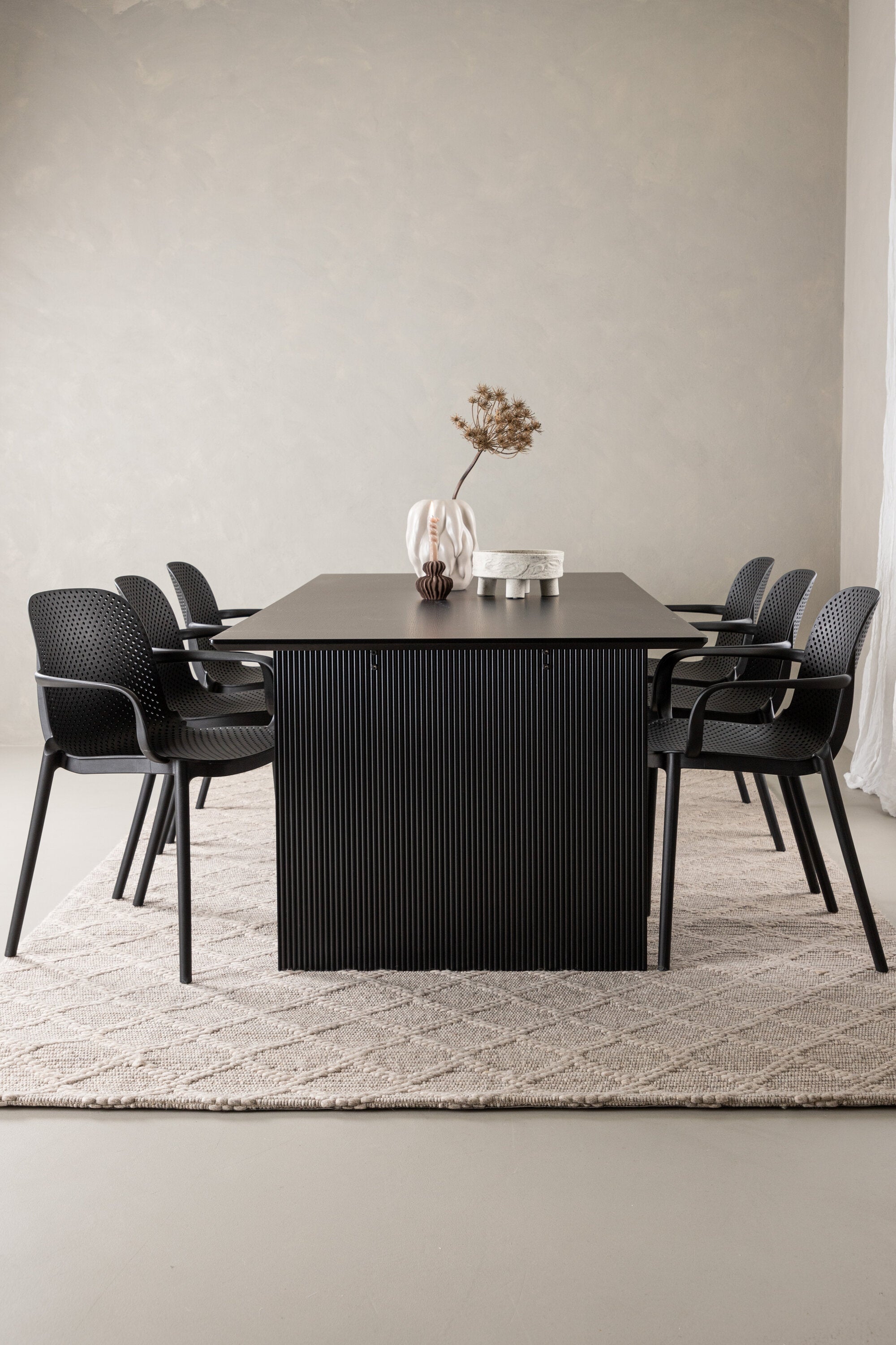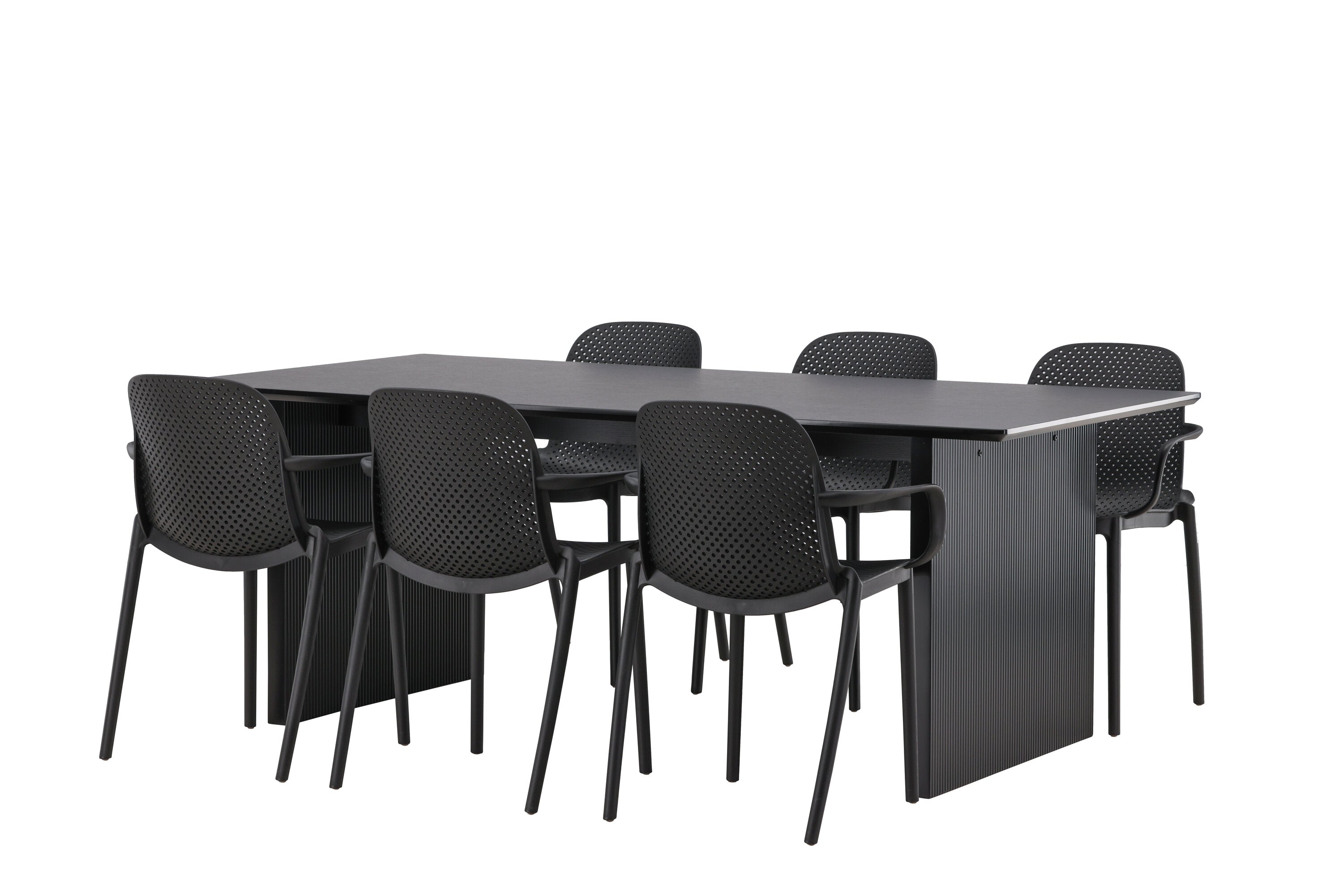 Tato jídelní skupina se perfektně hodí a rychle splyne se zbytkem dekorace! Náš obdélníkový jídelní stůl ze série Vail má rovné severské tvary a je vyroben z odolné MDF v ušpiněné černé barvě. Deska stolu je tenká a balancuje na dvou pevných dřevěných deskách, které tvoří podvozek – stejně úhledné a odolné. Zde spolu s jídelními židlemi ze série Baltimore. Židle mají průmyslový design v černém plastu, díky čemuž jsou stylové a zároveň odolné. Vytvořte si okouzlující středobod svého domova!