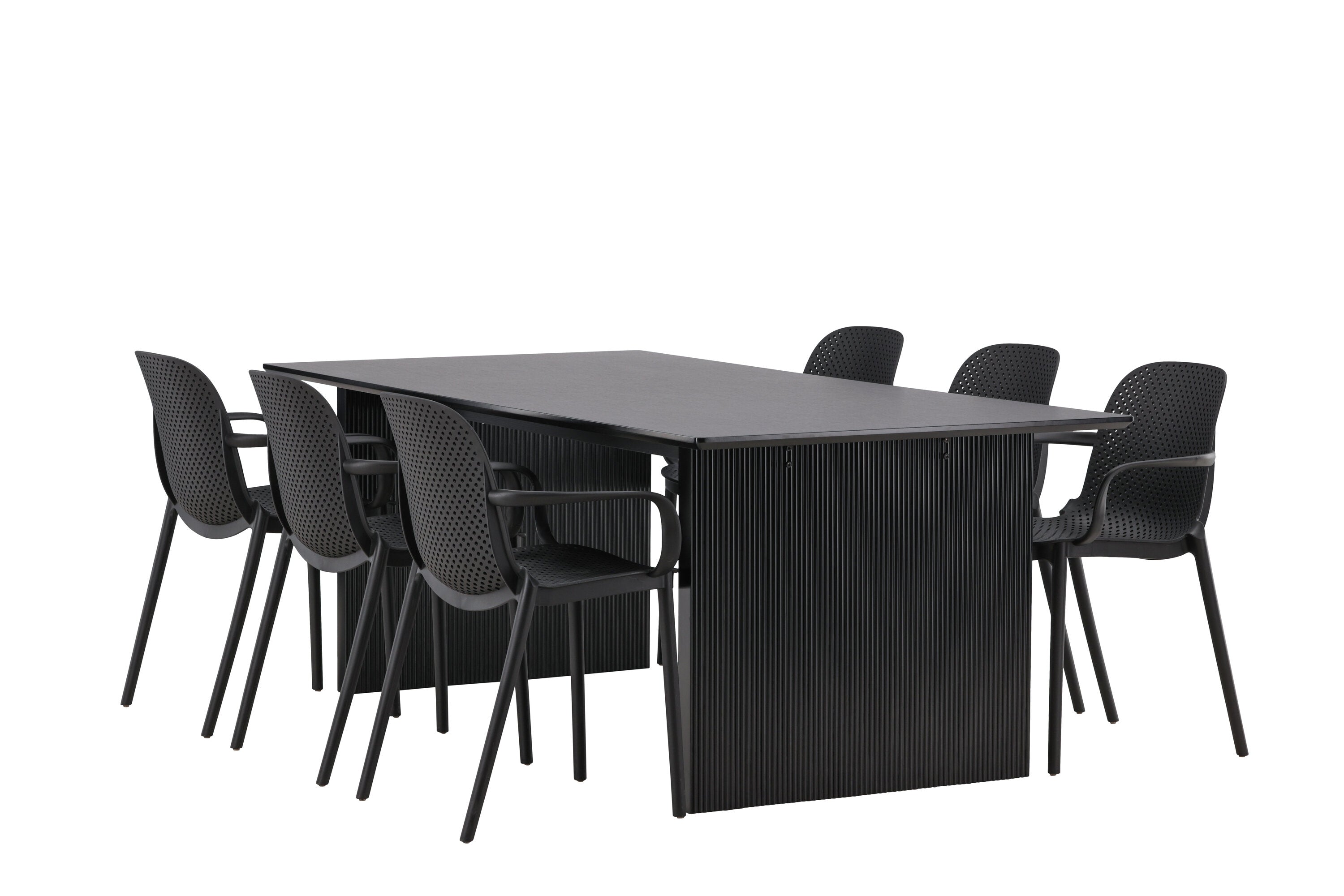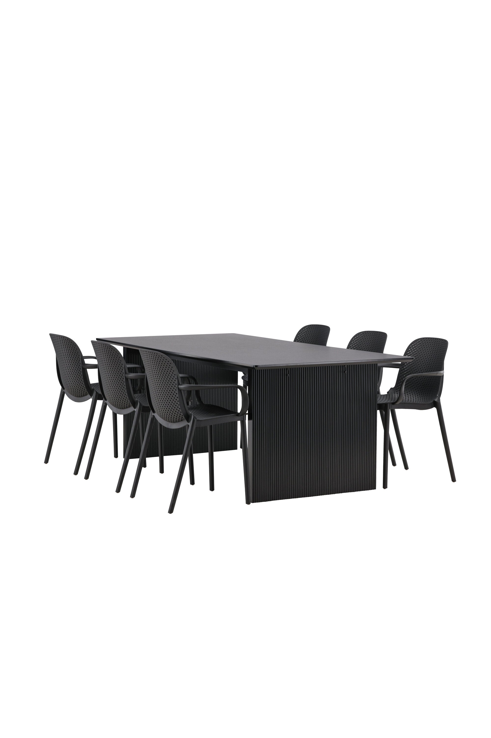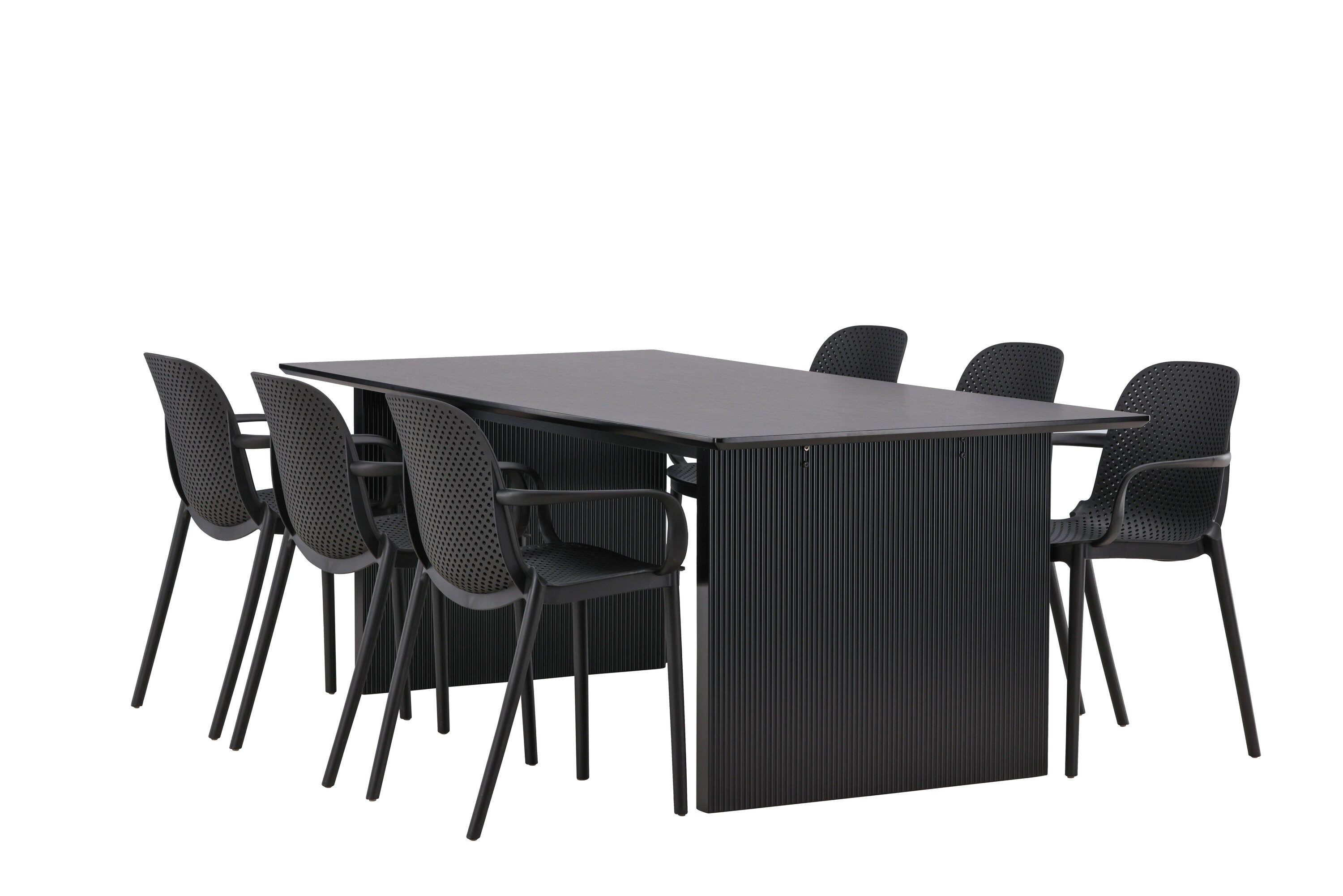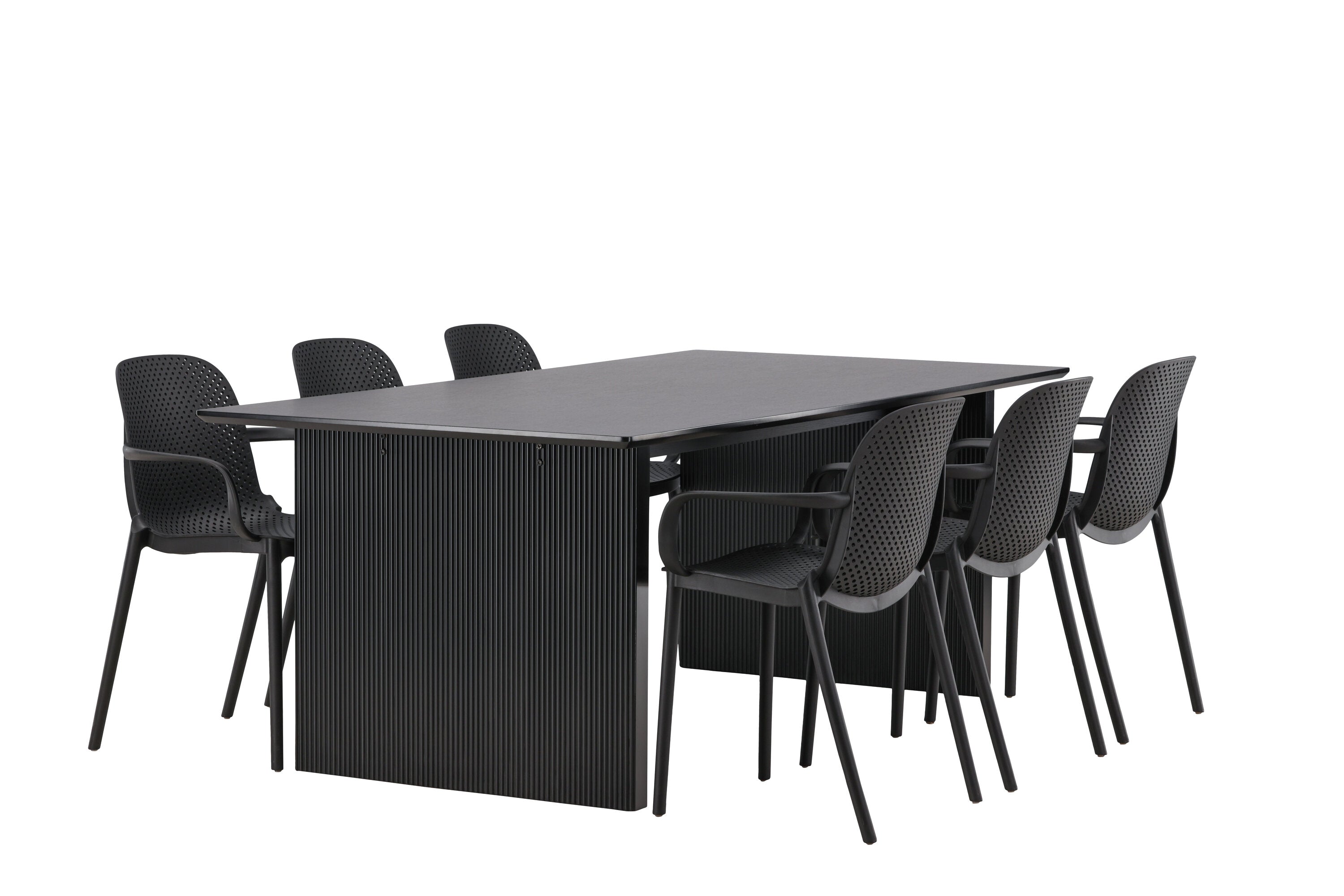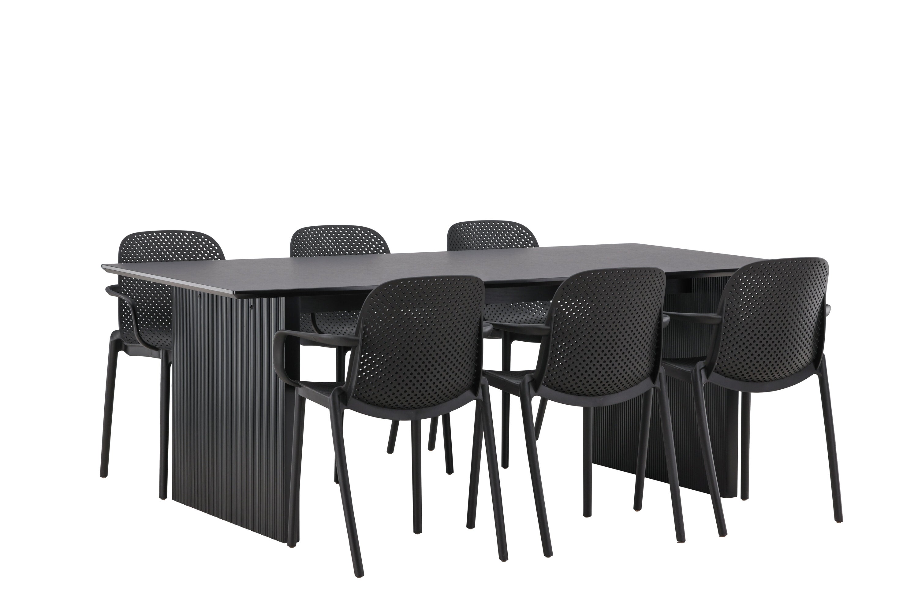 Tato jídelní skupina se perfektně hodí a rychle splyne se zbytkem dekorace! Náš obdélníkový jídelní stůl ze série Vail má rovné severské tvary a je vyroben z odolné MDF v ušpiněné černé barvě. Deska stolu je tenká a balancuje na dvou pevných dřevěných deskách, které tvoří podvozek – stejně úhledné a odolné. Zde spolu s jídelními židlemi ze série Baltimore. Židle mají průmyslový design v černém plastu, díky čemuž jsou stylové a zároveň odolné. Vytvořte si okouzlující středobod svého domova!