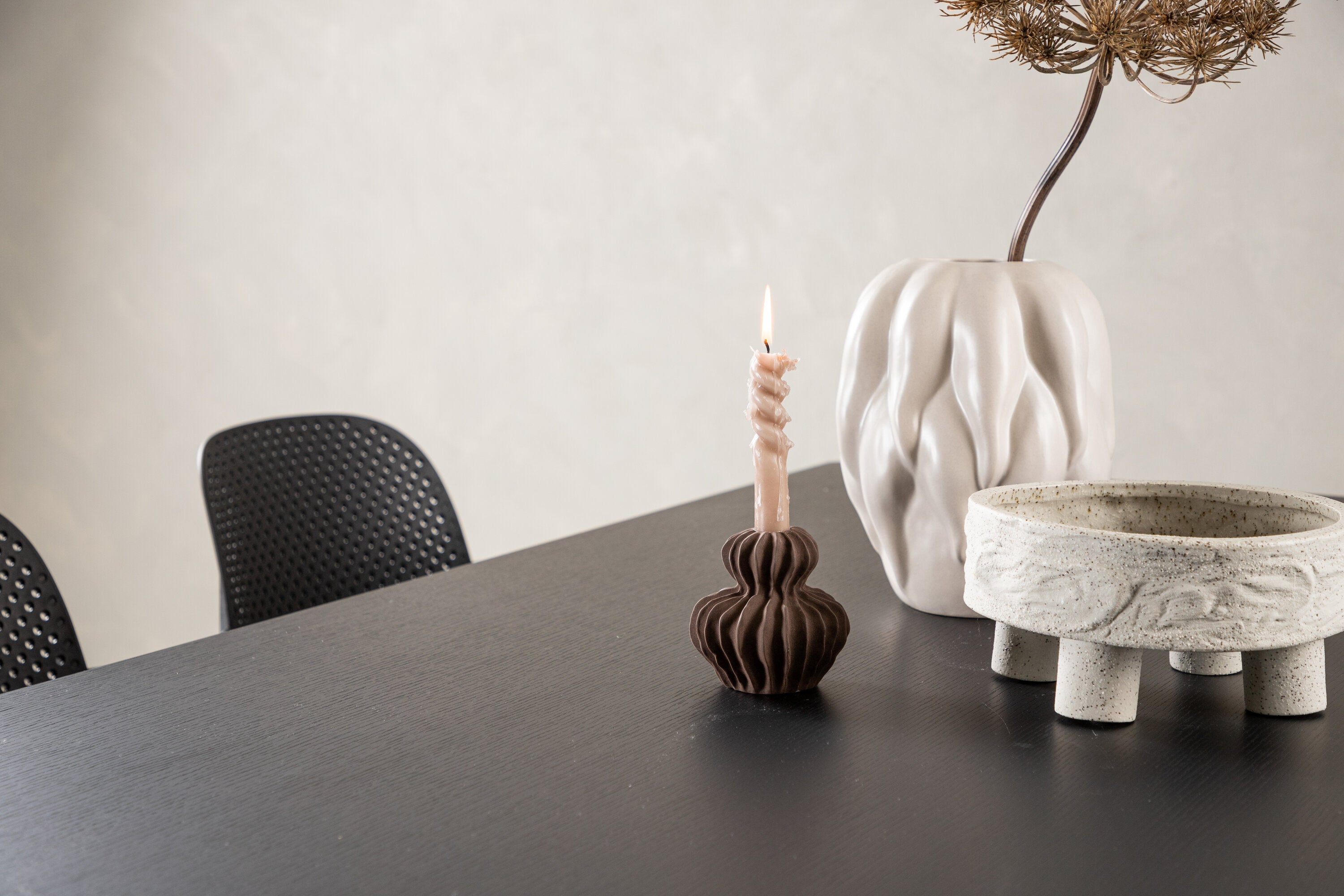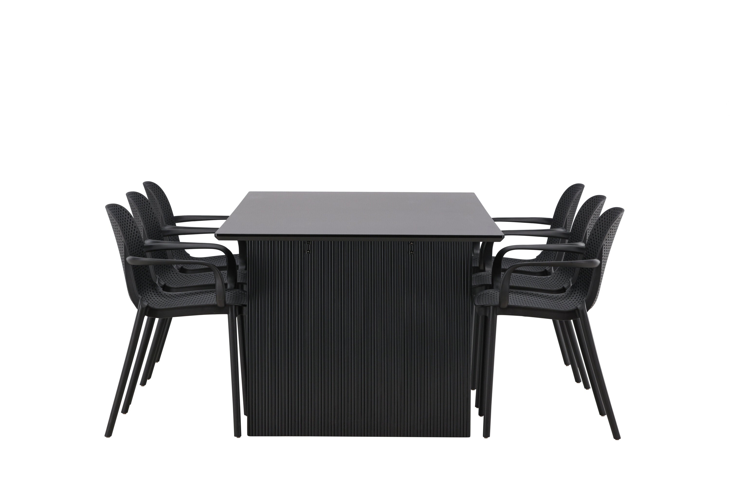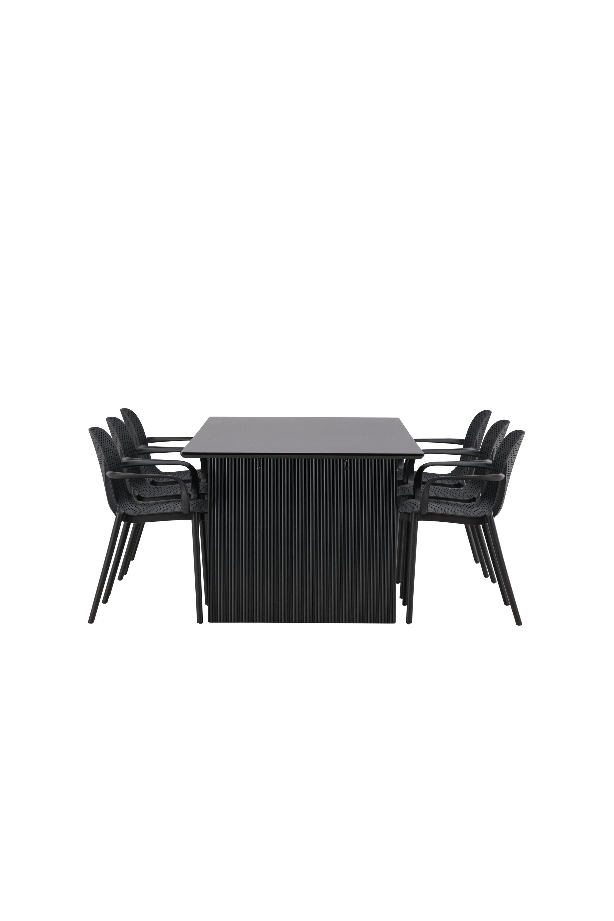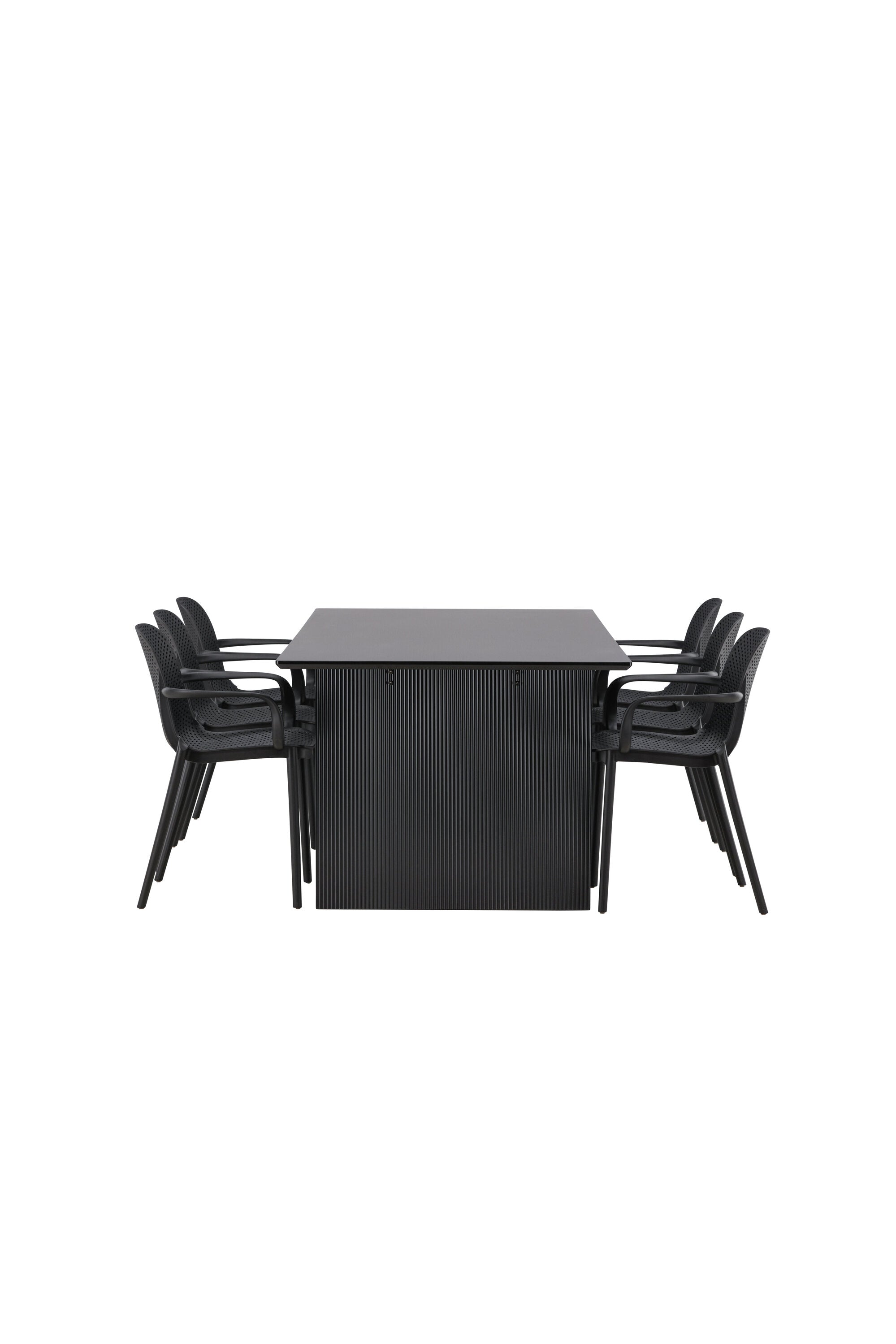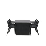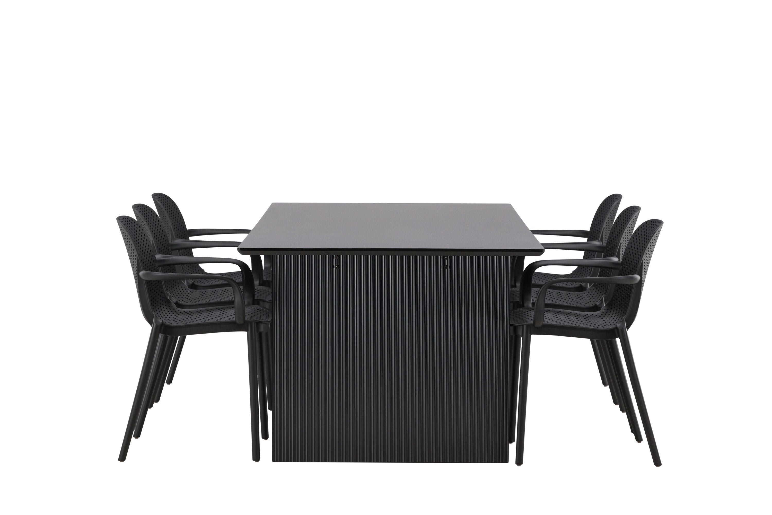 Tato jídelní skupina se perfektně hodí a rychle splyne se zbytkem dekorace! Náš obdélníkový jídelní stůl ze série Vail má rovné severské tvary a je vyroben z odolné MDF v ušpiněné černé barvě. Deska stolu je tenká a balancuje na dvou pevných dřevěných deskách, které tvoří podvozek – stejně úhledné a odolné. Zde spolu s jídelními židlemi ze série Baltimore. Židle mají průmyslový design v černém plastu, díky čemuž jsou stylové a zároveň odolné. Vytvořte si okouzlující středobod svého domova!