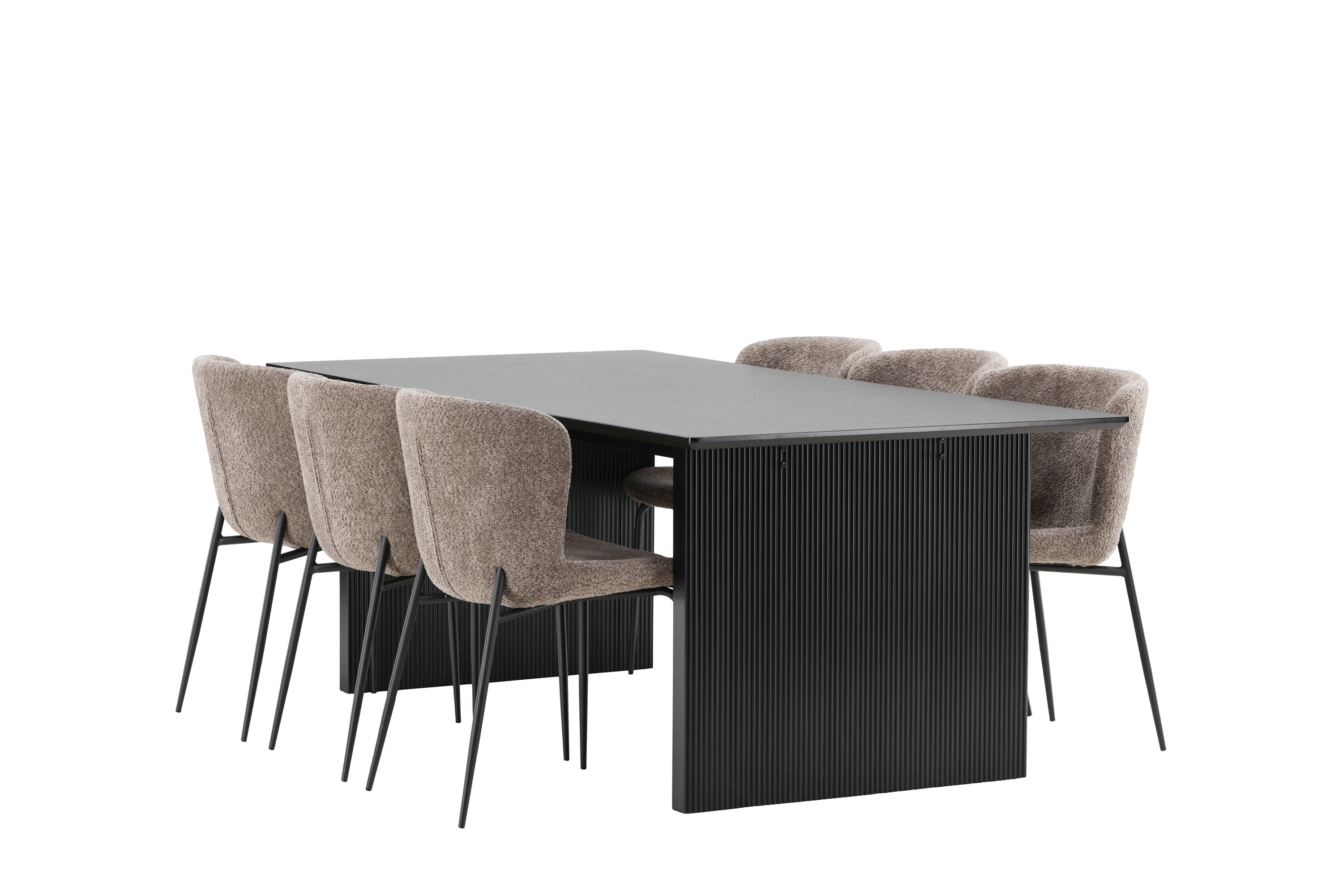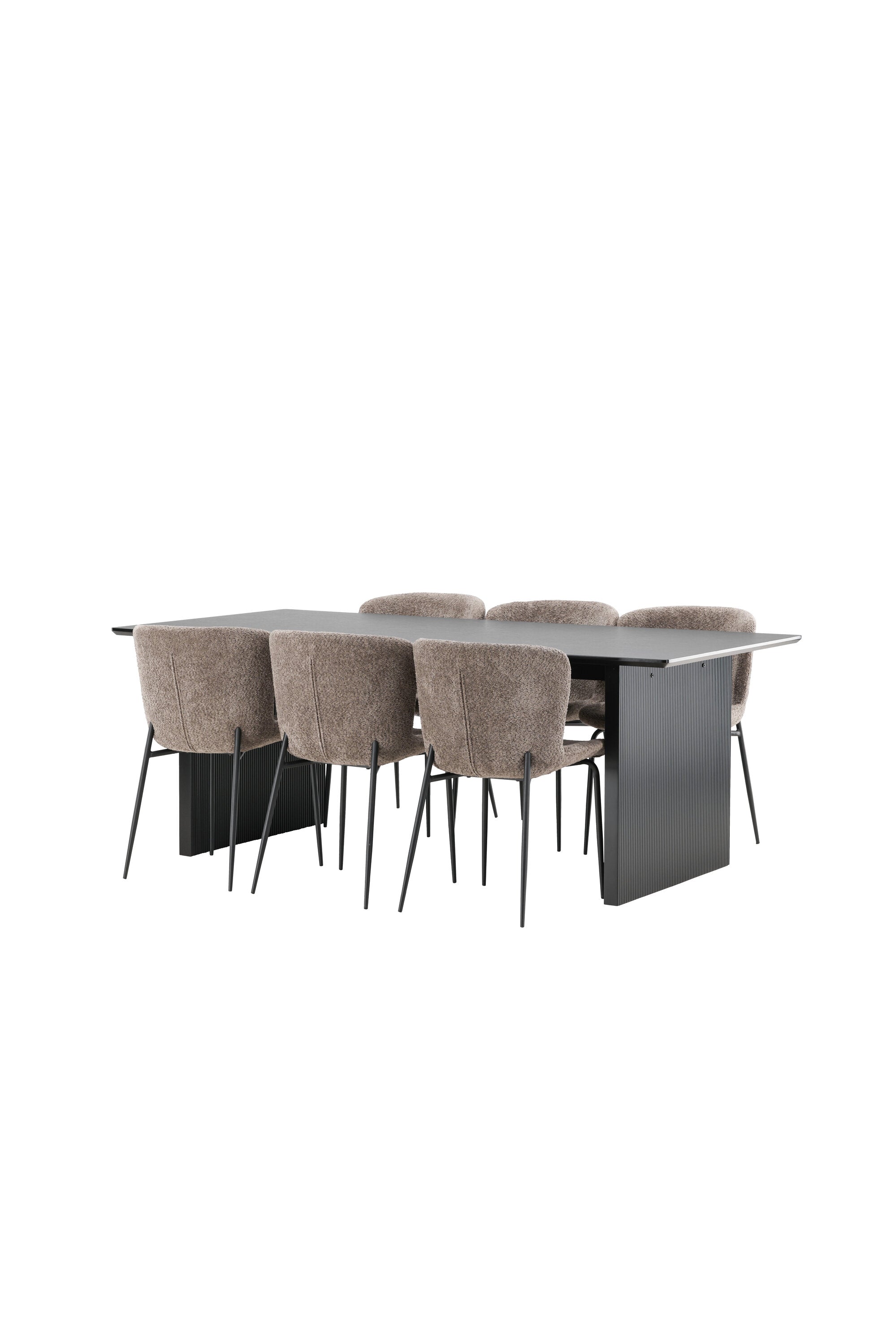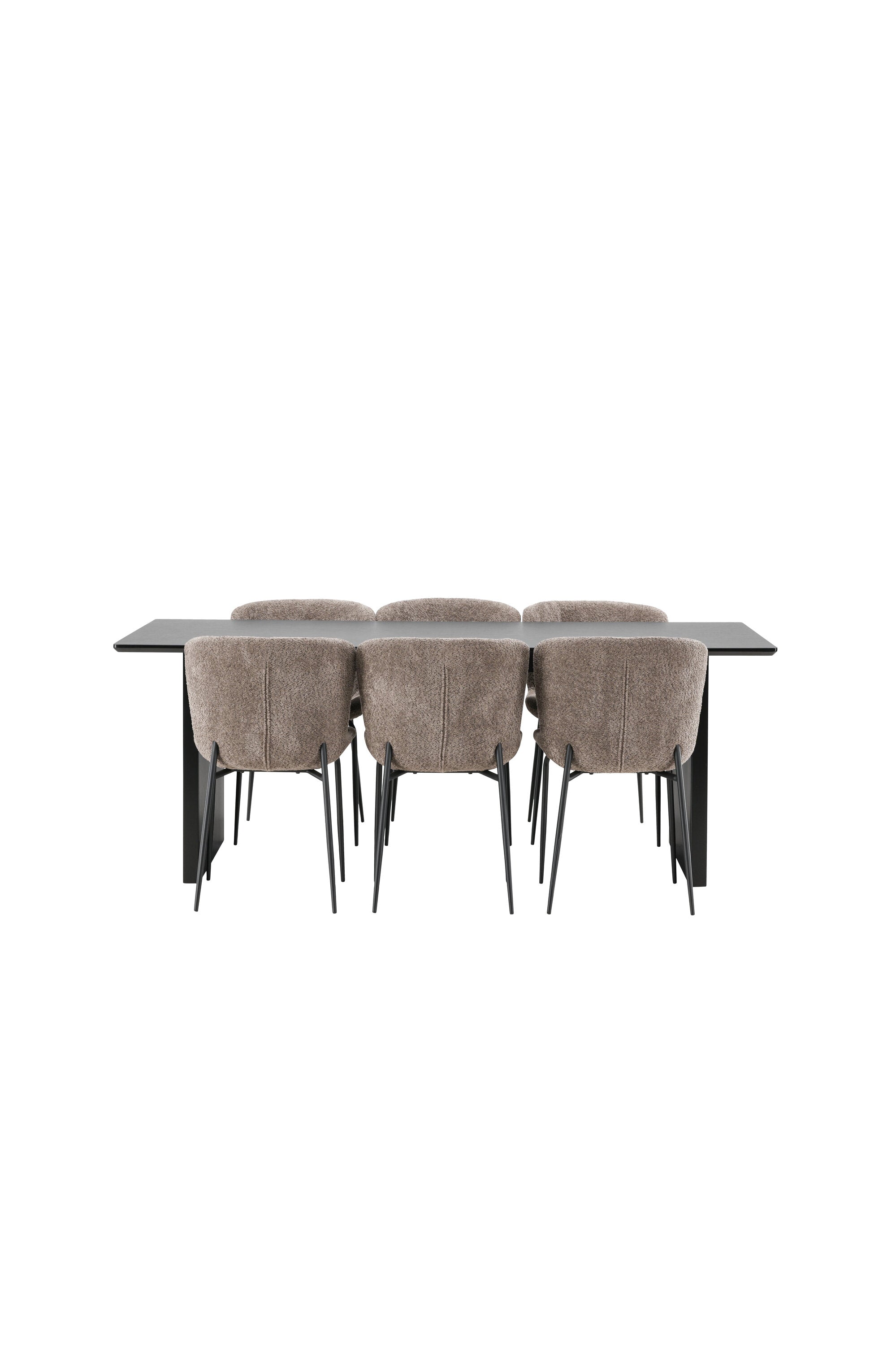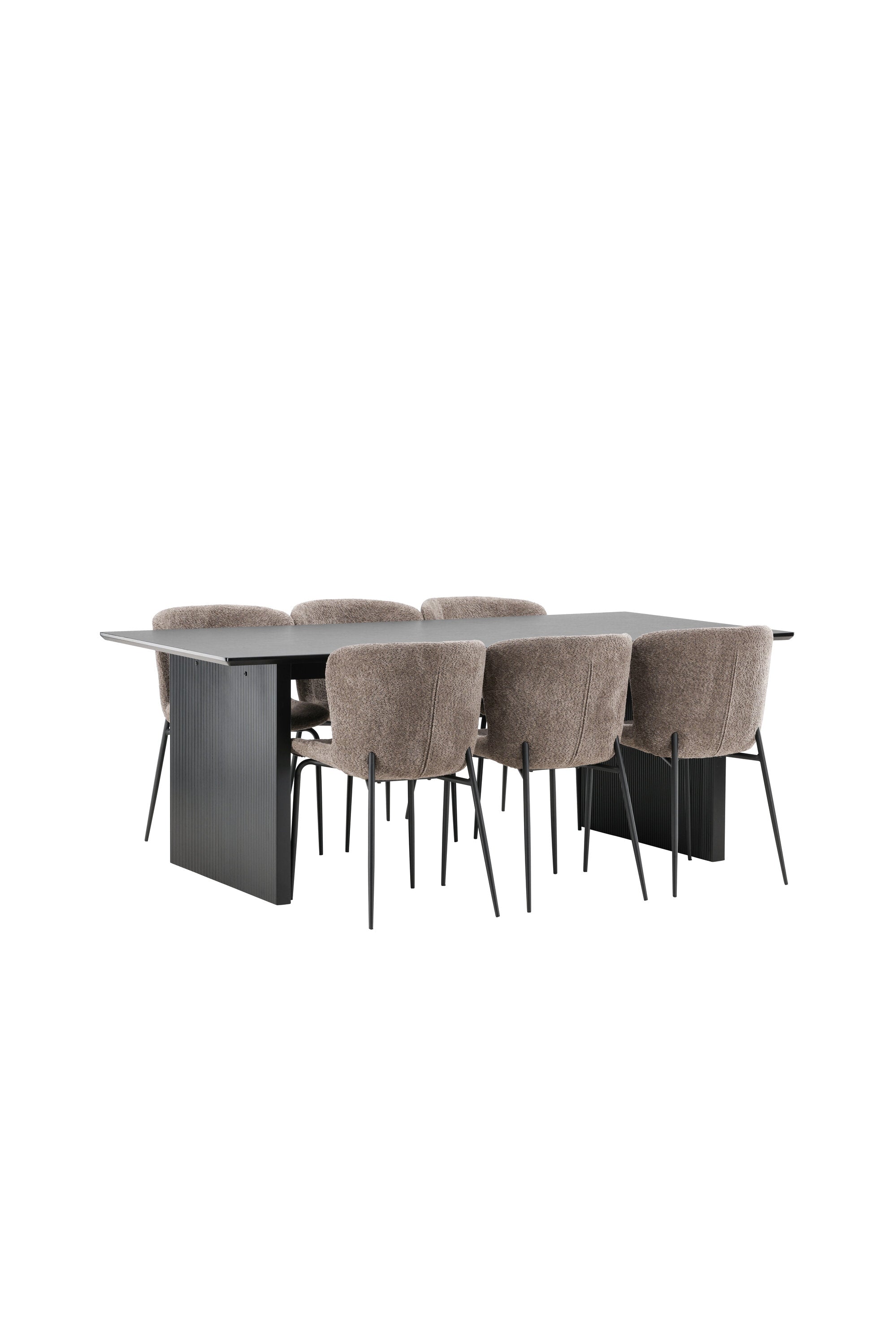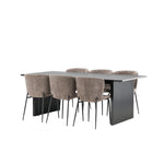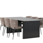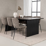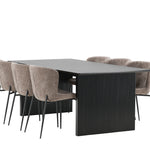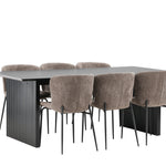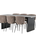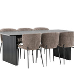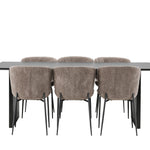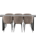 Jídelní skupina navržená zcela v souladu s trendy! Náš obdélníkový jídelní stůl ze série Vail má rovné severské tvary a je vyroben z odolné MDF v ušpiněné černé barvě. Deska stolu je tenká a balancuje na dvou pevných dřevěných deskách, které tvoří podvozek – stejně úhledné a odolné. Zde v luxusní kombinaci s našimi pohodlnými jídelními židlemi Modesto. Židle je celočalouněná béžovou bouclé látkou se stylovými úzkými nohami v černém kovu. Mírně zaoblená záda a čalouněný sedák poskytují extra pohodlí a rozšiřují příjemné jídlo kolem jídelního stolu. Mělo by to být příjemné sedět u dobrého jídla!