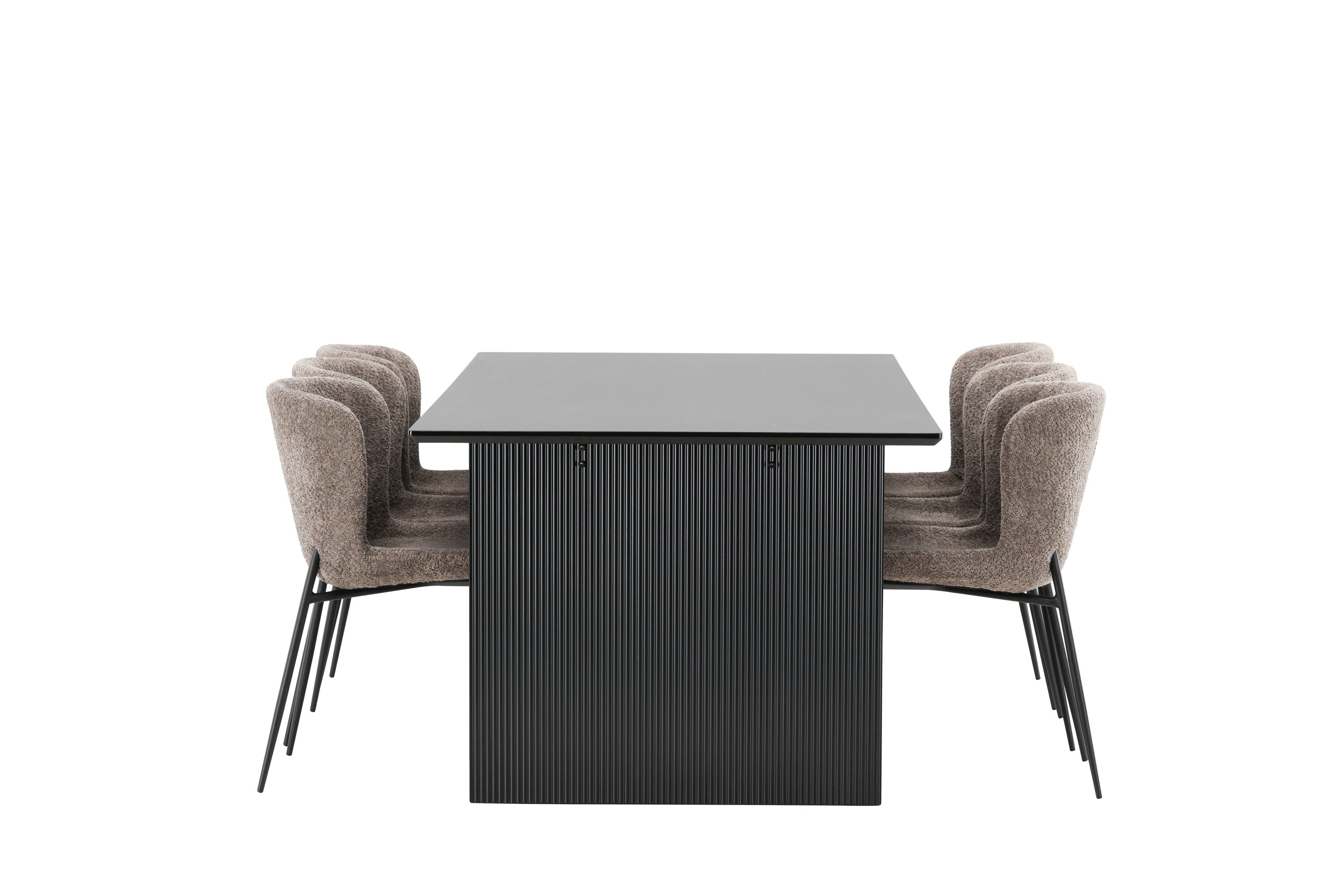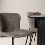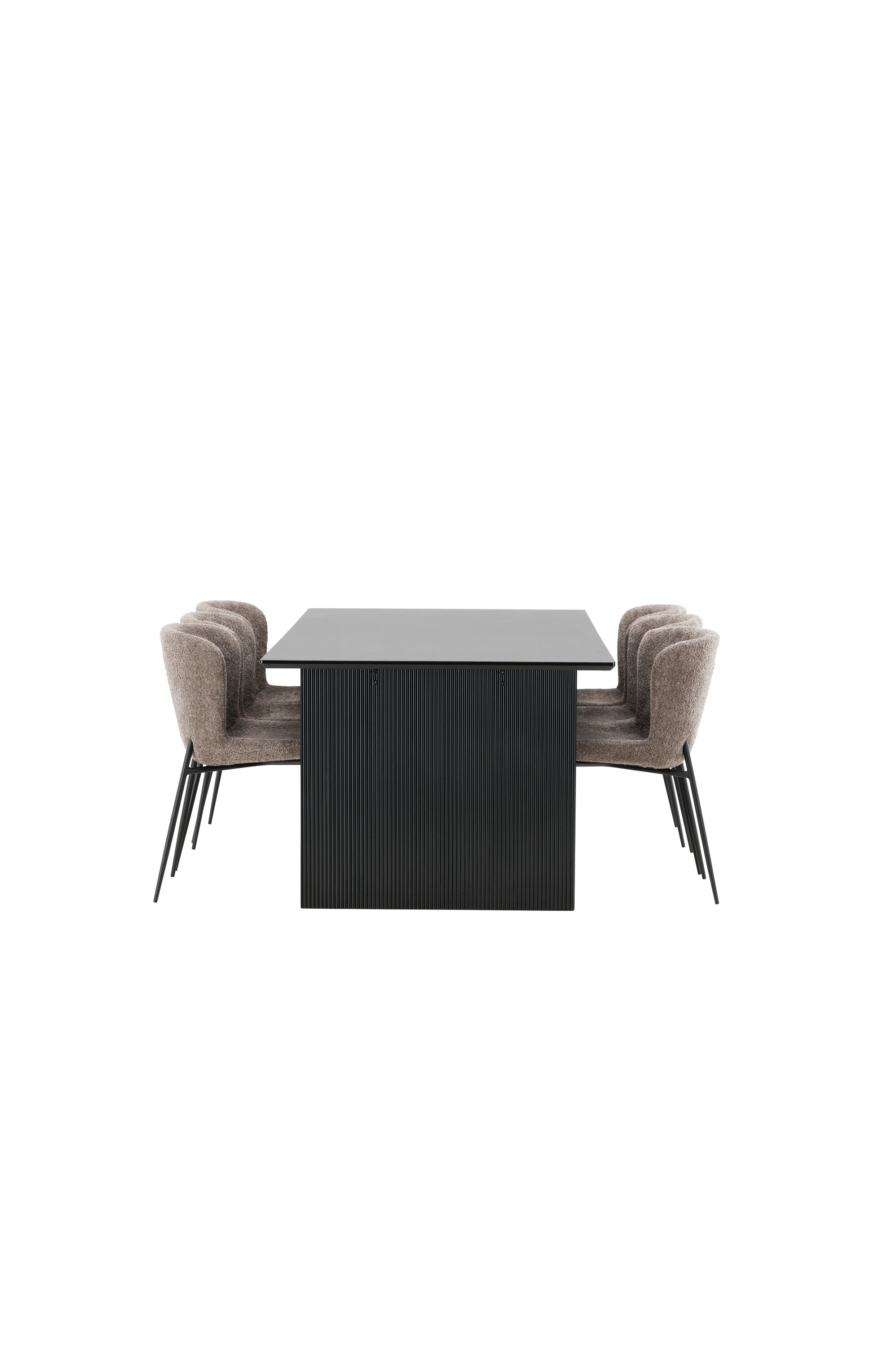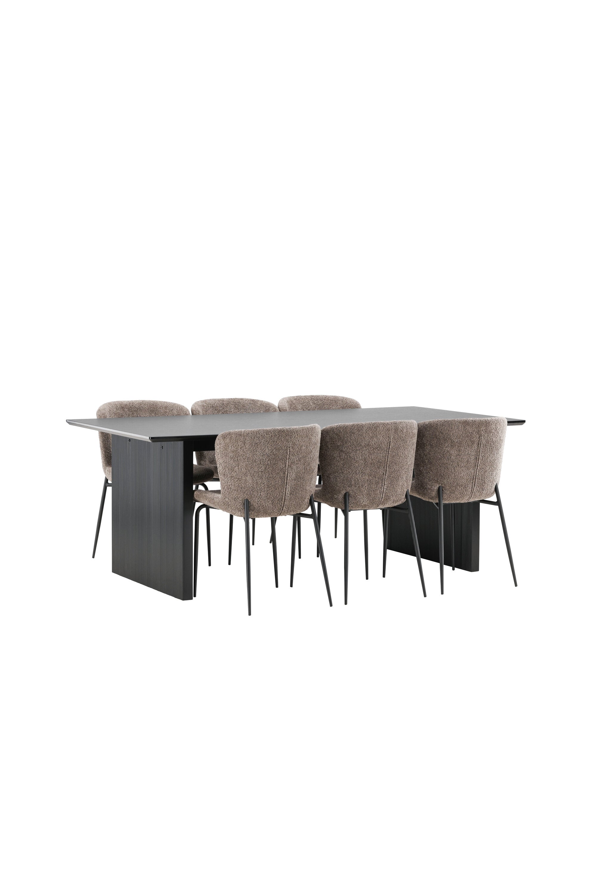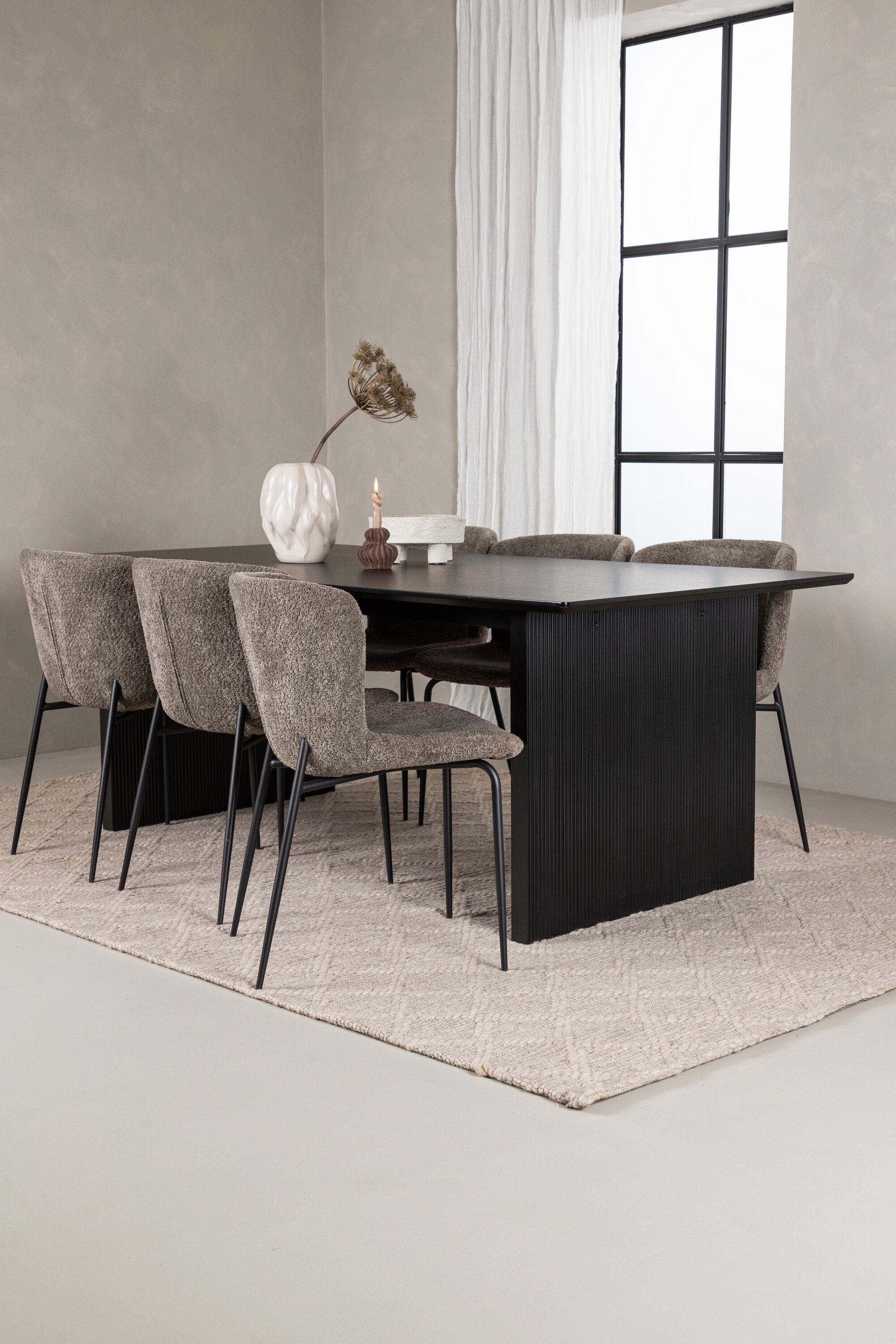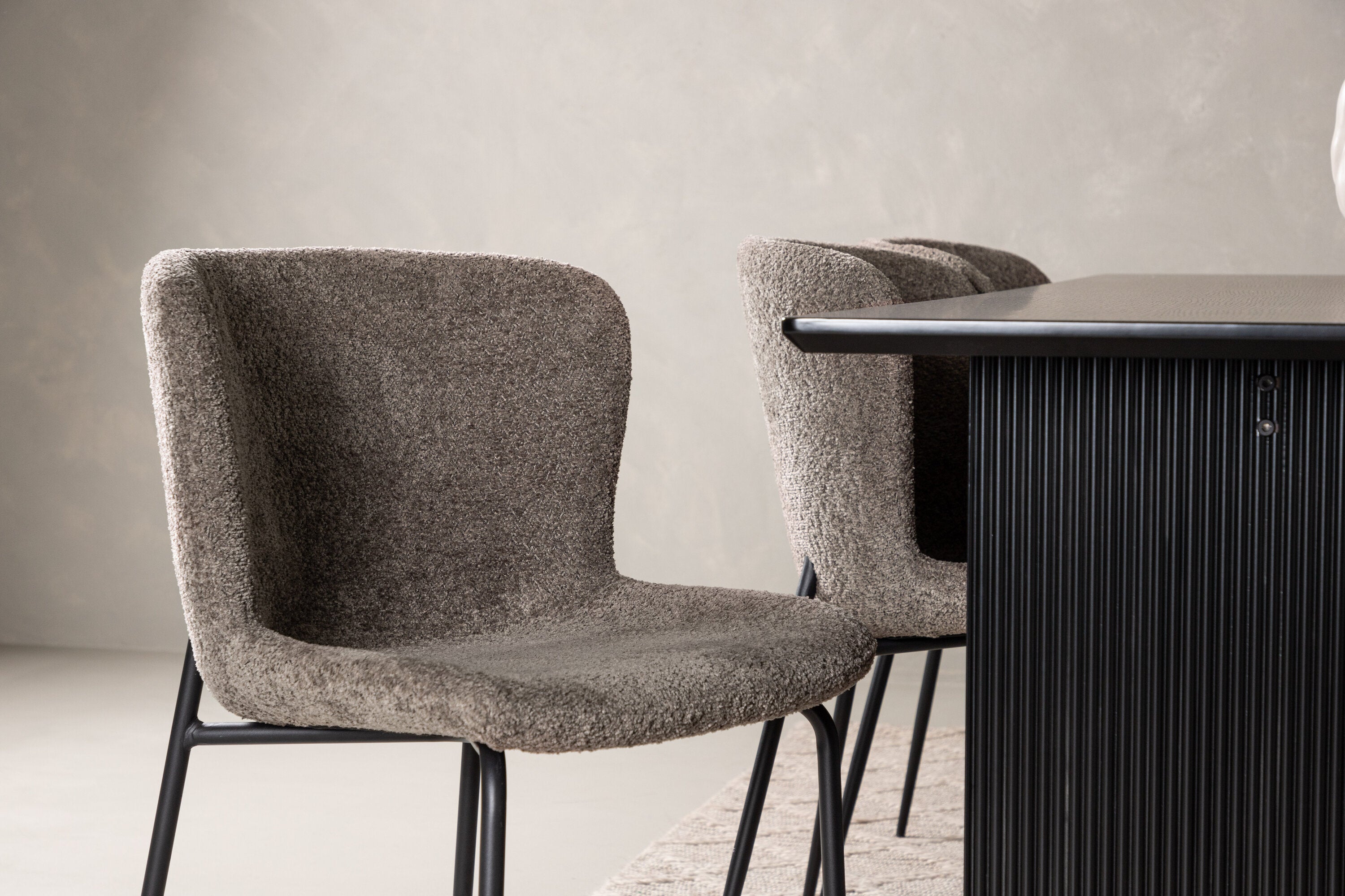 Jídelní skupina navržená zcela v souladu s trendy! Náš obdélníkový jídelní stůl ze série Vail má rovné severské tvary a je vyroben z odolné MDF v ušpiněné černé barvě. Deska stolu je tenká a balancuje na dvou pevných dřevěných deskách, které tvoří podvozek – stejně úhledné a odolné. Zde v luxusní kombinaci s našimi pohodlnými jídelními židlemi Modesto. Židle je celočalouněná béžovou bouclé látkou se stylovými úzkými nohami v černém kovu. Mírně zaoblená záda a čalouněný sedák poskytují extra pohodlí a rozšiřují příjemné jídlo kolem jídelního stolu. Mělo by to být příjemné sedět u dobrého jídla!