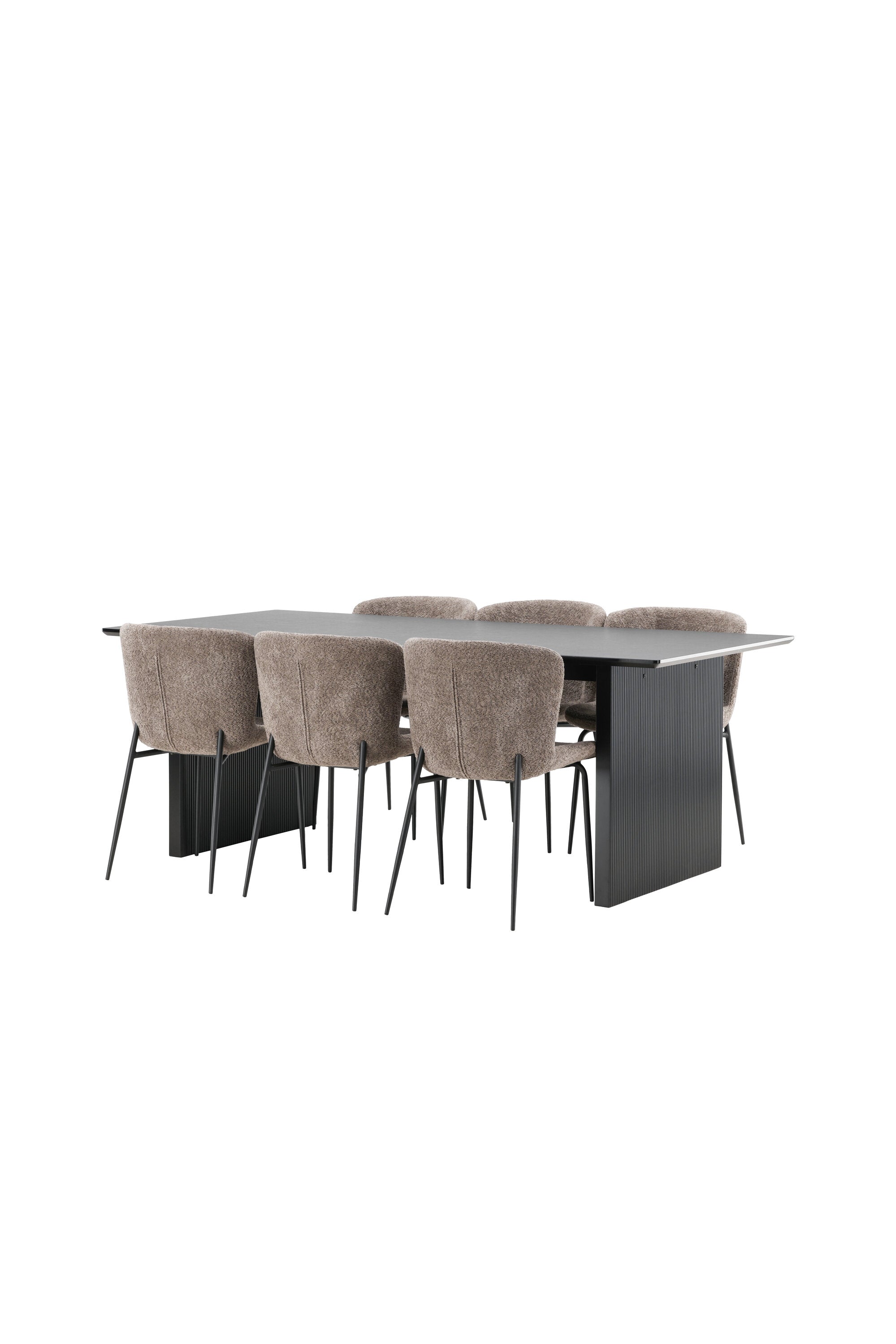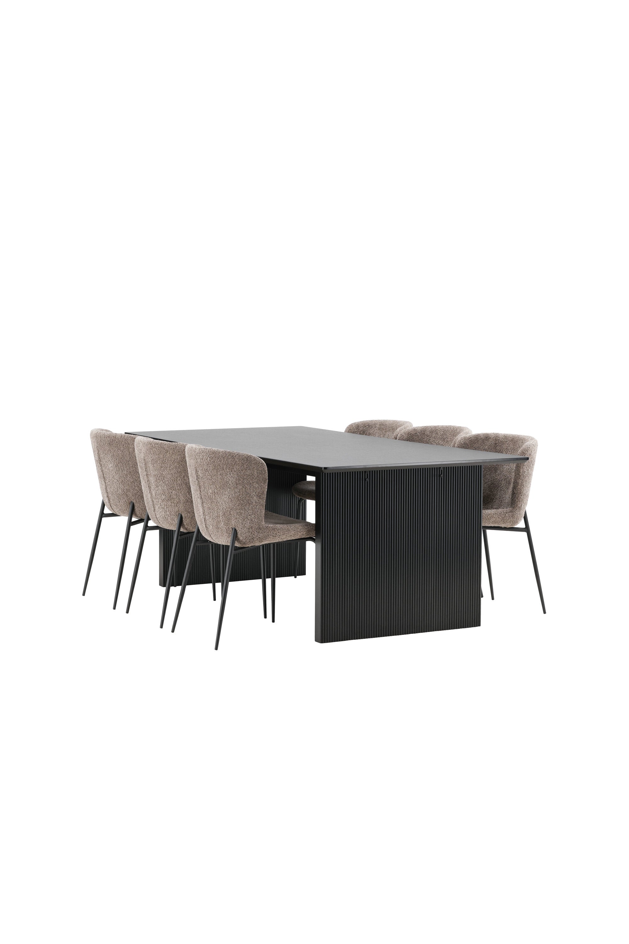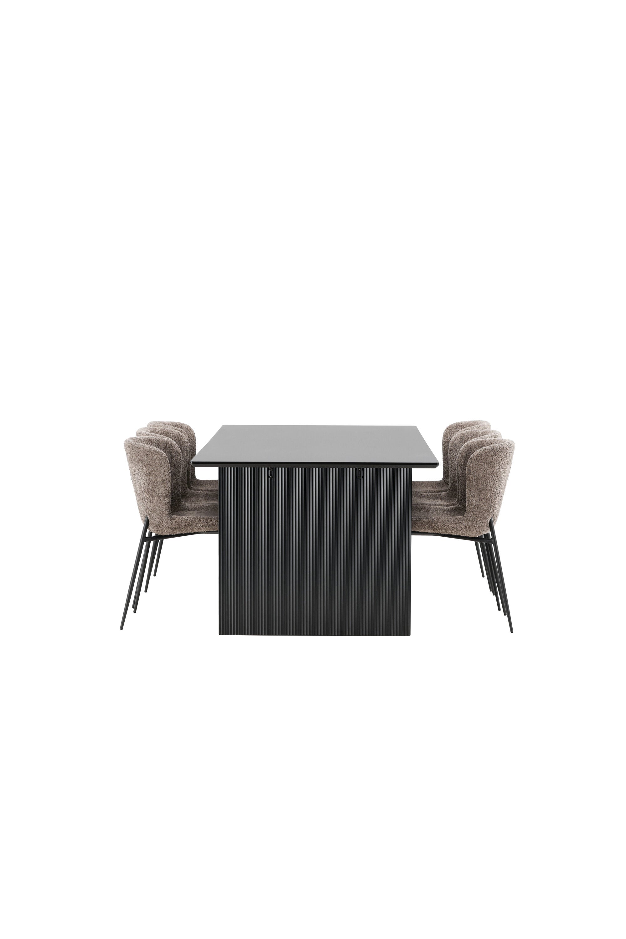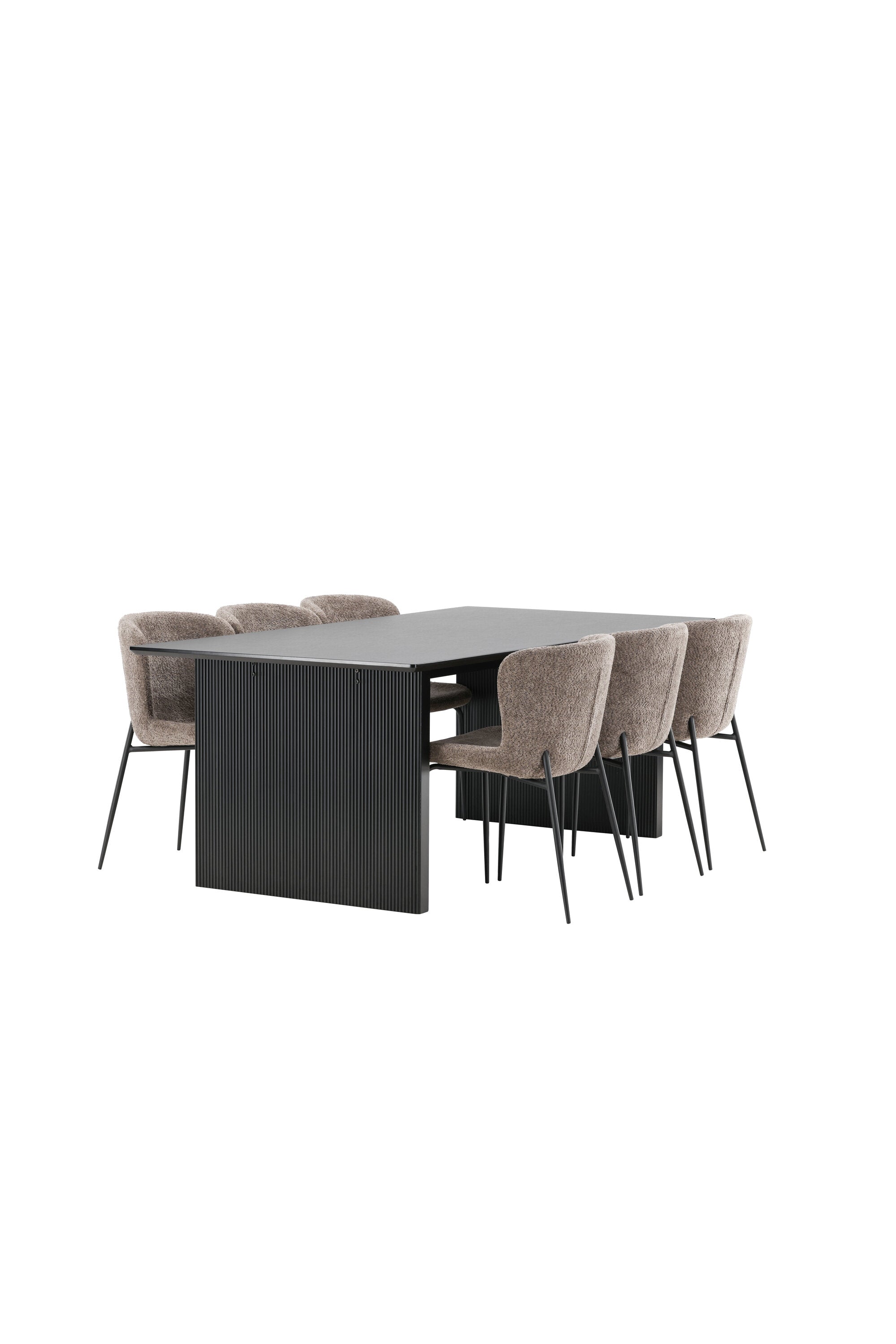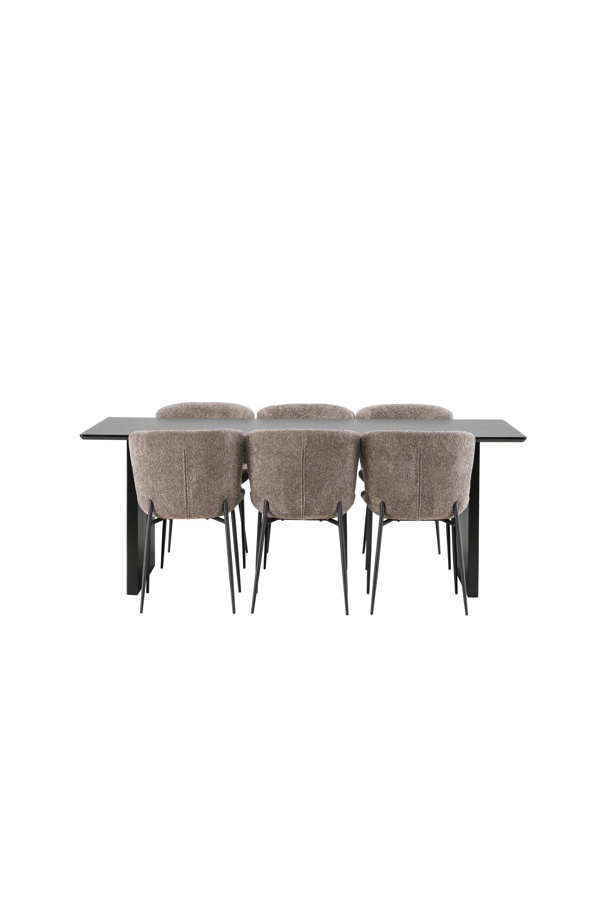 Jídelní skupina navržená zcela v souladu s trendy! Náš obdélníkový jídelní stůl ze série Vail má rovné severské tvary a je vyroben z odolné MDF v ušpiněné černé barvě. Deska stolu je tenká a balancuje na dvou pevných dřevěných deskách, které tvoří podvozek – stejně úhledné a odolné. Zde v luxusní kombinaci s našimi pohodlnými jídelními židlemi Modesto. Židle je celočalouněná béžovou bouclé látkou se stylovými úzkými nohami v černém kovu. Mírně zaoblená záda a čalouněný sedák poskytují extra pohodlí a rozšiřují příjemné jídlo kolem jídelního stolu. Mělo by to být příjemné sedět u dobrého jídla!
