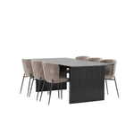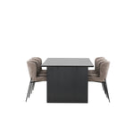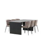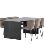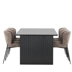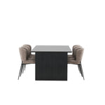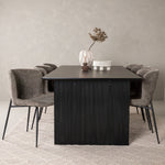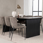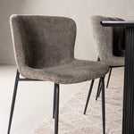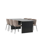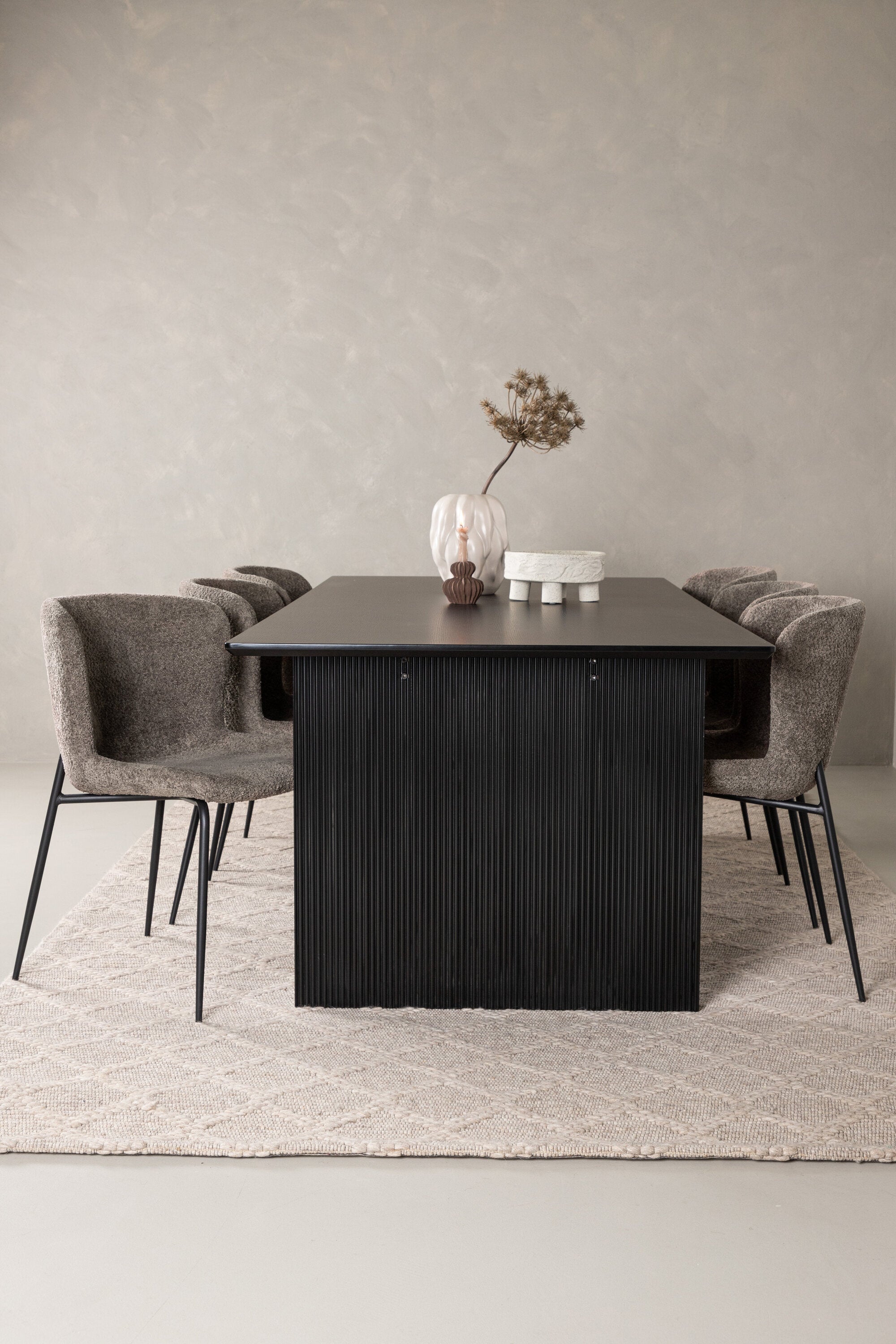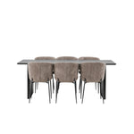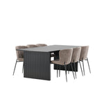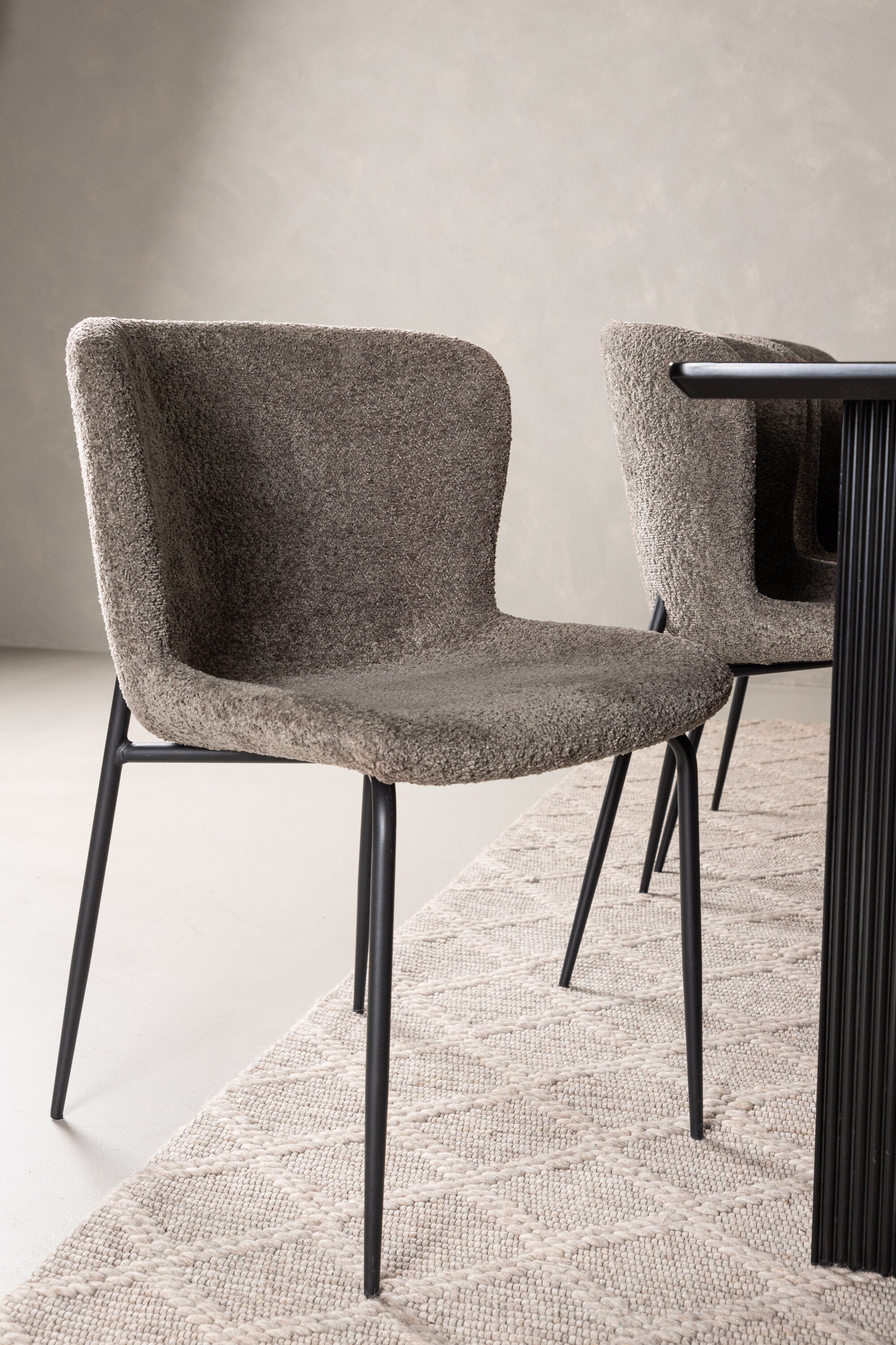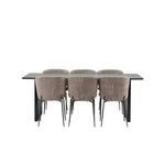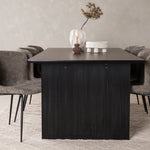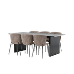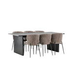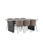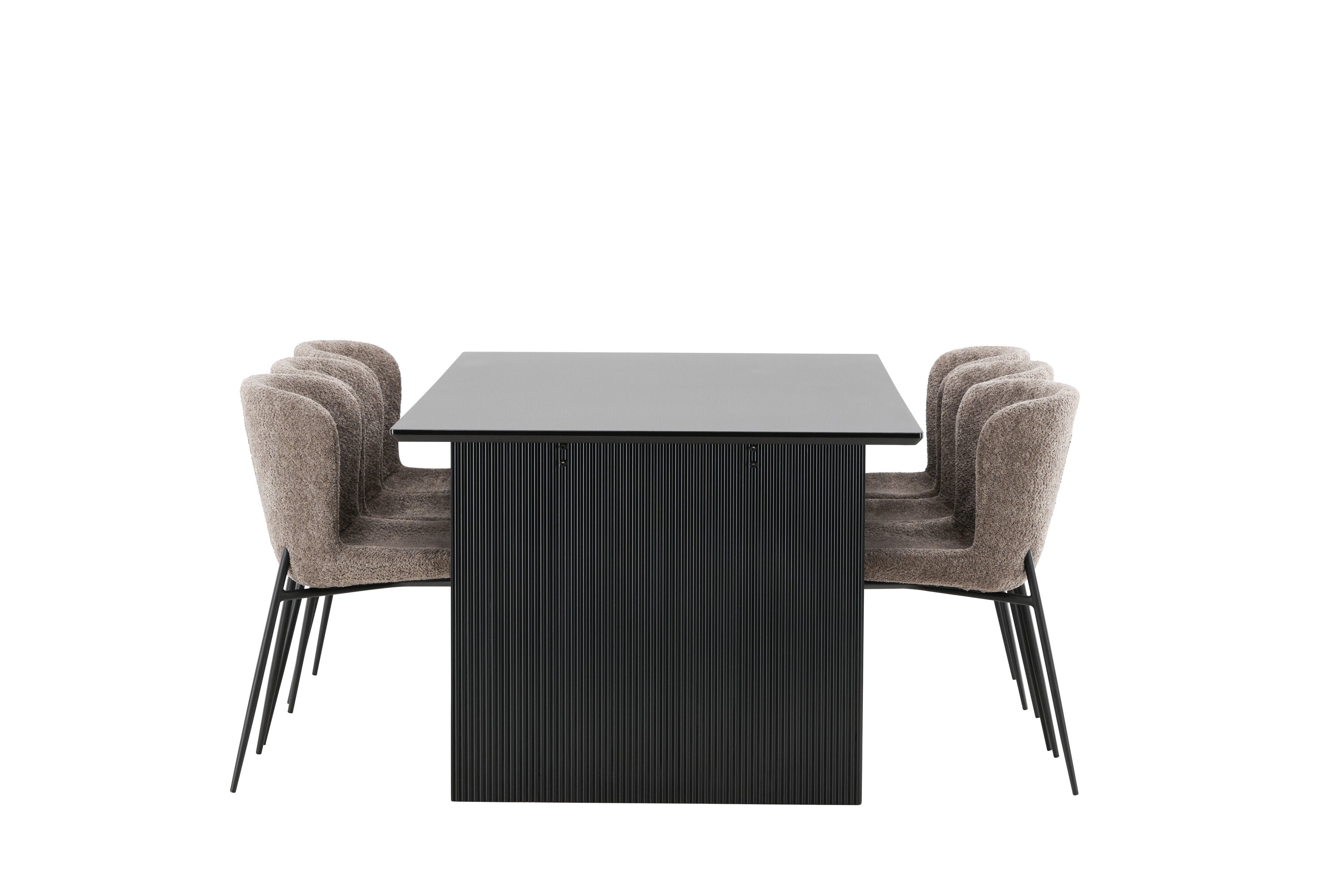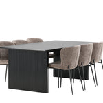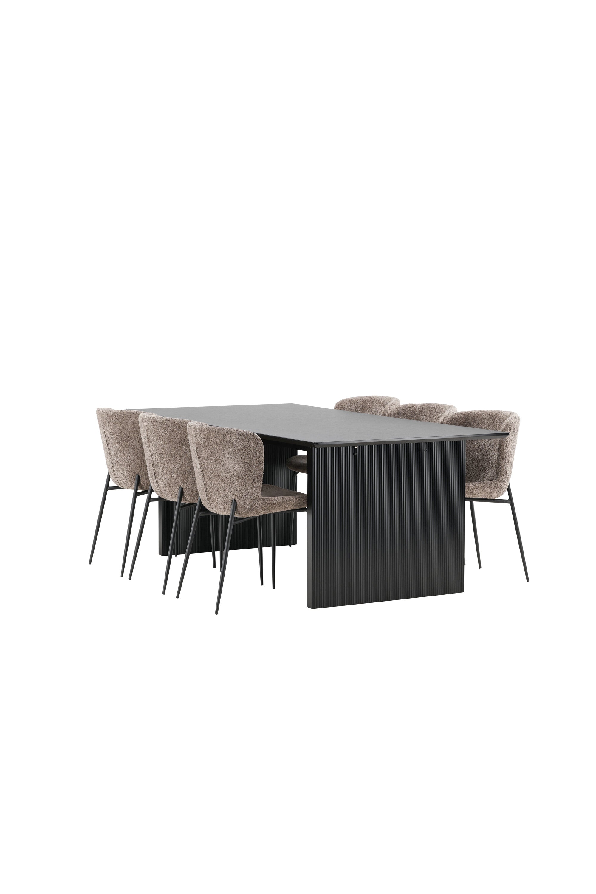 Jídelní skupina navržená zcela v souladu s trendy! Náš obdélníkový jídelní stůl ze série Vail má rovné severské tvary a je vyroben z odolné MDF v ušpiněné černé barvě. Deska stolu je tenká a balancuje na dvou pevných dřevěných deskách, které tvoří podvozek – stejně úhledné a odolné. Zde v luxusní kombinaci s našimi pohodlnými jídelními židlemi Modesto. Židle je celočalouněná béžovou bouclé látkou se stylovými úzkými nohami v černém kovu. Mírně zaoblená záda a čalouněný sedák poskytují extra pohodlí a rozšiřují příjemné jídlo kolem jídelního stolu. Mělo by to být příjemné sedět u dobrého jídla!