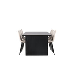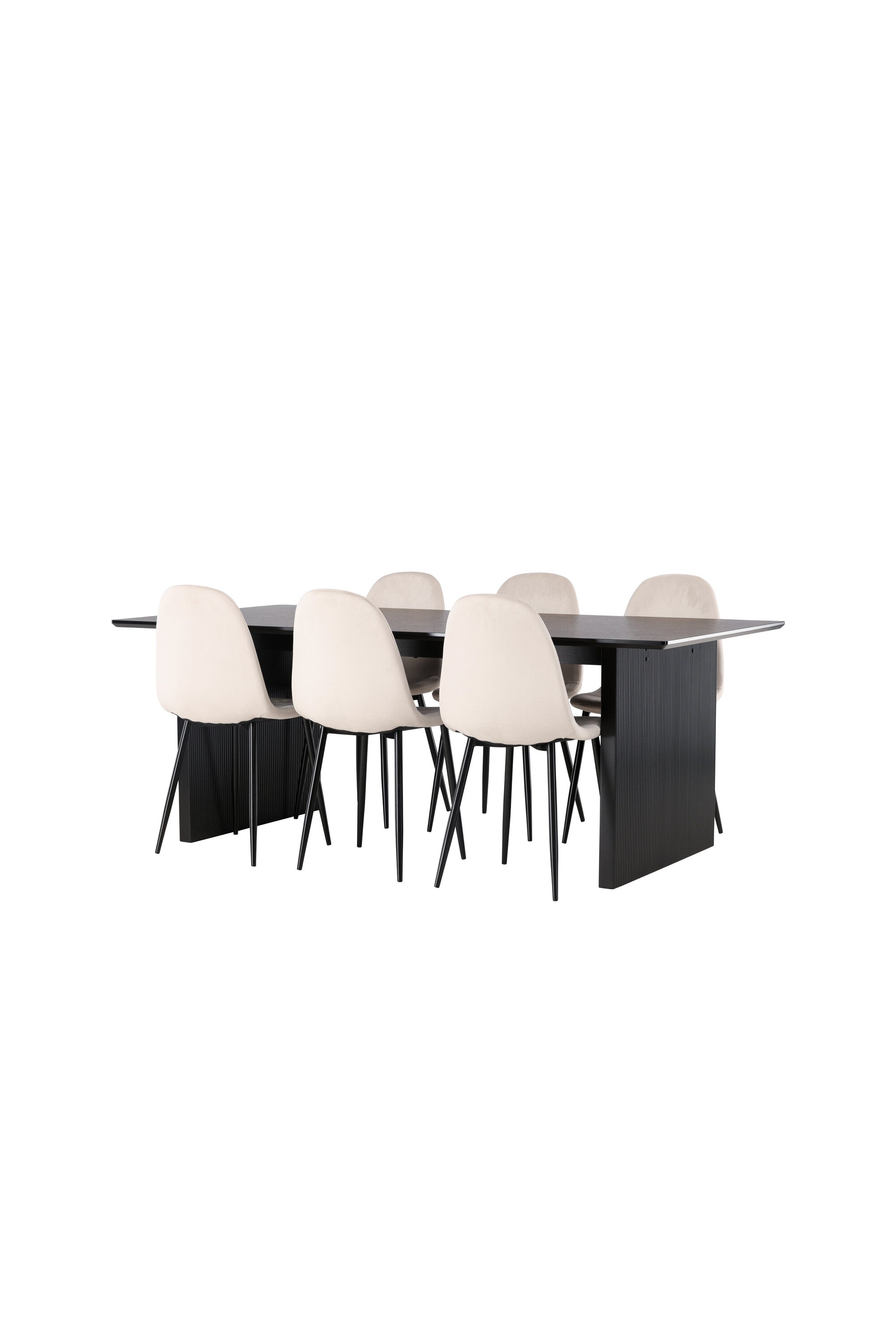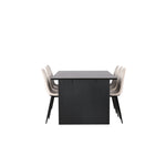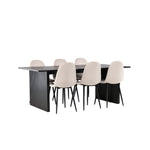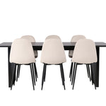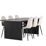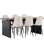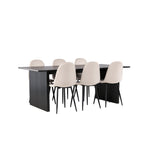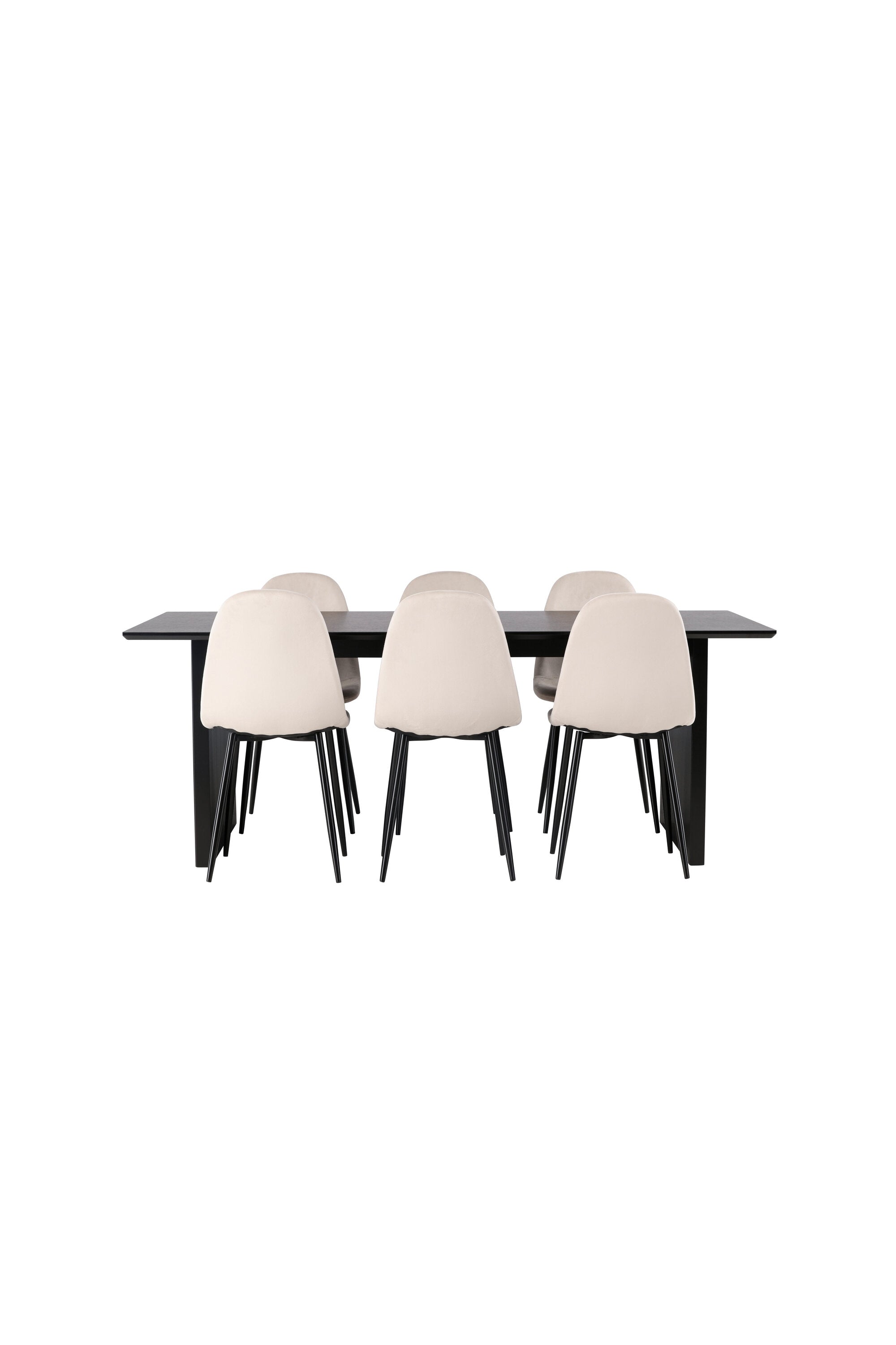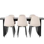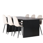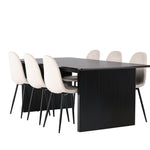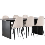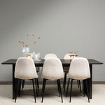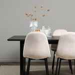 Elegantní a zářivá jídelní skupina! Obdélníkový jídelní stůl Vail má rovné severské tvary a je vyroben z odolné MDF v ušpiněné černé barvě. Stolová deska je tenká v obdélníkovém designu a balancuje na dvou pevných dřevěných deskách, které tvoří základnu. Zde spolu s našimi nádhernými jídelními židlemi Polar. Tato jídelní židle v celočalouněném designu s mírně zaobleným opěradlem a sedákem ze sametové látky a nohami z černého kovu s práškovým nástřikem je stejně pohodlná jako poutavá. Lesklá barva opravdu zahřeje atmosféru! Rozměry stolu: 200x100cm.