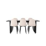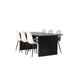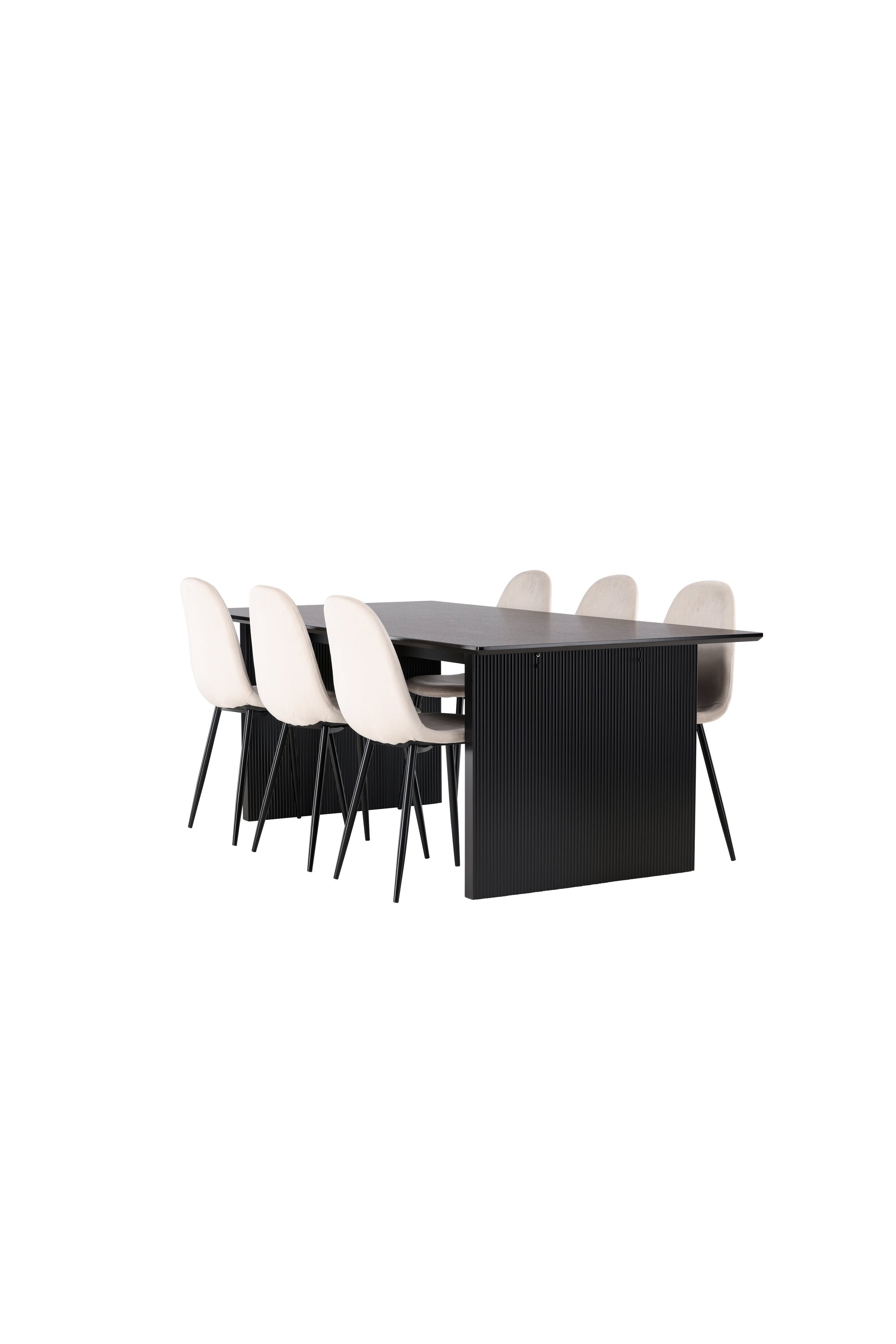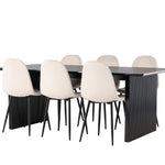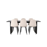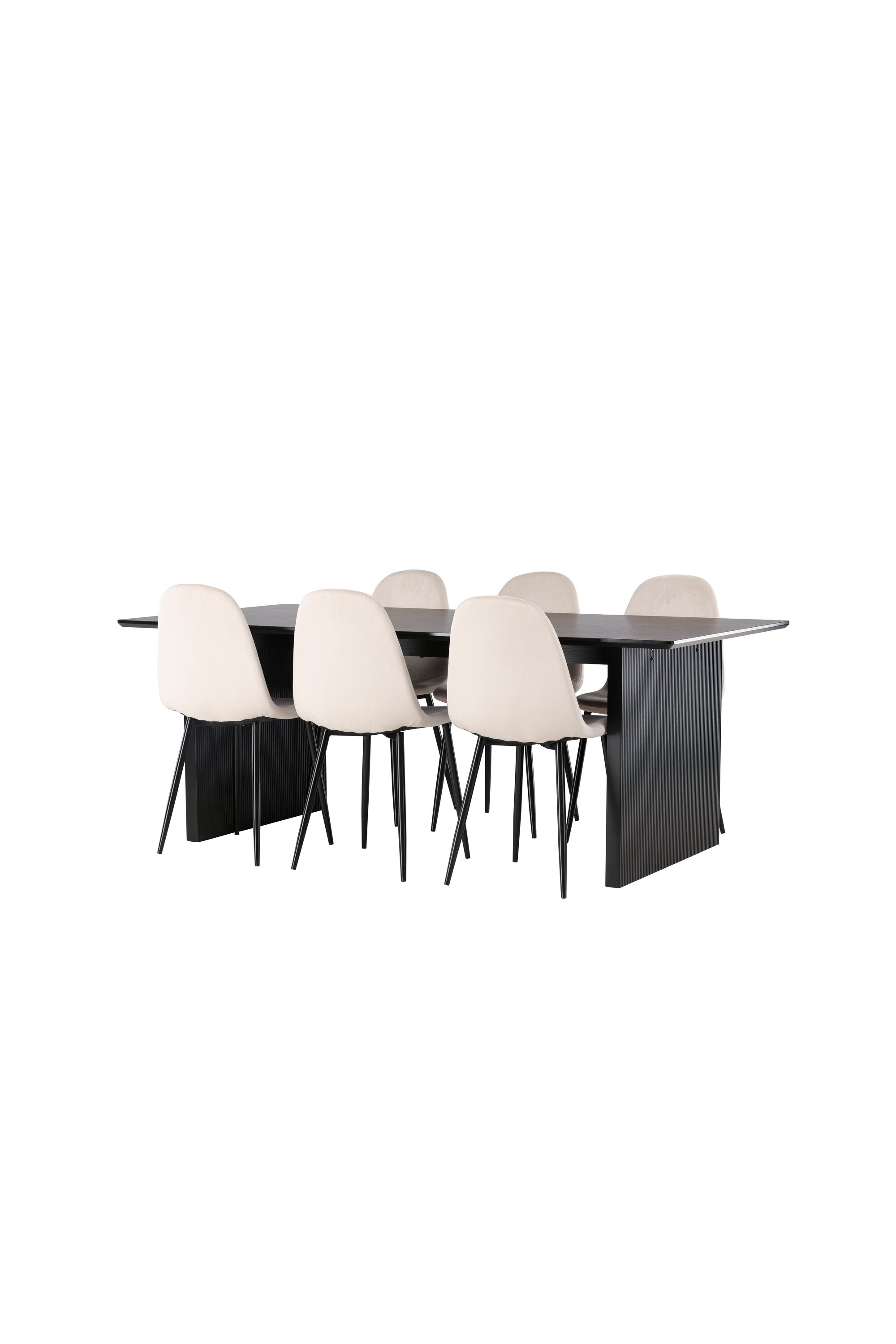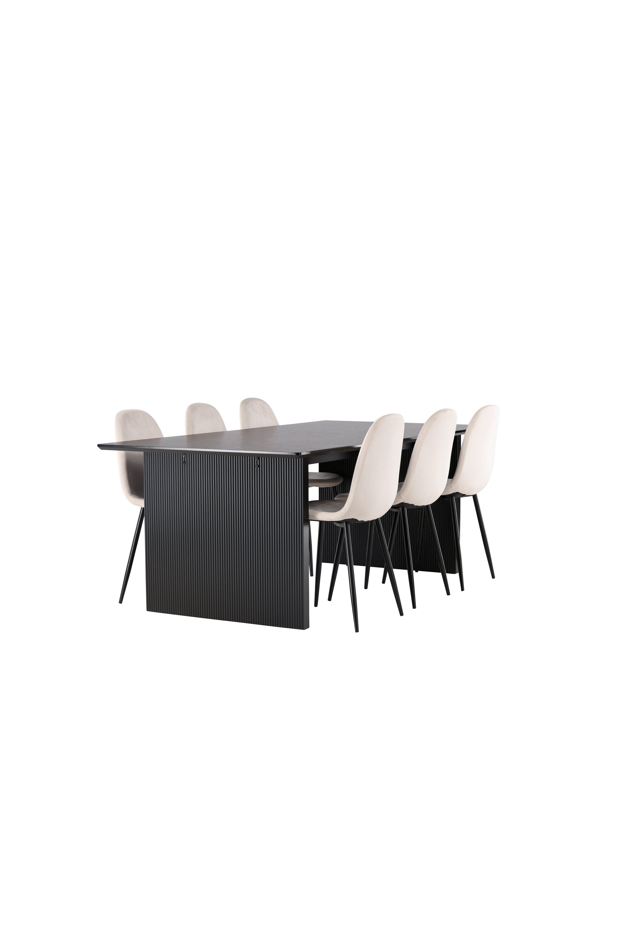 Elegantní a zářivá jídelní skupina! Obdélníkový jídelní stůl Vail má rovné severské tvary a je vyroben z odolné MDF v ušpiněné černé barvě. Stolová deska je tenká v obdélníkovém designu a balancuje na dvou pevných dřevěných deskách, které tvoří základnu. Zde spolu s našimi nádhernými jídelními židlemi Polar. Tato jídelní židle v celočalouněném designu s mírně zaobleným opěradlem a sedákem ze sametové látky a nohami z černého kovu s práškovým nástřikem je stejně pohodlná jako poutavá. Lesklá barva opravdu zahřeje atmosféru! Rozměry stolu: 200x100cm.