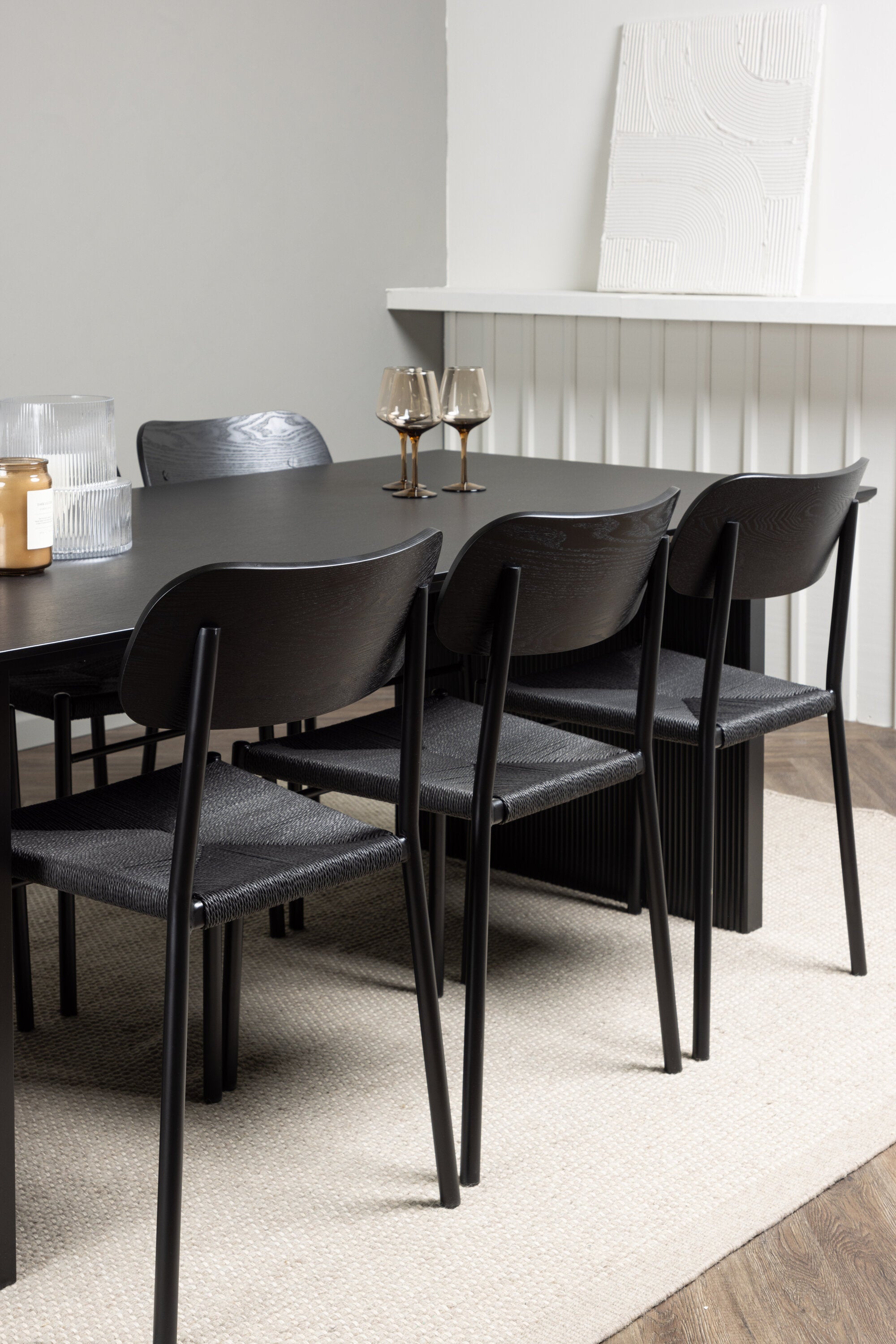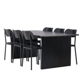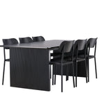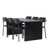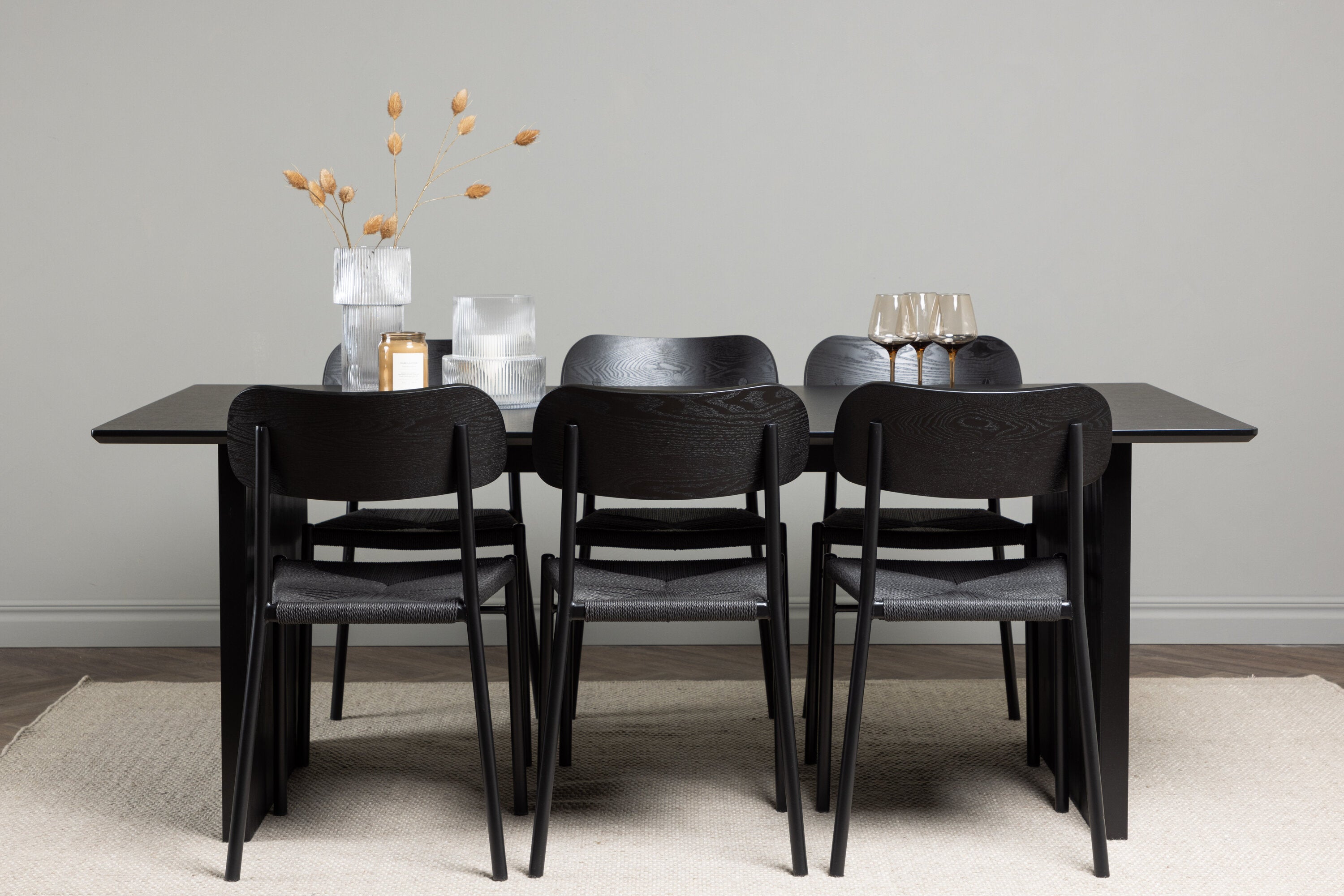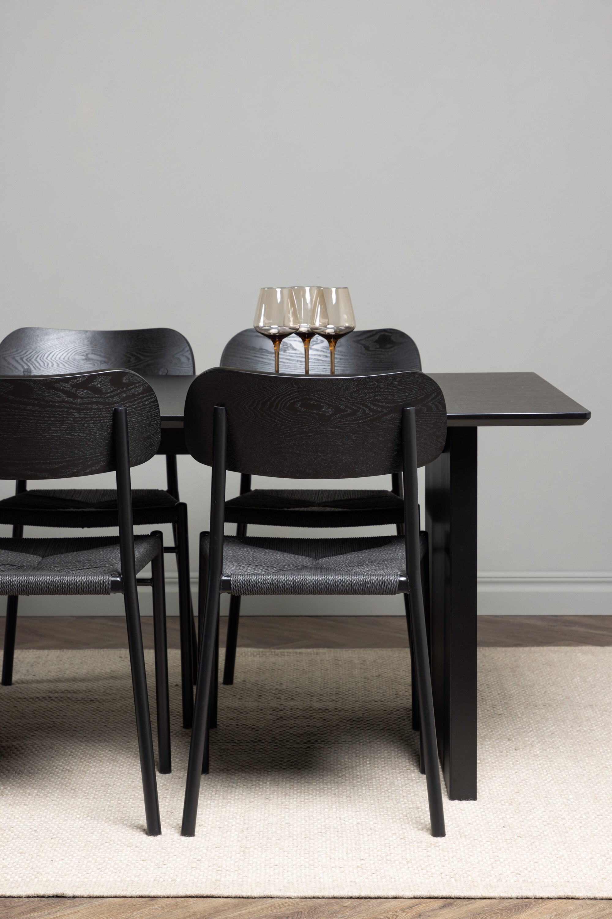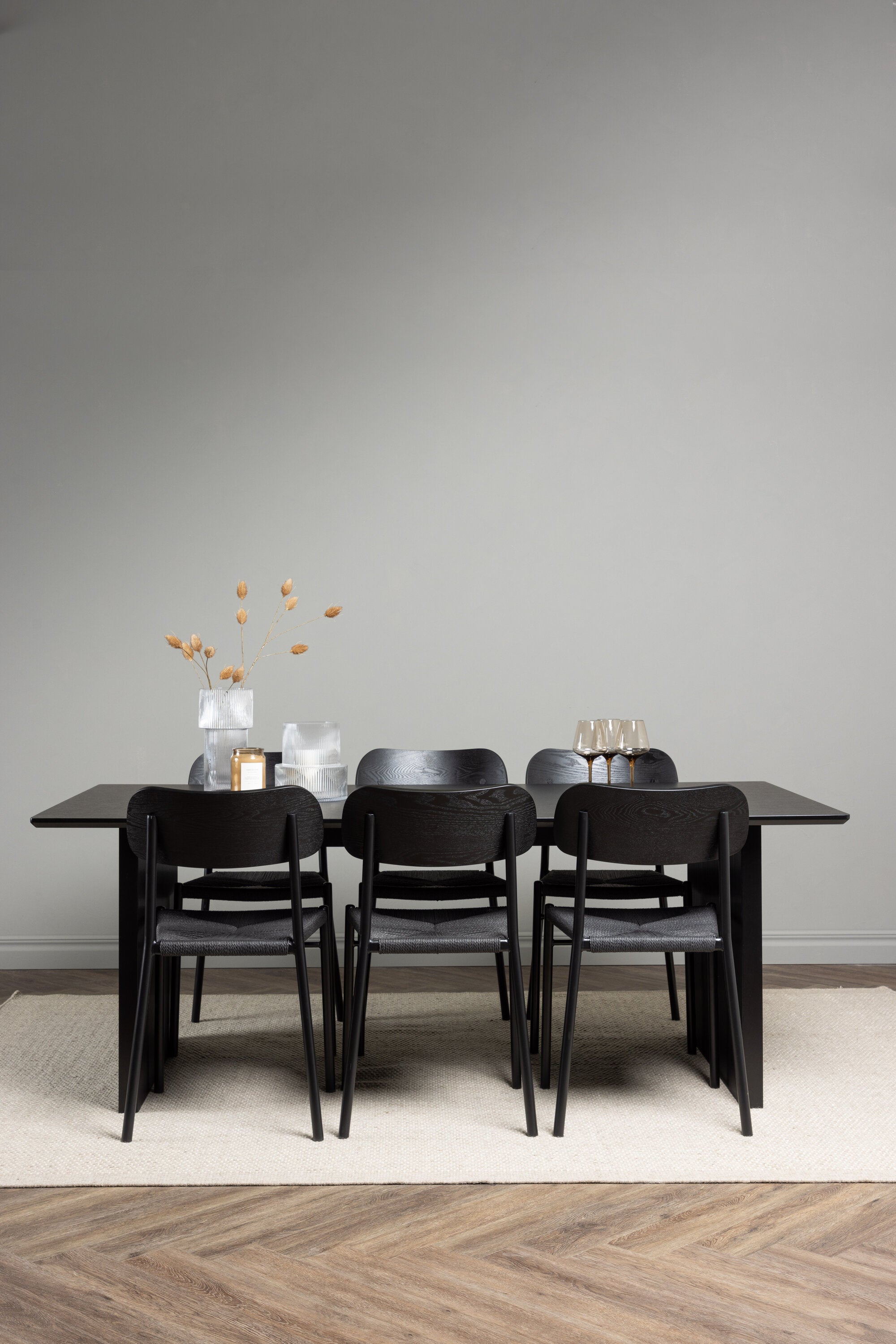 Trendová kombinace! Obdélníkový jídelní stůl Vail má rovné severské tvary a je vyroben z odolné MDF v ušpiněné černé barvě. Stolová deska je tenká v obdélníkovém designu a balancuje na dvou pevných dřevěných deskách, které tvoří základnu. Zde spolu s odpovídajícími černými jídelními židlemi ze série Polly. Židle má opěradlo z černé MDF s dýhou a sedák z módní černé tkaniny z přírodních vláken. Rám a nohy jsou z kovu s černou práškovou barvou. S černou jídelní skupinou neuděláte chybu! Rozměry stolu: 200x100cm.