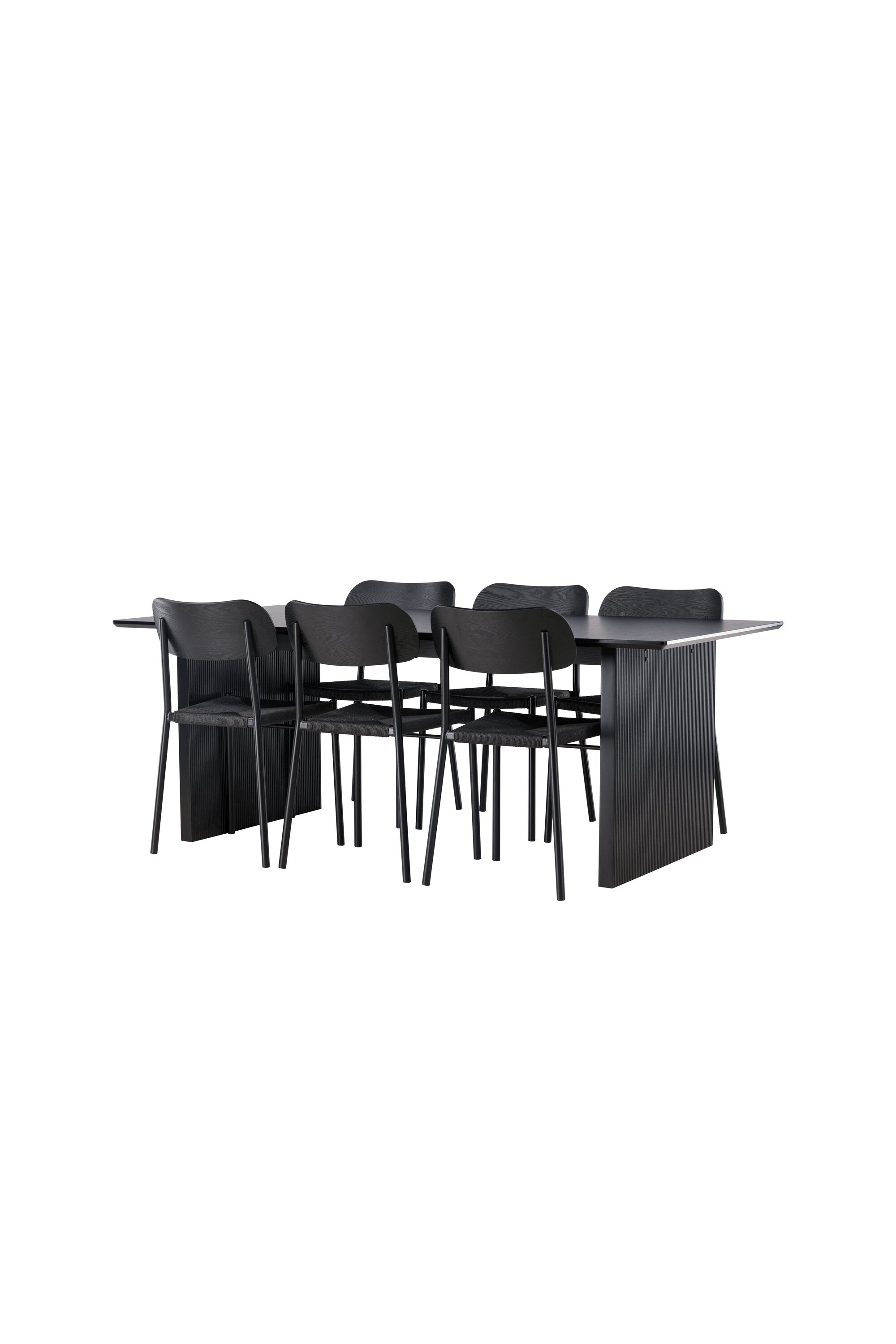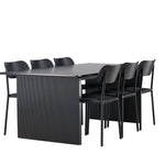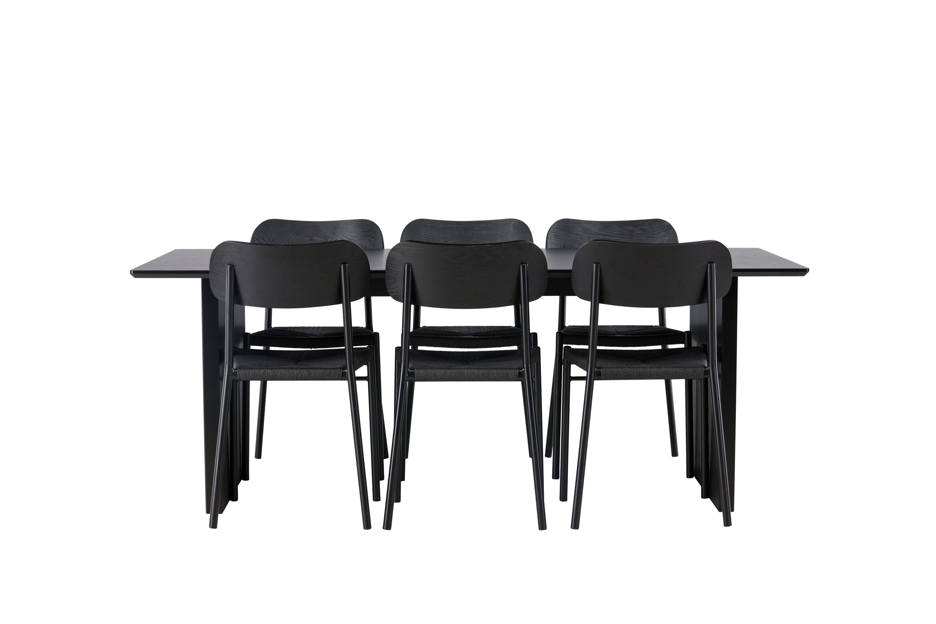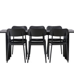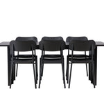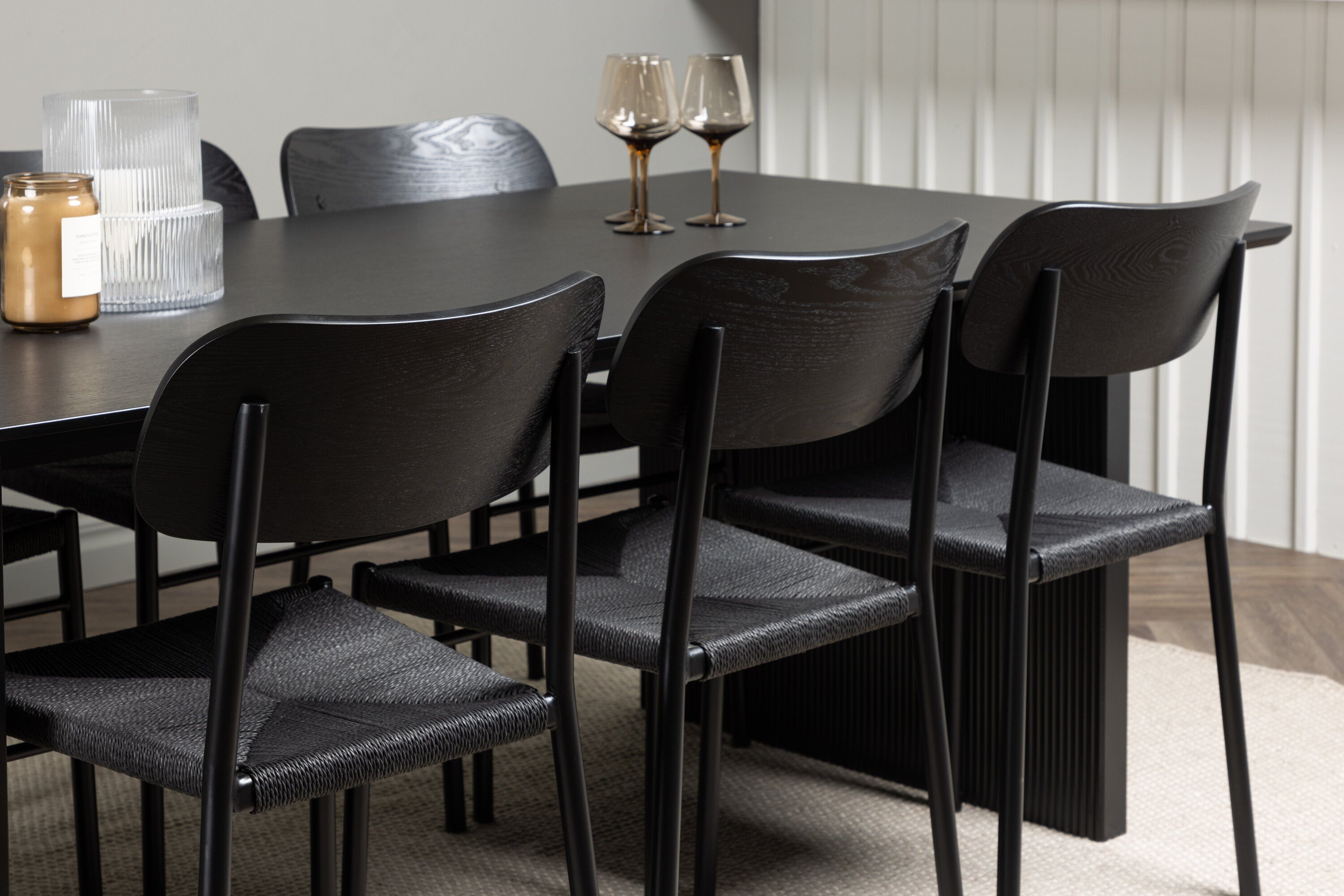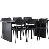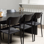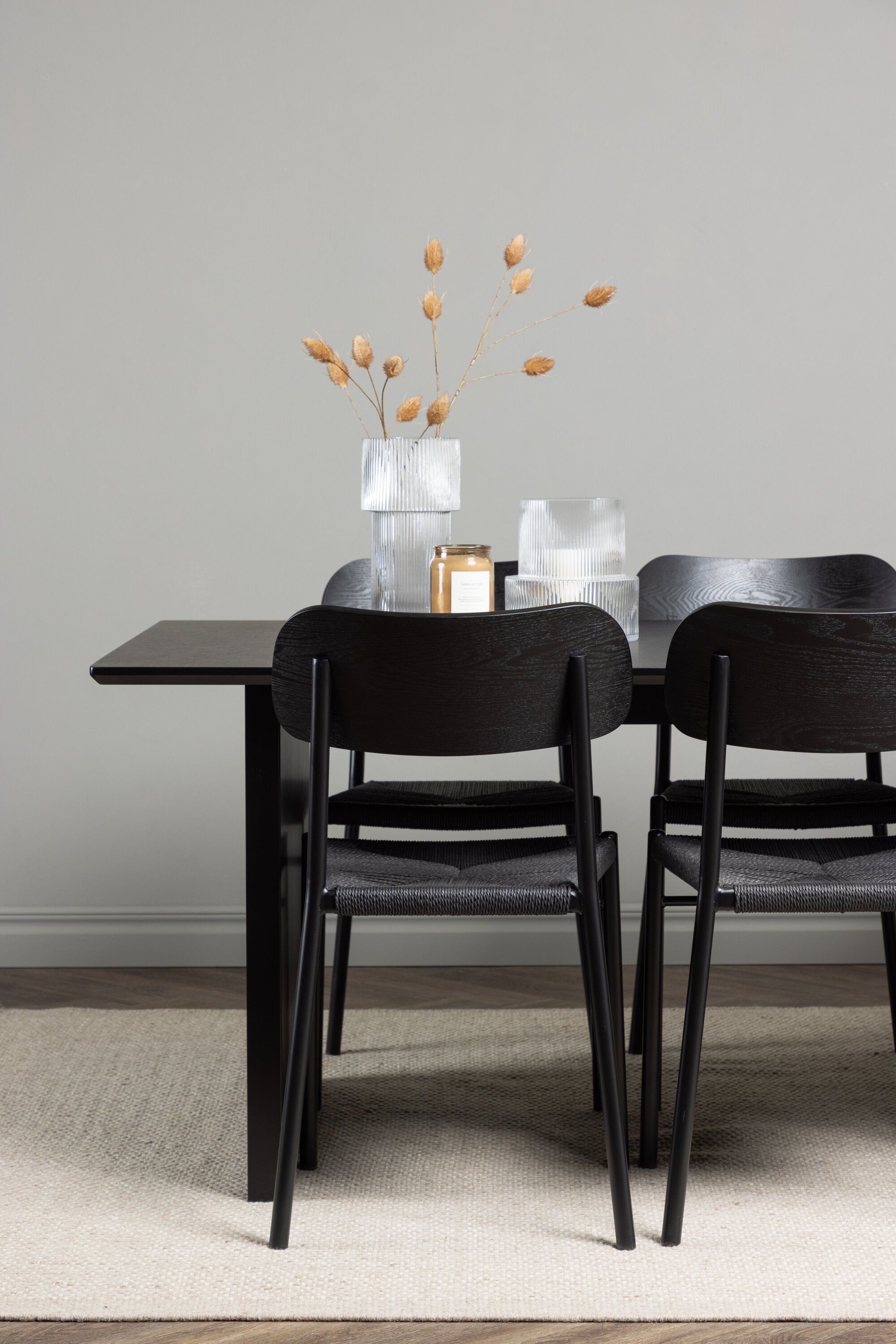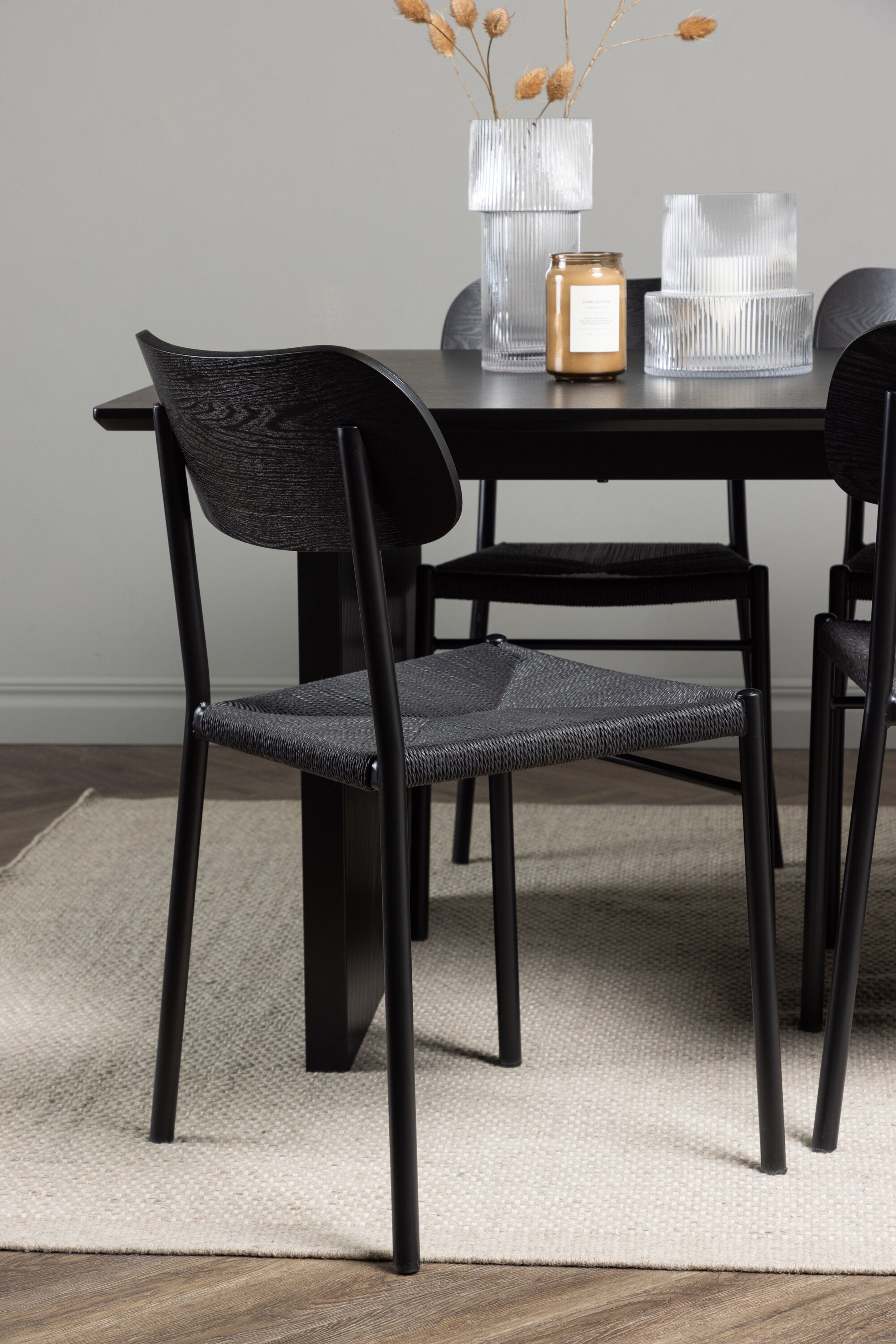 Trendová kombinace! Obdélníkový jídelní stůl Vail má rovné severské tvary a je vyroben z odolné MDF v ušpiněné černé barvě. Stolová deska je tenká v obdélníkovém designu a balancuje na dvou pevných dřevěných deskách, které tvoří základnu. Zde spolu s odpovídajícími černými jídelními židlemi ze série Polly. Židle má opěradlo z černé MDF s dýhou a sedák z módní černé tkaniny z přírodních vláken. Rám a nohy jsou z kovu s černou práškovou barvou. S černou jídelní skupinou neuděláte chybu! Rozměry stolu: 200x100cm.