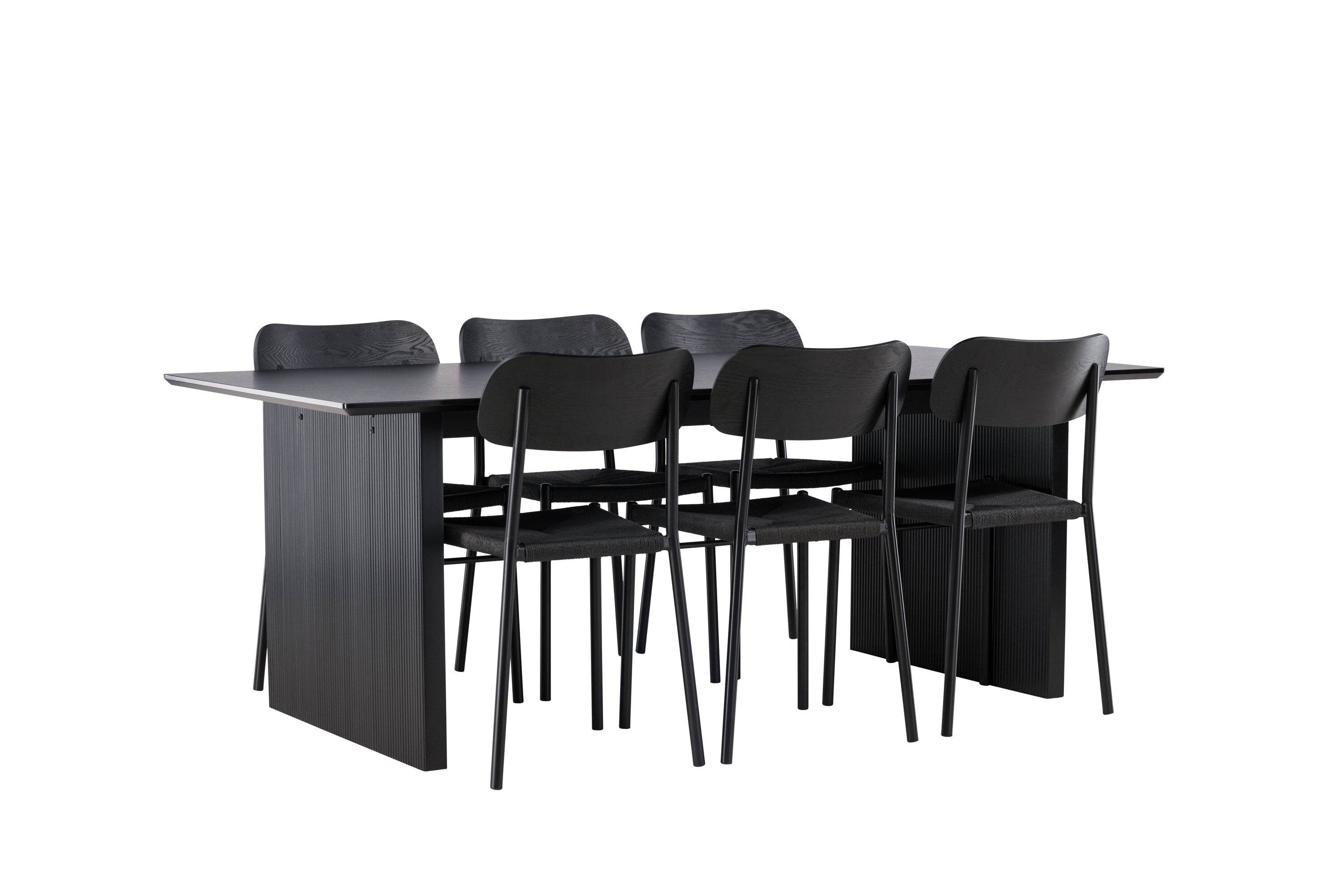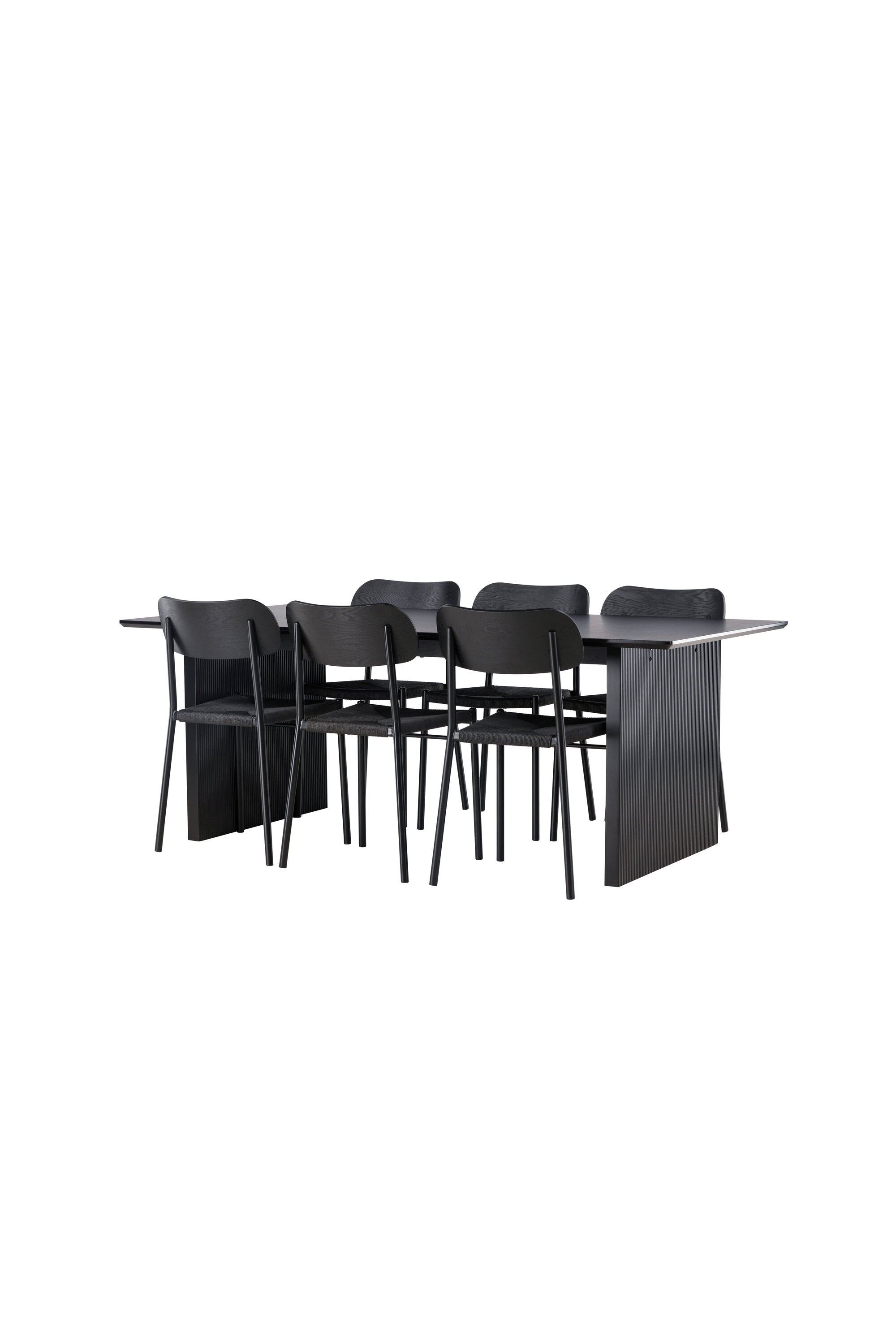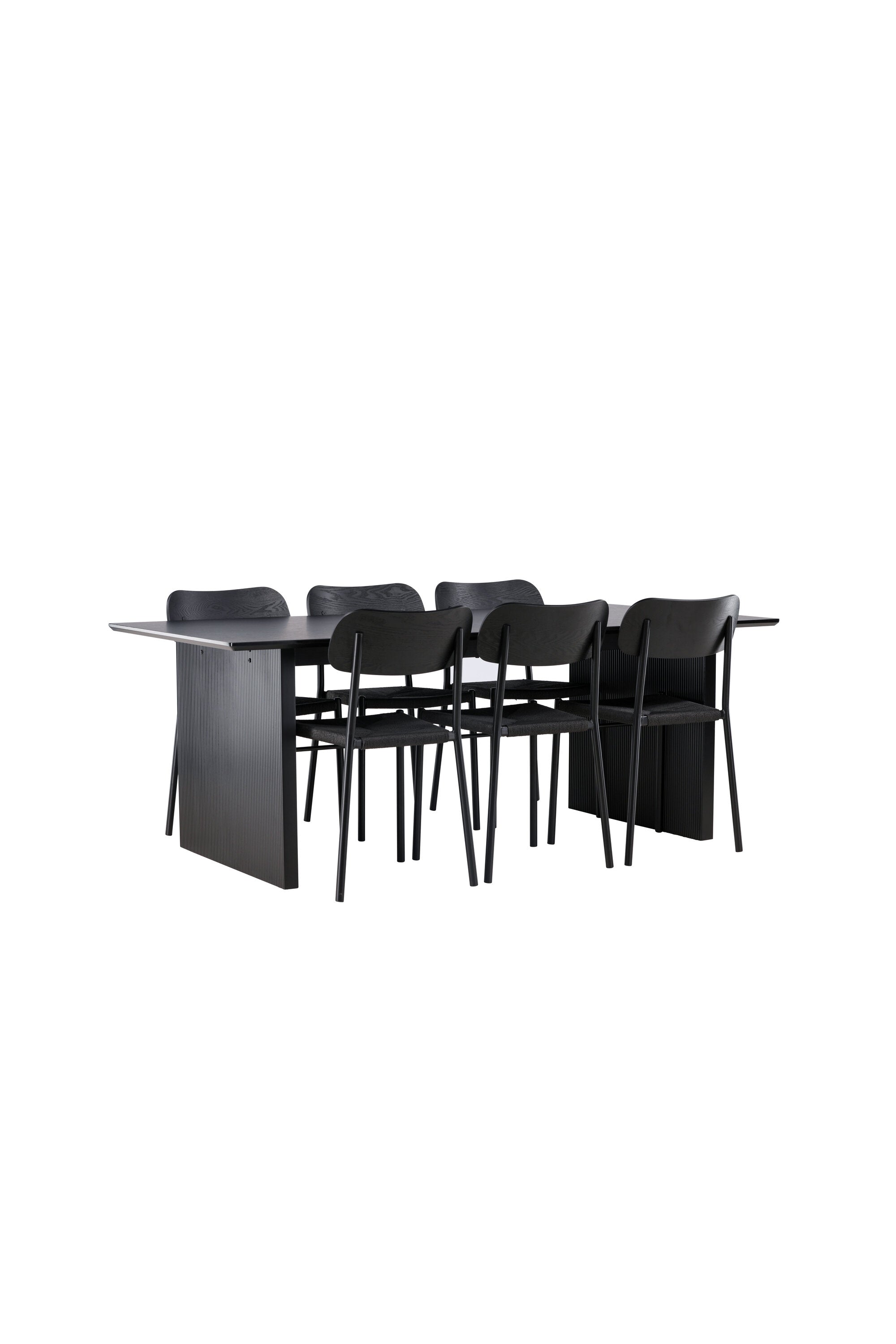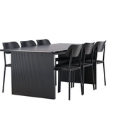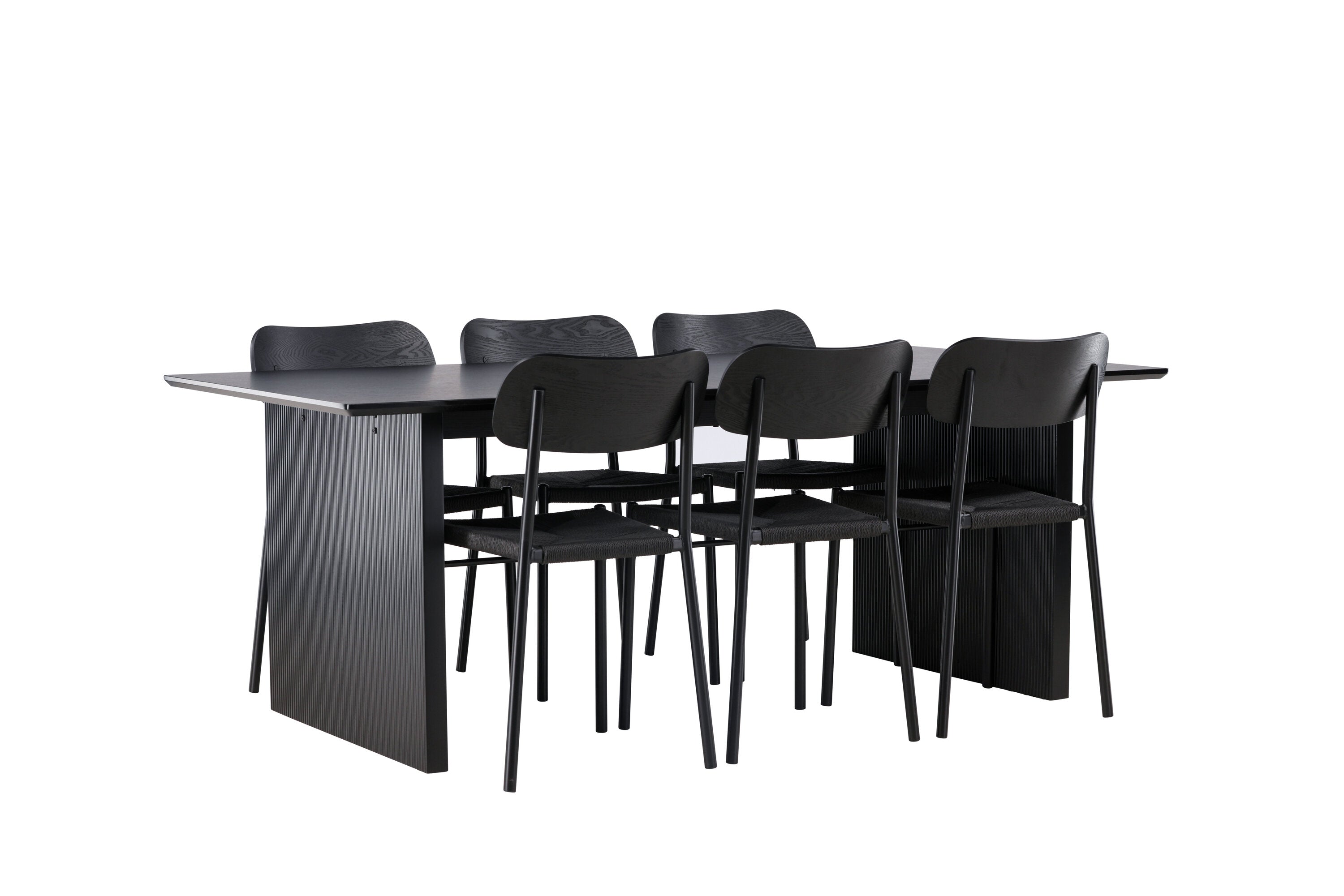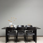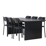 Trendová kombinace! Obdélníkový jídelní stůl Vail má rovné severské tvary a je vyroben z odolné MDF v ušpiněné černé barvě. Stolová deska je tenká v obdélníkovém designu a balancuje na dvou pevných dřevěných deskách, které tvoří základnu. Zde spolu s odpovídajícími černými jídelními židlemi ze série Polly. Židle má opěradlo z černé MDF s dýhou a sedák z módní černé tkaniny z přírodních vláken. Rám a nohy jsou z kovu s černou práškovou barvou. S černou jídelní skupinou neuděláte chybu! Rozměry stolu: 200x100cm.