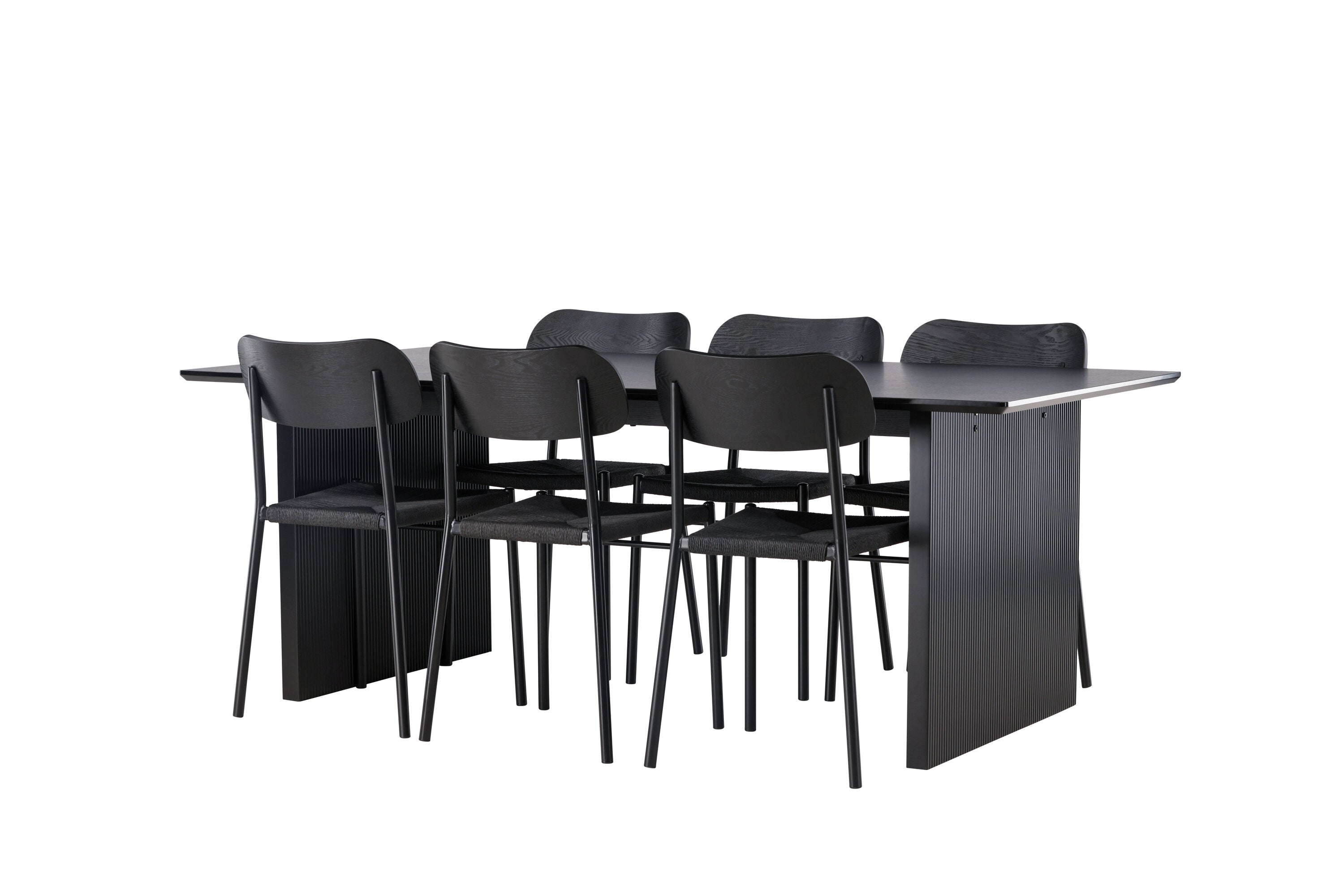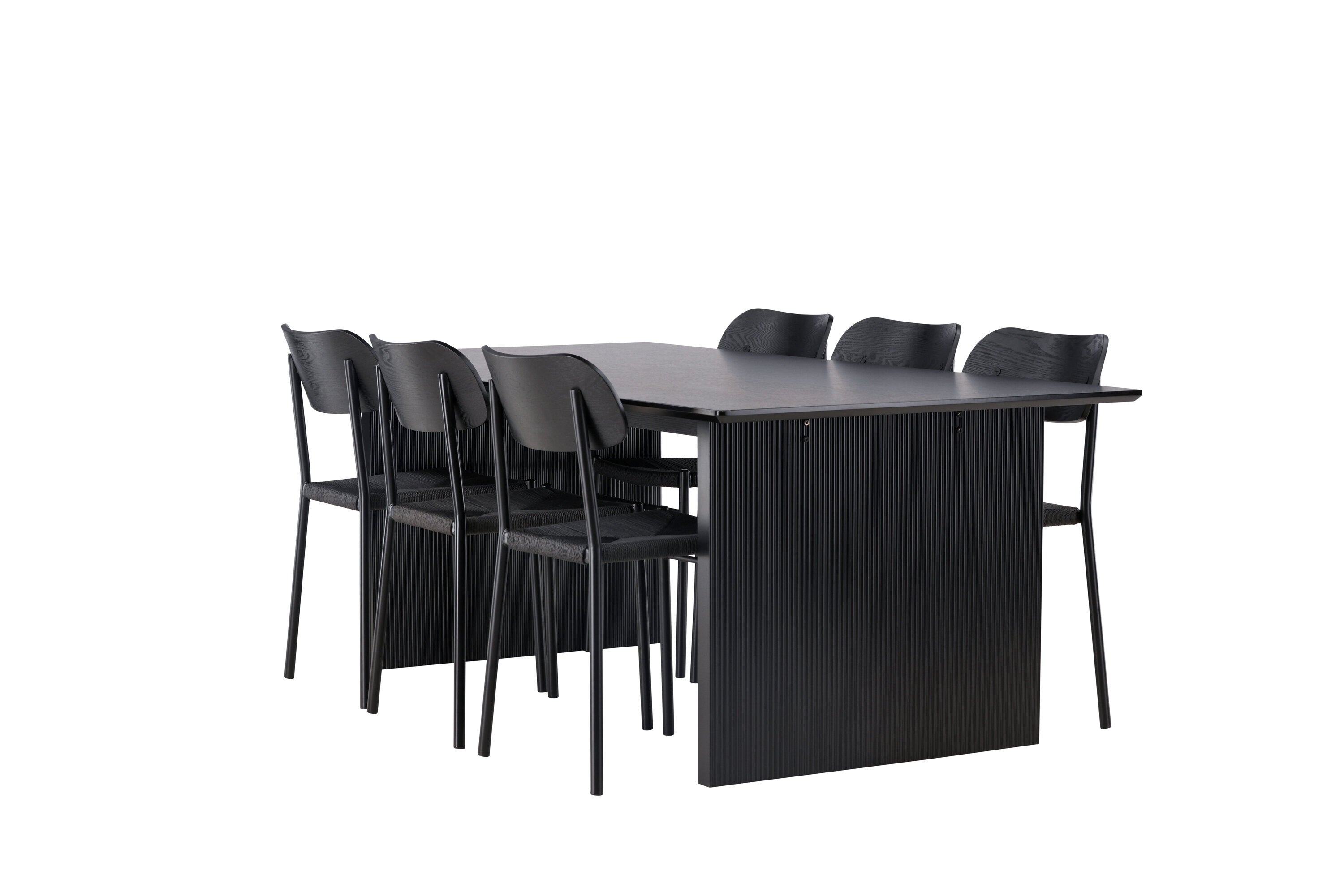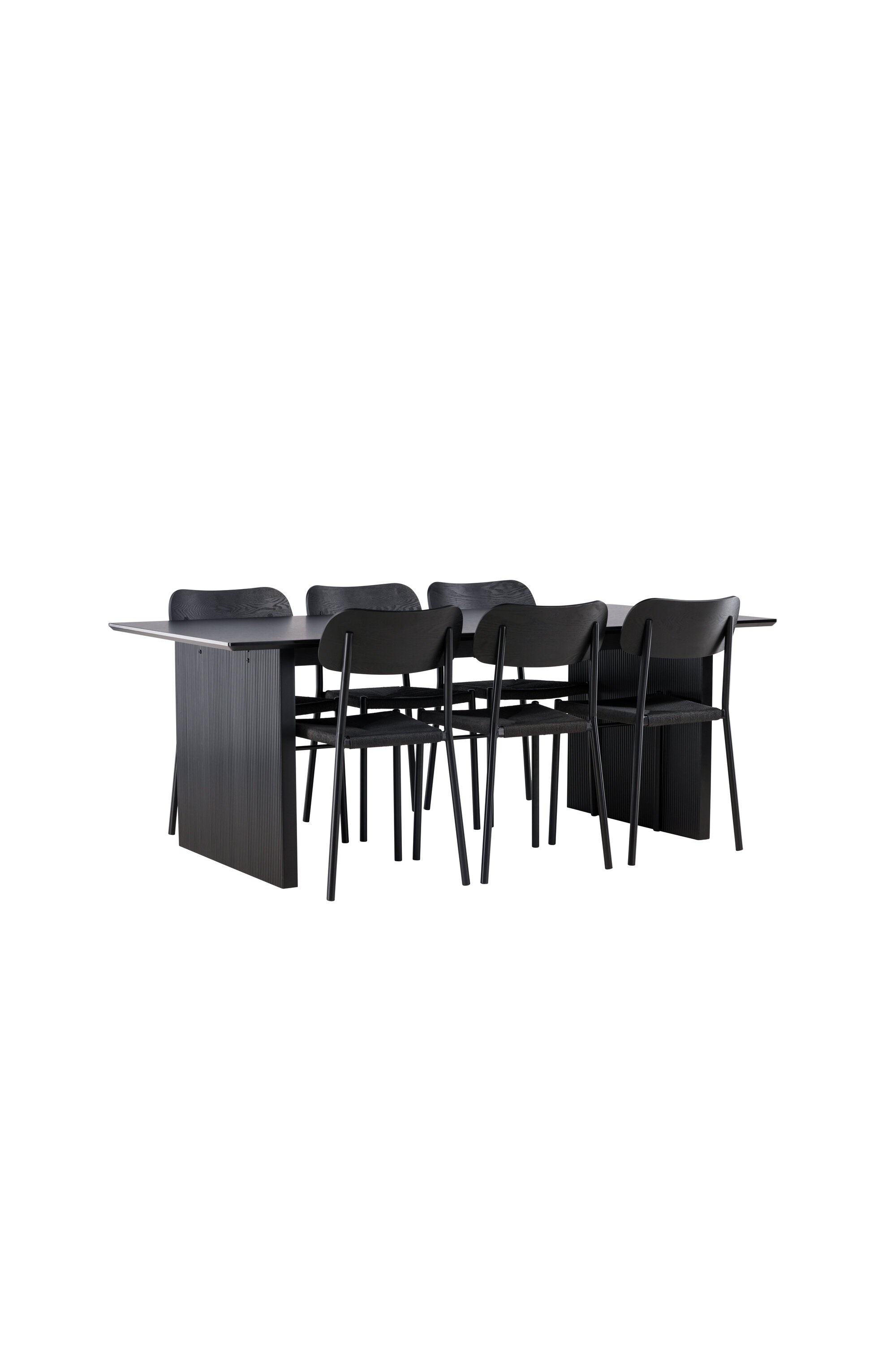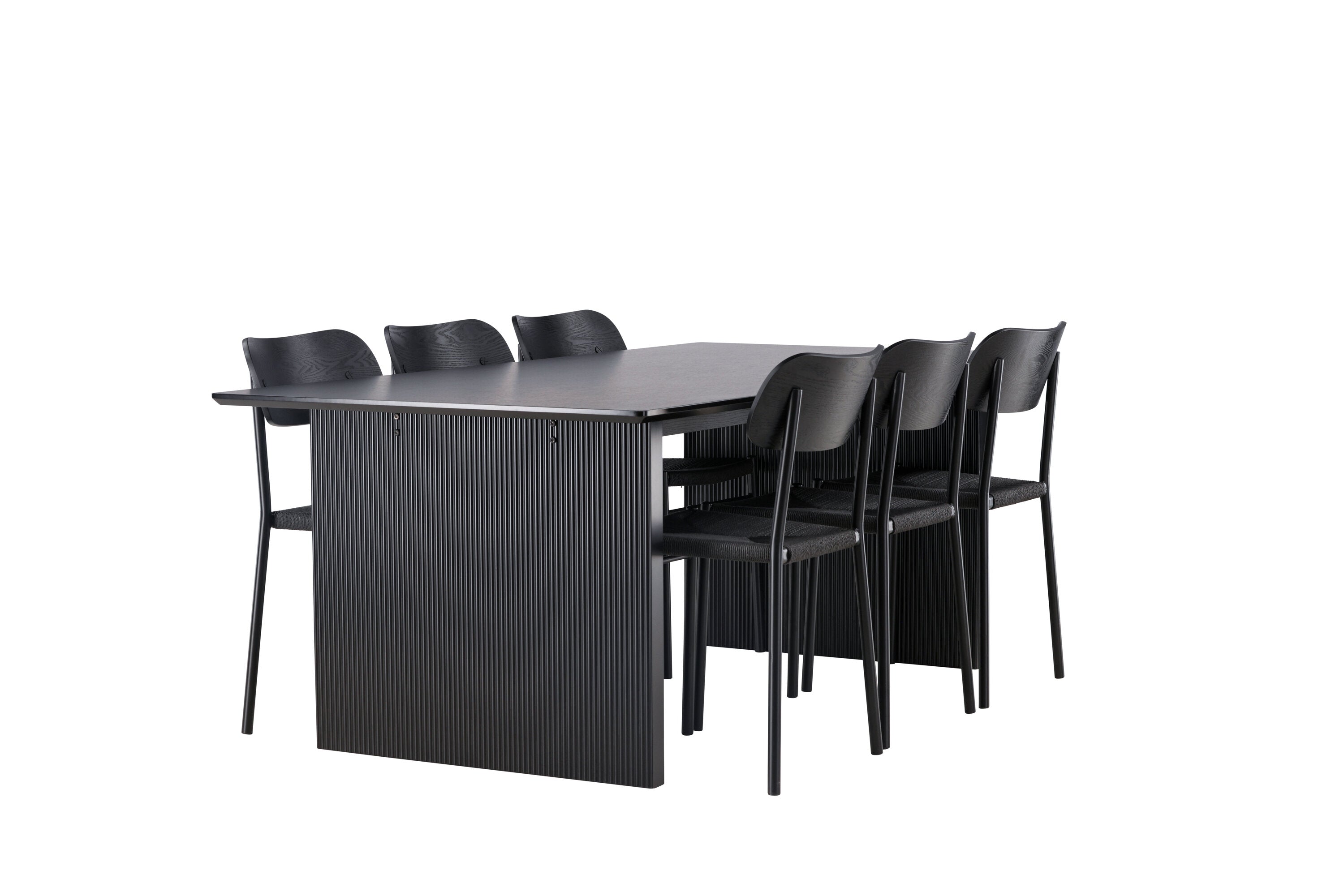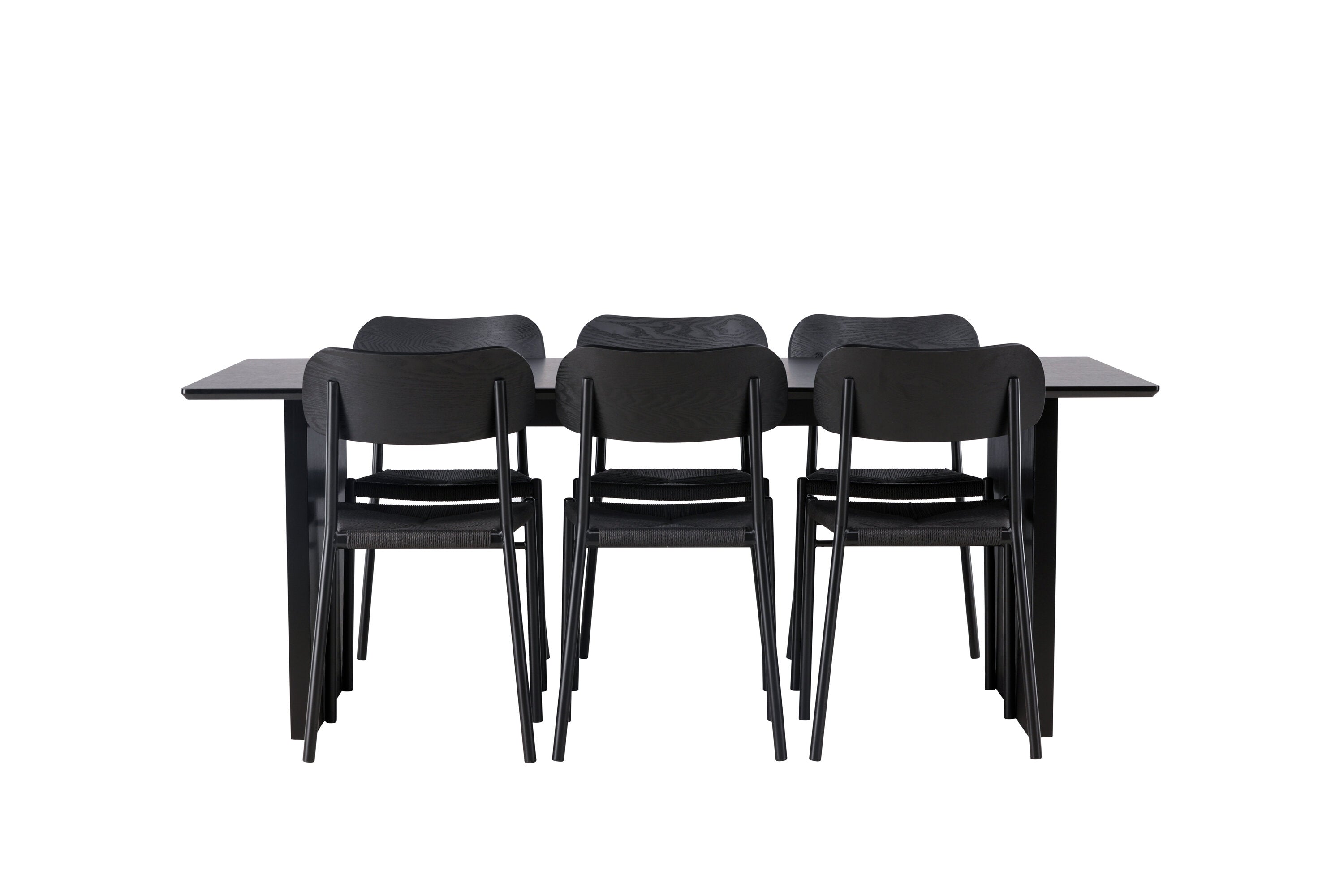 Trendová kombinace! Obdélníkový jídelní stůl Vail má rovné severské tvary a je vyroben z odolné MDF v ušpiněné černé barvě. Stolová deska je tenká v obdélníkovém designu a balancuje na dvou pevných dřevěných deskách, které tvoří základnu. Zde spolu s odpovídajícími černými jídelními židlemi ze série Polly. Židle má opěradlo z černé MDF s dýhou a sedák z módní černé tkaniny z přírodních vláken. Rám a nohy jsou z kovu s černou práškovou barvou. S černou jídelní skupinou neuděláte chybu! Rozměry stolu: 200x100cm.
