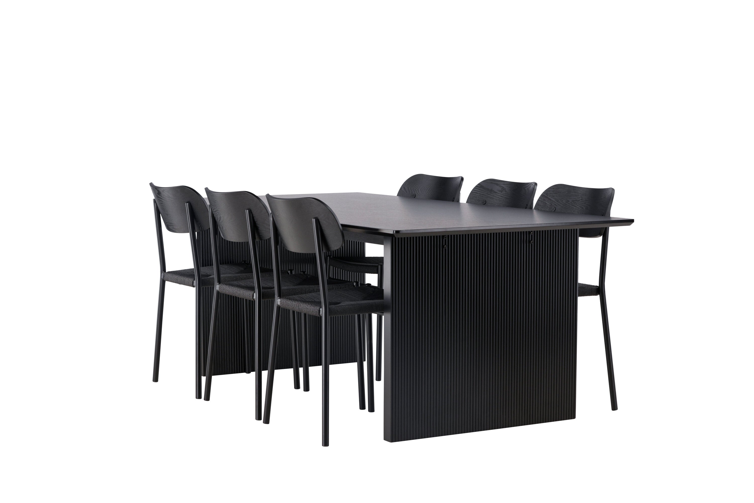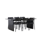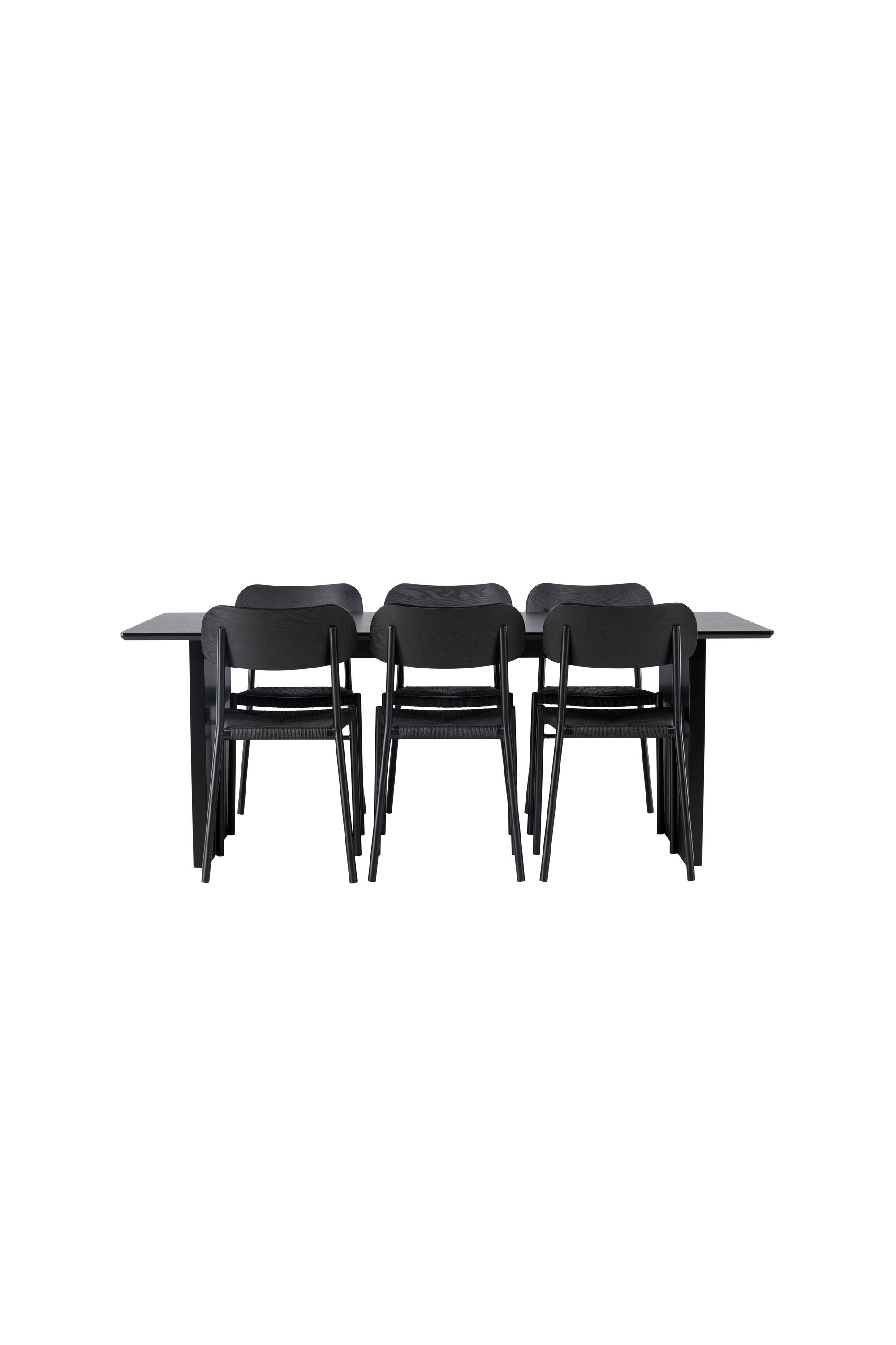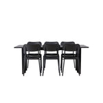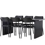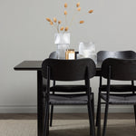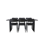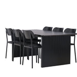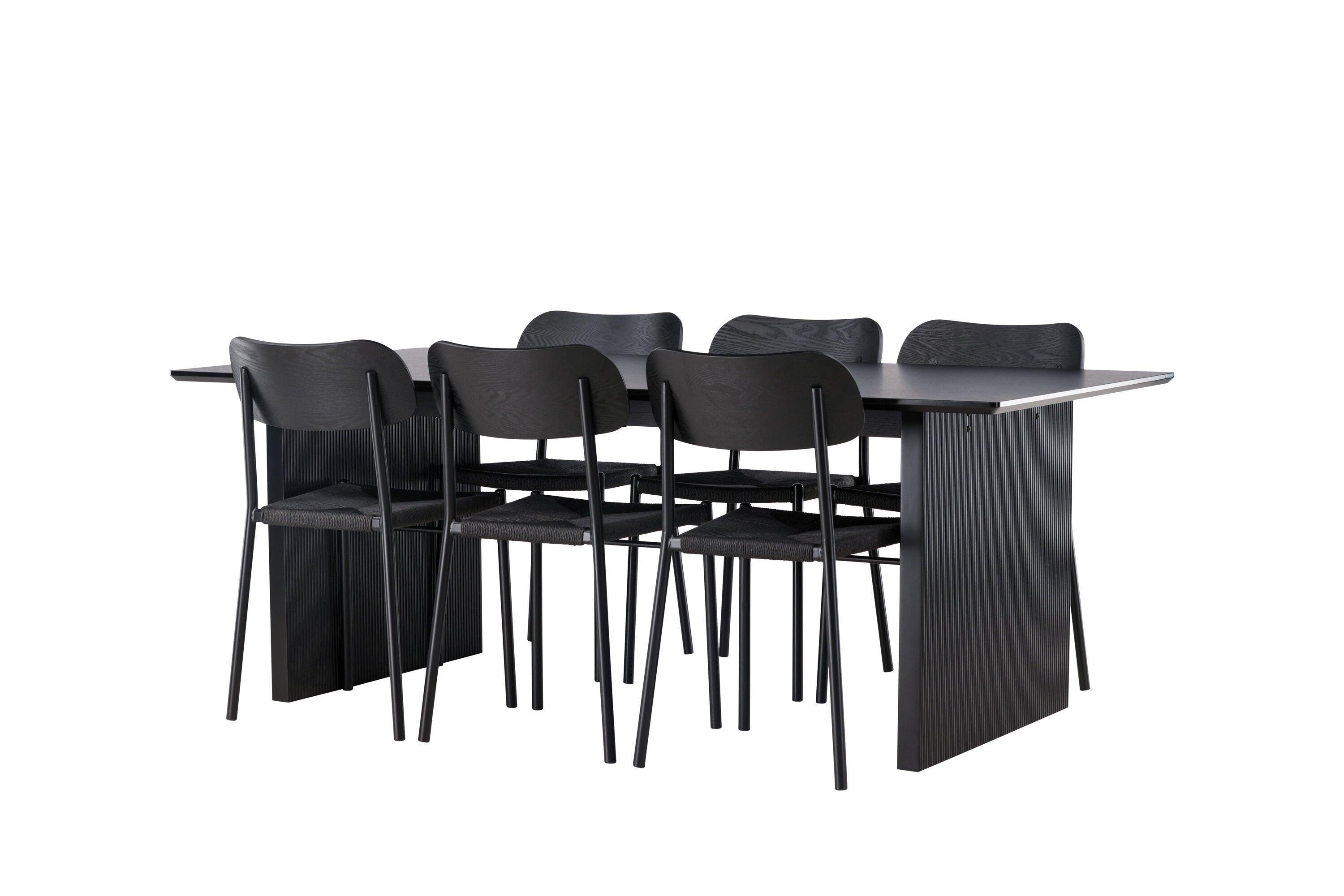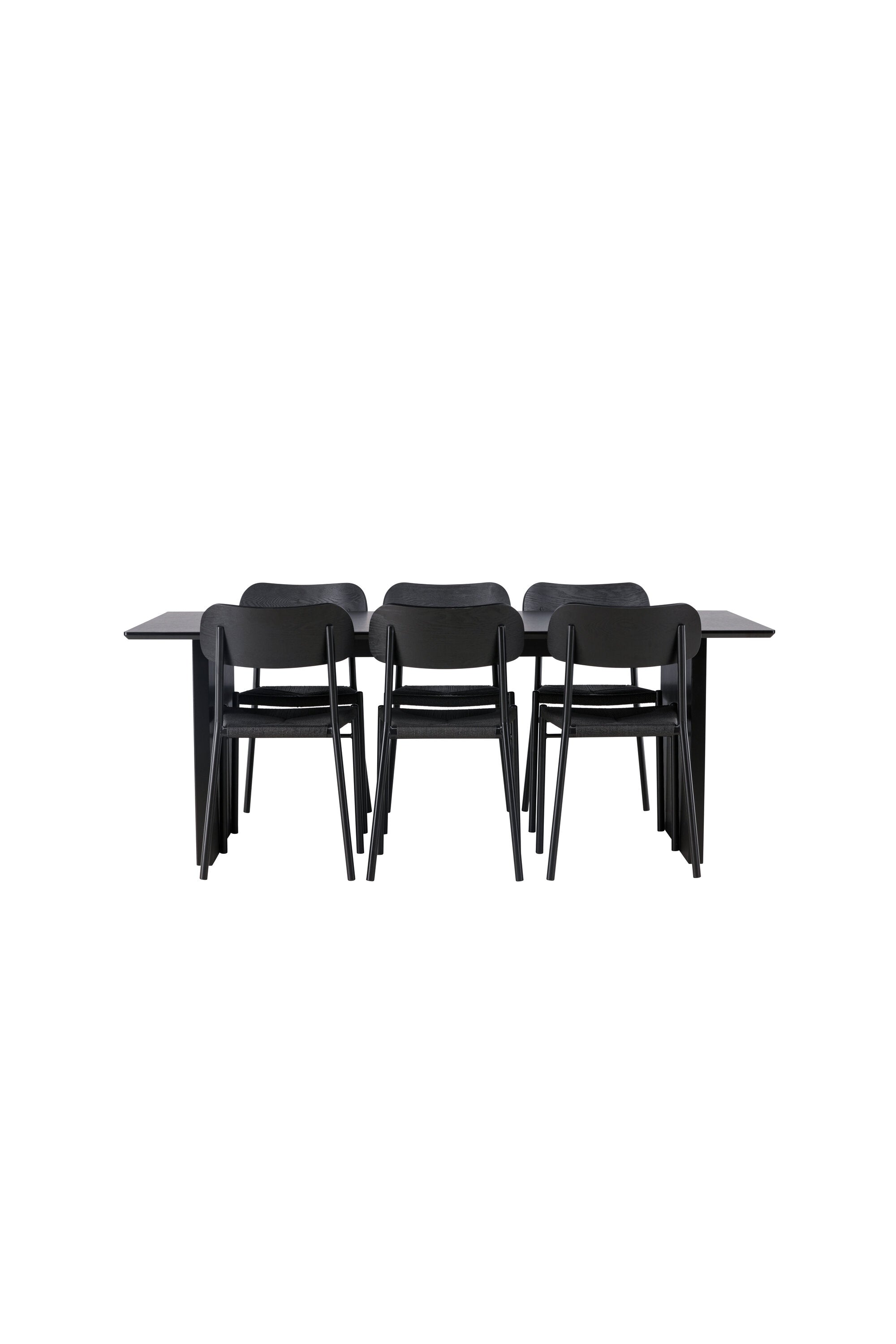 Trendová kombinace! Obdélníkový jídelní stůl Vail má rovné severské tvary a je vyroben z odolné MDF v ušpiněné černé barvě. Stolová deska je tenká v obdélníkovém designu a balancuje na dvou pevných dřevěných deskách, které tvoří základnu. Zde spolu s odpovídajícími černými jídelními židlemi ze série Polly. Židle má opěradlo z černé MDF s dýhou a sedák z módní černé tkaniny z přírodních vláken. Rám a nohy jsou z kovu s černou práškovou barvou. S černou jídelní skupinou neuděláte chybu! Rozměry stolu: 200x100cm.