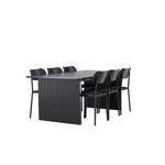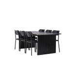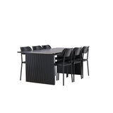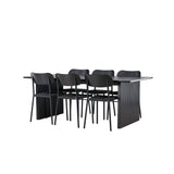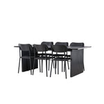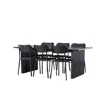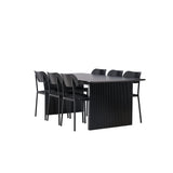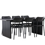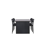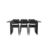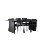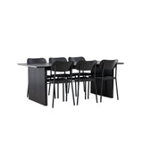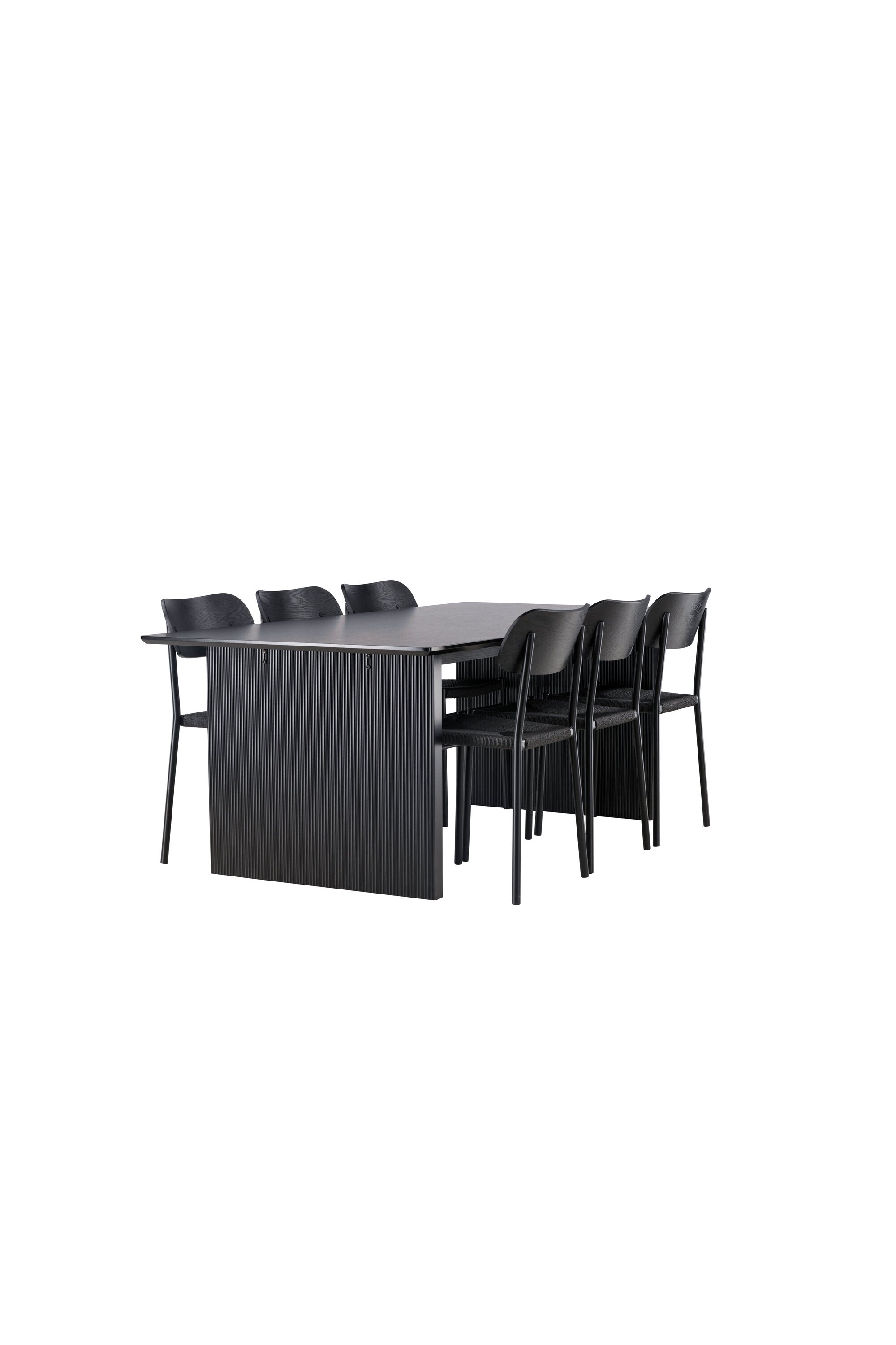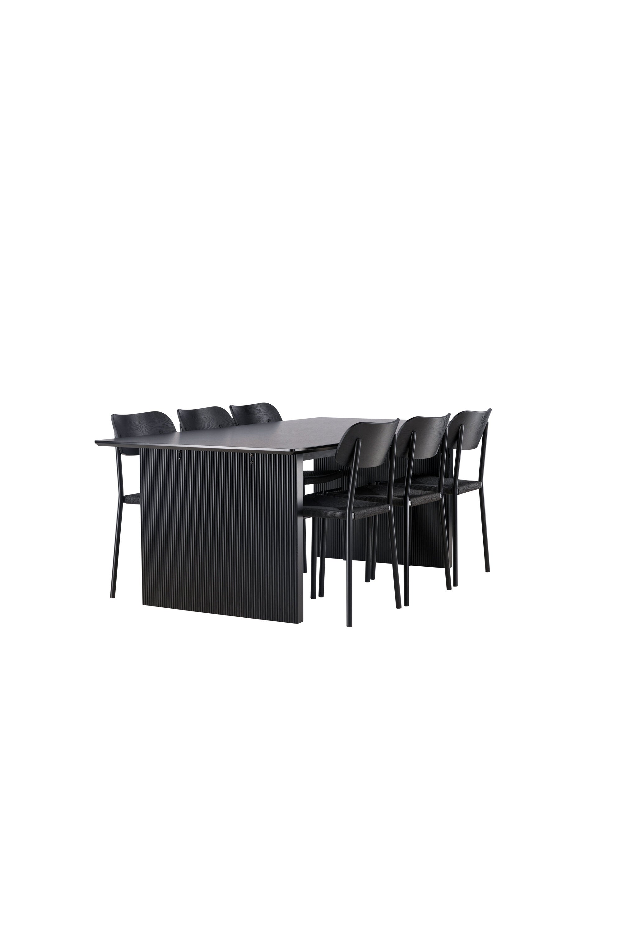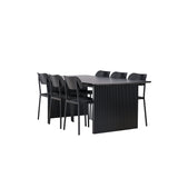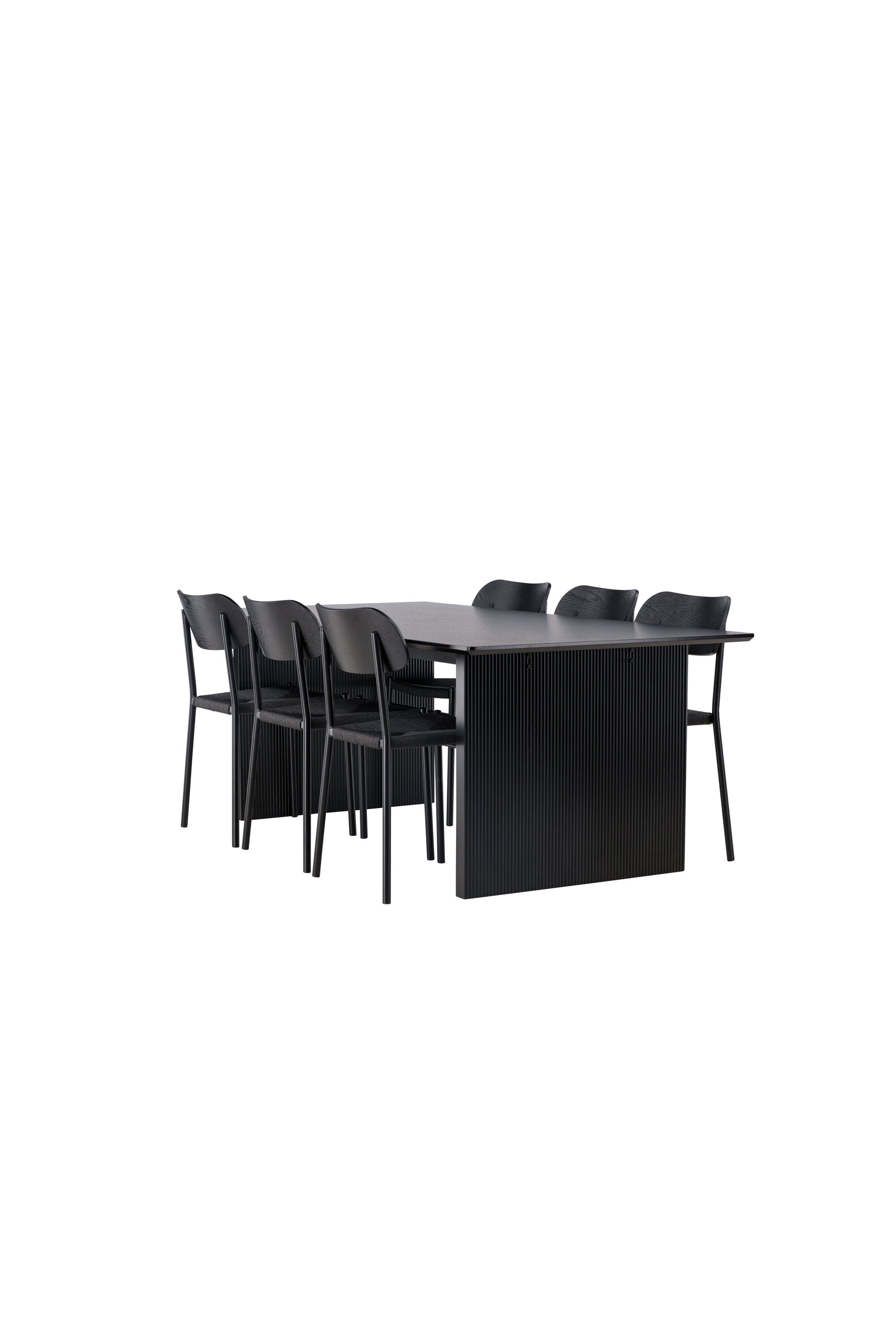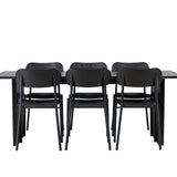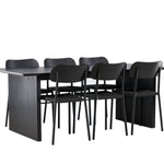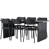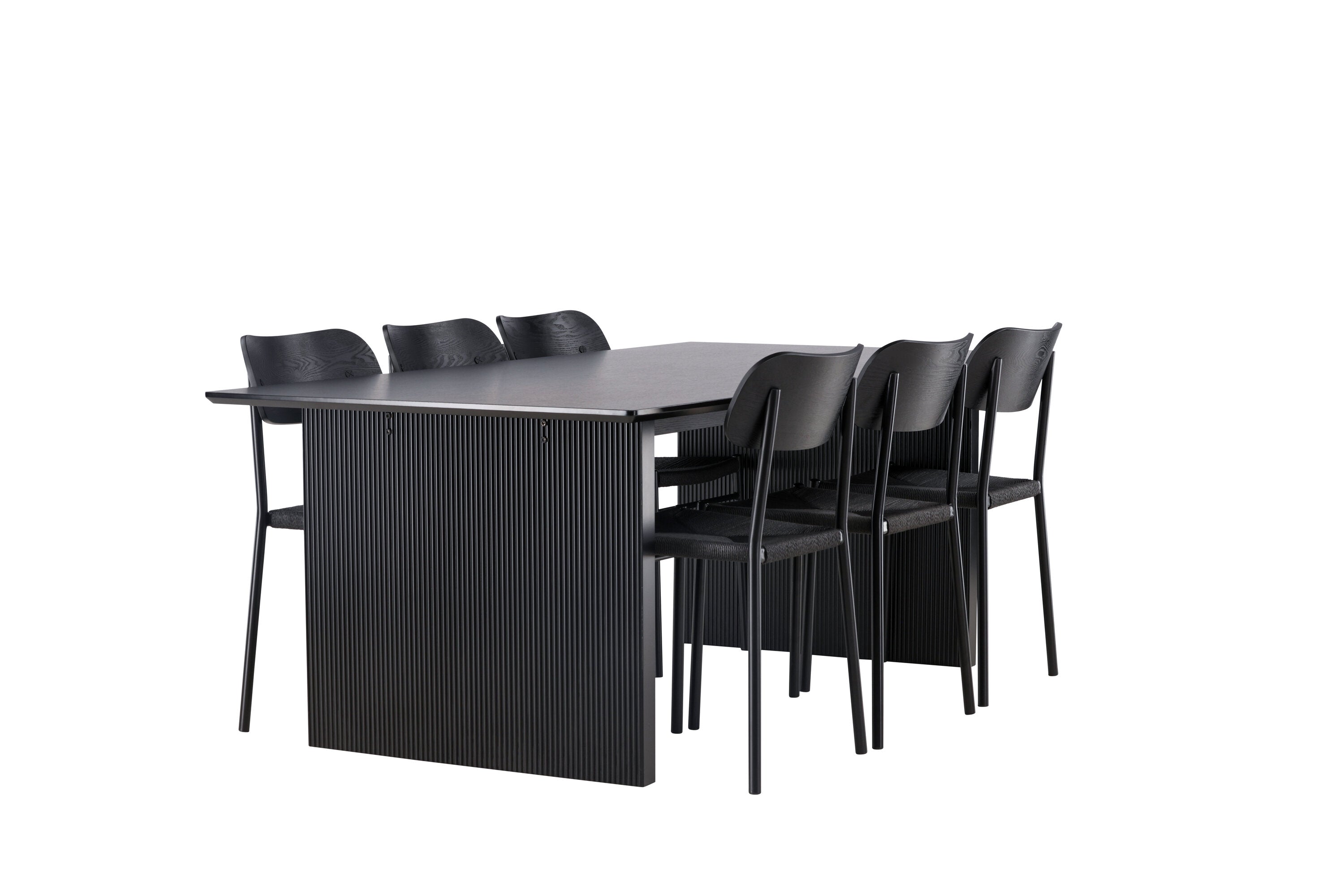 Trendová kombinace! Obdélníkový jídelní stůl Vail má rovné severské tvary a je vyroben z odolné MDF v ušpiněné černé barvě. Stolová deska je tenká v obdélníkovém designu a balancuje na dvou pevných dřevěných deskách, které tvoří základnu. Zde spolu s odpovídajícími černými jídelními židlemi ze série Polly. Židle má opěradlo z černé MDF s dýhou a sedák z módní černé tkaniny z přírodních vláken. Rám a nohy jsou z kovu s černou práškovou barvou. S černou jídelní skupinou neuděláte chybu! Rozměry stolu: 200x100cm.