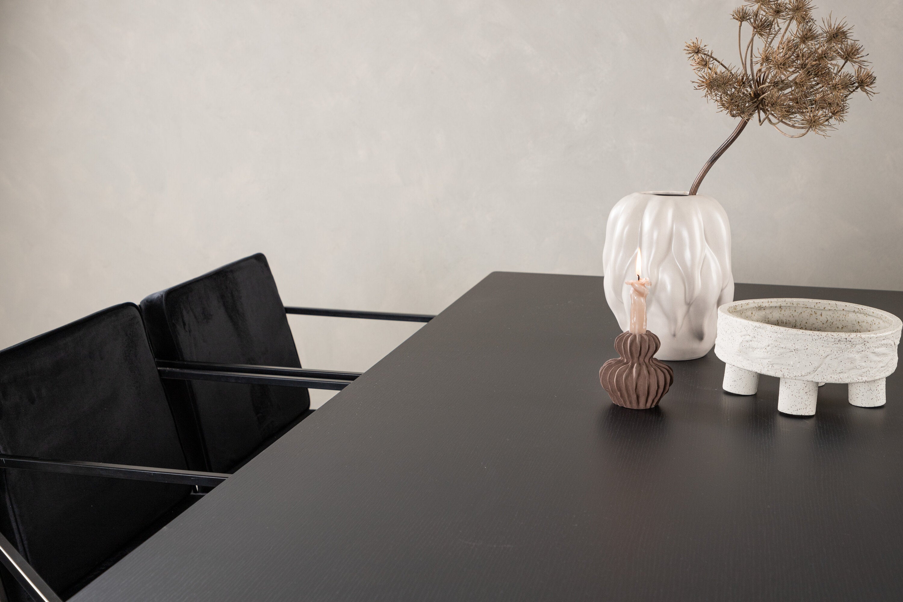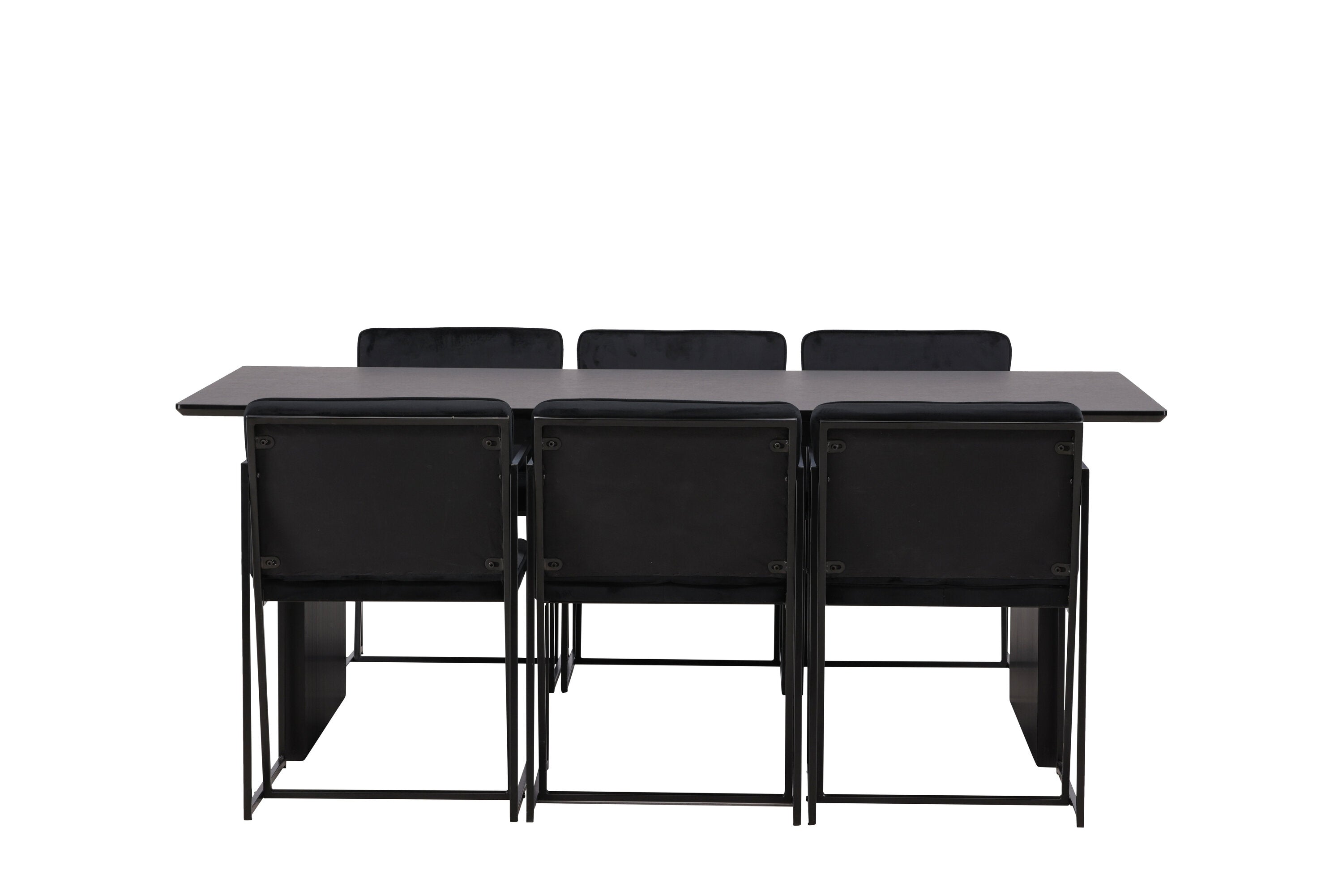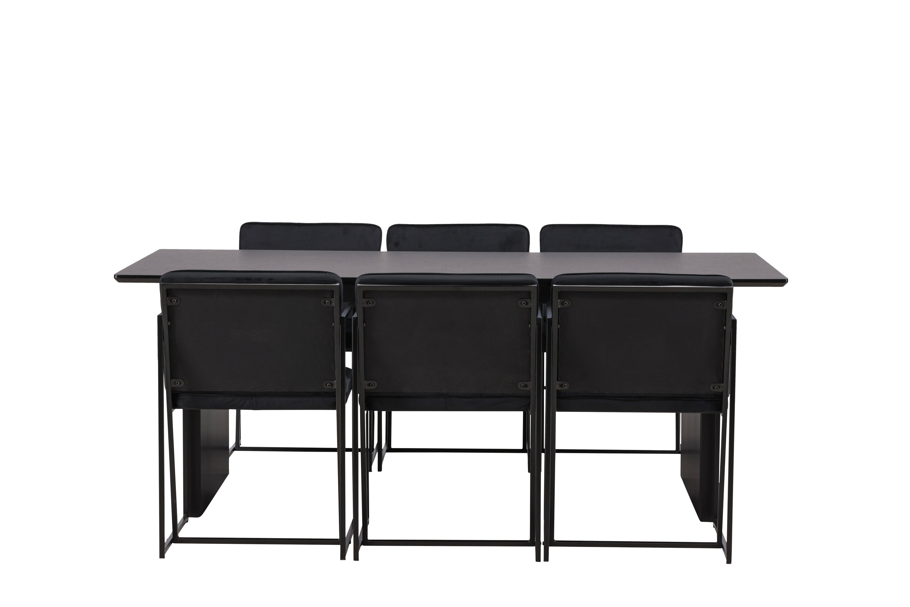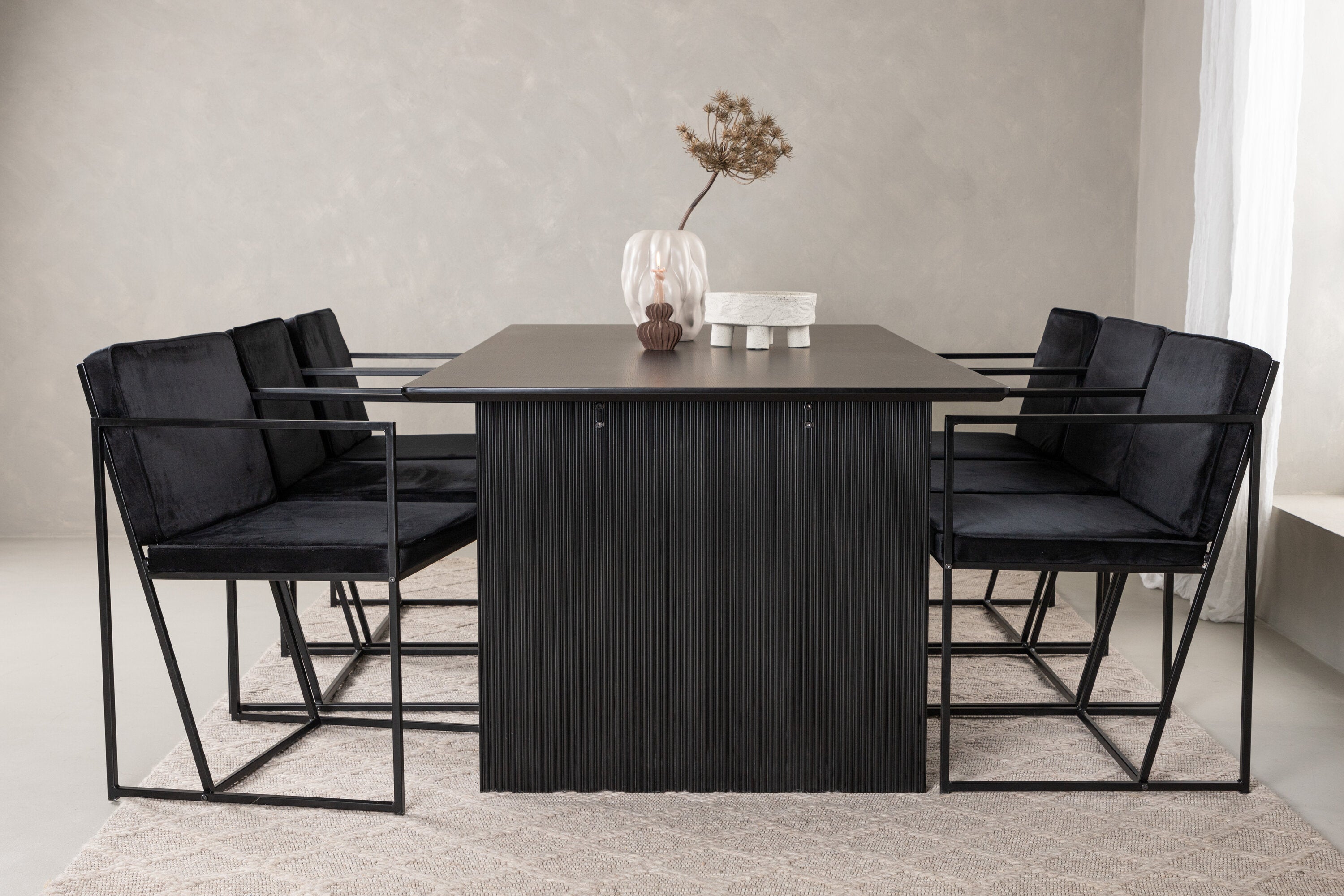 Odpovídající jídelní skupina, která zapůsobí - luxusní, pohodlná a stylová! Náš obdélníkový jídelní stůl ze série Vail má rovné severské tvary a je vyroben z odolné MDF v ušpiněné černé barvě. Deska stolu je tenká a balancuje na dvou pevných dřevěných deskách, které tvoří podvozek – stejně úhledné a odolné. Zde v nádherné kombinaci s našimi krásnými židlemi ze série Richmond. Židle má minimalistický rám z černé oceli a celočalouněný sedák z černé sametové látky. Opřete se a pohodlně se posaďte!