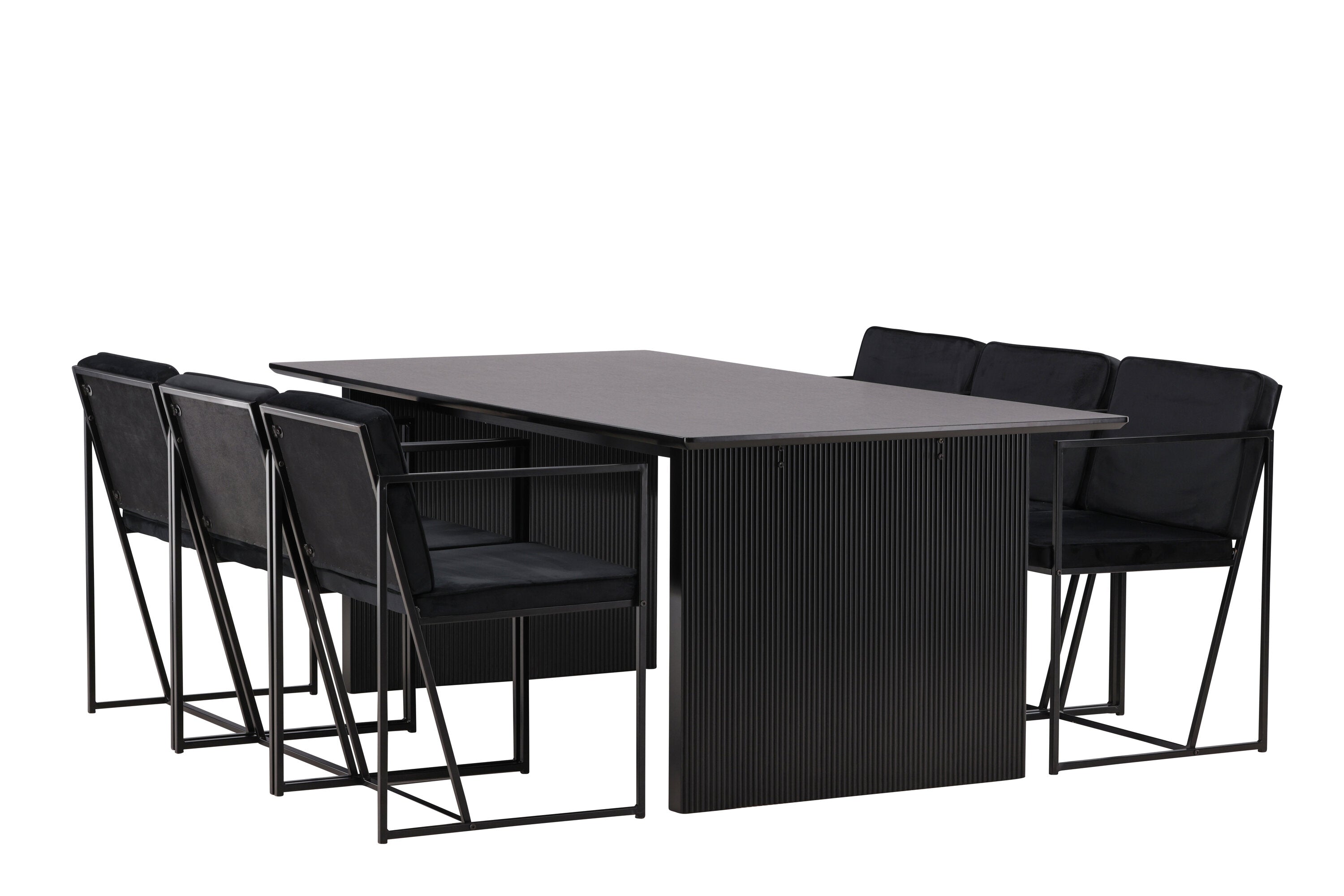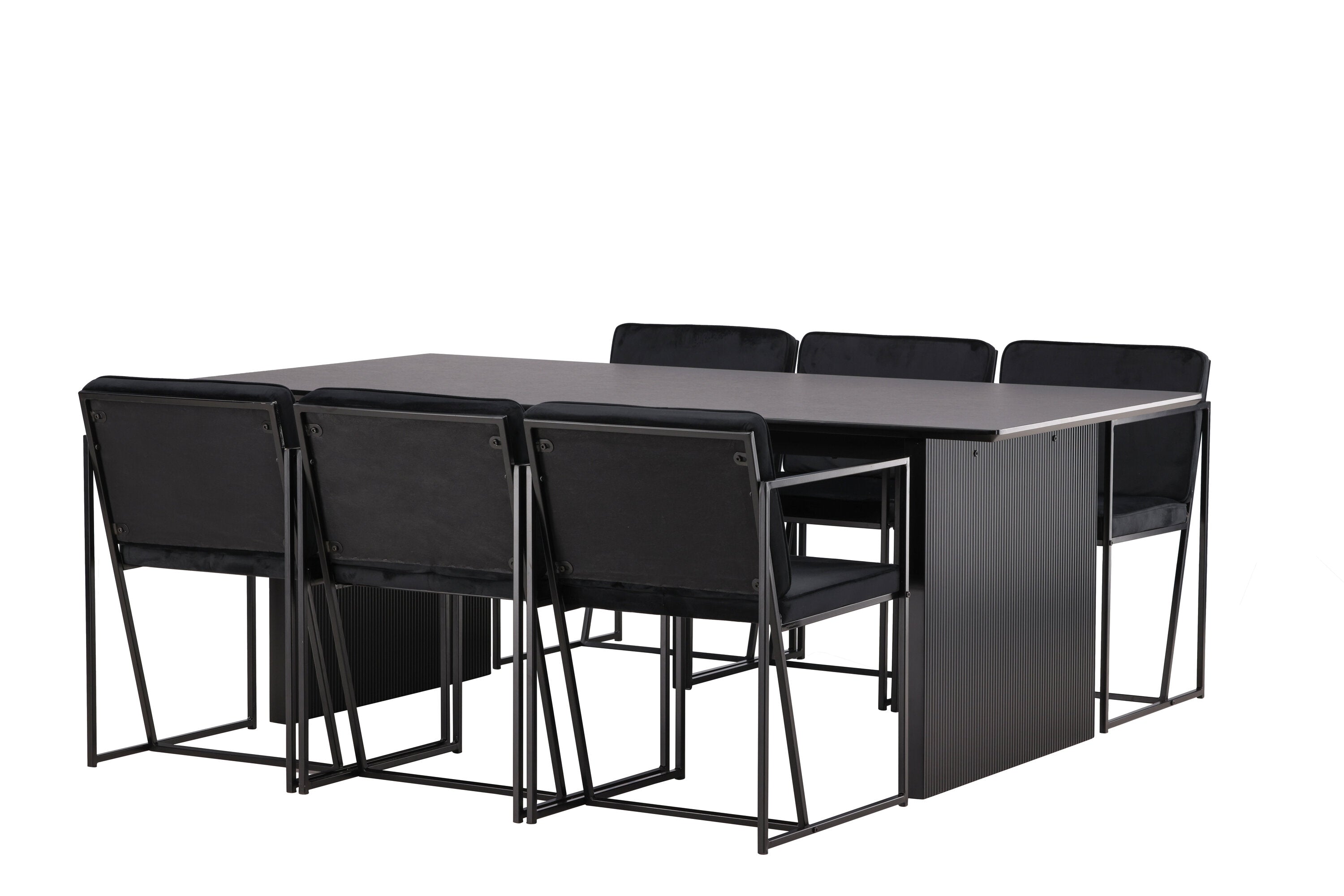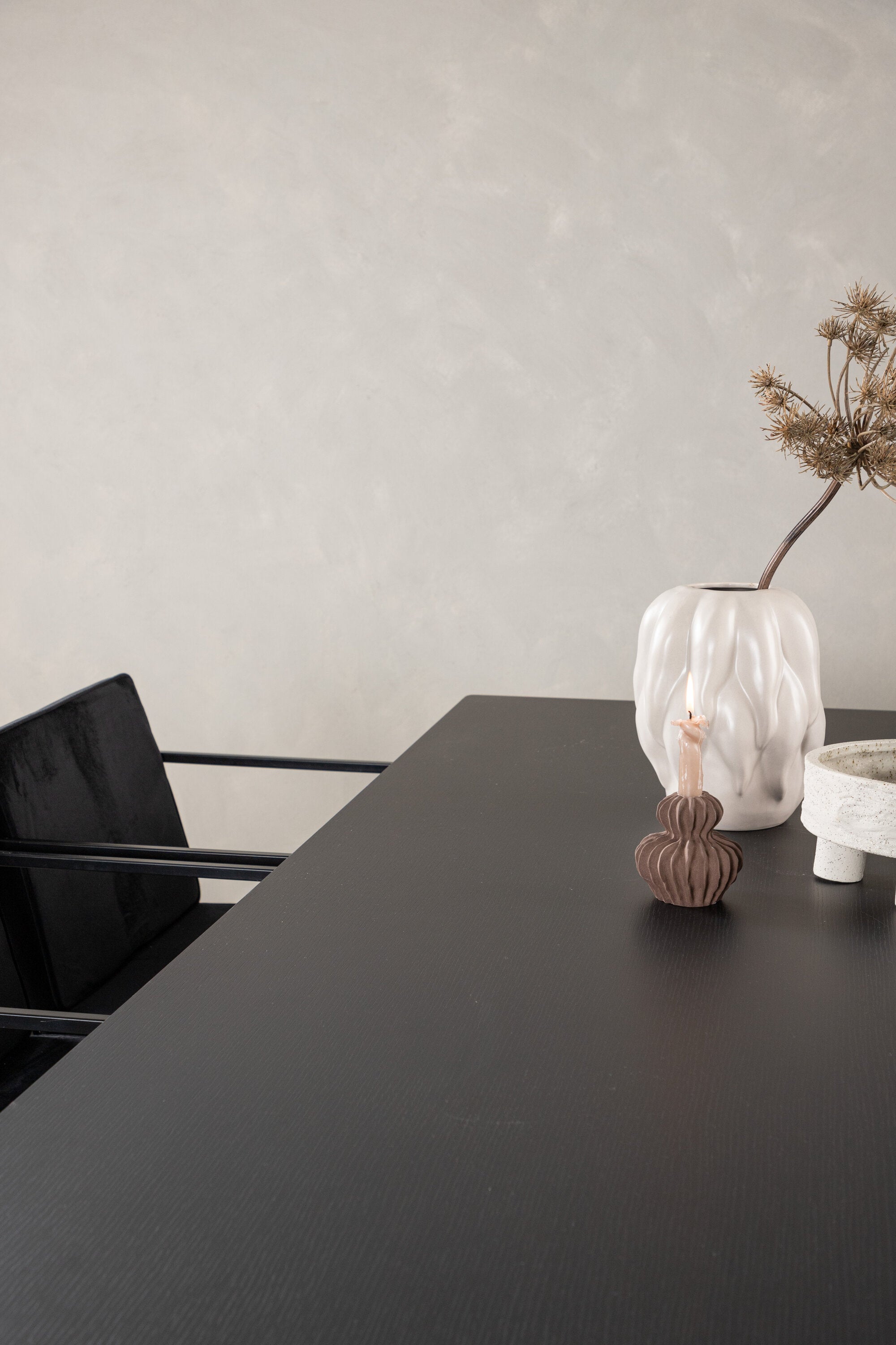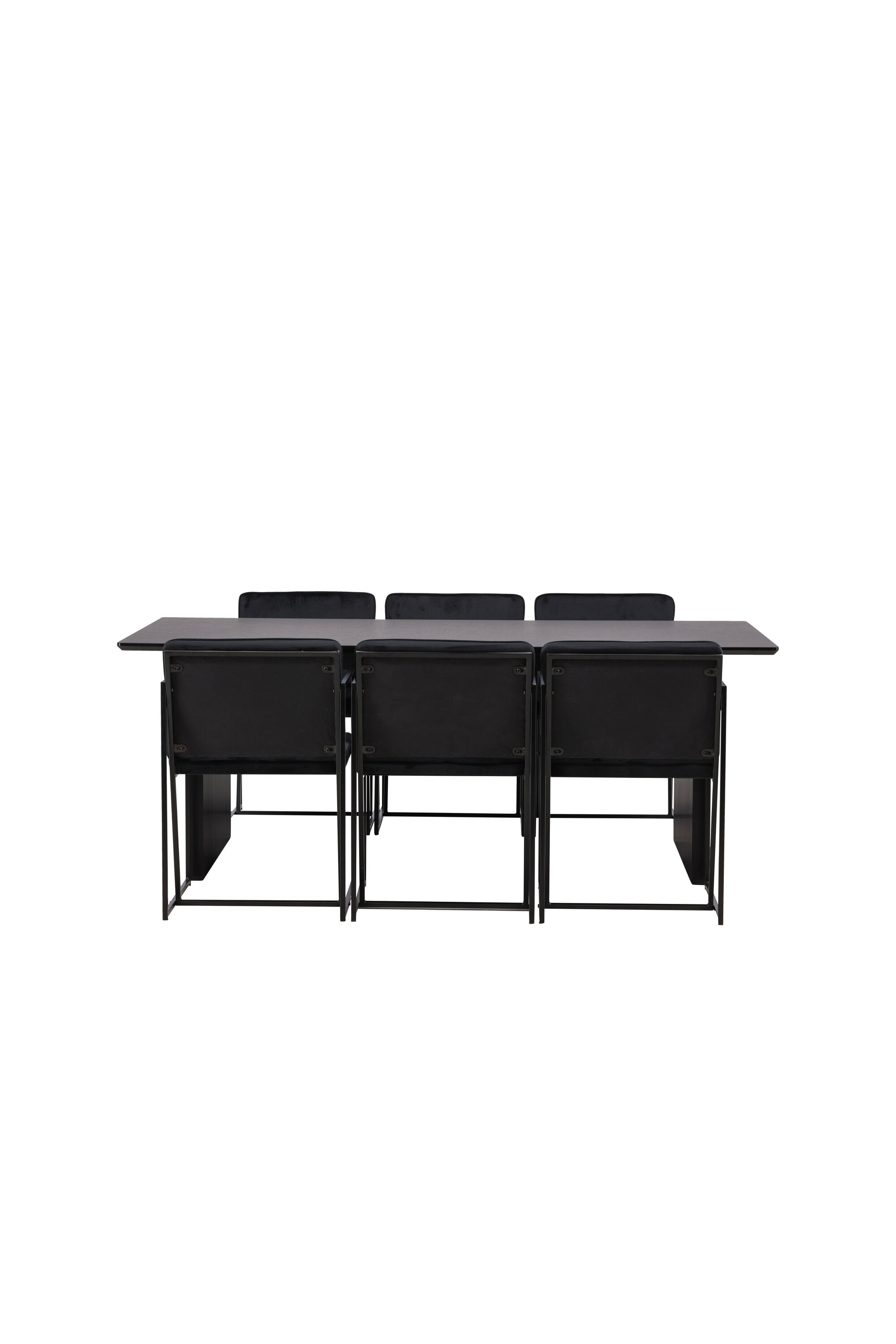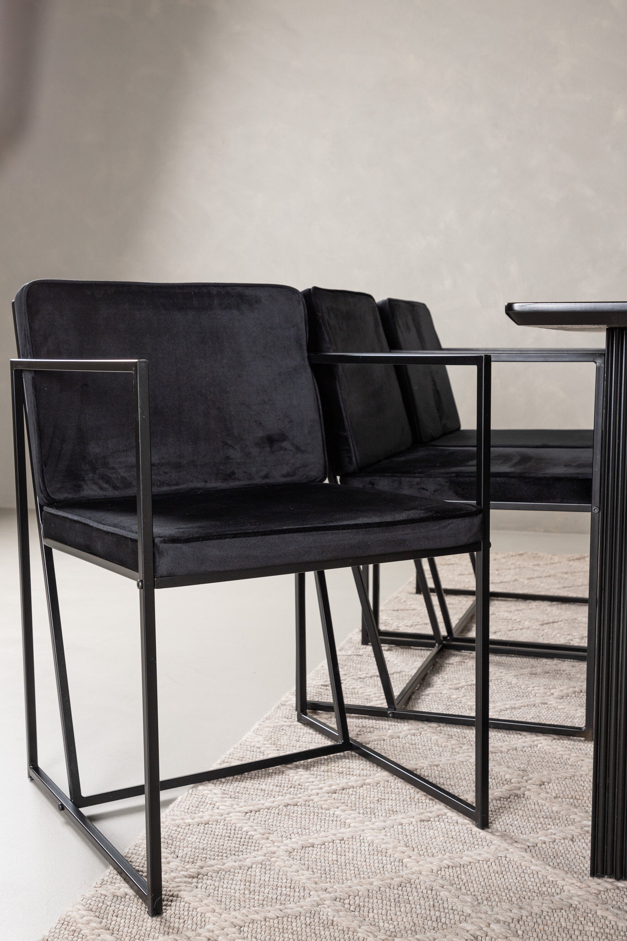 Odpovídající jídelní skupina, která zapůsobí - luxusní, pohodlná a stylová! Náš obdélníkový jídelní stůl ze série Vail má rovné severské tvary a je vyroben z odolné MDF v ušpiněné černé barvě. Deska stolu je tenká a balancuje na dvou pevných dřevěných deskách, které tvoří podvozek – stejně úhledné a odolné. Zde v nádherné kombinaci s našimi krásnými židlemi ze série Richmond. Židle má minimalistický rám z černé oceli a celočalouněný sedák z černé sametové látky. Opřete se a pohodlně se posaďte!