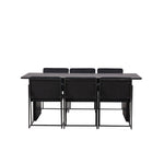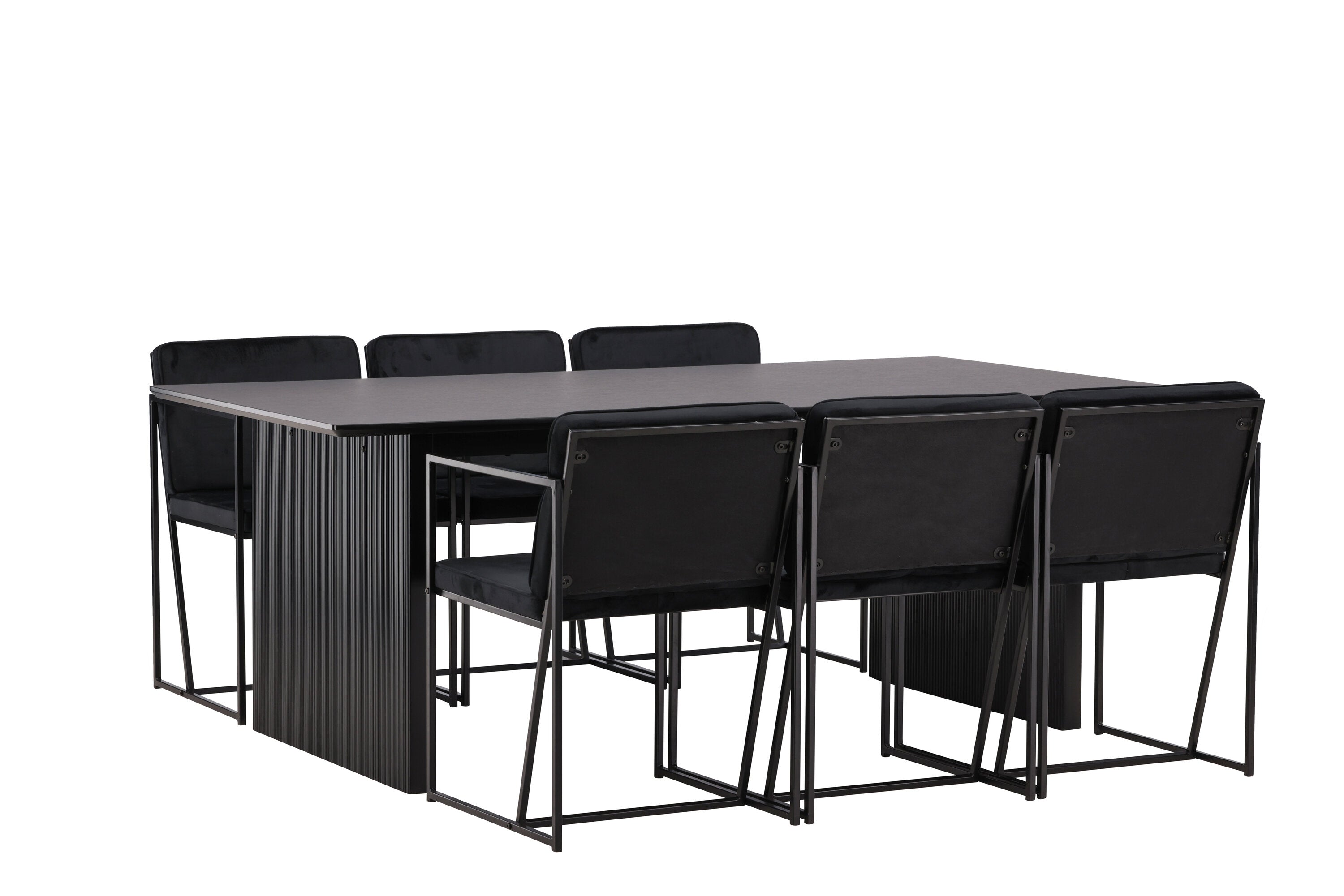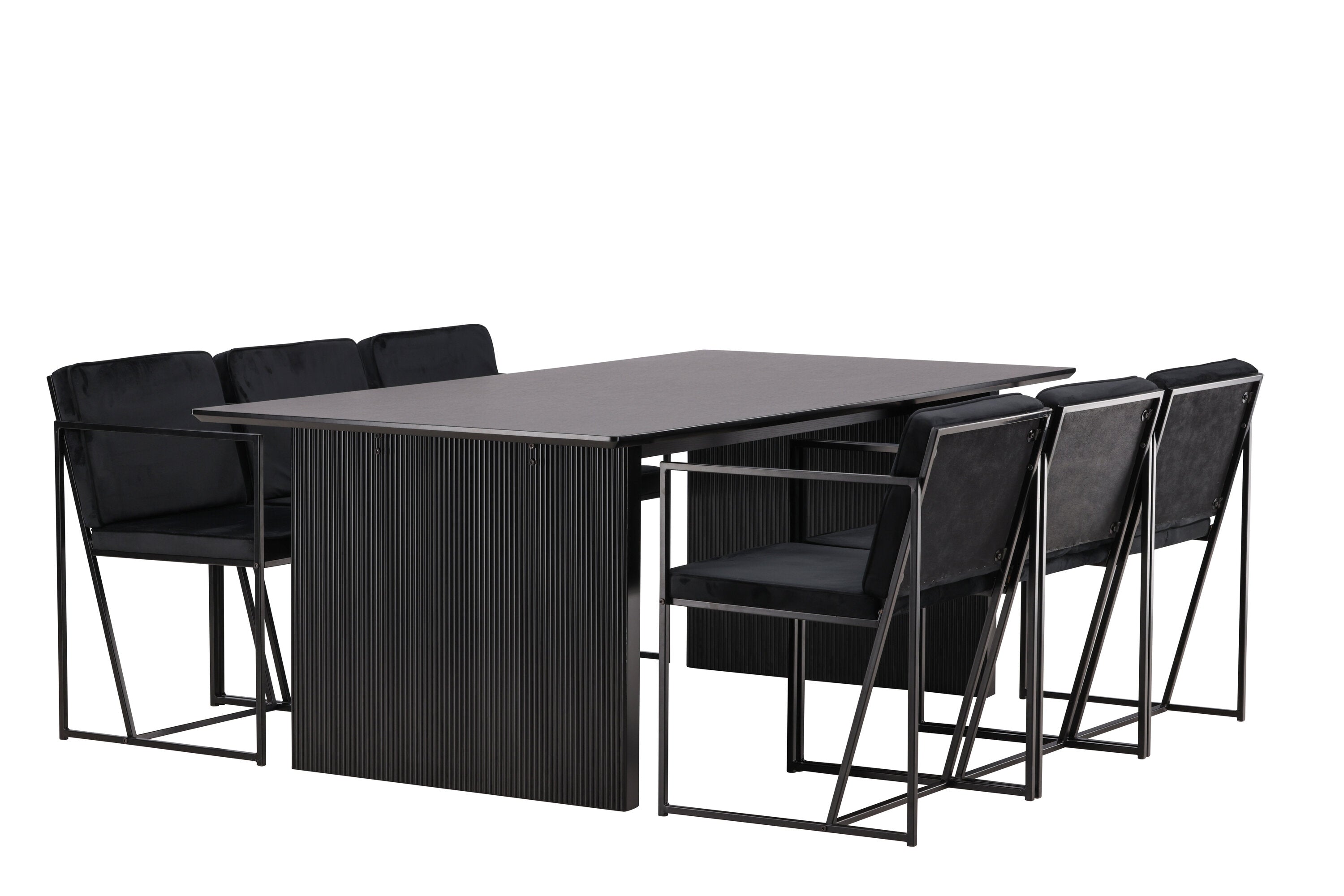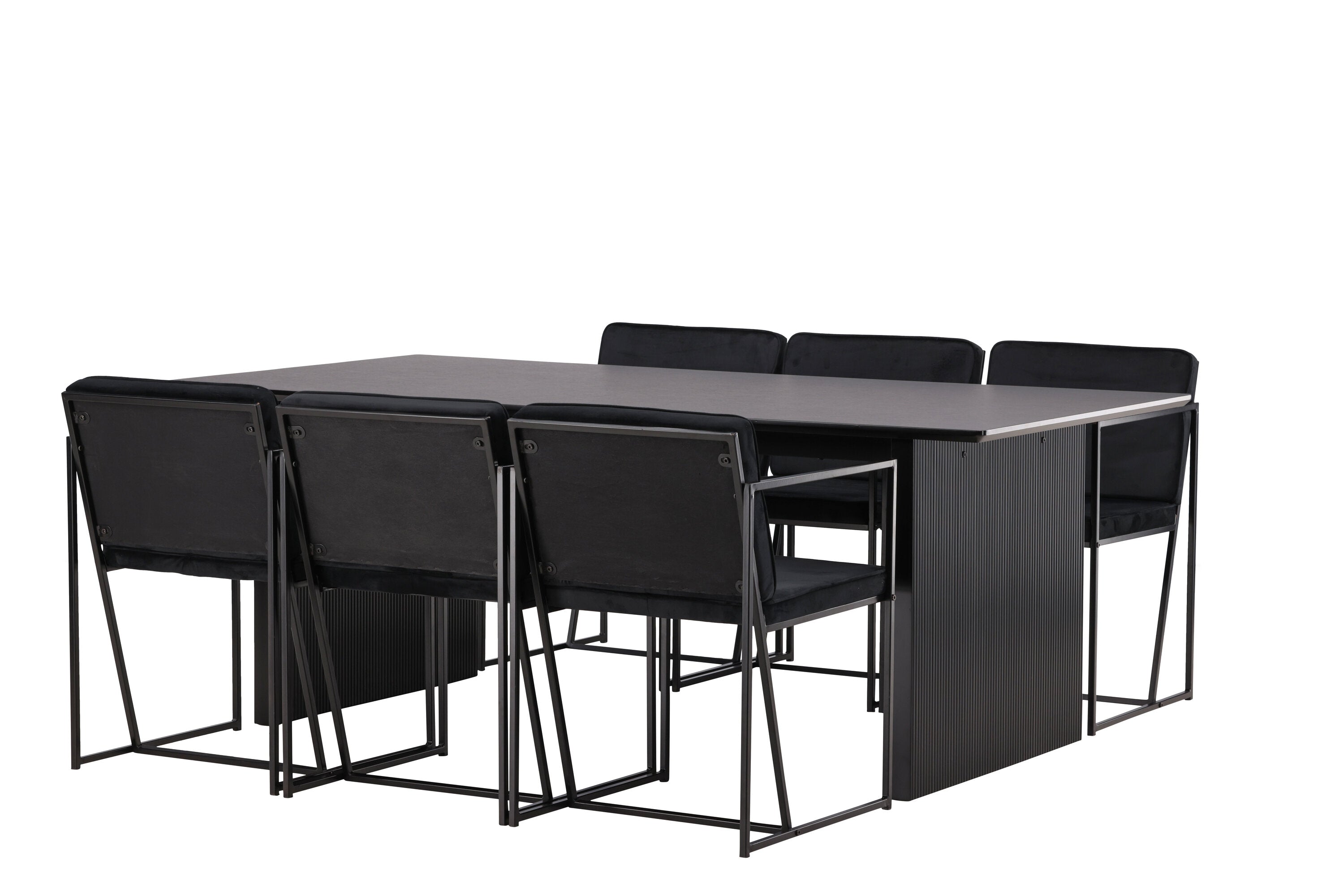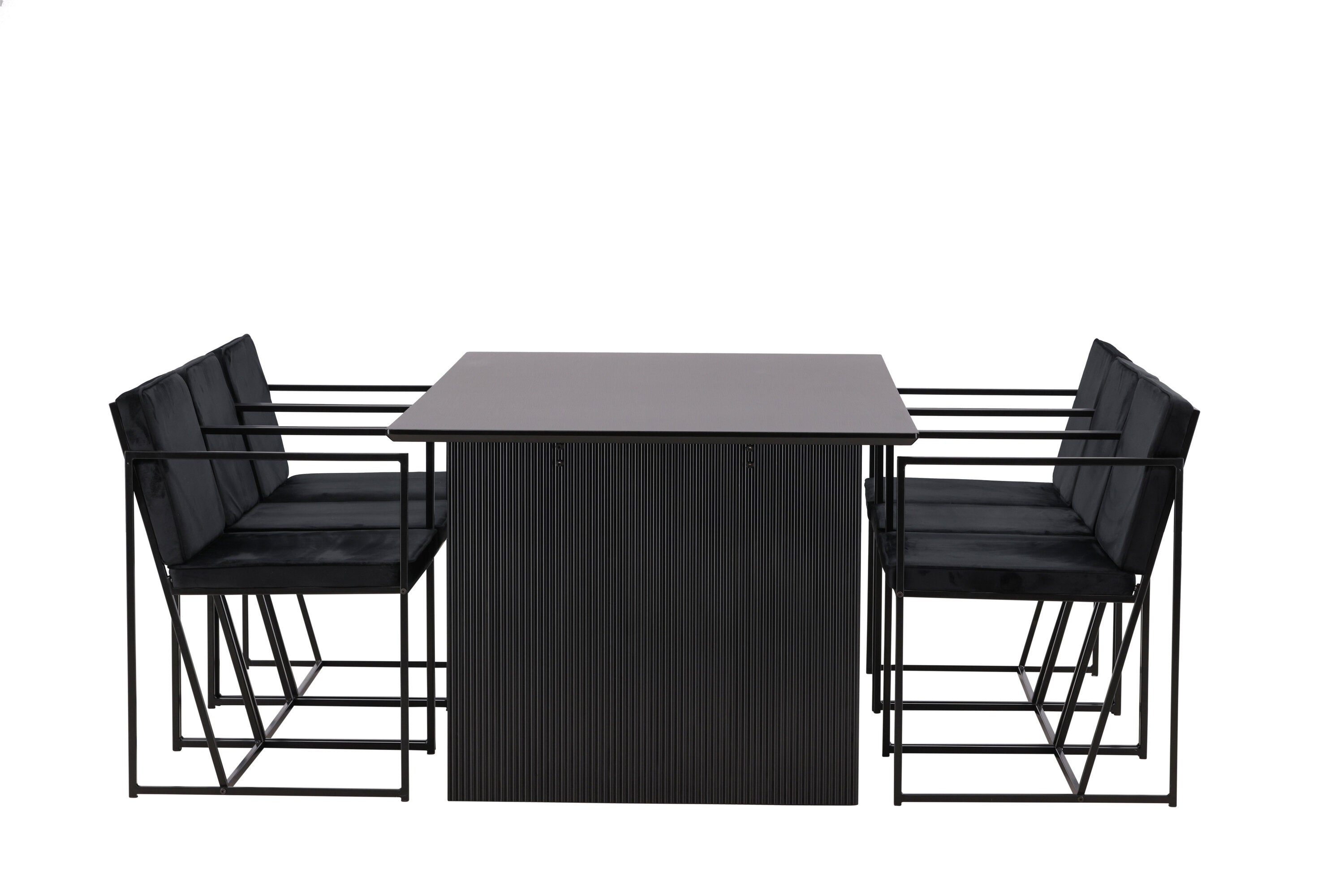 Odpovídající jídelní skupina, která zapůsobí - luxusní, pohodlná a stylová! Náš obdélníkový jídelní stůl ze série Vail má rovné severské tvary a je vyroben z odolné MDF v ušpiněné černé barvě. Deska stolu je tenká a balancuje na dvou pevných dřevěných deskách, které tvoří podvozek – stejně úhledné a odolné. Zde v nádherné kombinaci s našimi krásnými židlemi ze série Richmond. Židle má minimalistický rám z černé oceli a celočalouněný sedák z černé sametové látky. Opřete se a pohodlně se posaďte!