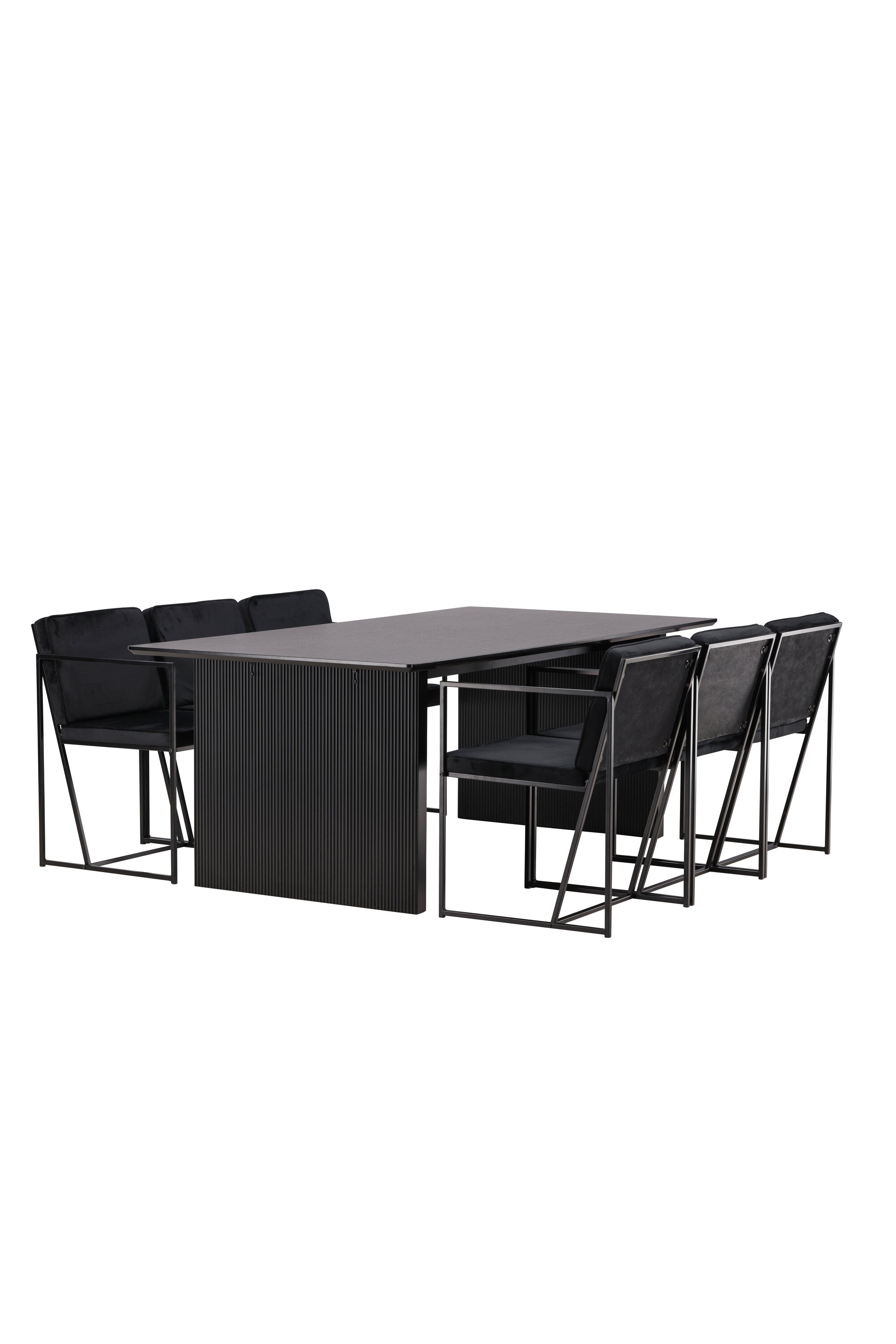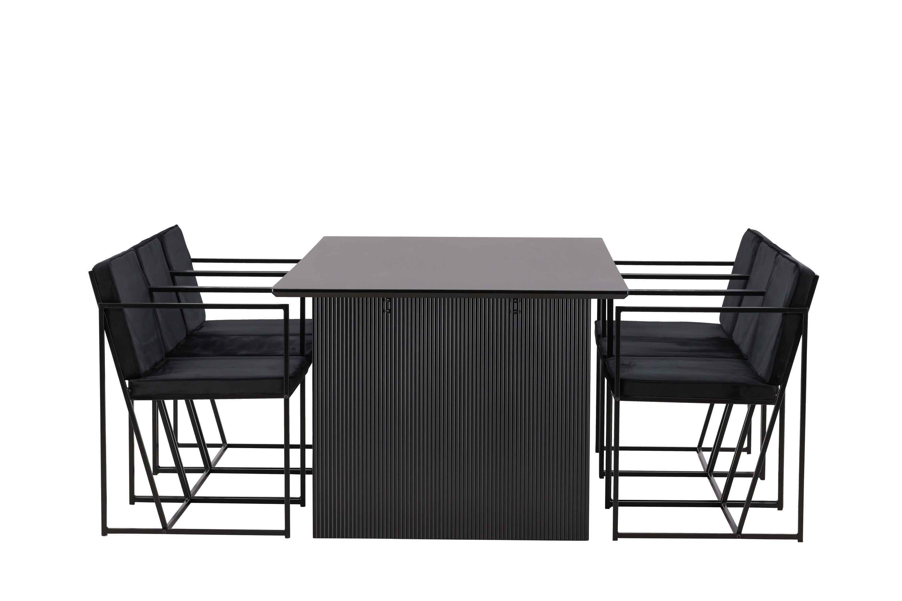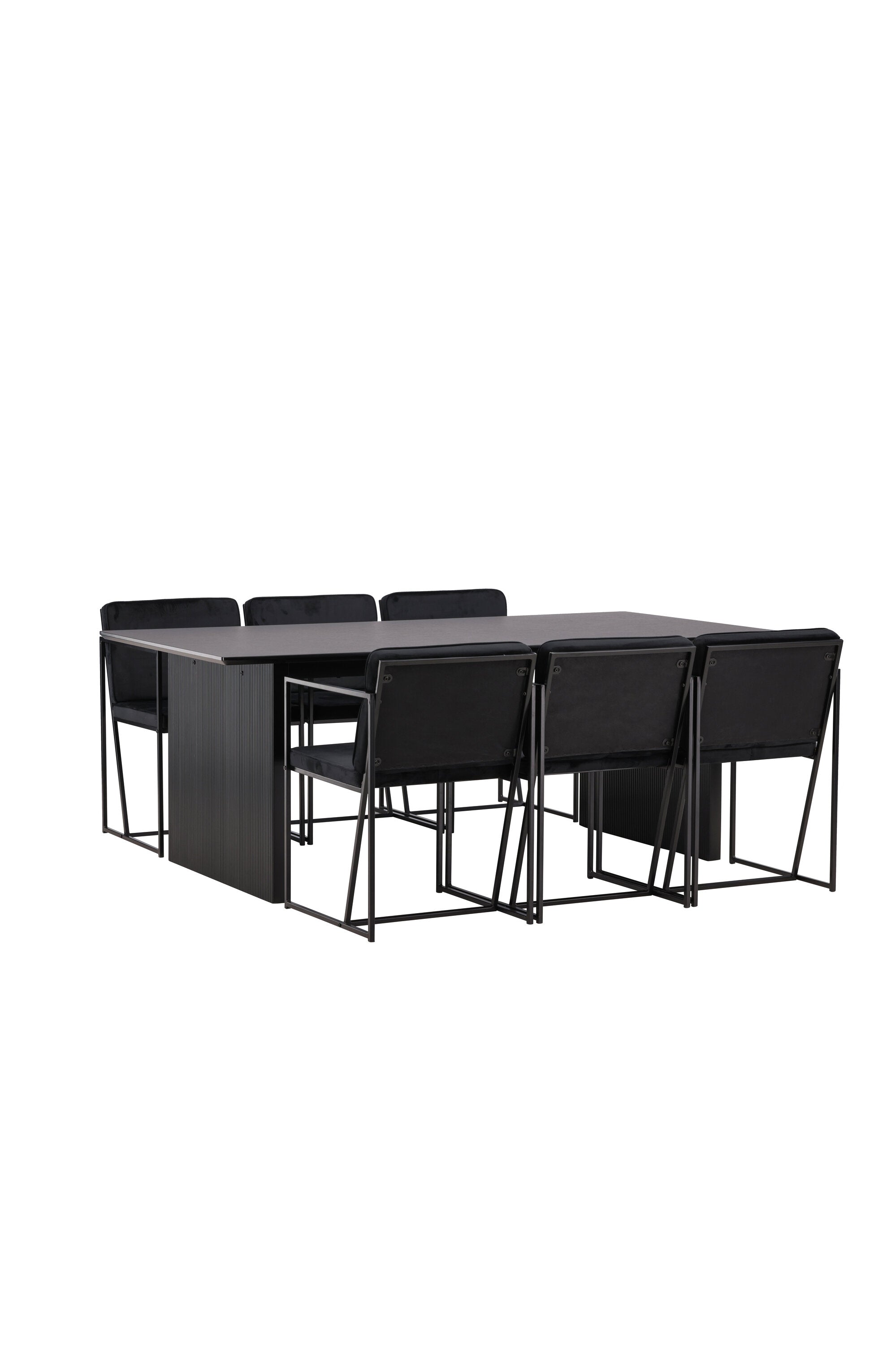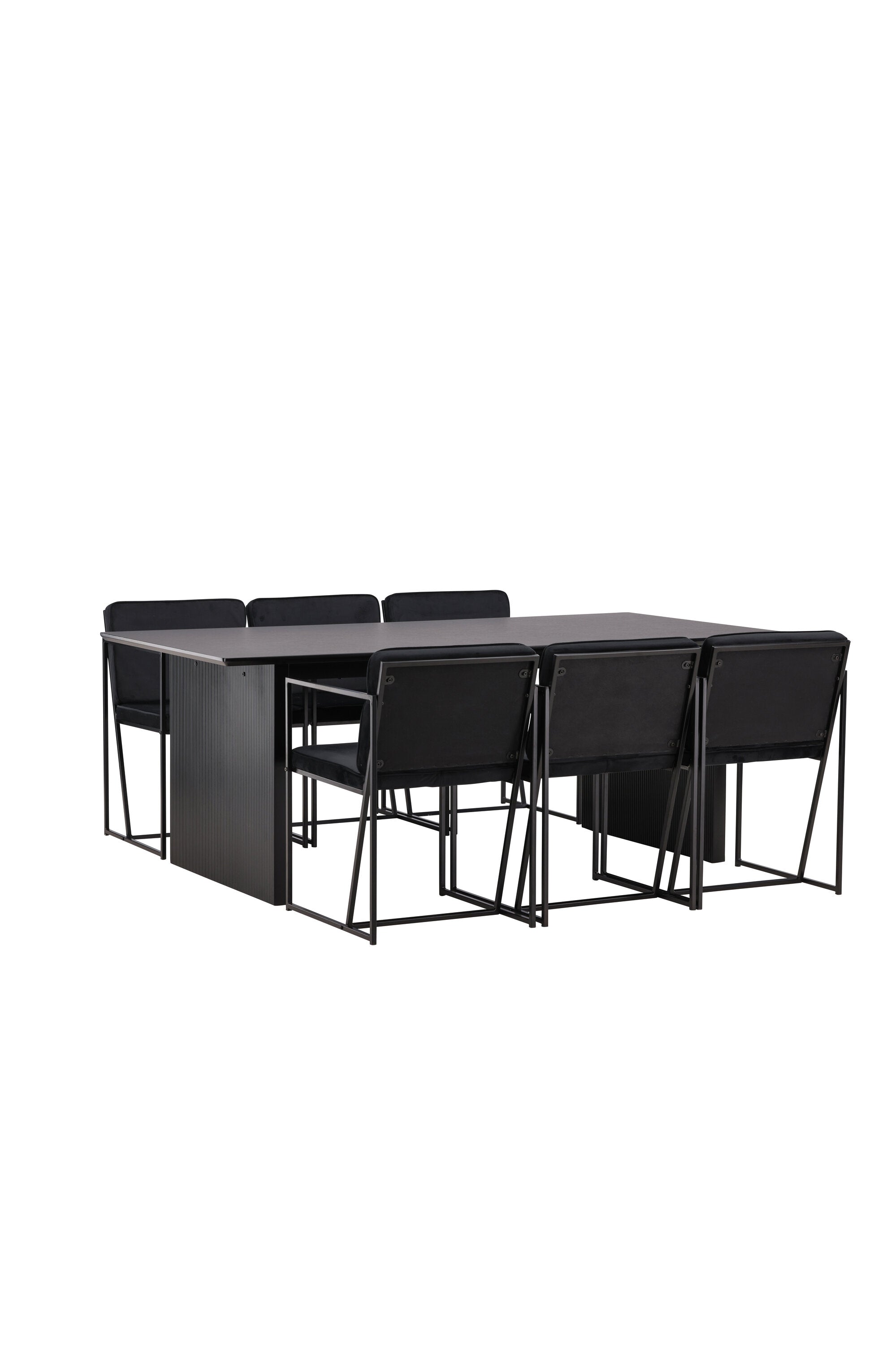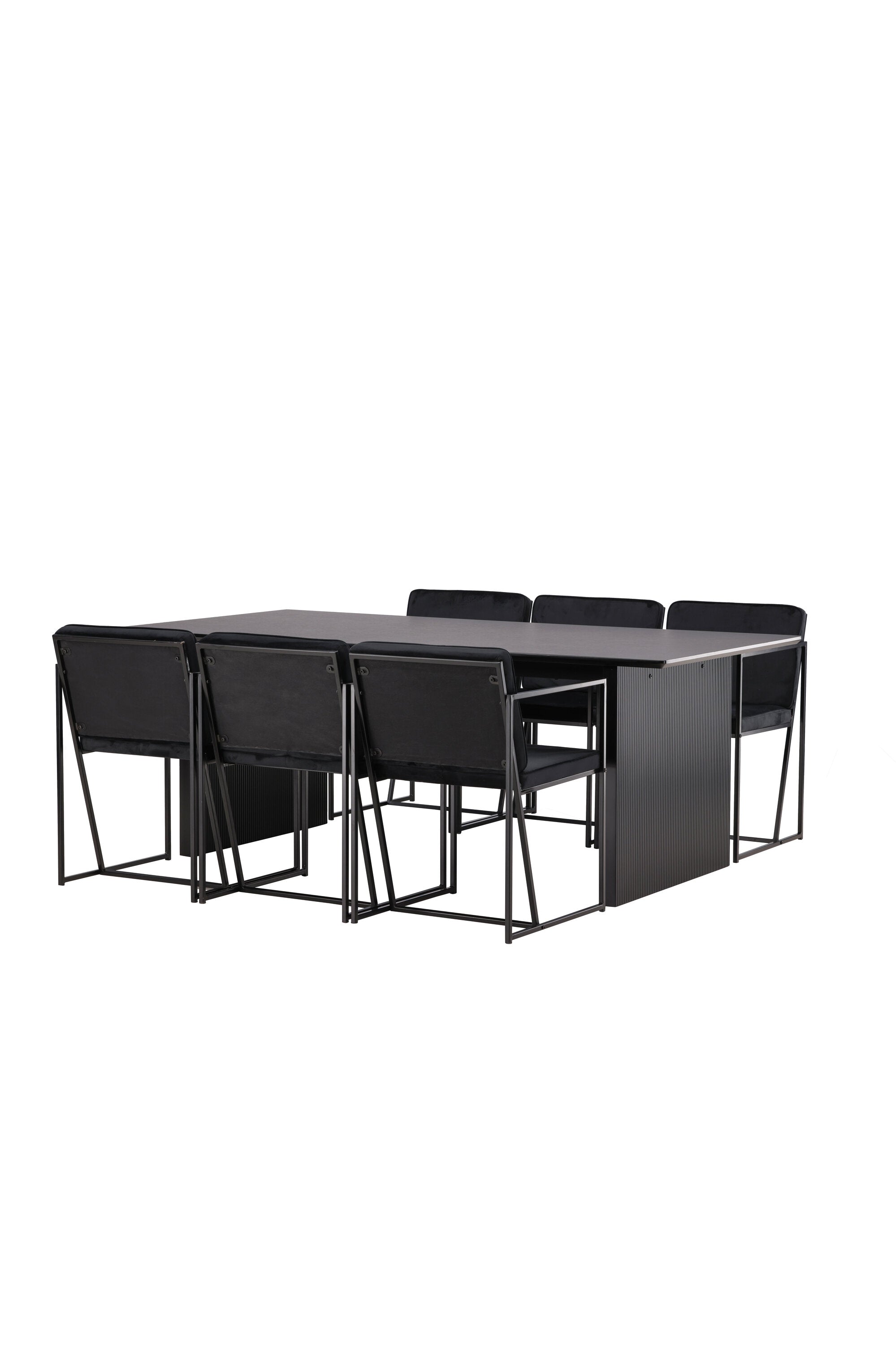 Odpovídající jídelní skupina, která zapůsobí - luxusní, pohodlná a stylová! Náš obdélníkový jídelní stůl ze série Vail má rovné severské tvary a je vyroben z odolné MDF v ušpiněné černé barvě. Deska stolu je tenká a balancuje na dvou pevných dřevěných deskách, které tvoří podvozek – stejně úhledné a odolné. Zde v nádherné kombinaci s našimi krásnými židlemi ze série Richmond. Židle má minimalistický rám z černé oceli a celočalouněný sedák z černé sametové látky. Opřete se a pohodlně se posaďte!