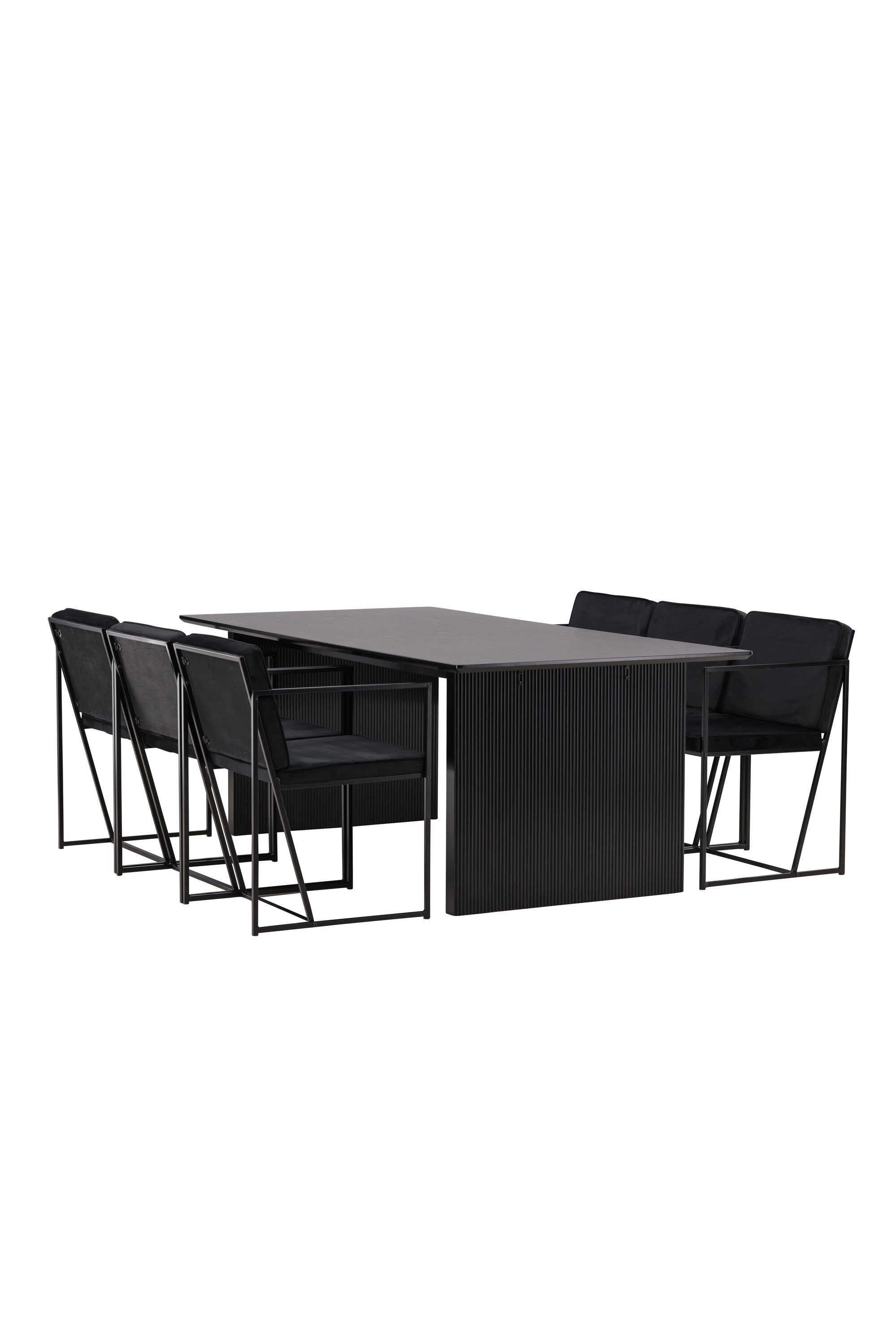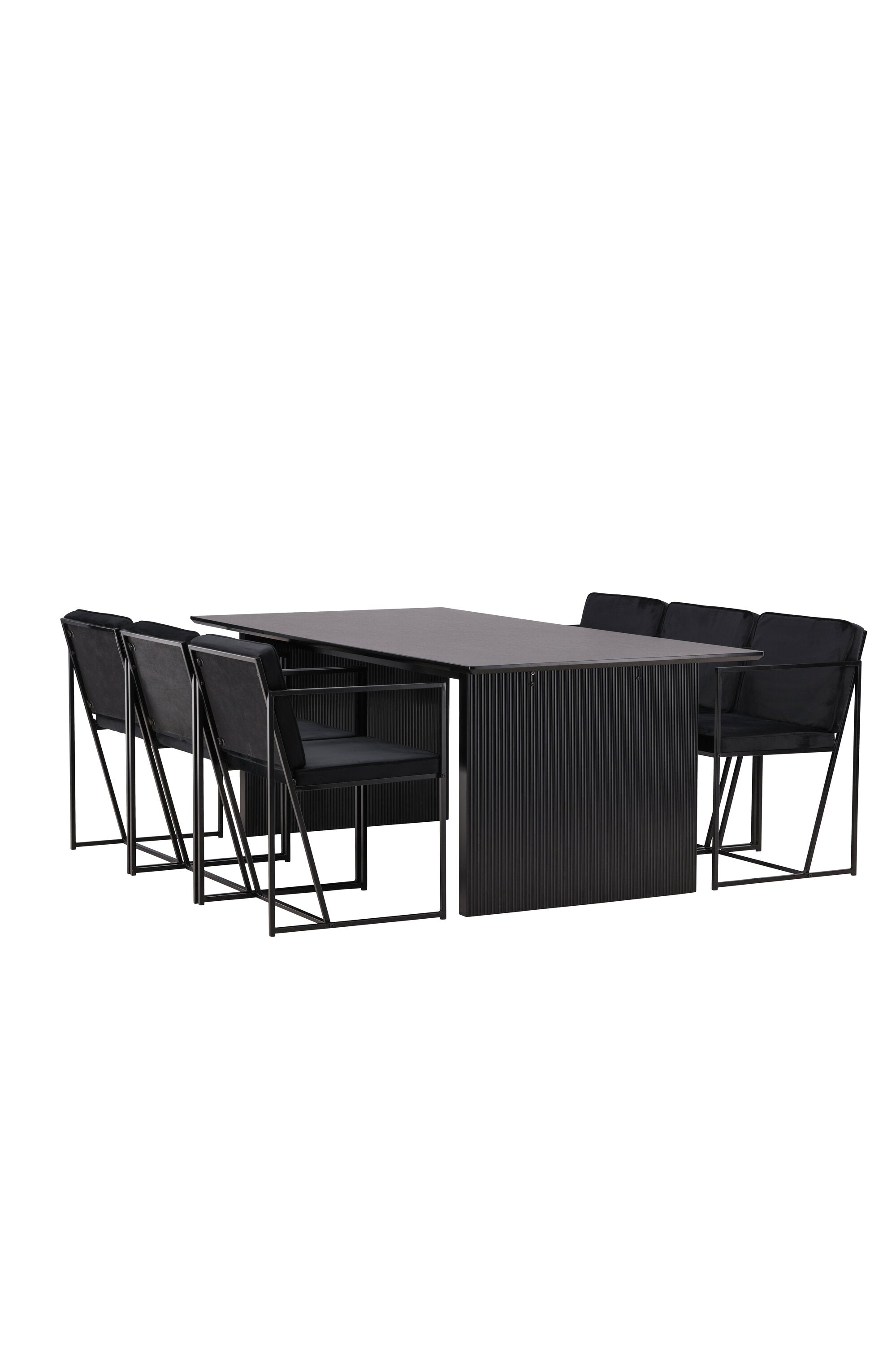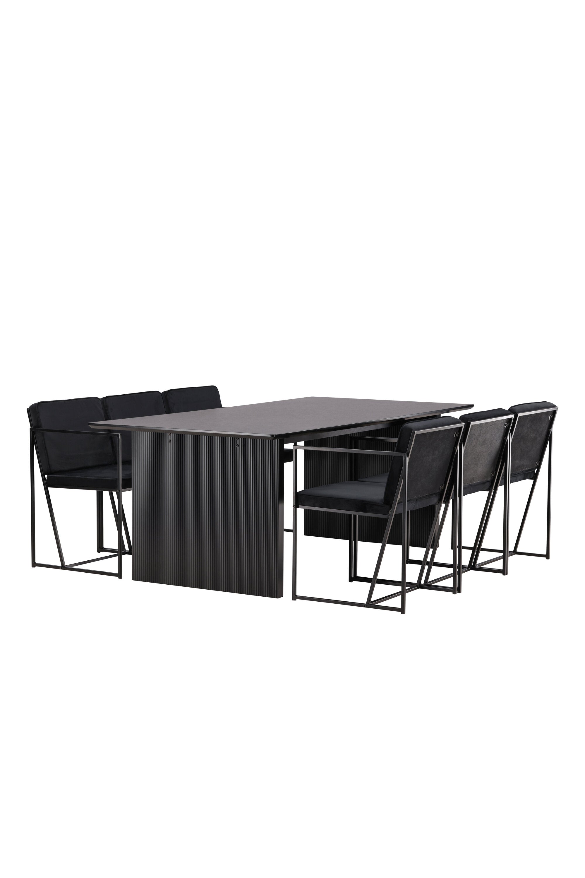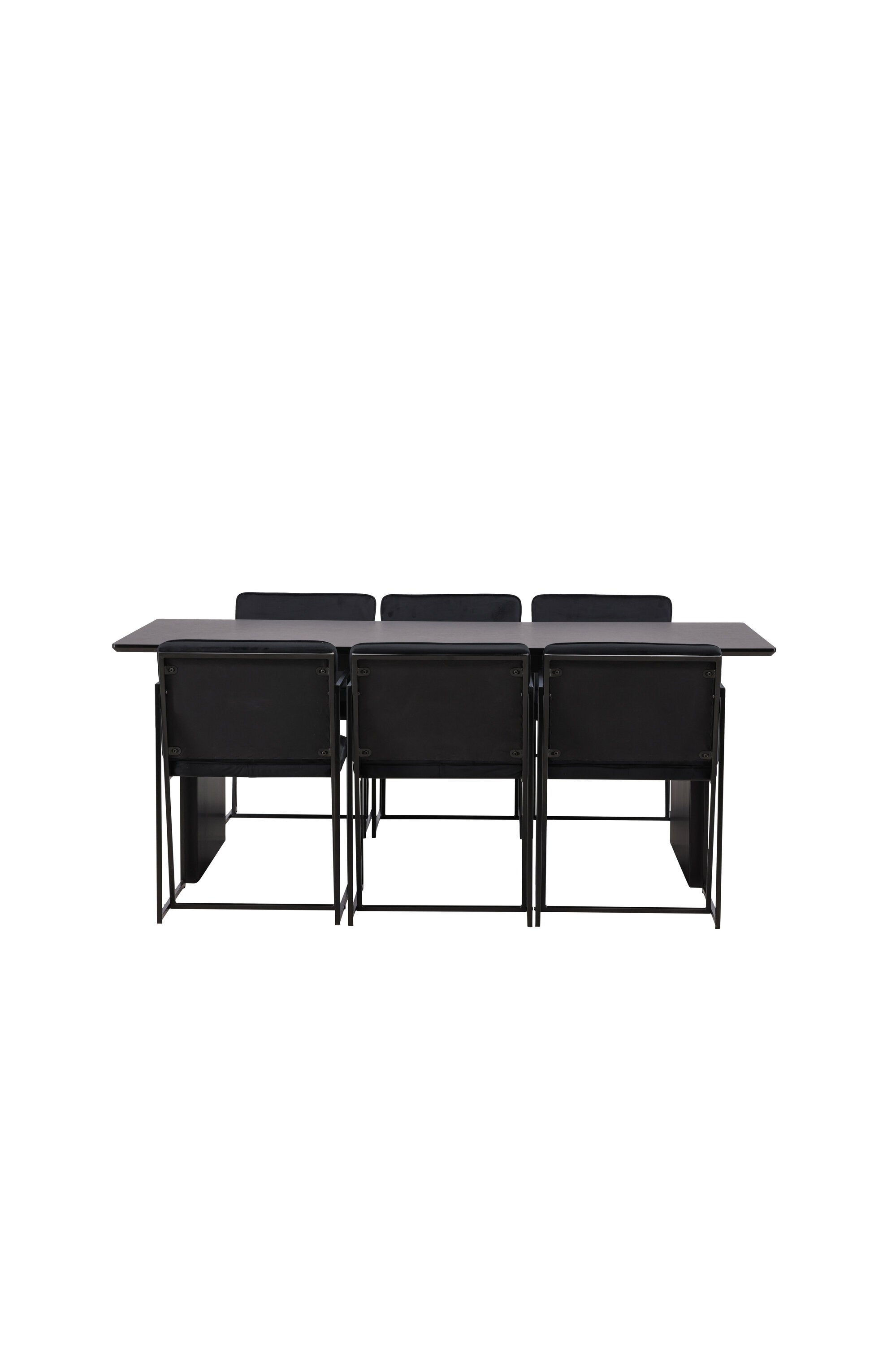 Odpovídající jídelní skupina, která zapůsobí - luxusní, pohodlná a stylová! Náš obdélníkový jídelní stůl ze série Vail má rovné severské tvary a je vyroben z odolné MDF v ušpiněné černé barvě. Deska stolu je tenká a balancuje na dvou pevných dřevěných deskách, které tvoří podvozek – stejně úhledné a odolné. Zde v nádherné kombinaci s našimi krásnými židlemi ze série Richmond. Židle má minimalistický rám z černé oceli a celočalouněný sedák z černé sametové látky. Opřete se a pohodlně se posaďte!