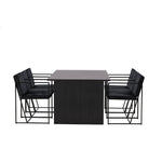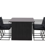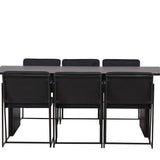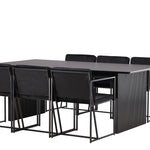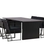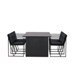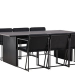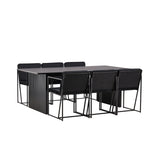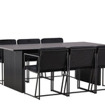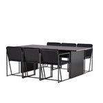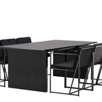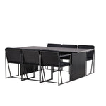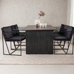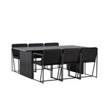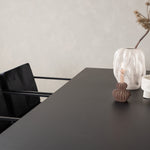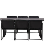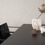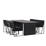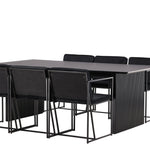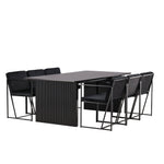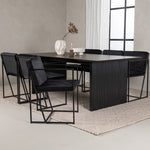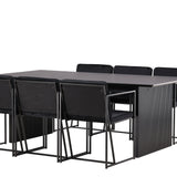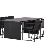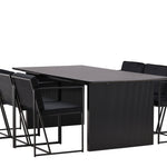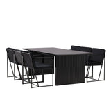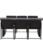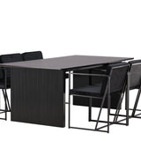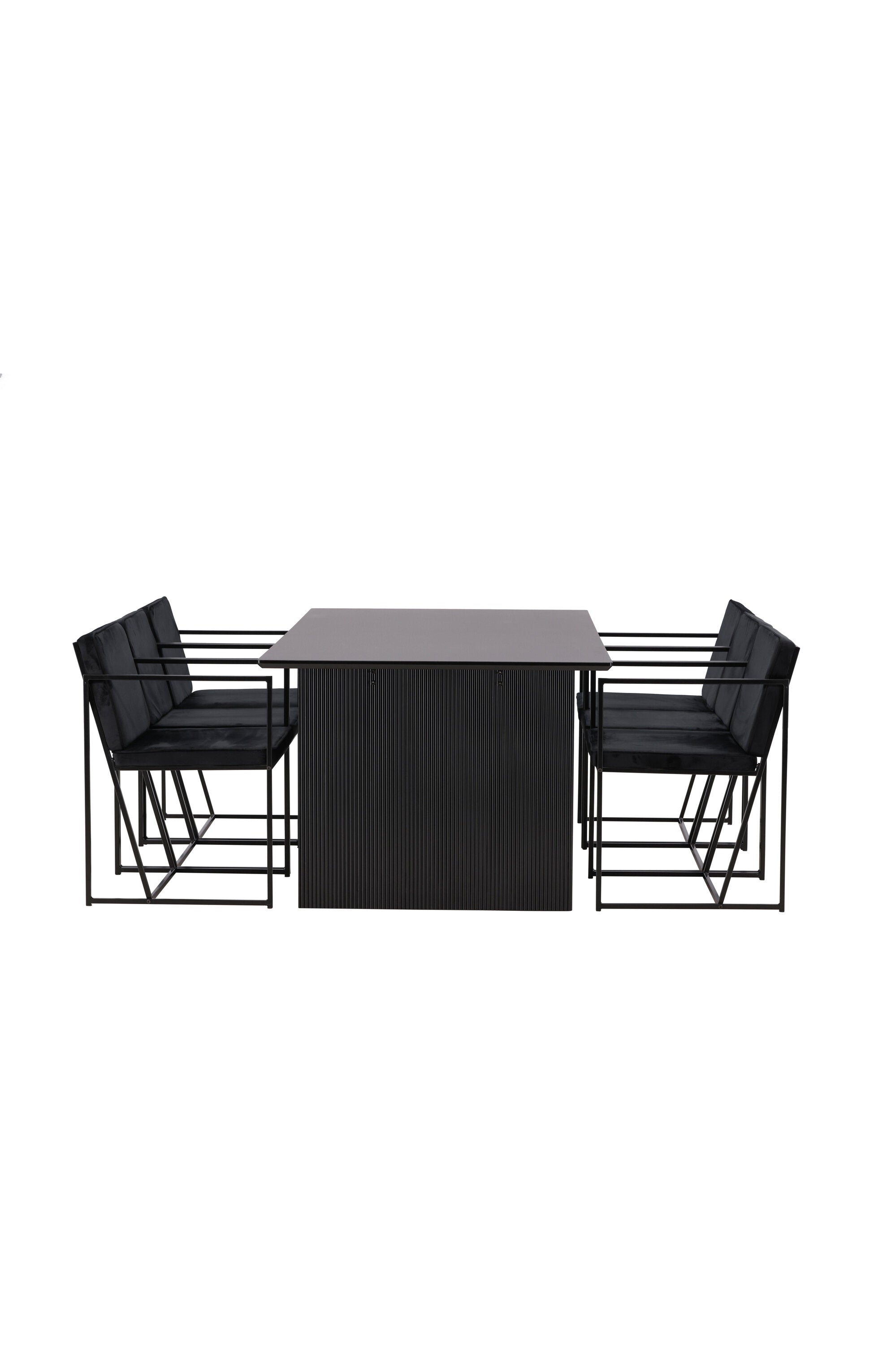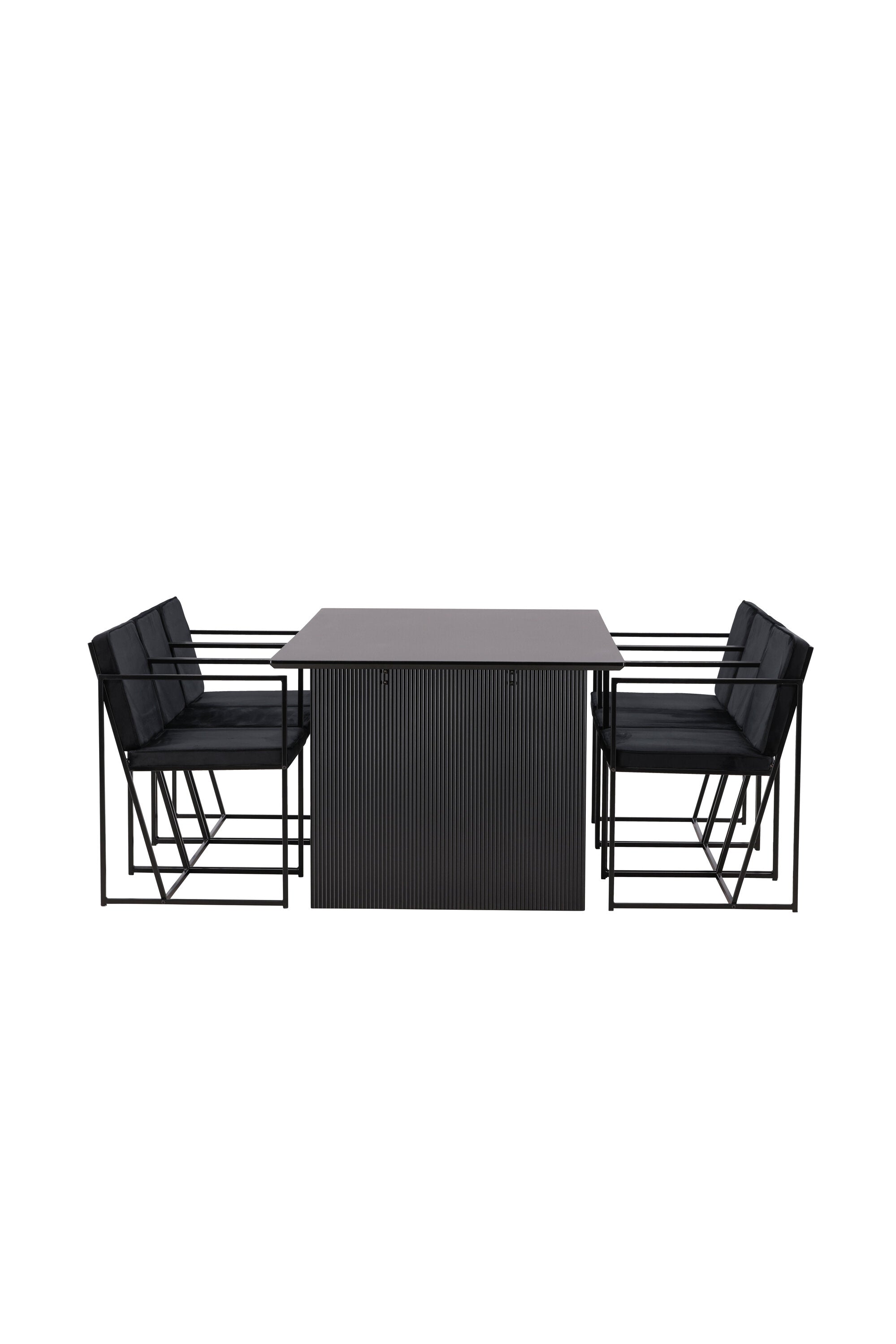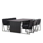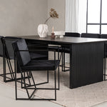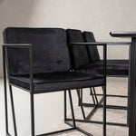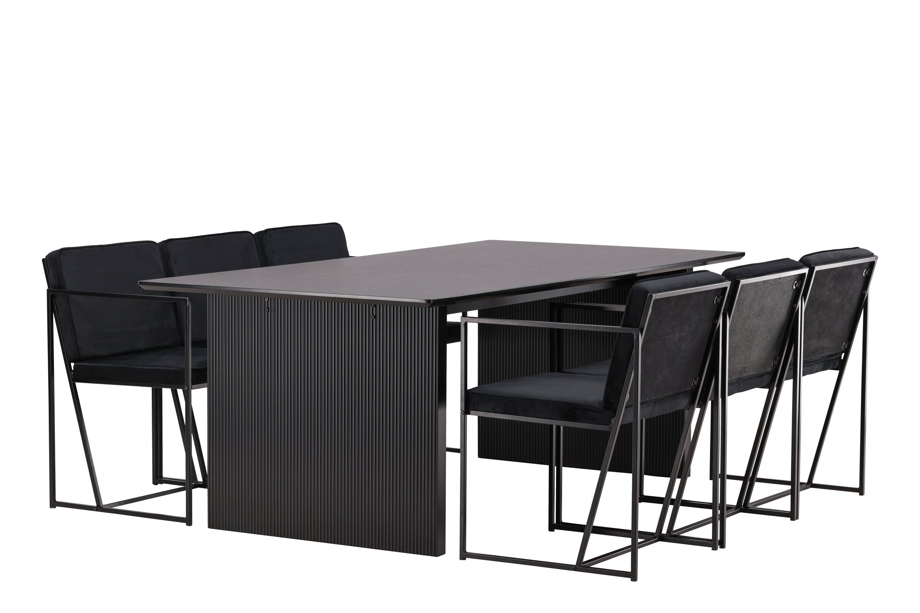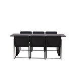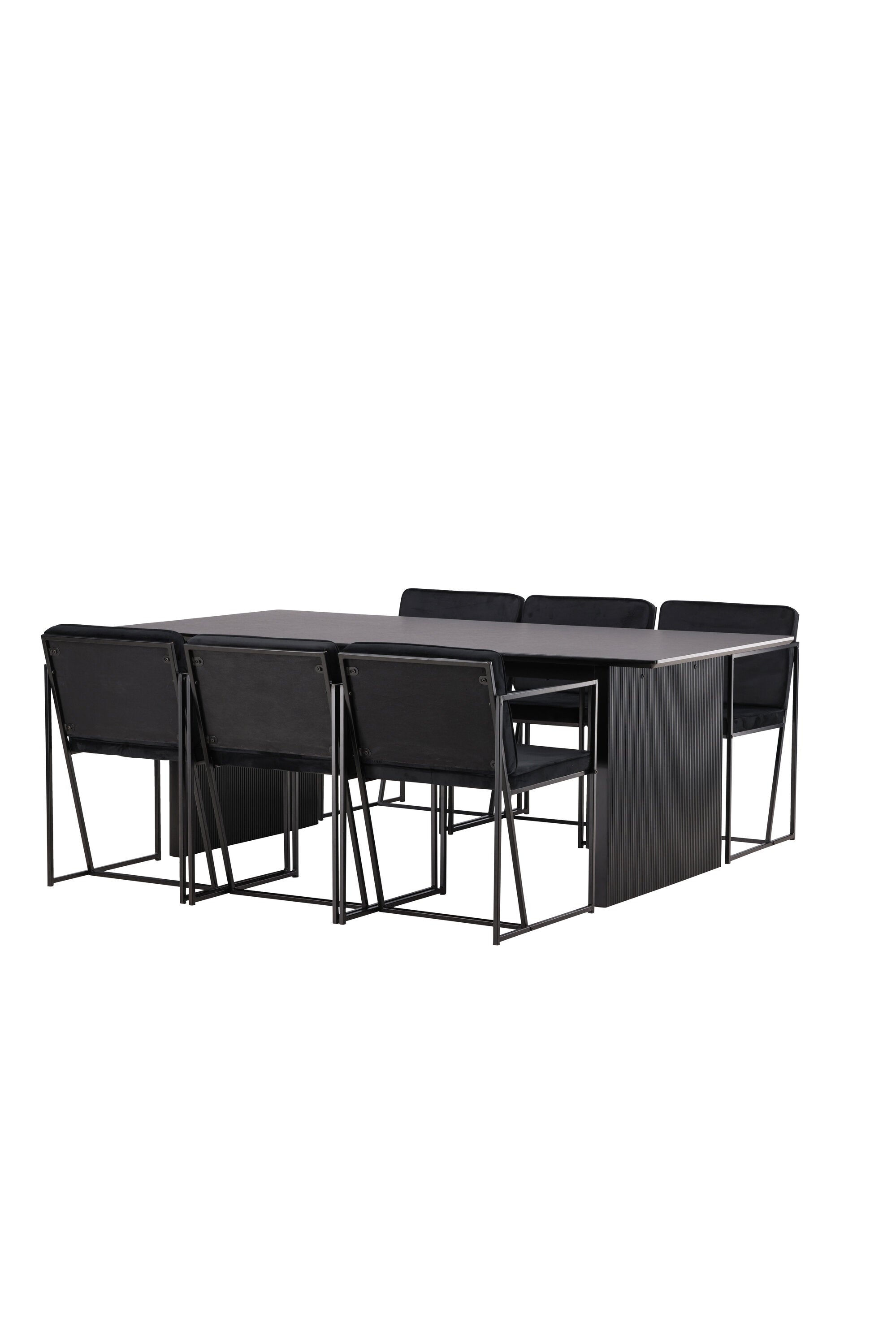 Odpovídající jídelní skupina, která zapůsobí - luxusní, pohodlná a stylová! Náš obdélníkový jídelní stůl ze série Vail má rovné severské tvary a je vyroben z odolné MDF v ušpiněné černé barvě. Deska stolu je tenká a balancuje na dvou pevných dřevěných deskách, které tvoří podvozek – stejně úhledné a odolné. Zde v nádherné kombinaci s našimi krásnými židlemi ze série Richmond. Židle má minimalistický rám z černé oceli a celočalouněný sedák z černé sametové látky. Opřete se a pohodlně se posaďte!