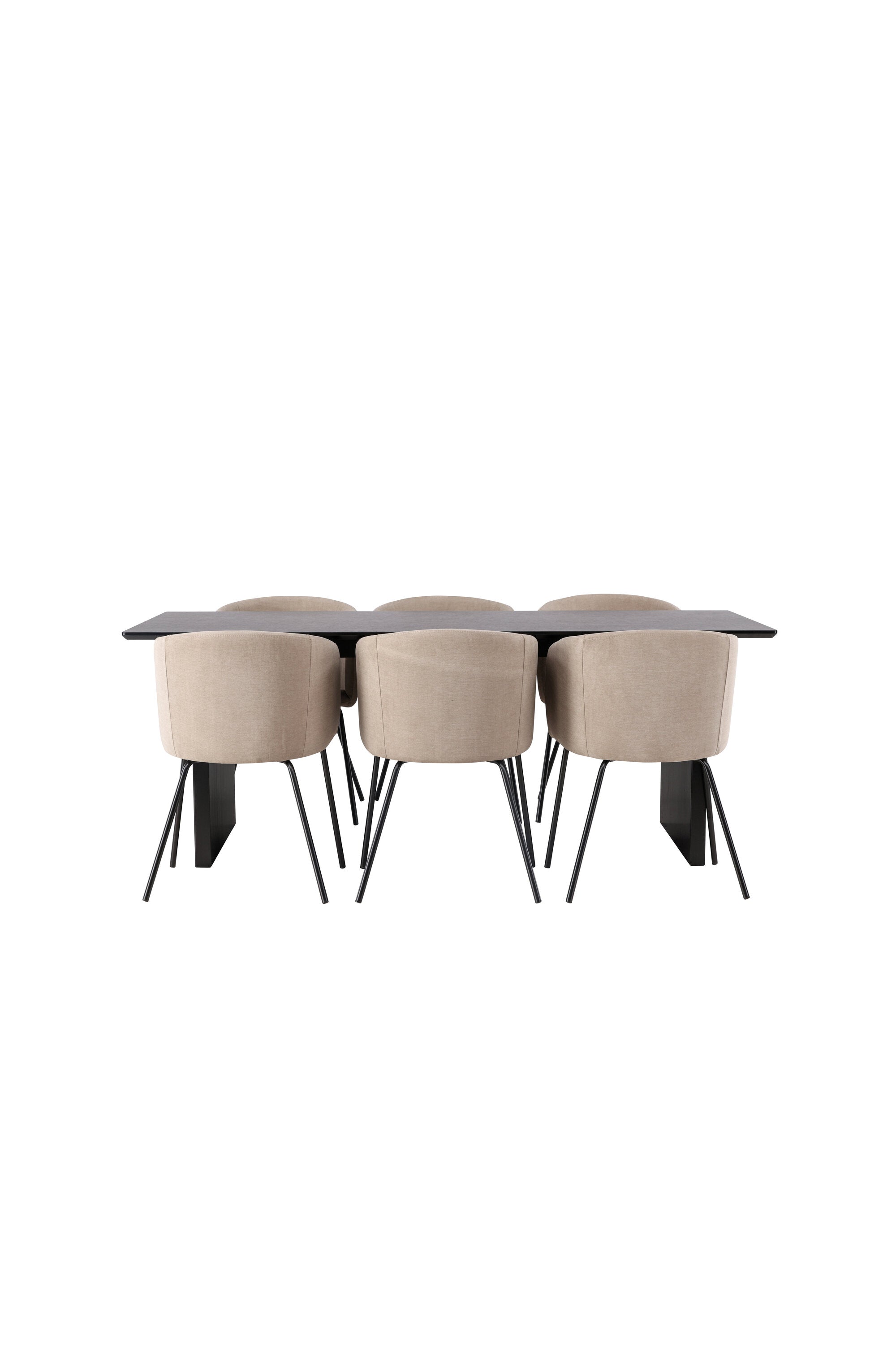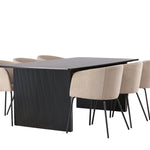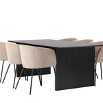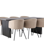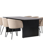 Fantastická jídelní skupina se všemi správnými funkcemi! Obdélníkový jídelní stůl Vail má rovné severské tvary a je vyroben z odolné MDF v ušpiněné černé barvě. Stolová deska je tenká v obdélníkovém designu a balancuje na dvou pevných dřevěných deskách, které tvoří základnu. Zde spolu s našimi pohodlnými jídelními židlemi Berit. Židle má celočalouněný design s mírně zaobleným opěradlem a sedákem z polyesterového lnu a úzkými nohami z černého železa. Zde získáte luxusní a zvoucí jídelní skupinu! Rozměry stolu: 200x100cm.