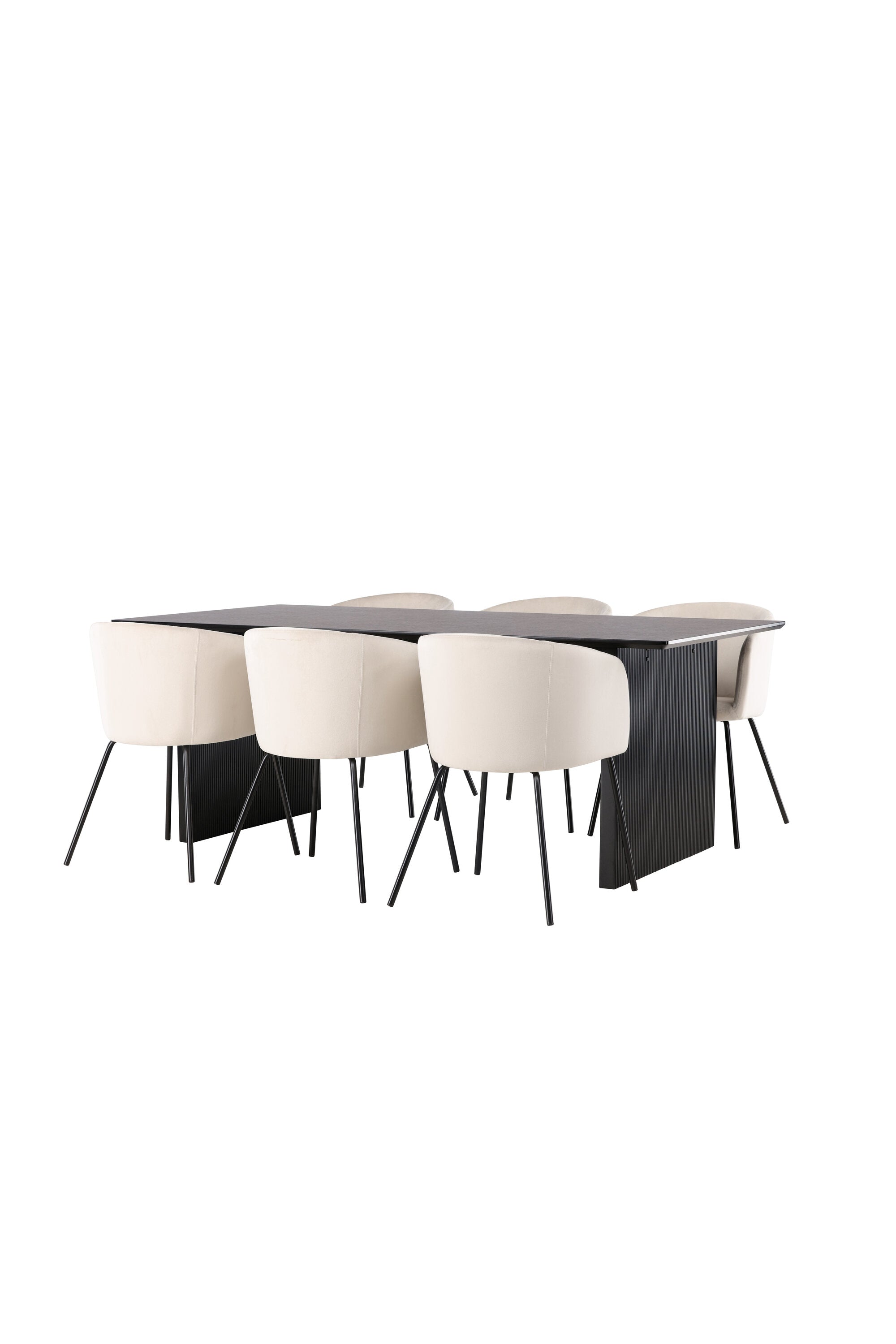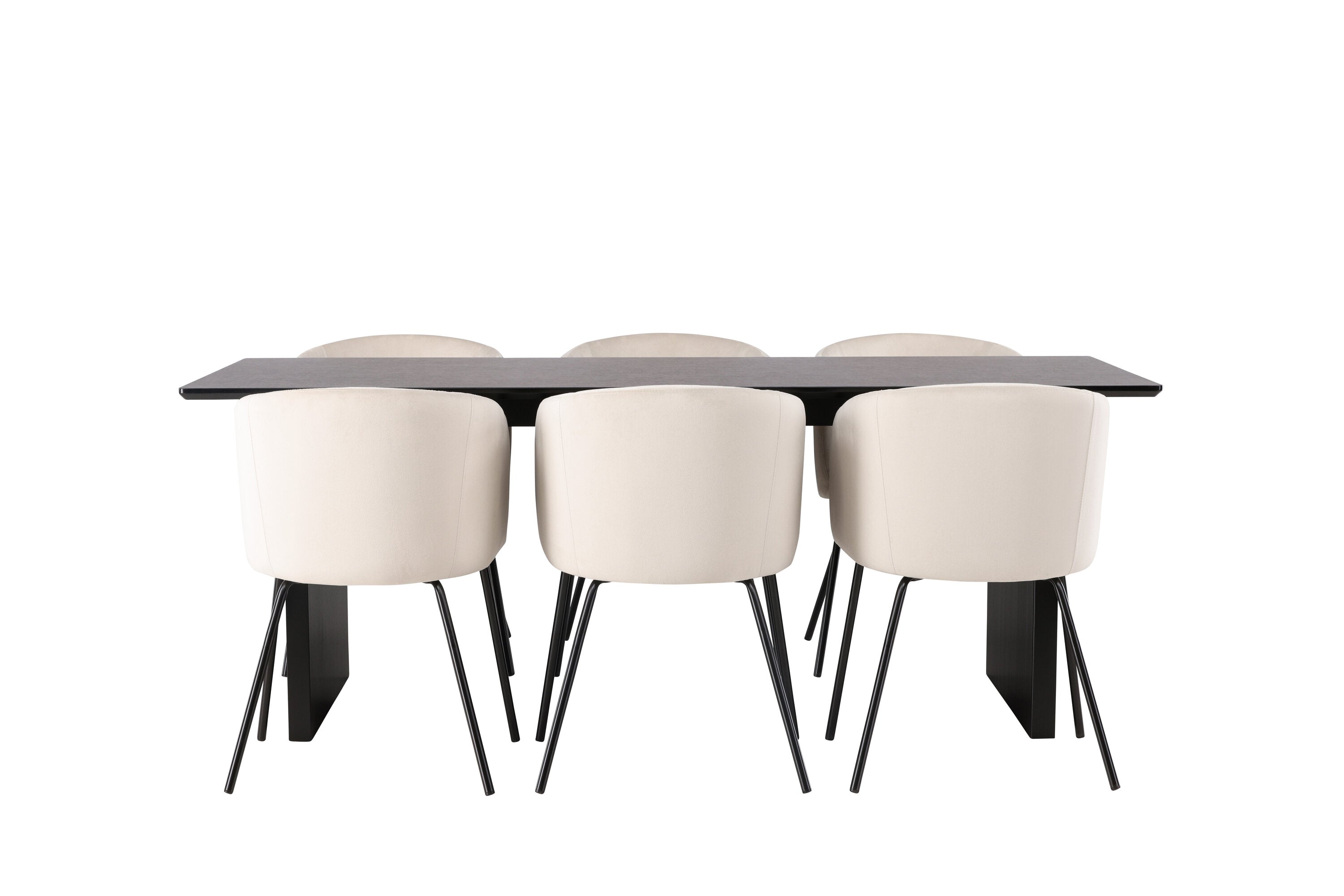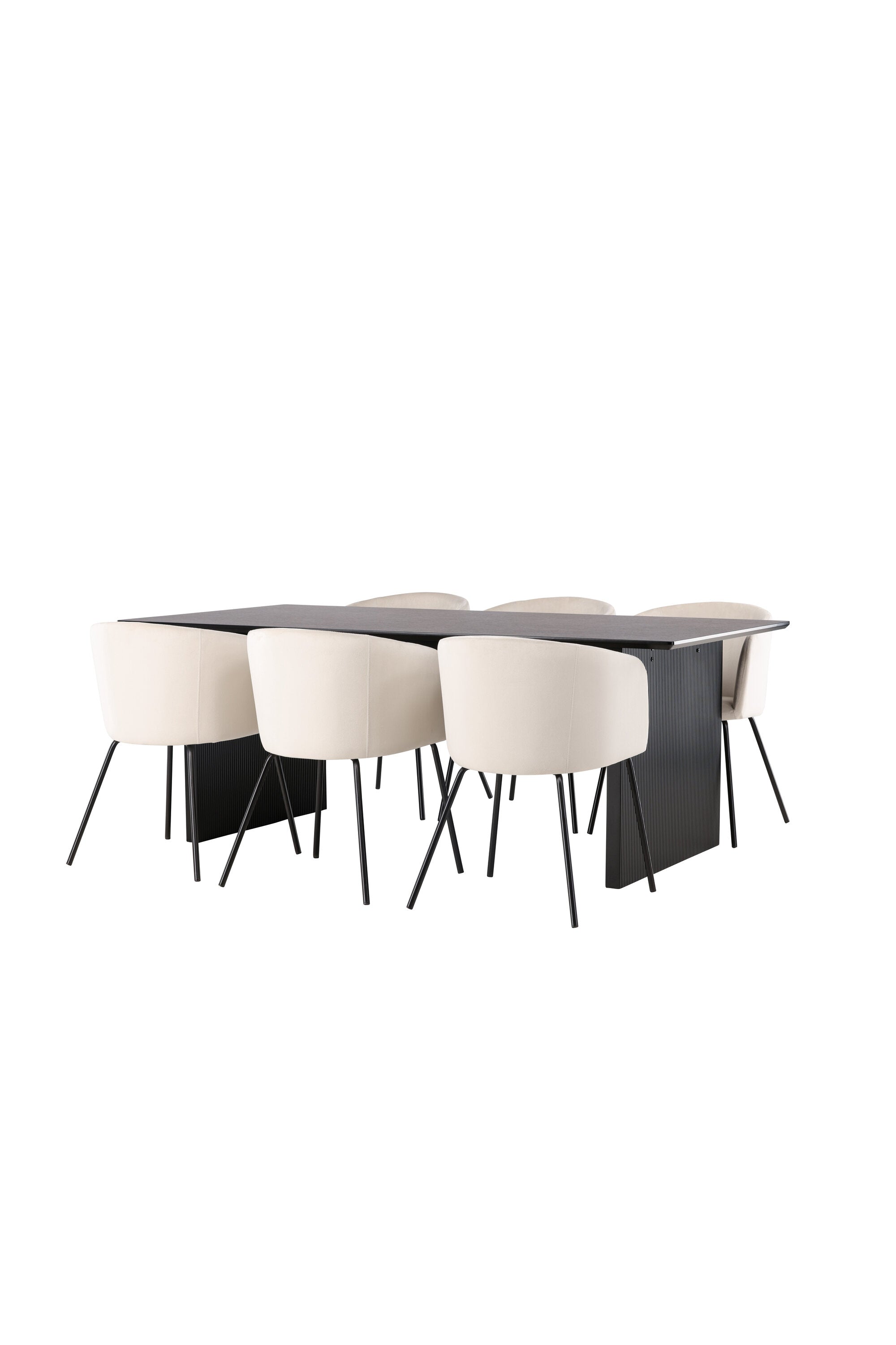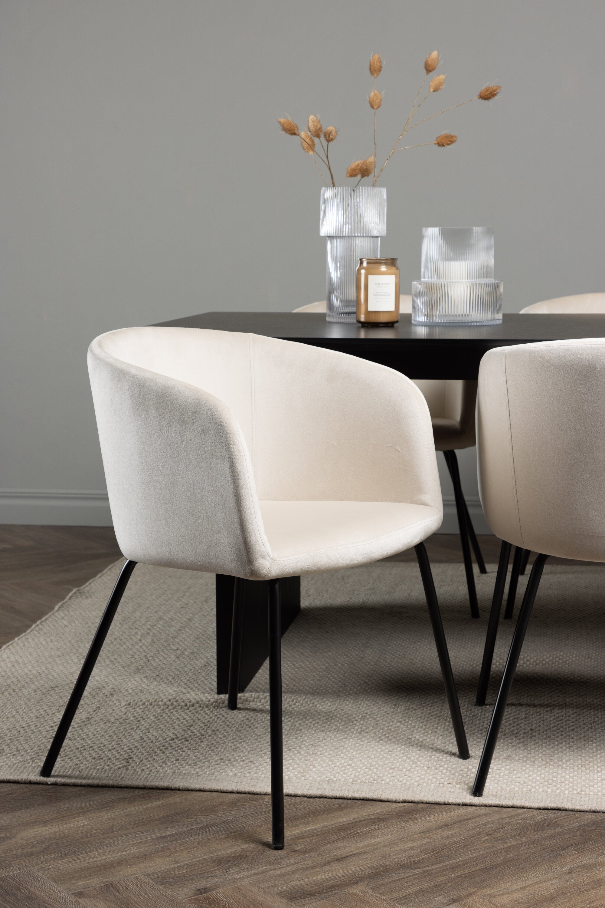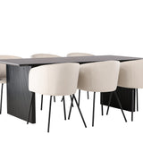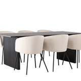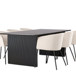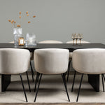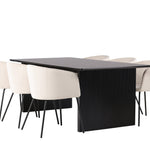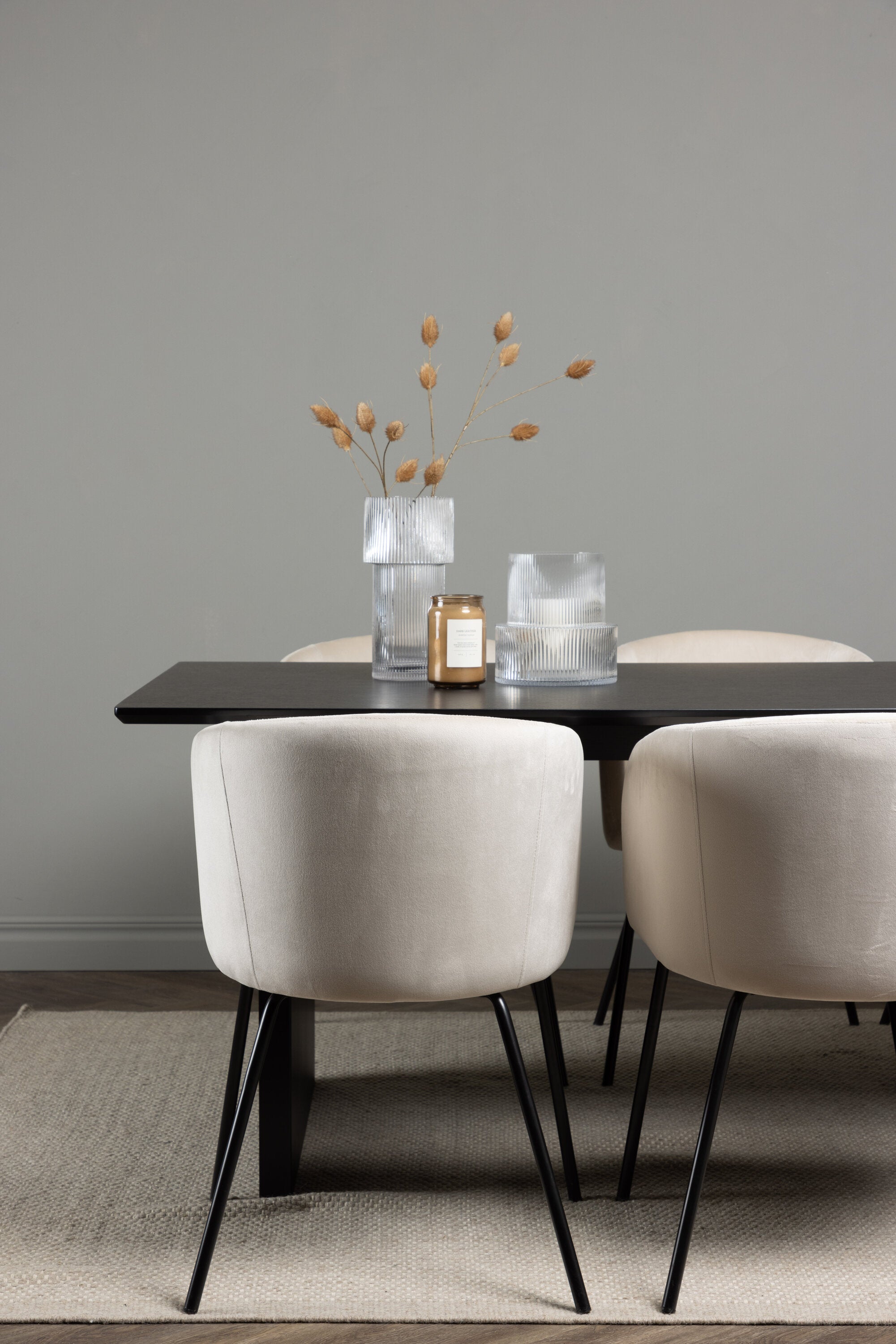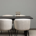 Neuvěřitelně velká jídelní skupina! Obdélníkový jídelní stůl Vail má rovné severské tvary a je vyroben z odolné MDF v ušpiněné černé barvě. Stolová deska je tenká v obdélníkovém designu a balancuje na dvou pevných dřevěných deskách, které tvoří základnu. Zde spolu s našimi nádhernými jídelními židlemi Berit. Židle má celočalouněný design s mírně zaobleným opěradlem a sedákem ze sametové látky a úzkými nohami z černého železa. Vyzdobte si obývací pokoj luxusním jídelním setem! Rozměry stolu: 200x100cm.