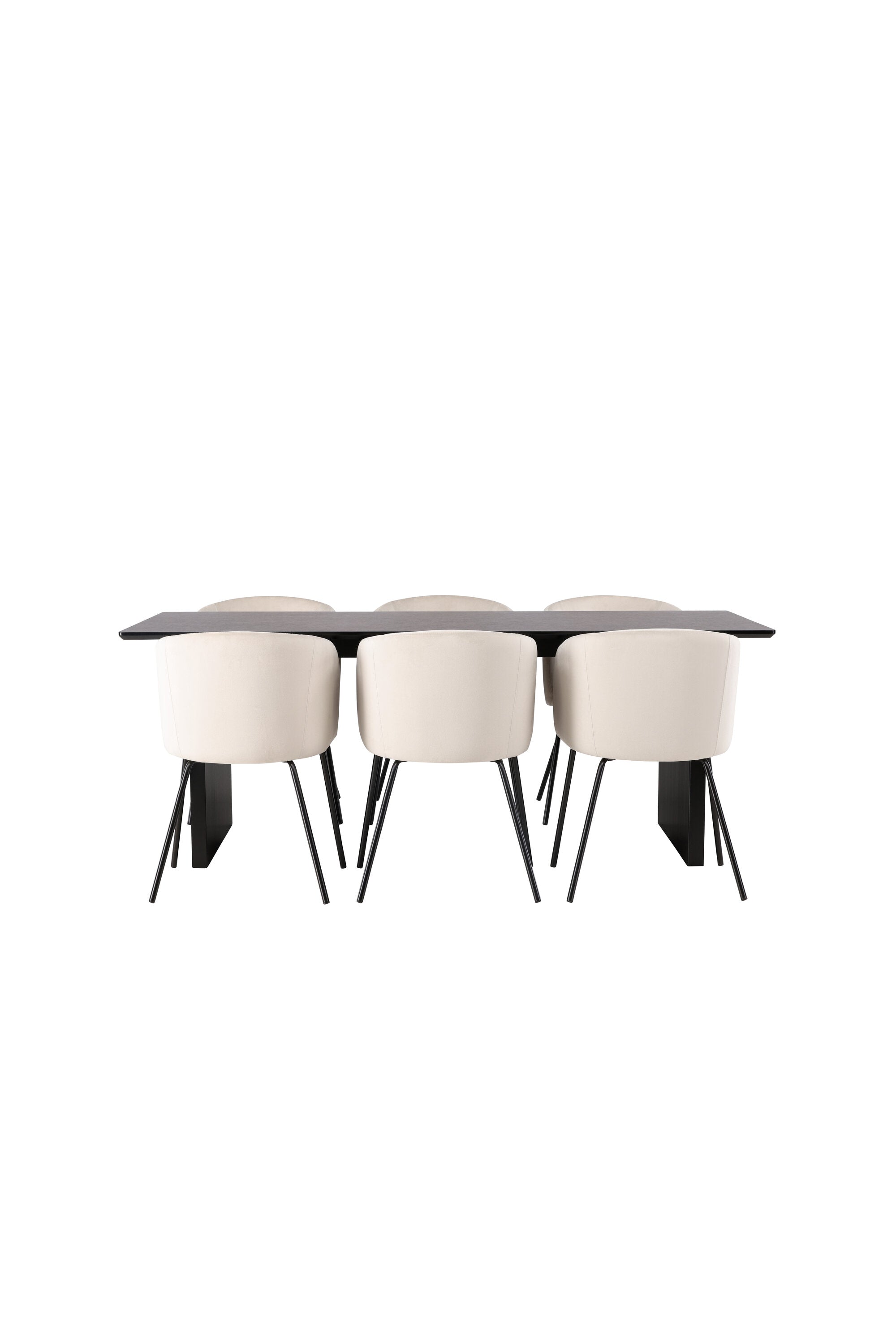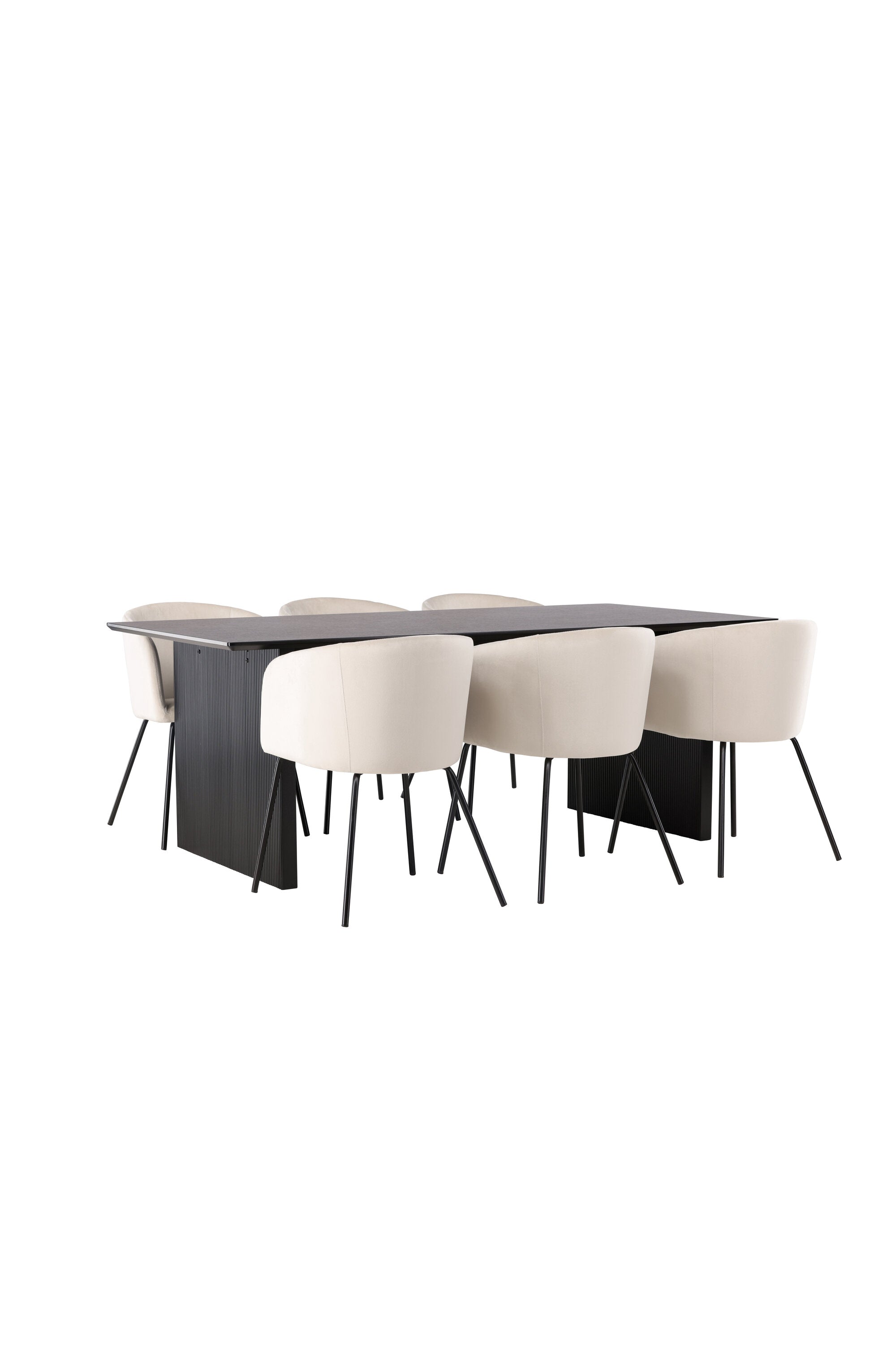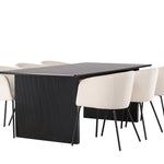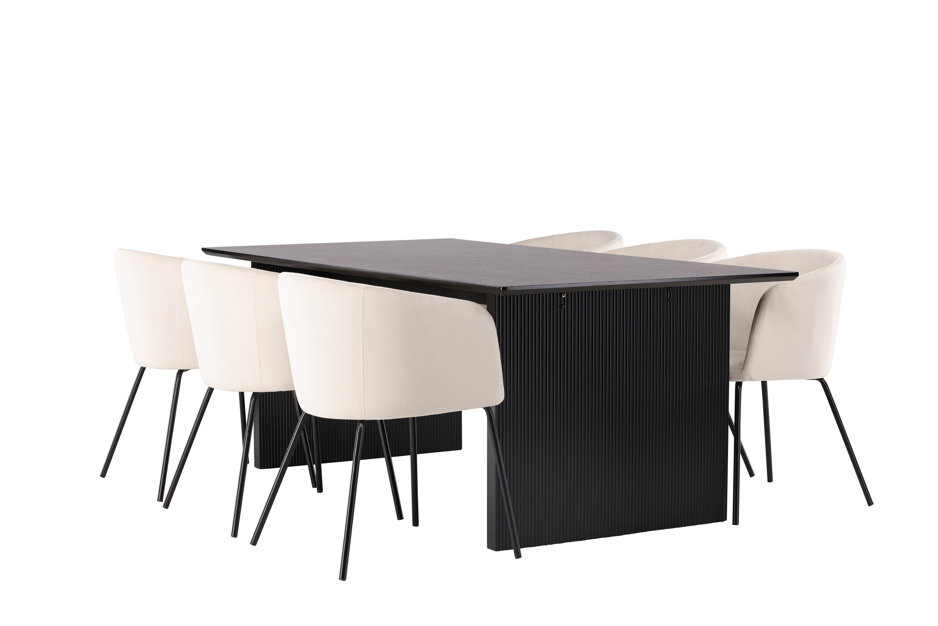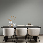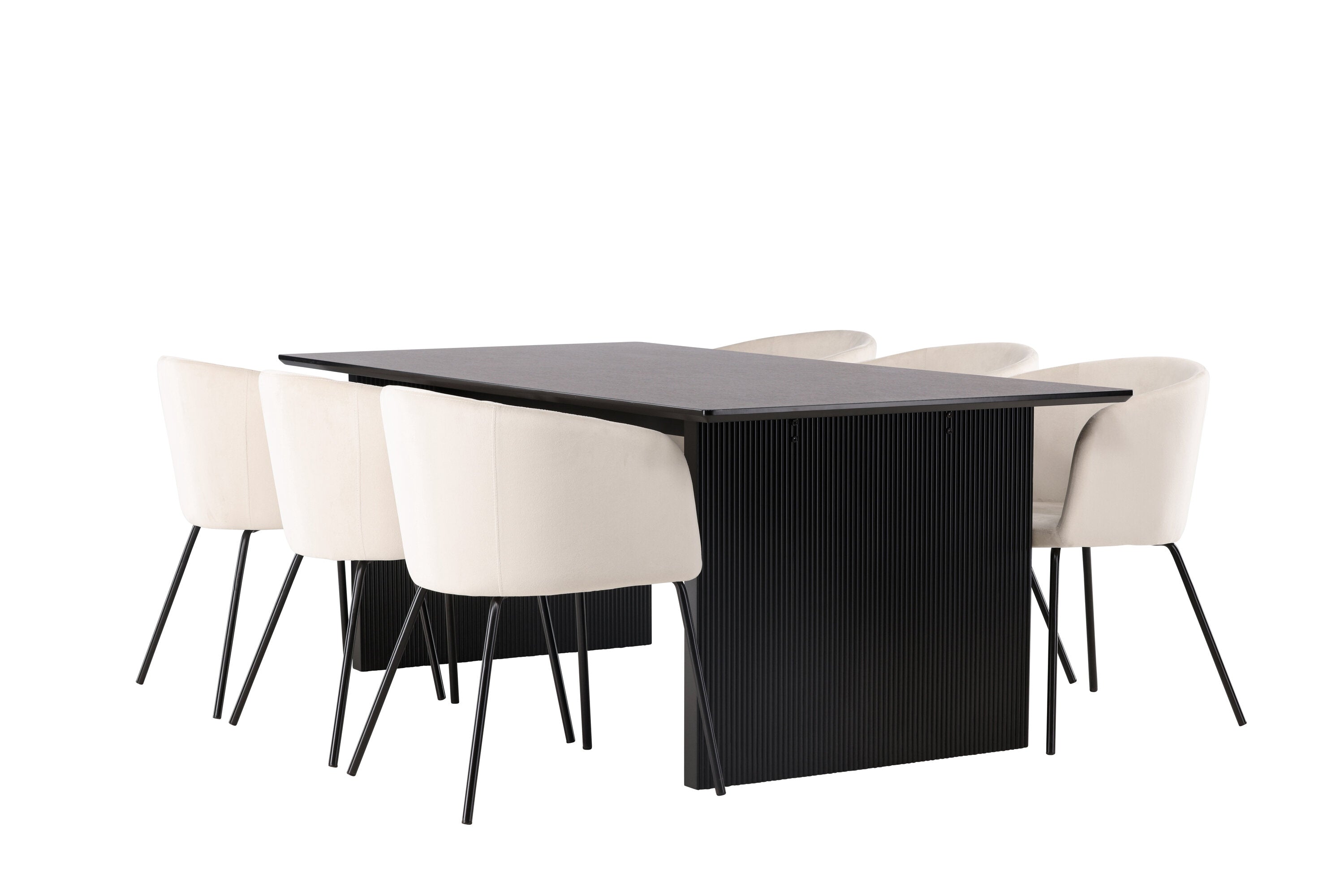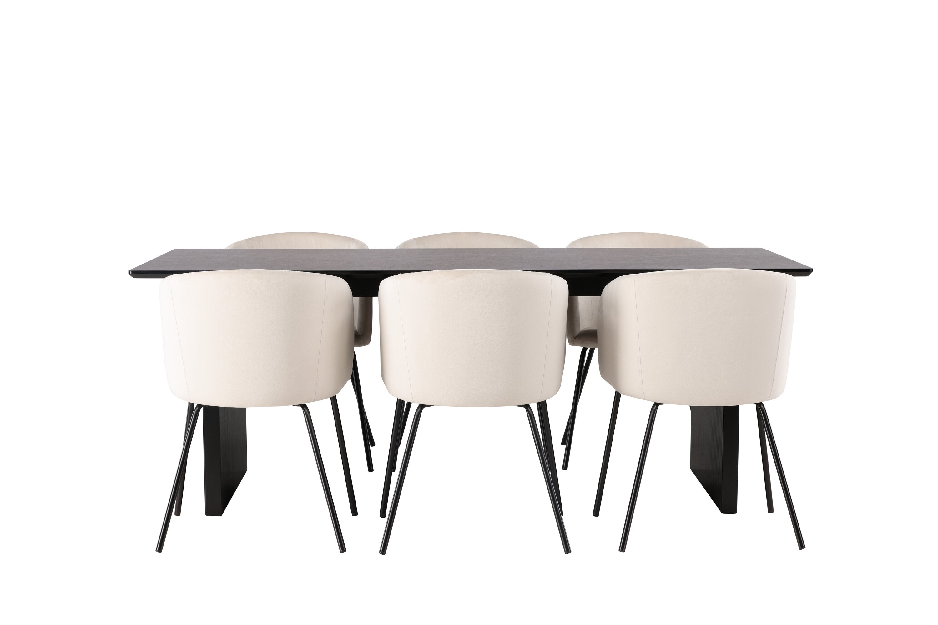Neuvěřitelně velká jídelní skupina! Obdélníkový jídelní stůl Vail má rovné severské tvary a je vyroben z odolné MDF v ušpiněné černé barvě. Stolová deska je tenká v obdélníkovém designu a balancuje na dvou pevných dřevěných deskách, které tvoří základnu. Zde spolu s našimi nádhernými jídelními židlemi Berit. Židle má celočalouněný design s mírně zaobleným opěradlem a sedákem ze sametové látky a úzkými nohami z černého železa. Vyzdobte si obývací pokoj luxusním jídelním setem! Rozměry stolu: 200x100cm.