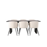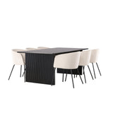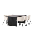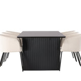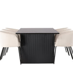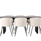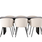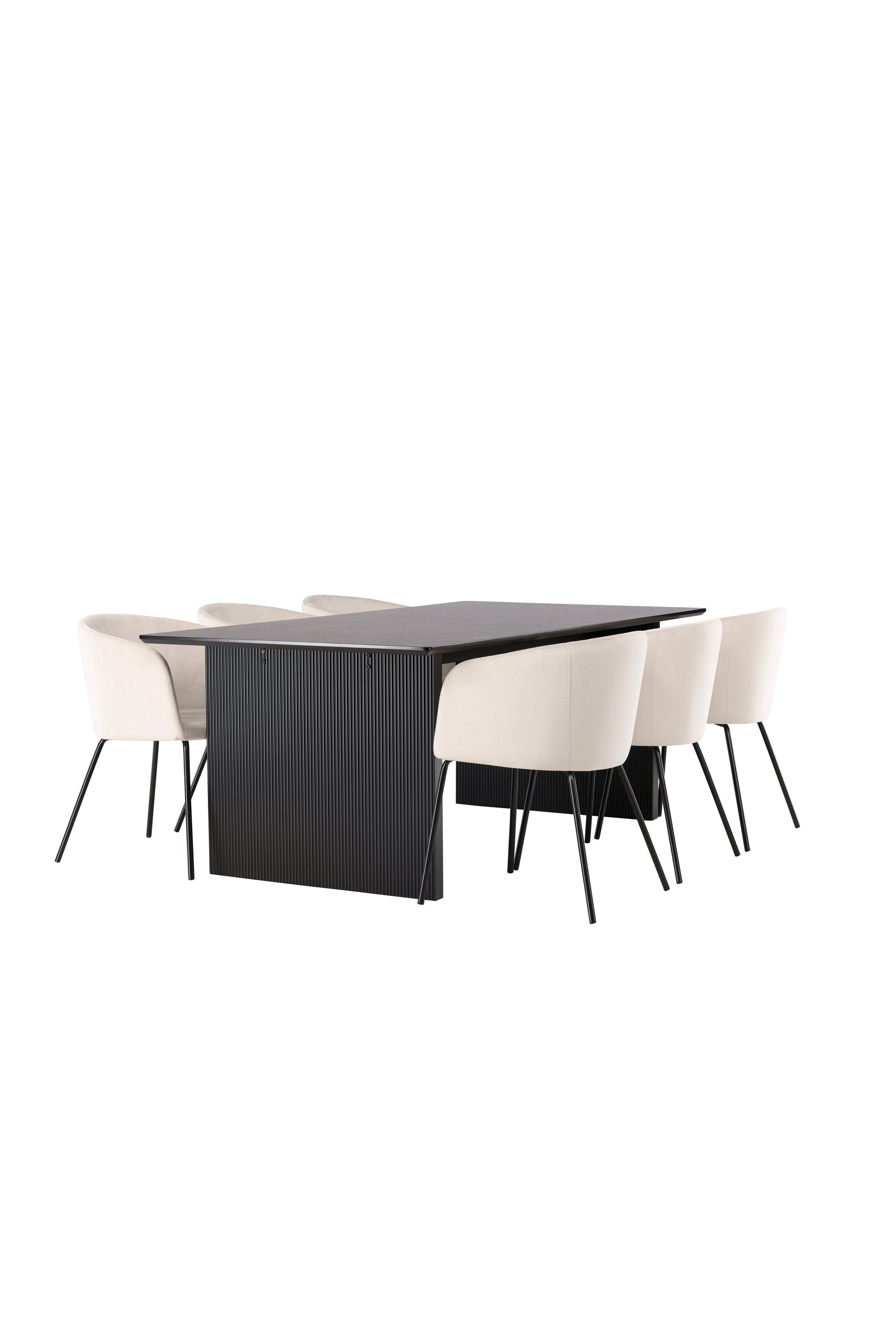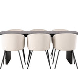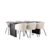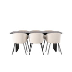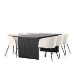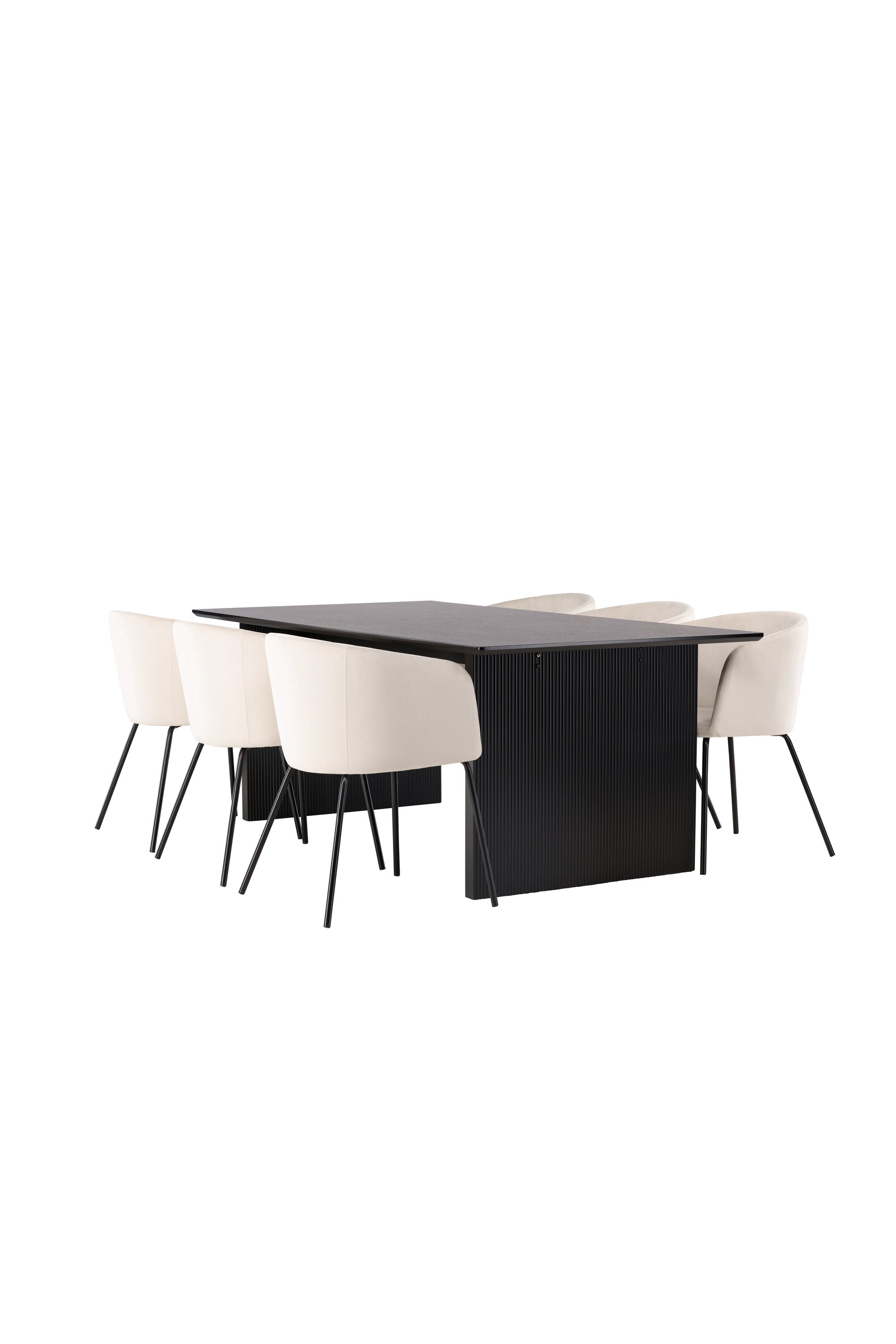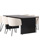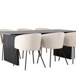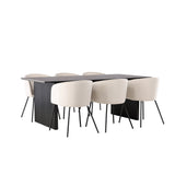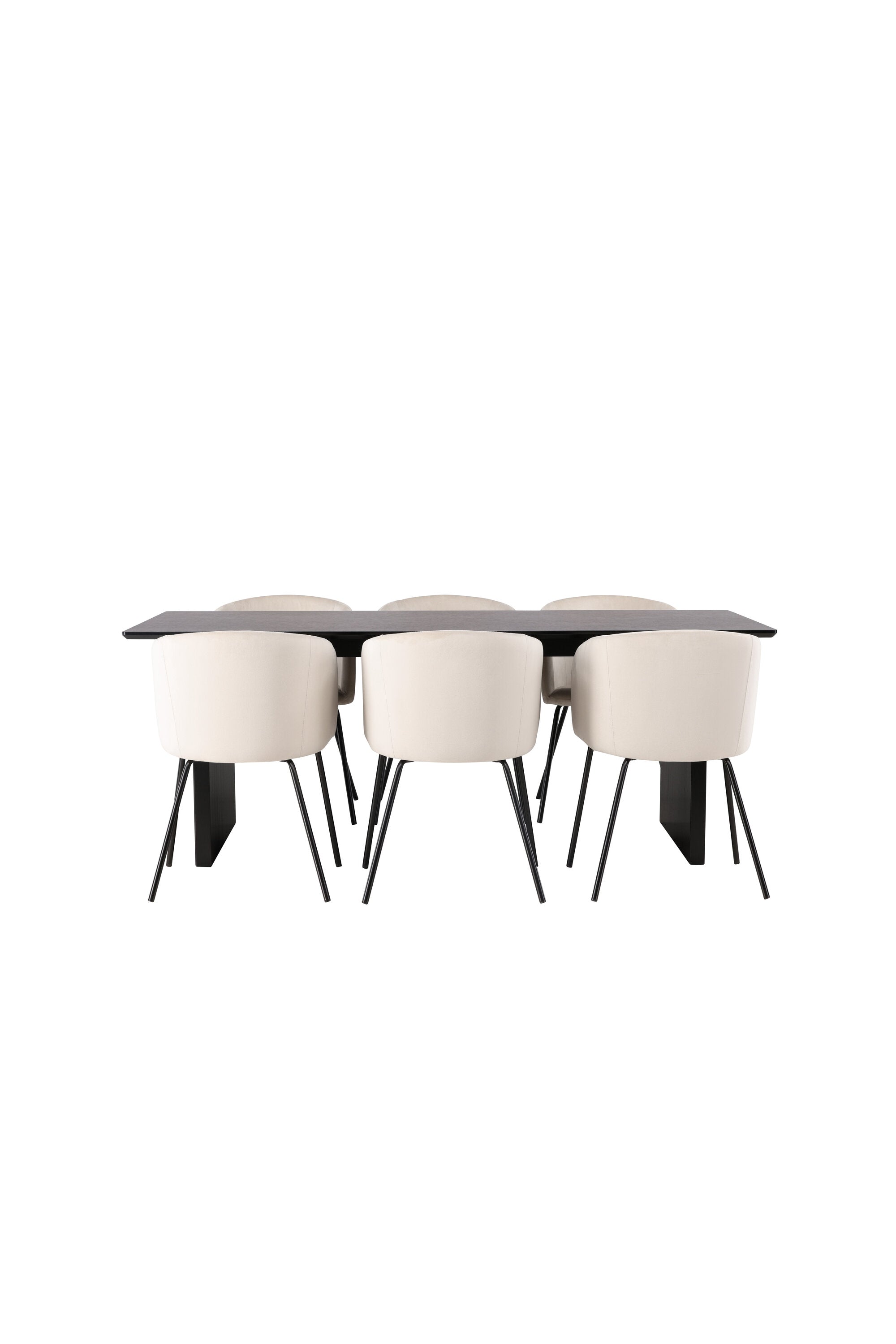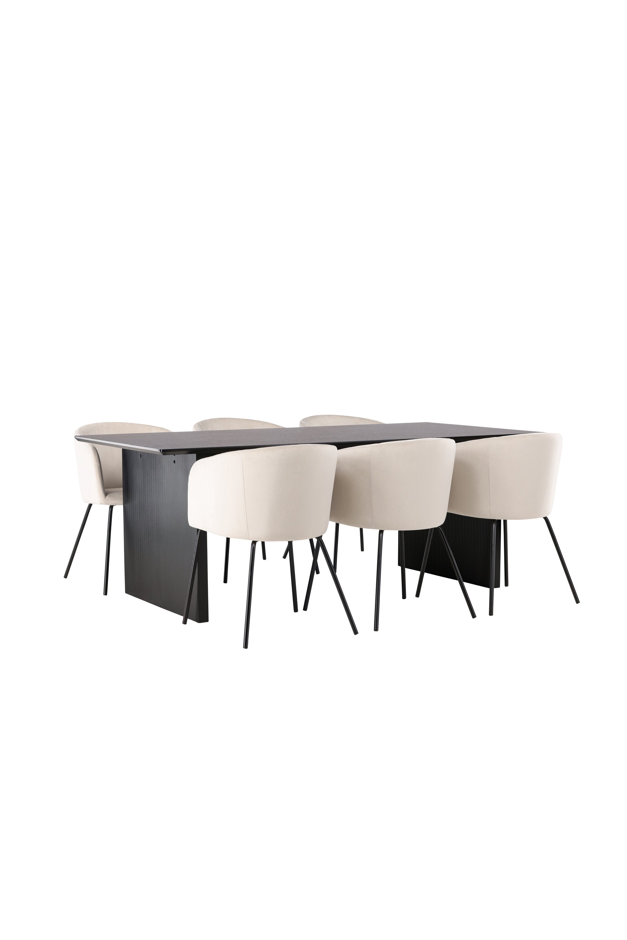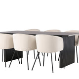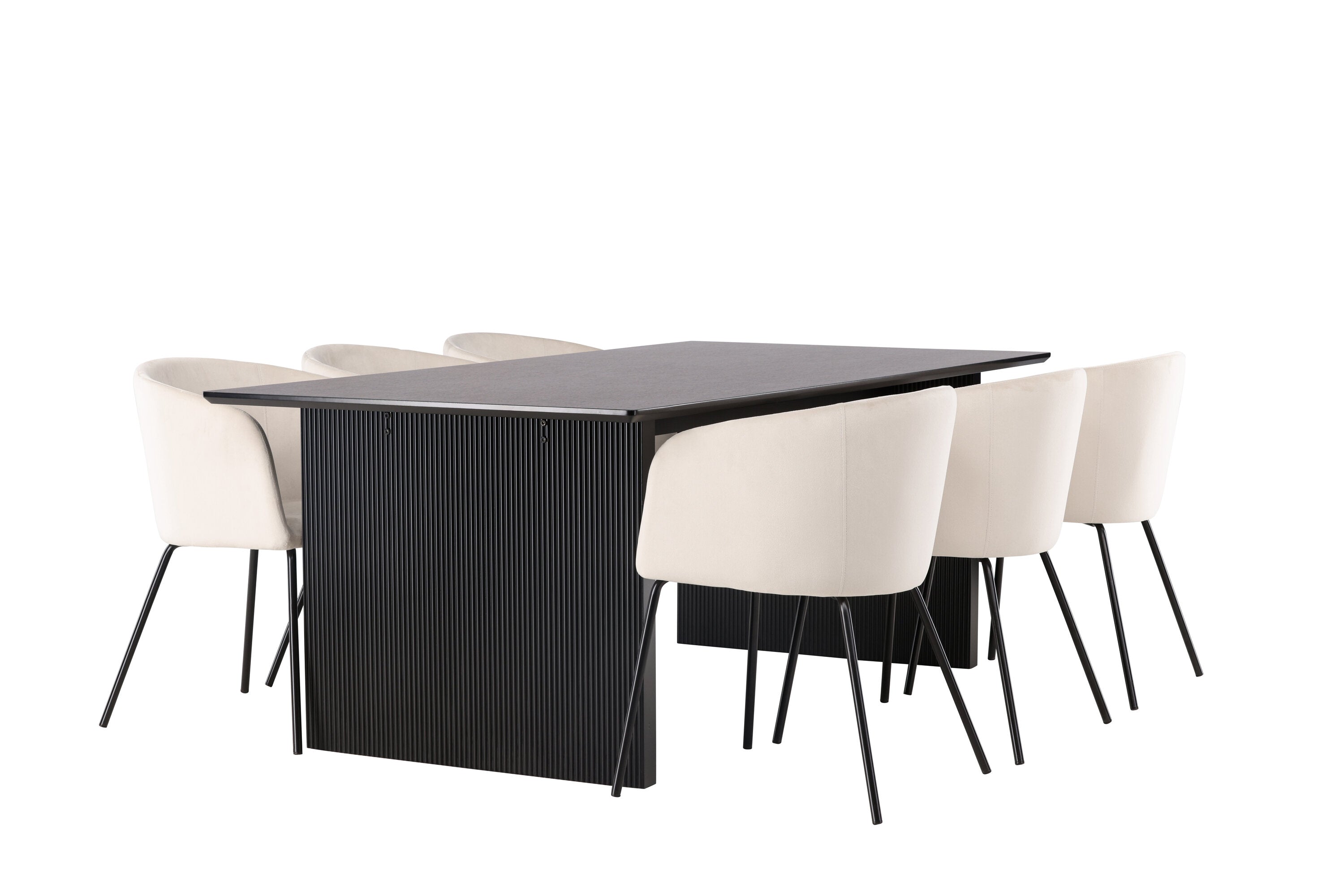 Neuvěřitelně velká jídelní skupina! Obdélníkový jídelní stůl Vail má rovné severské tvary a je vyroben z odolné MDF v ušpiněné černé barvě. Stolová deska je tenká v obdélníkovém designu a balancuje na dvou pevných dřevěných deskách, které tvoří základnu. Zde spolu s našimi nádhernými jídelními židlemi Berit. Židle má celočalouněný design s mírně zaobleným opěradlem a sedákem ze sametové látky a úzkými nohami z černého železa. Vyzdobte si obývací pokoj luxusním jídelním setem! Rozměry stolu: 200x100cm.