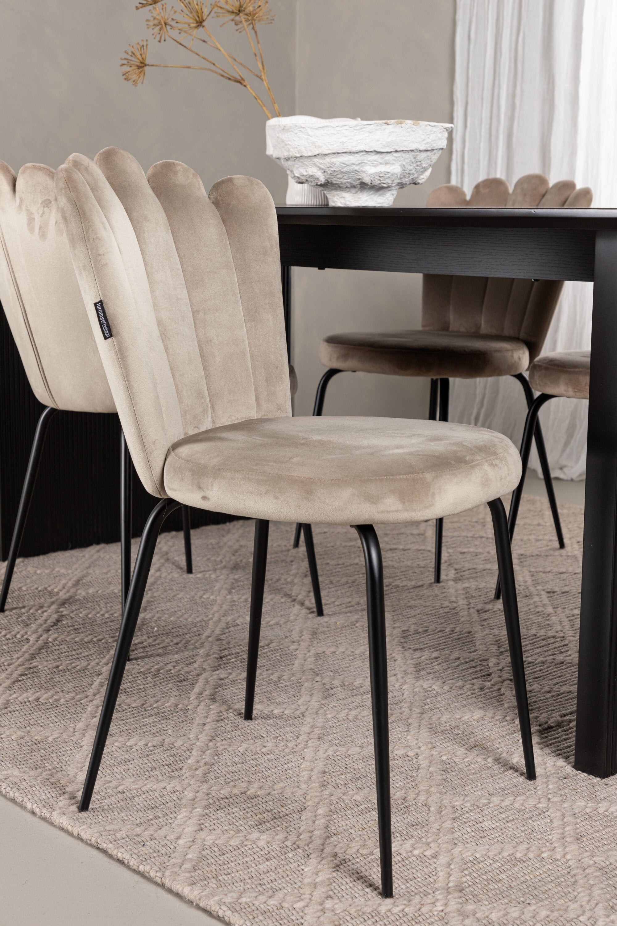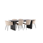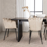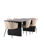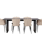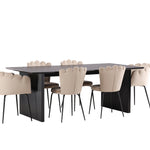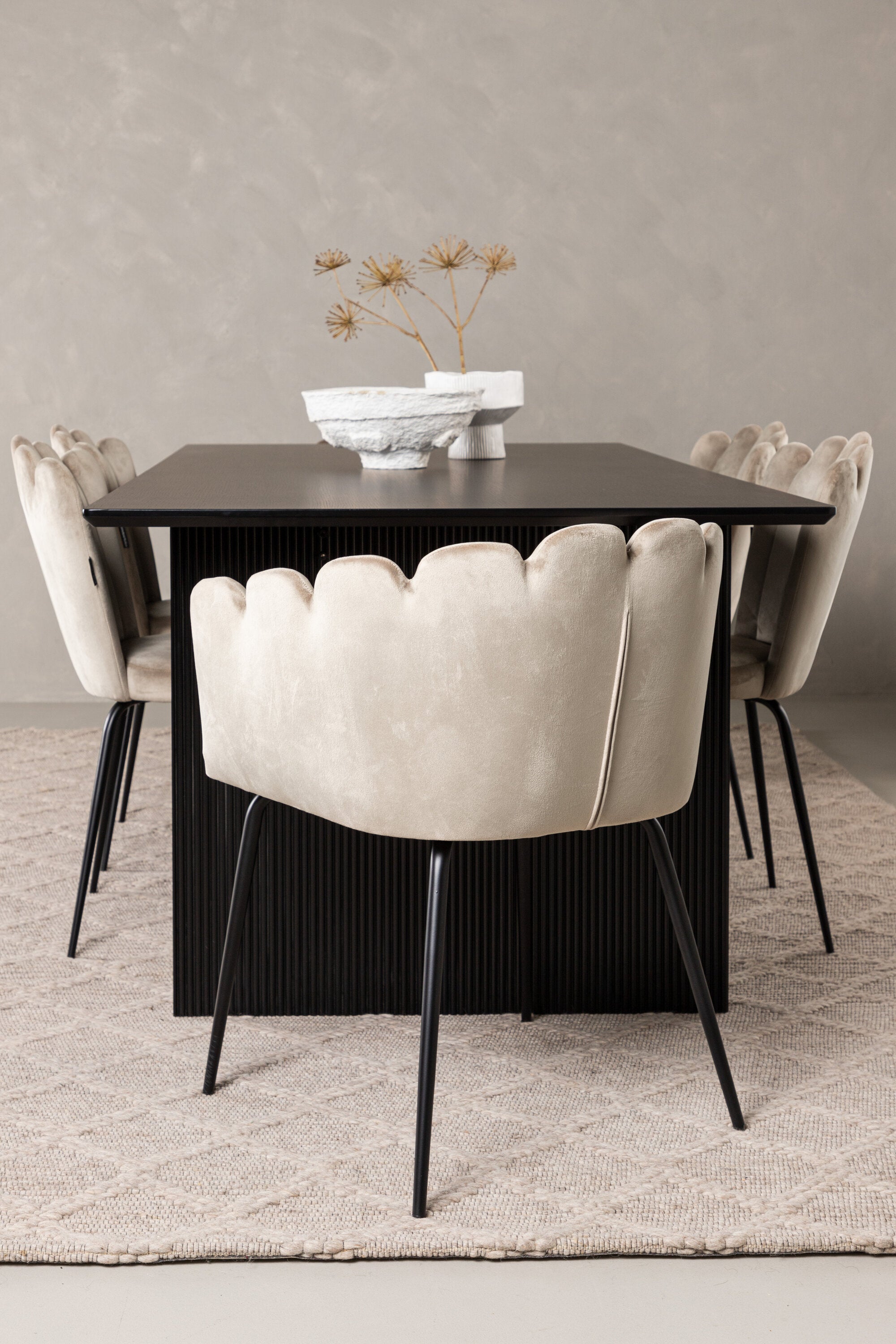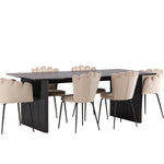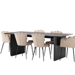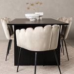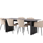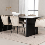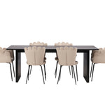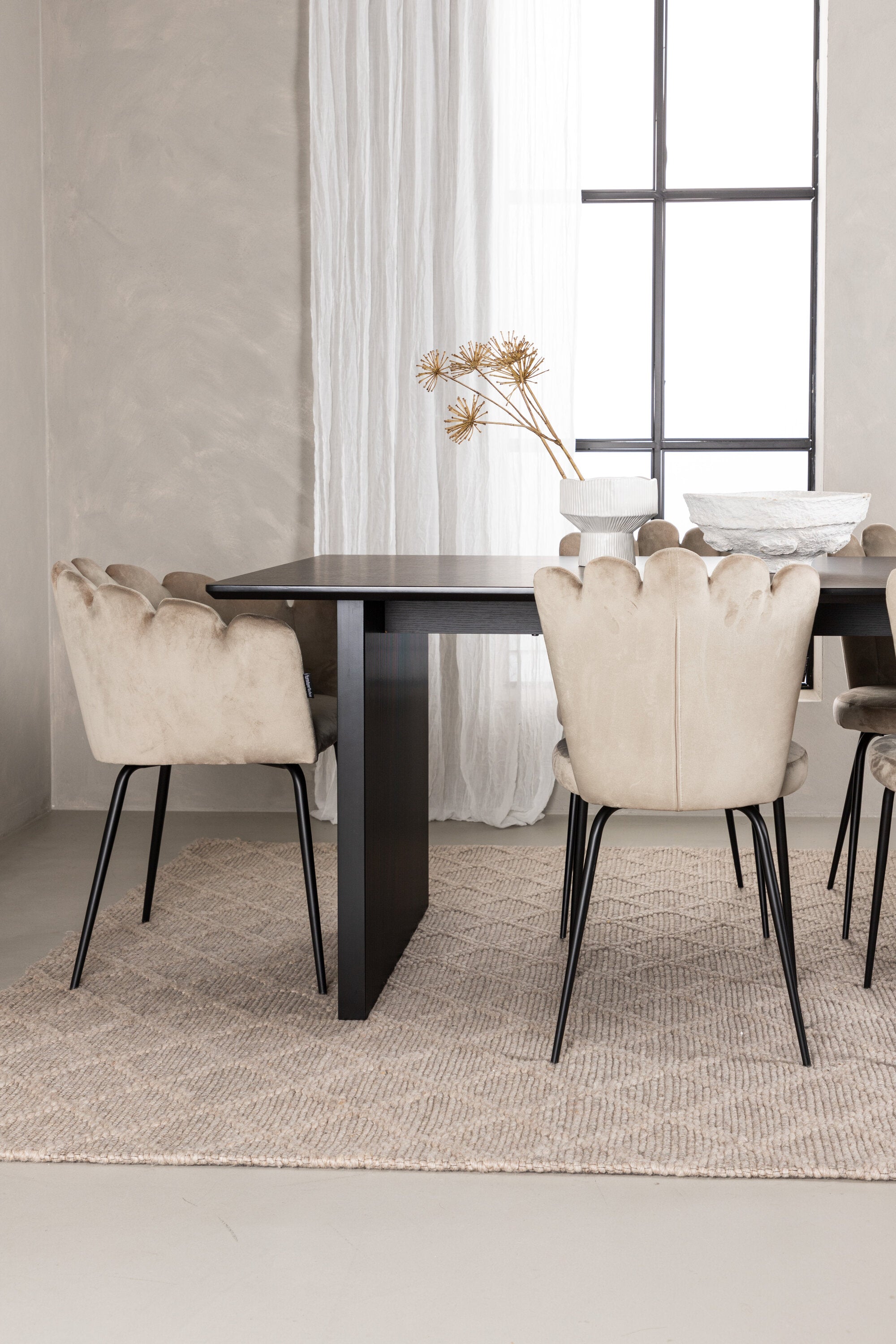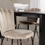 Zařiďte srdce svého domova půvabně a lákavě! Náš obdélníkový jídelní stůl ze série Vail má rovné severské tvary a je vyroben z odolné MDF v ušpiněné černé barvě. Deska stolu je tenká a balancuje na dvou pevných dřevěných deskách, které tvoří podvozek – stejně úhledné a odolné. Zde společně s jídelními židlemi ze série Limhamn v luxusní béžové barvě. Židle je moderním favoritem mnoha domácností se svým lákavým designem, ozdobným opěradlem ve tvaru mušle s ozdobným prošíváním a kulatým sedákem z vkusné béžové sametové látky. Nohy jsou z kovu s černou práškovou barvou. Pohodlně se usaďte a užívejte si!