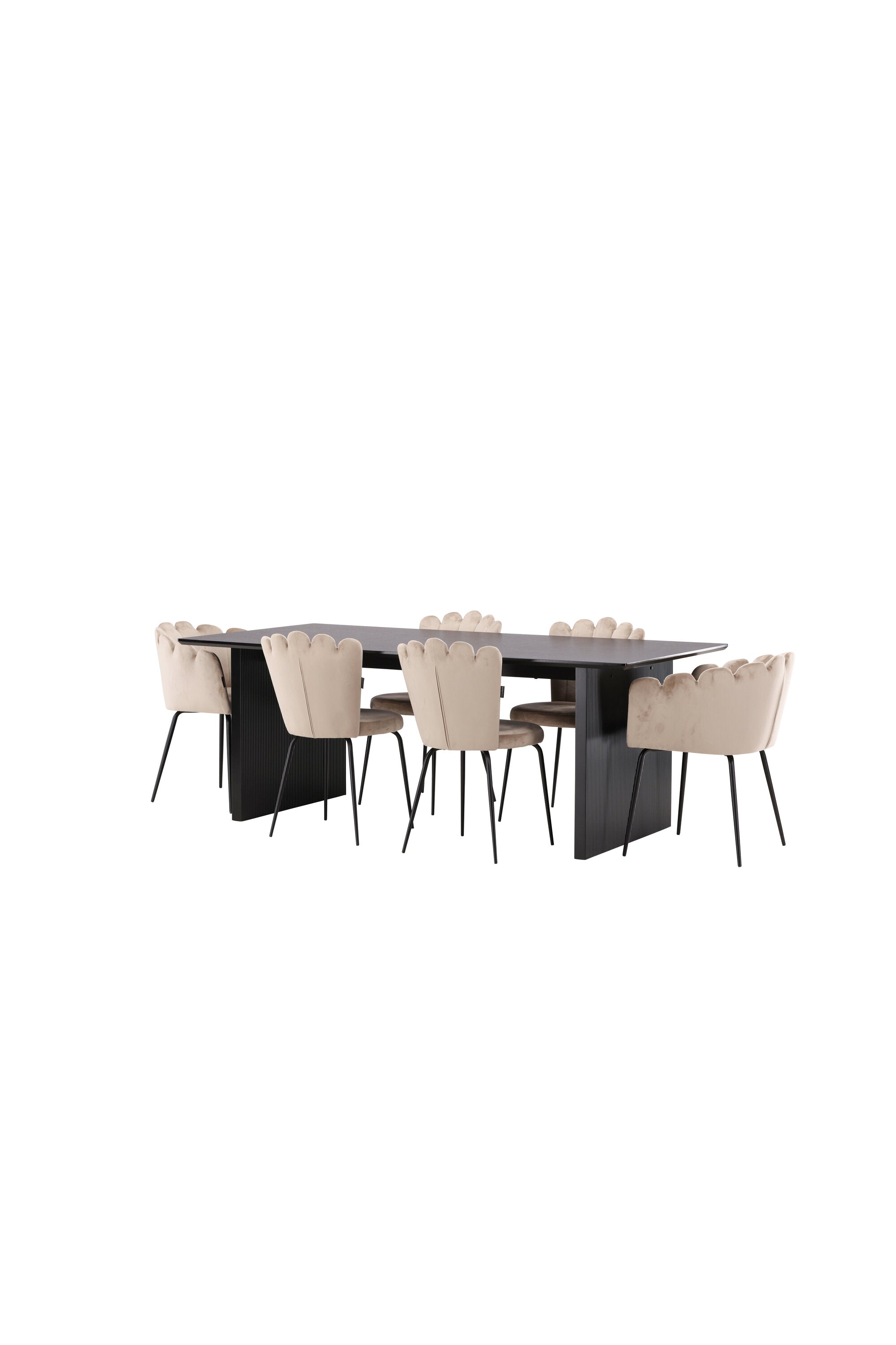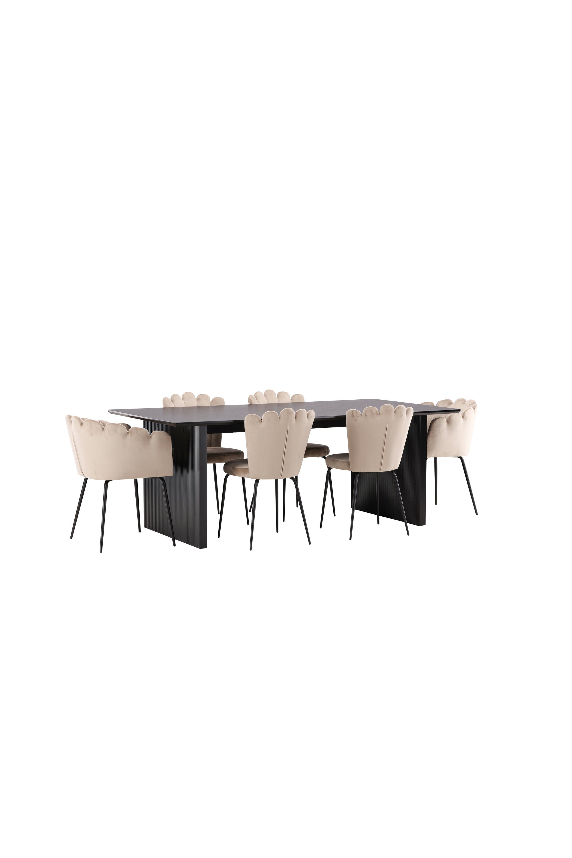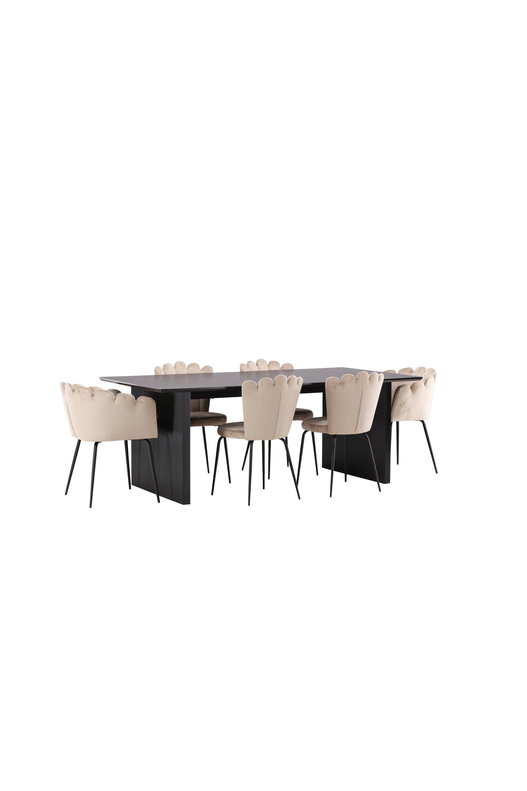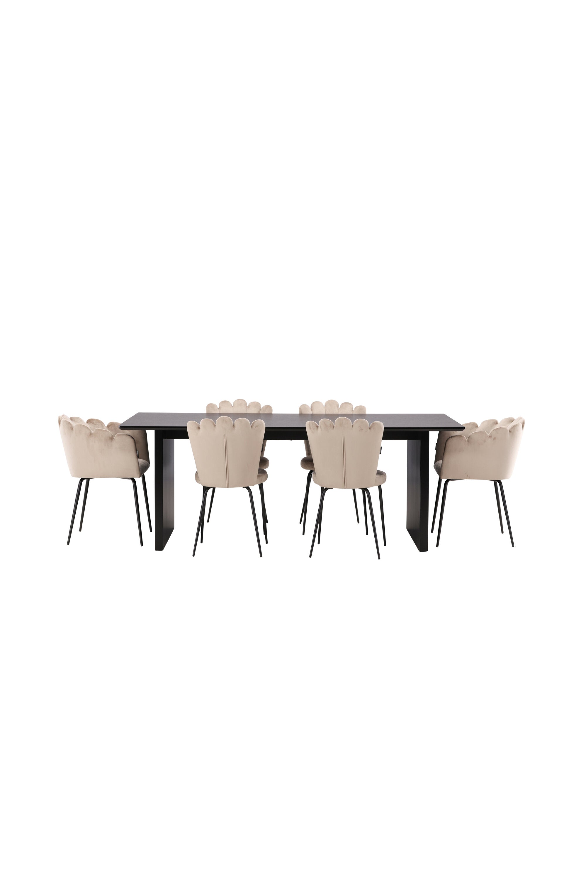 Zařiďte srdce svého domova půvabně a lákavě! Náš obdélníkový jídelní stůl ze série Vail má rovné severské tvary a je vyroben z odolné MDF v ušpiněné černé barvě. Deska stolu je tenká a balancuje na dvou pevných dřevěných deskách, které tvoří podvozek – stejně úhledné a odolné. Zde společně s jídelními židlemi ze série Limhamn v luxusní béžové barvě. Židle je moderním favoritem mnoha domácností se svým lákavým designem, ozdobným opěradlem ve tvaru mušle s ozdobným prošíváním a kulatým sedákem z vkusné béžové sametové látky. Nohy jsou z kovu s černou práškovou barvou. Pohodlně se usaďte a užívejte si!
