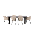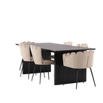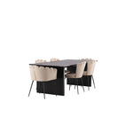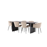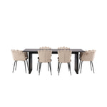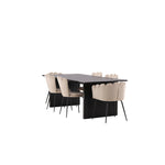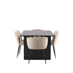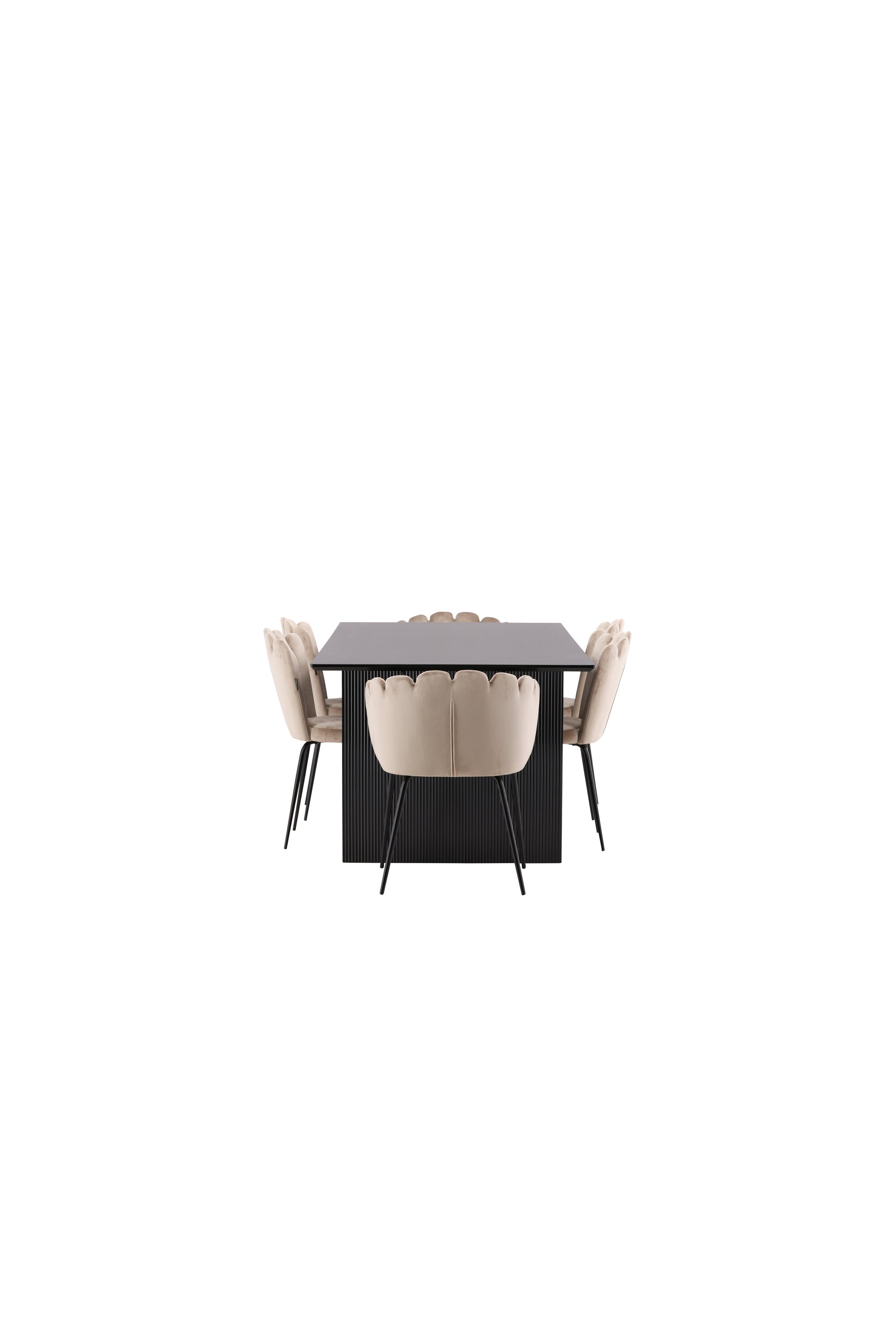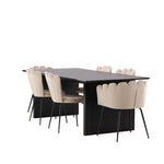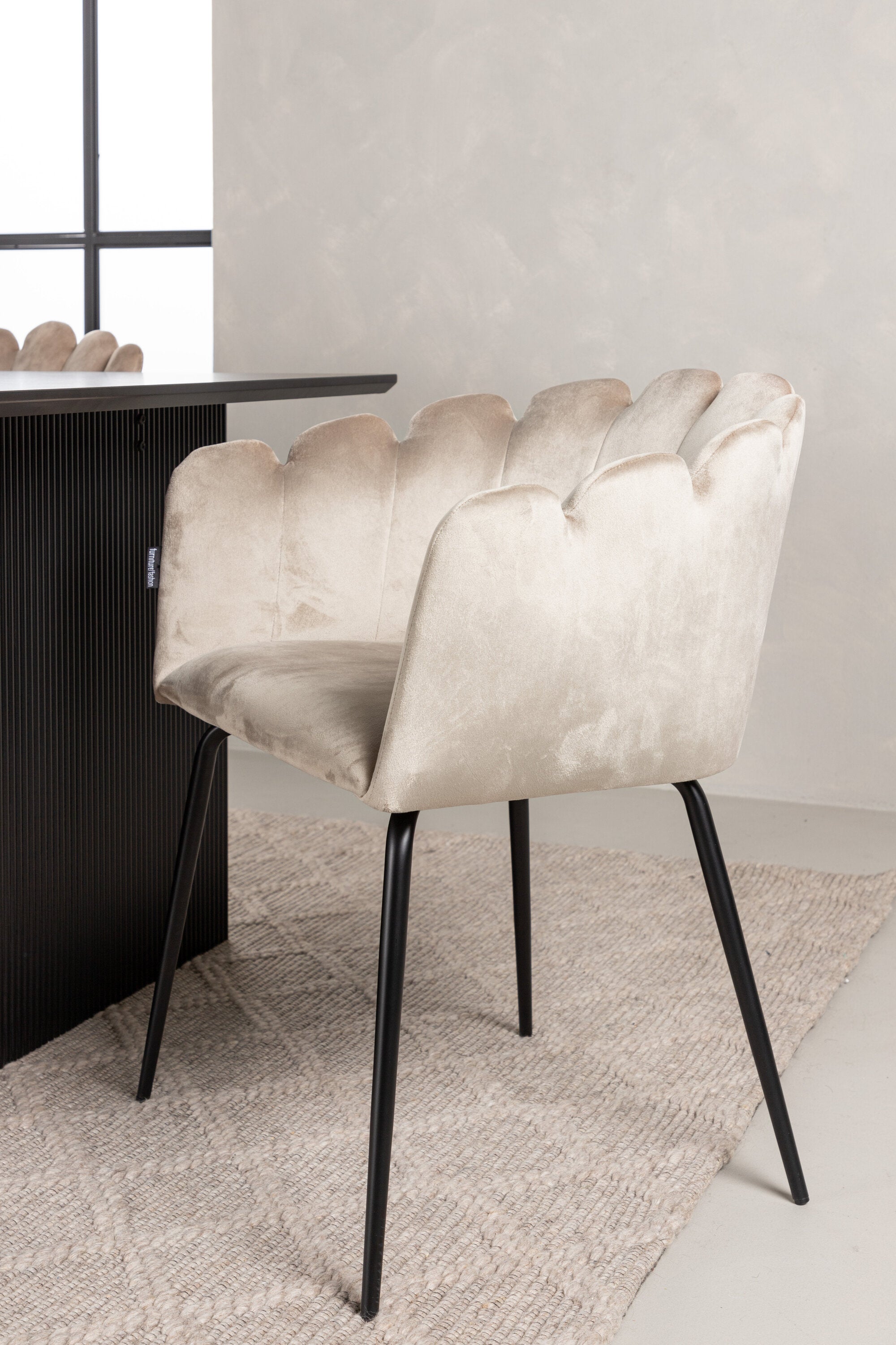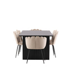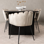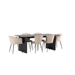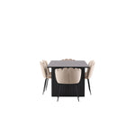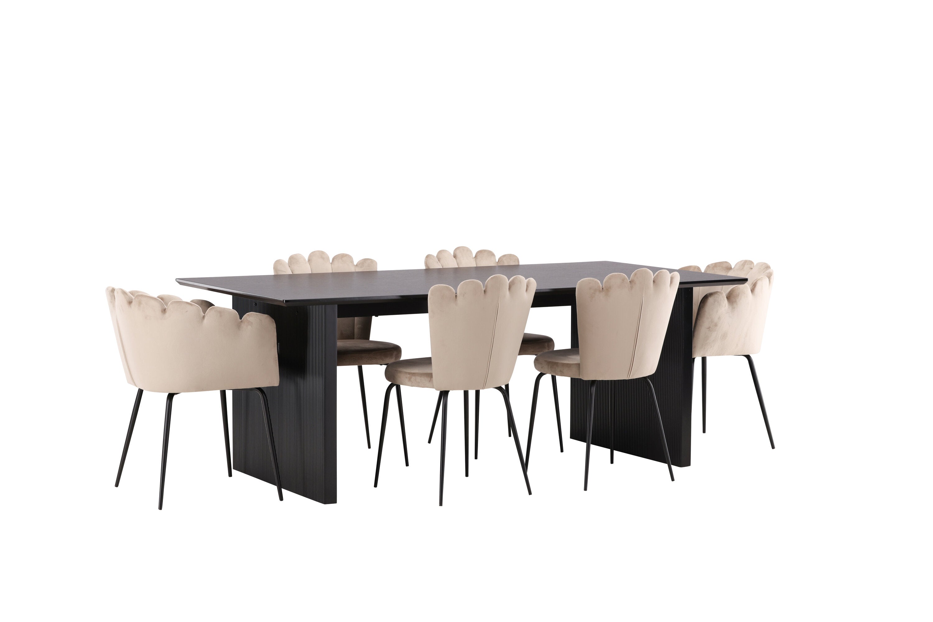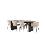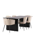 Zařiďte srdce svého domova půvabně a lákavě! Náš obdélníkový jídelní stůl ze série Vail má rovné severské tvary a je vyroben z odolné MDF v ušpiněné černé barvě. Deska stolu je tenká a balancuje na dvou pevných dřevěných deskách, které tvoří podvozek – stejně úhledné a odolné. Zde společně s jídelními židlemi ze série Limhamn v luxusní béžové barvě. Židle je moderním favoritem mnoha domácností se svým lákavým designem, ozdobným opěradlem ve tvaru mušle s ozdobným prošíváním a kulatým sedákem z vkusné béžové sametové látky. Nohy jsou z kovu s černou práškovou barvou. Pohodlně se usaďte a užívejte si!