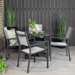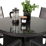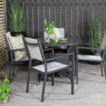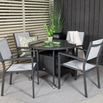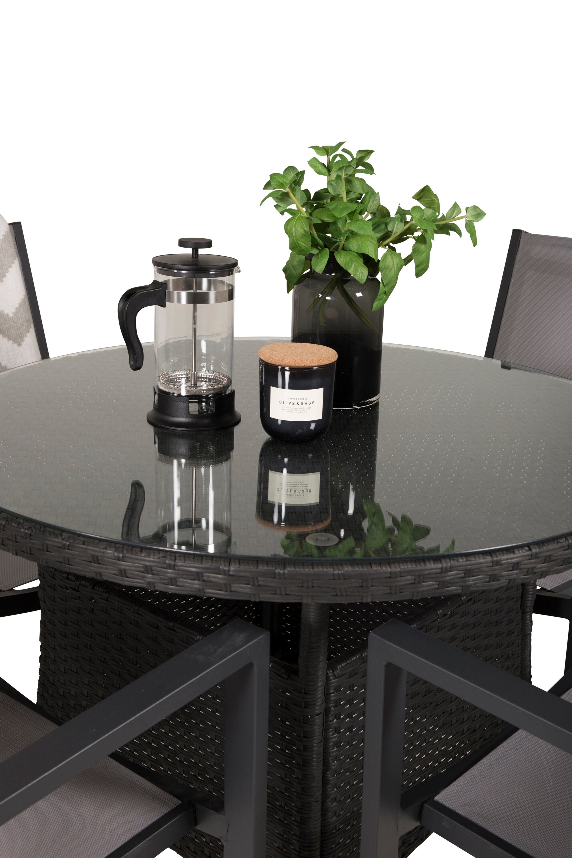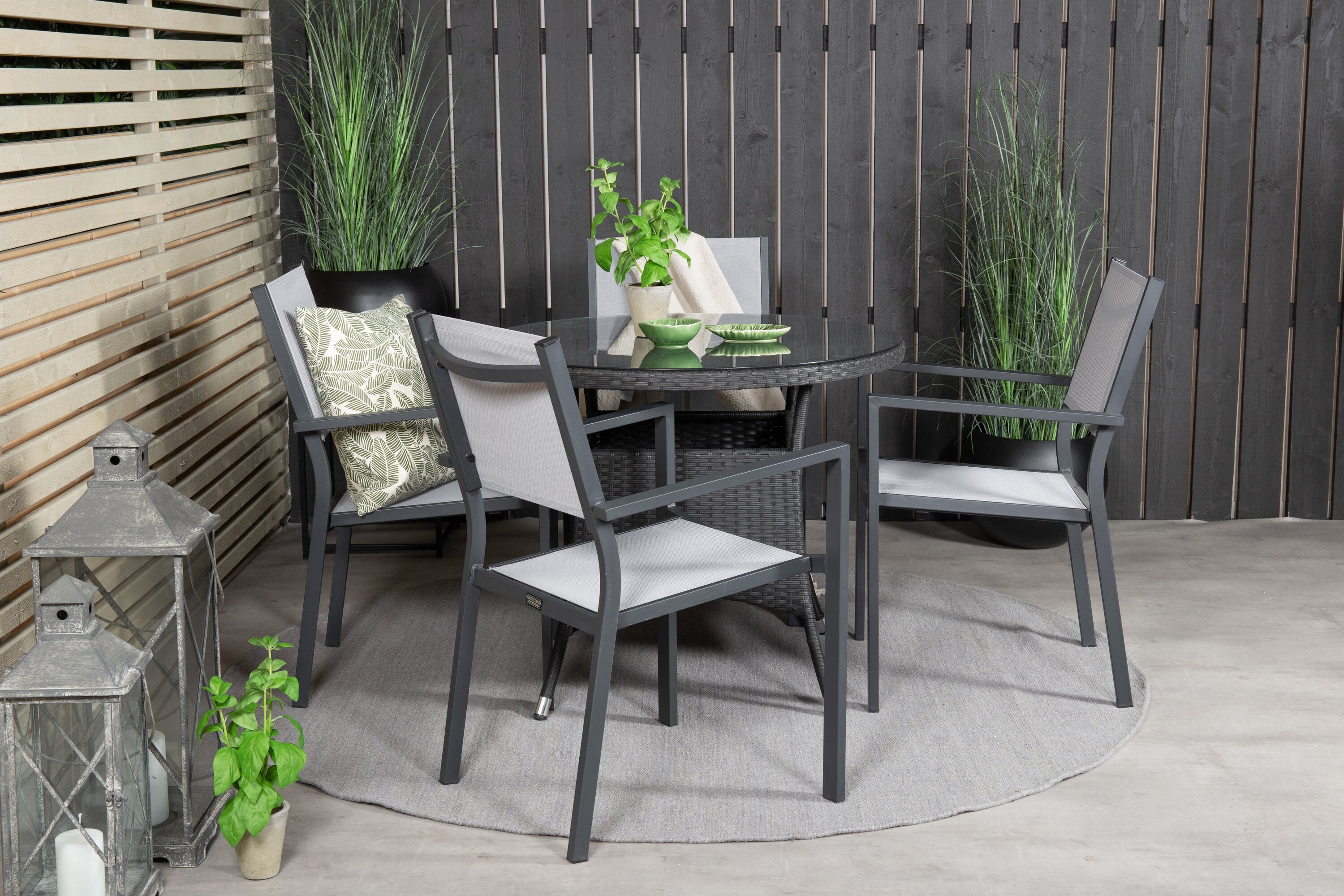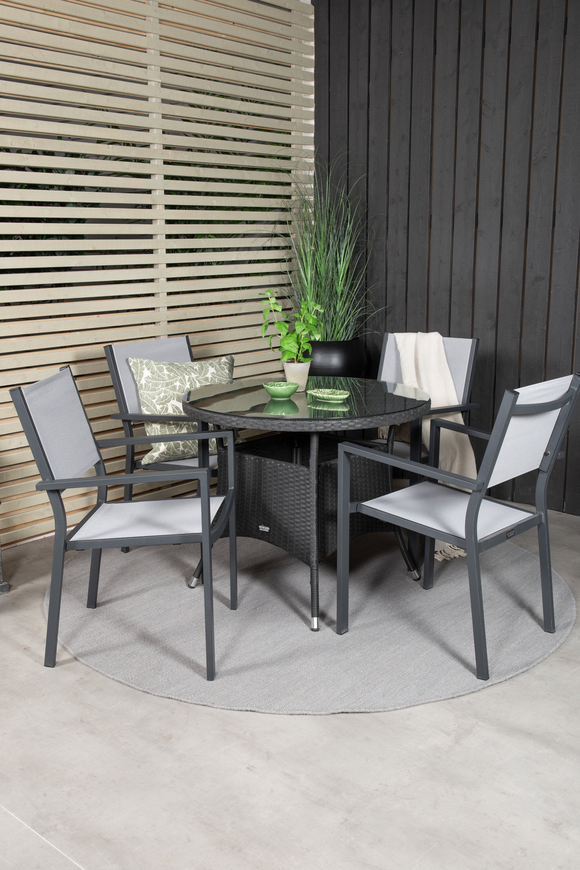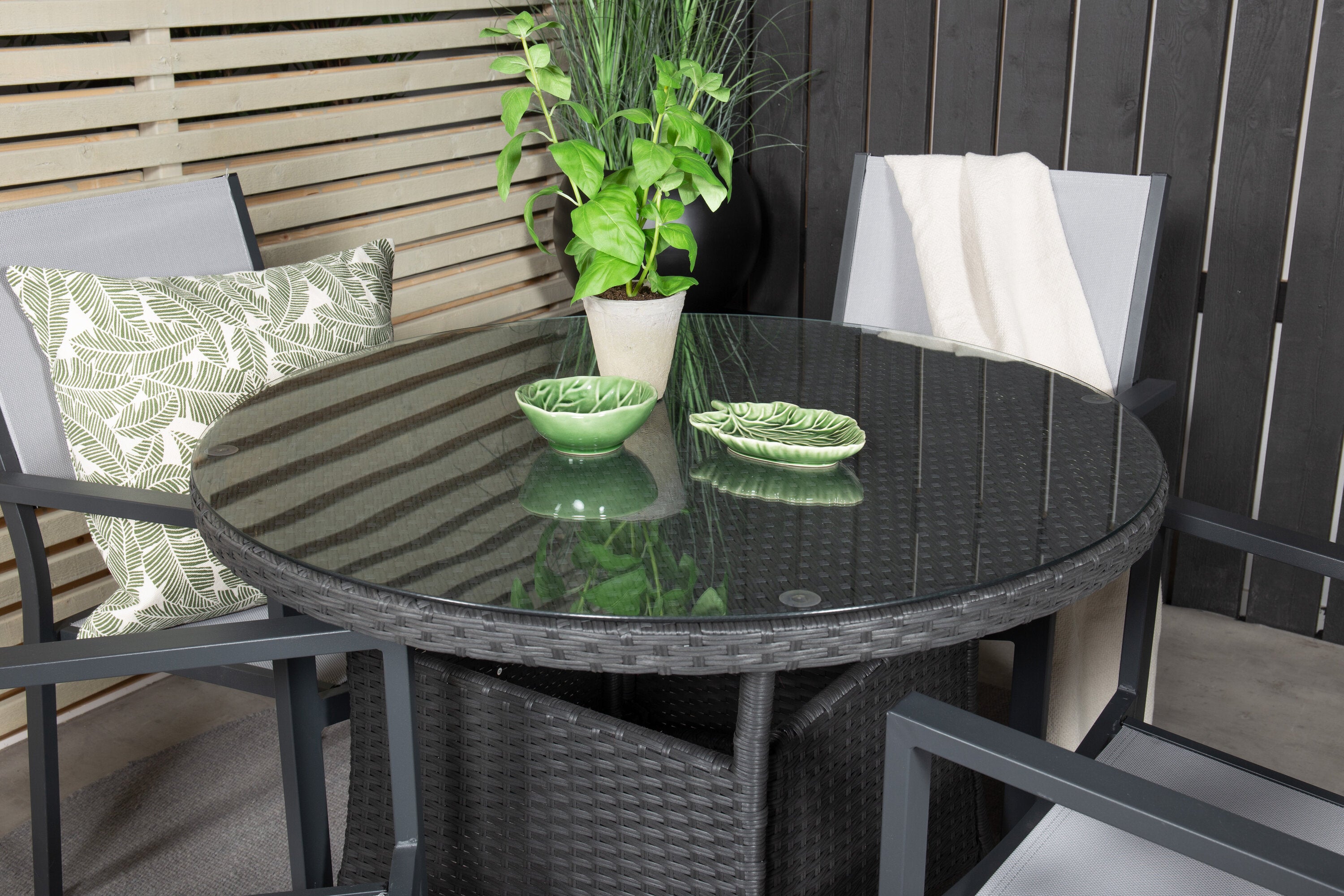 Kulatá skupina jídel je kombinována s jídelními židlemi řady Copacabana a jídelním stolem Volta a dodává vaší terase nebo terase moderní a luxusní dojem!