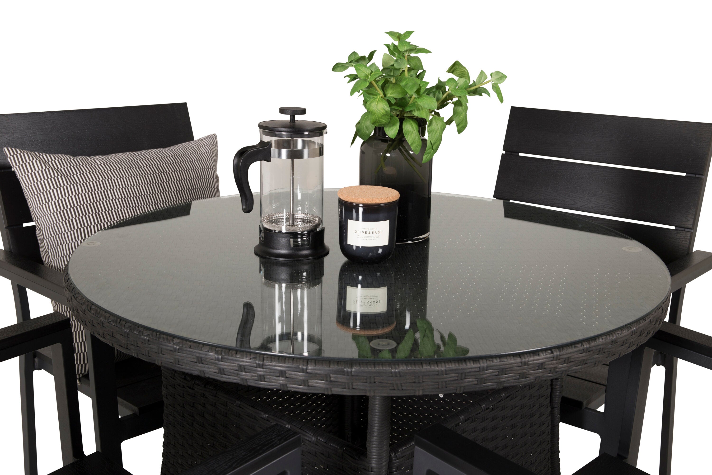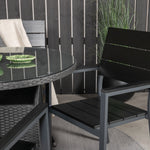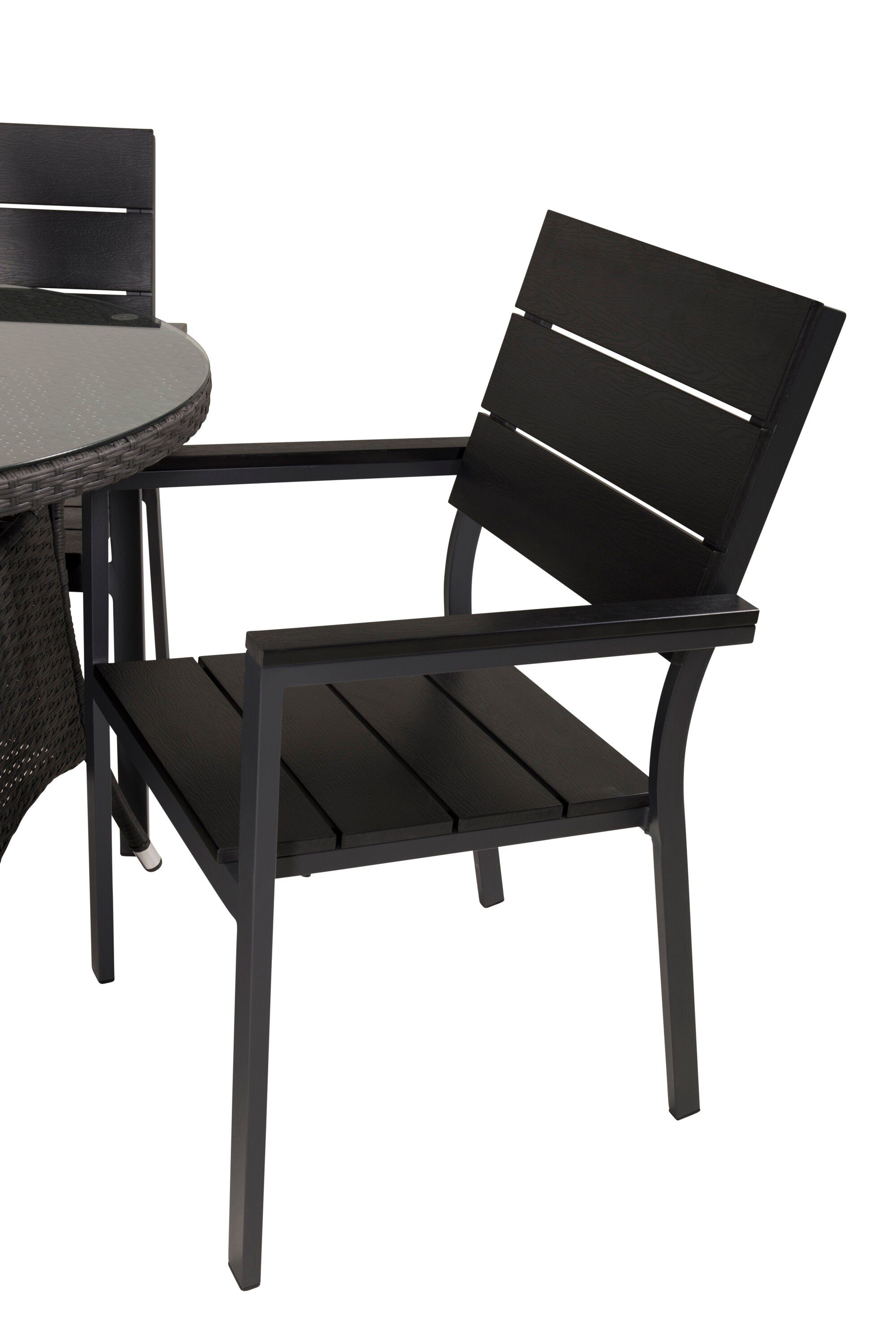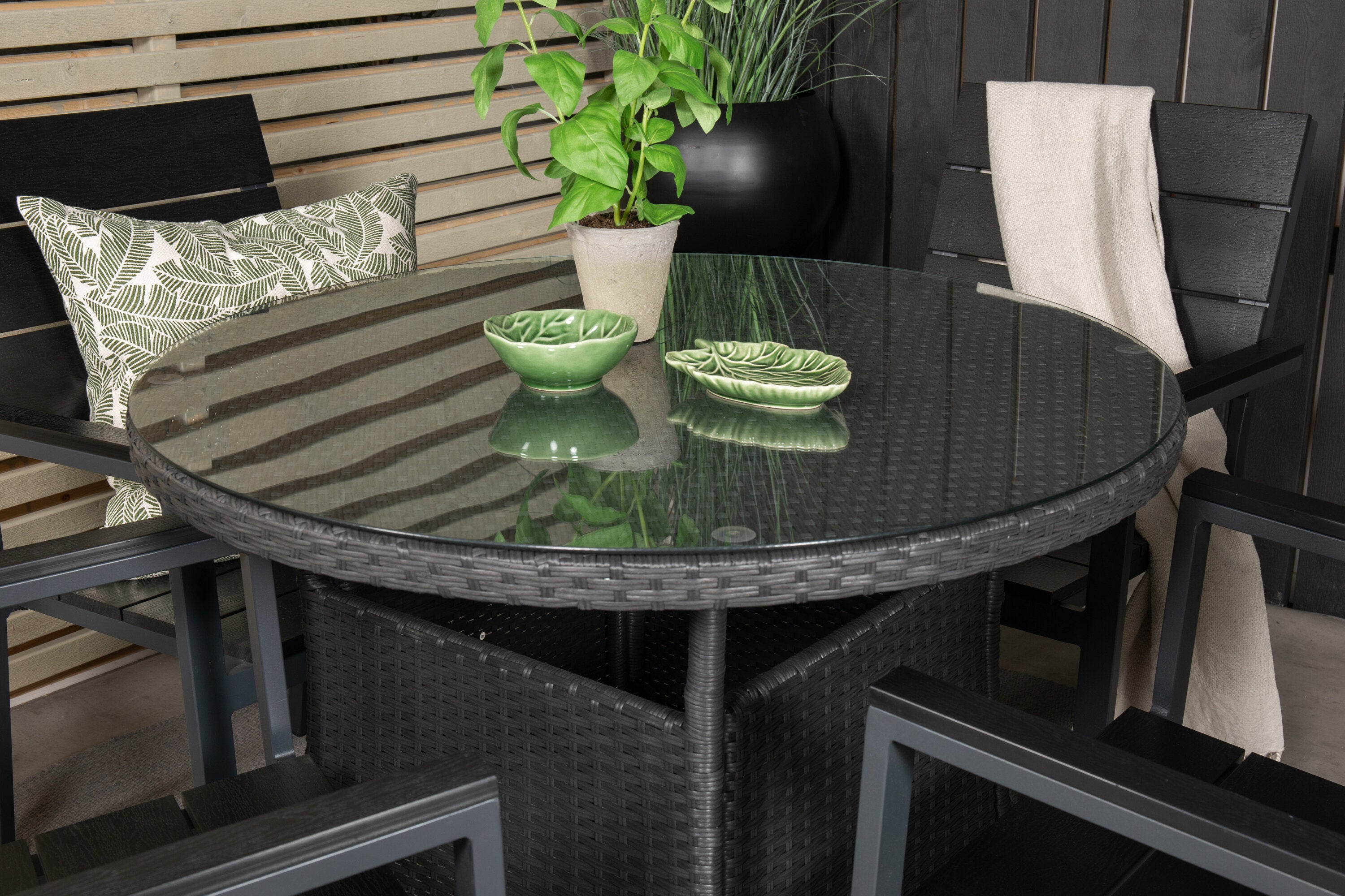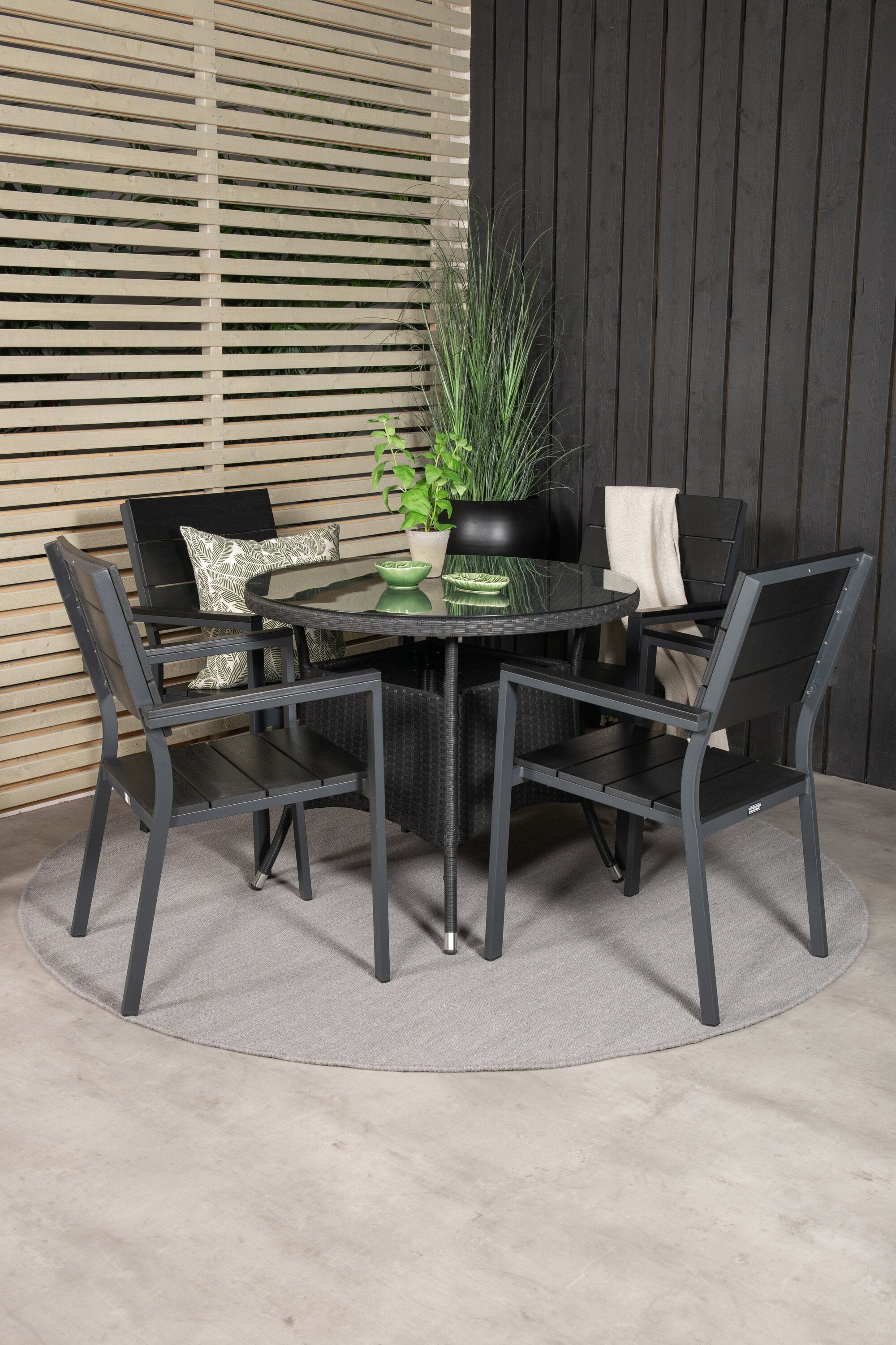Náš moderní jídelní stůl Volta spolu s klasickými jídelními židlemi ze série Levels. Zde získáte skupinu potravin, která se hodí stejně dobře na balkon jako na balkon. Oblečte svou terasu nebo terasu jiným dekorem všude kolem!