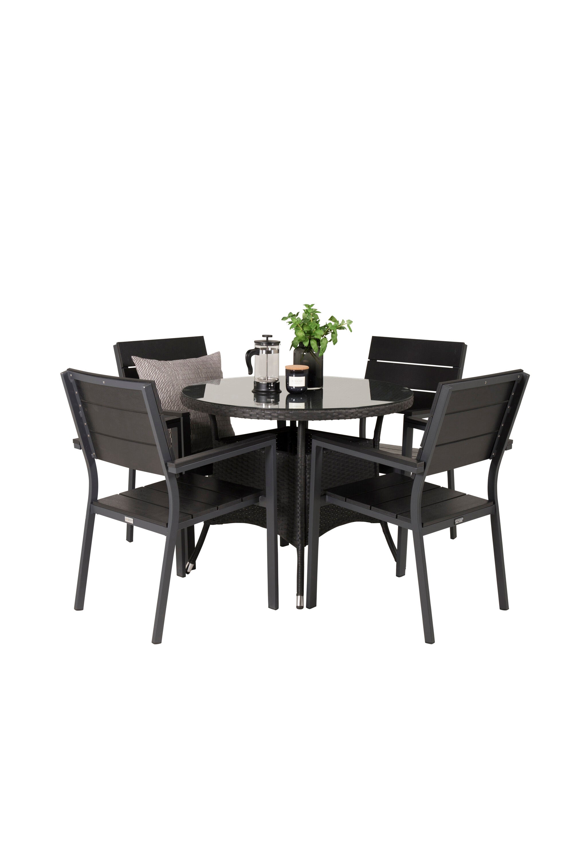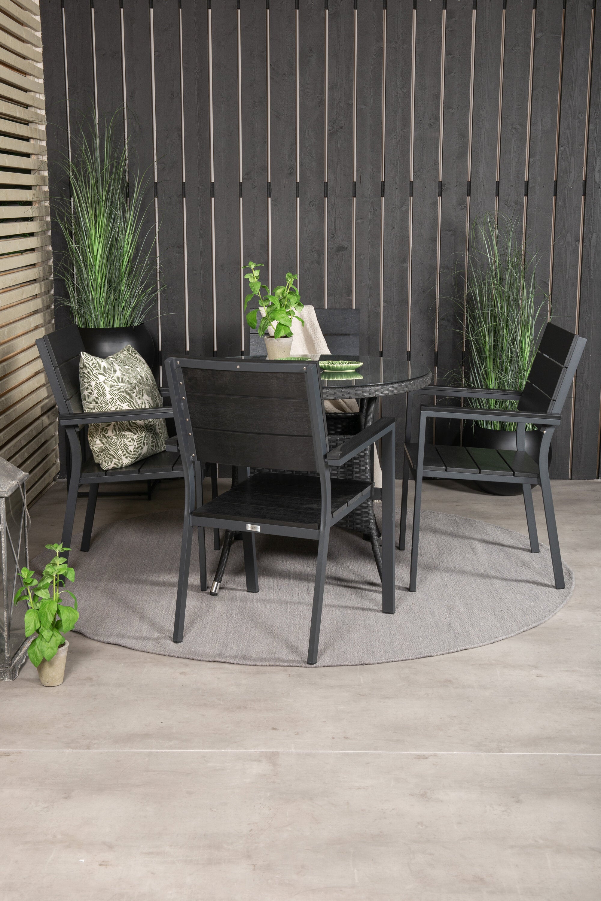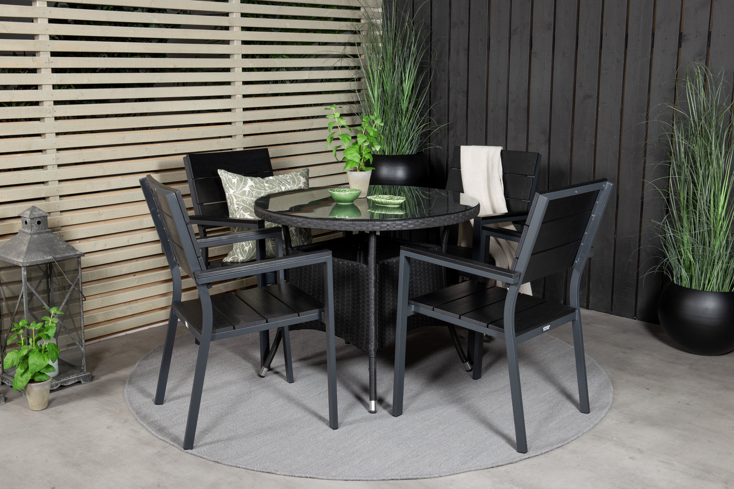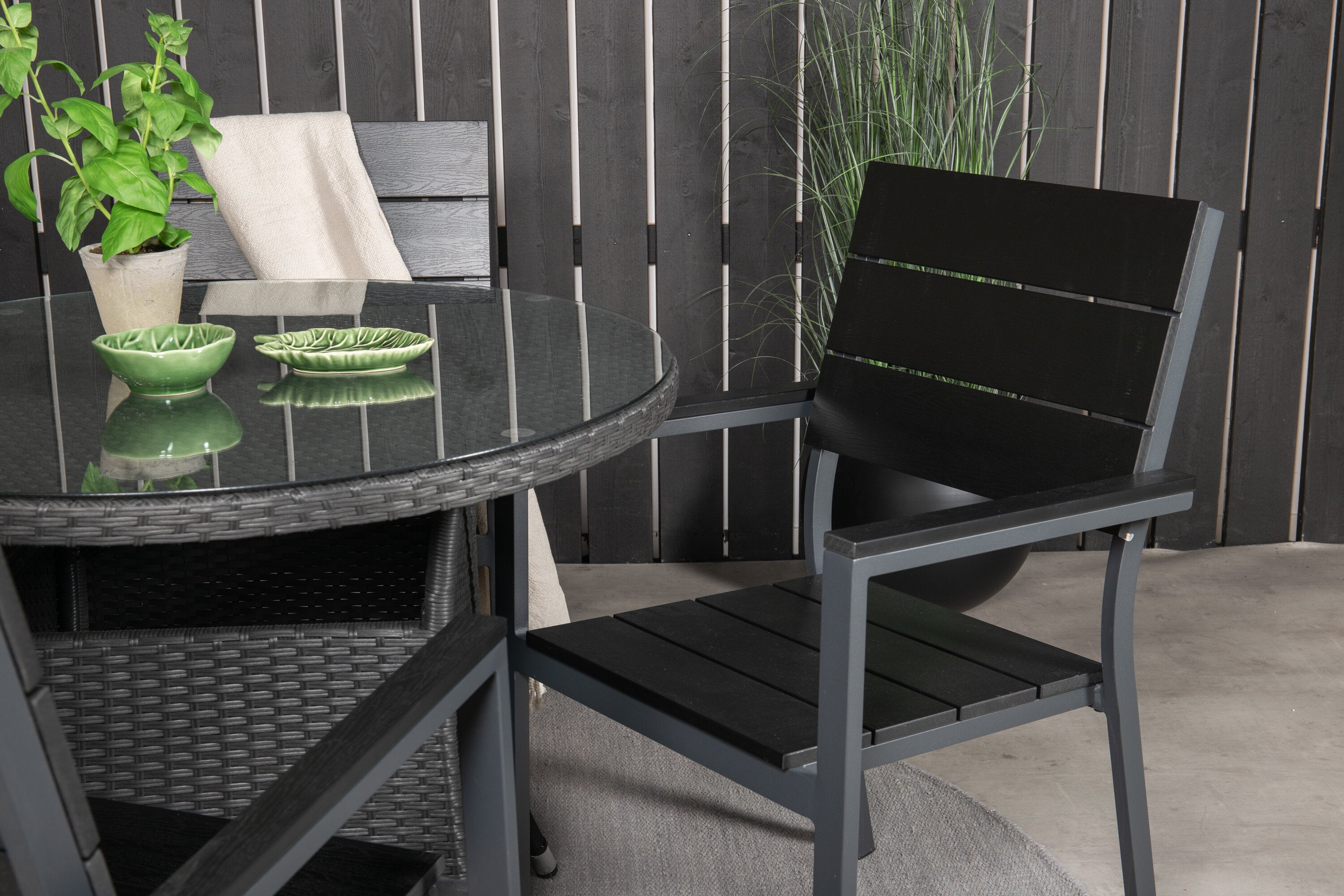 Náš moderní jídelní stůl Volta spolu s klasickými jídelními židlemi ze série Levels. Zde získáte skupinu potravin, která se hodí stejně dobře na balkon jako na balkon. Oblečte svou terasu nebo terasu jiným dekorem všude kolem!