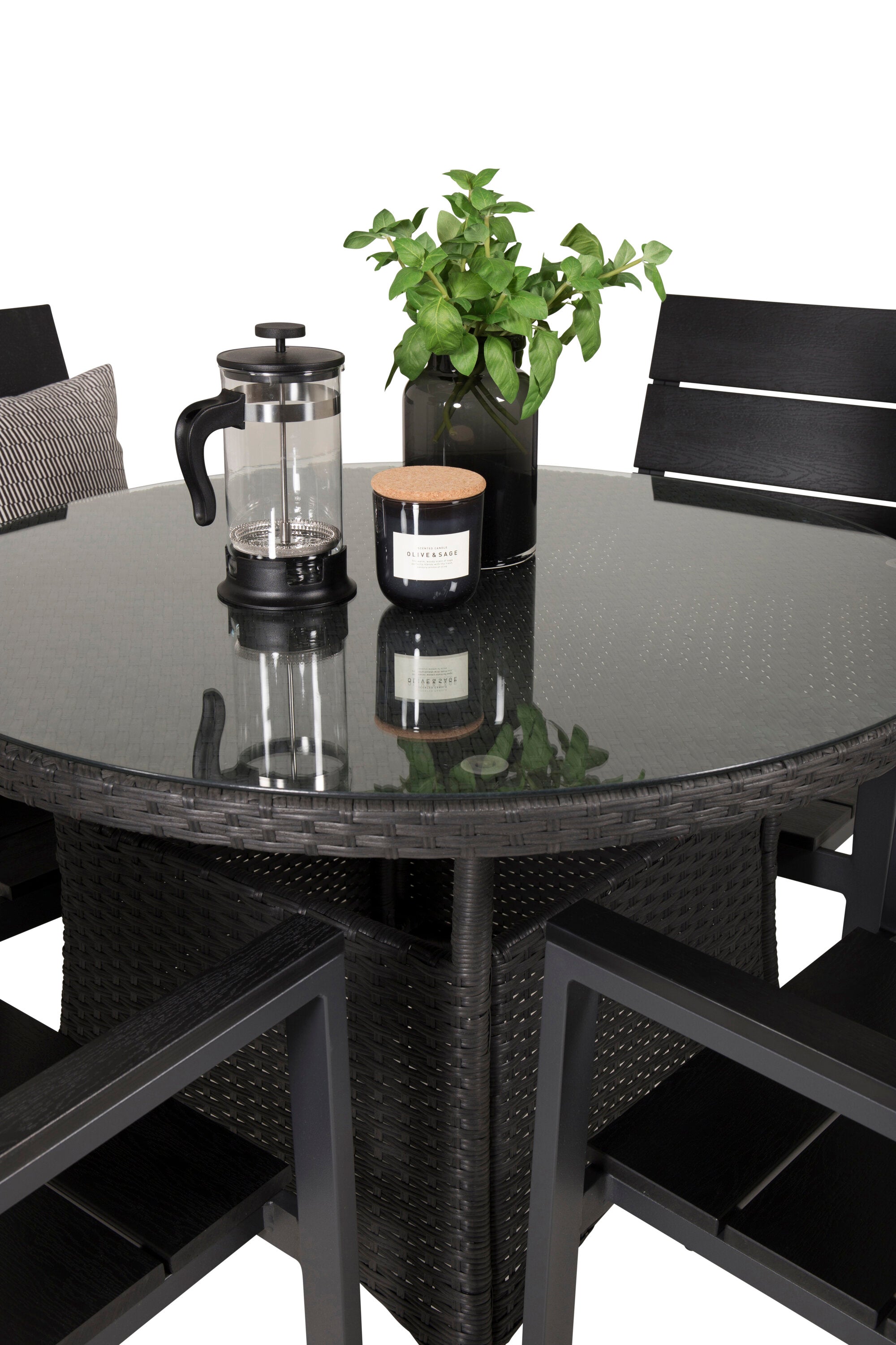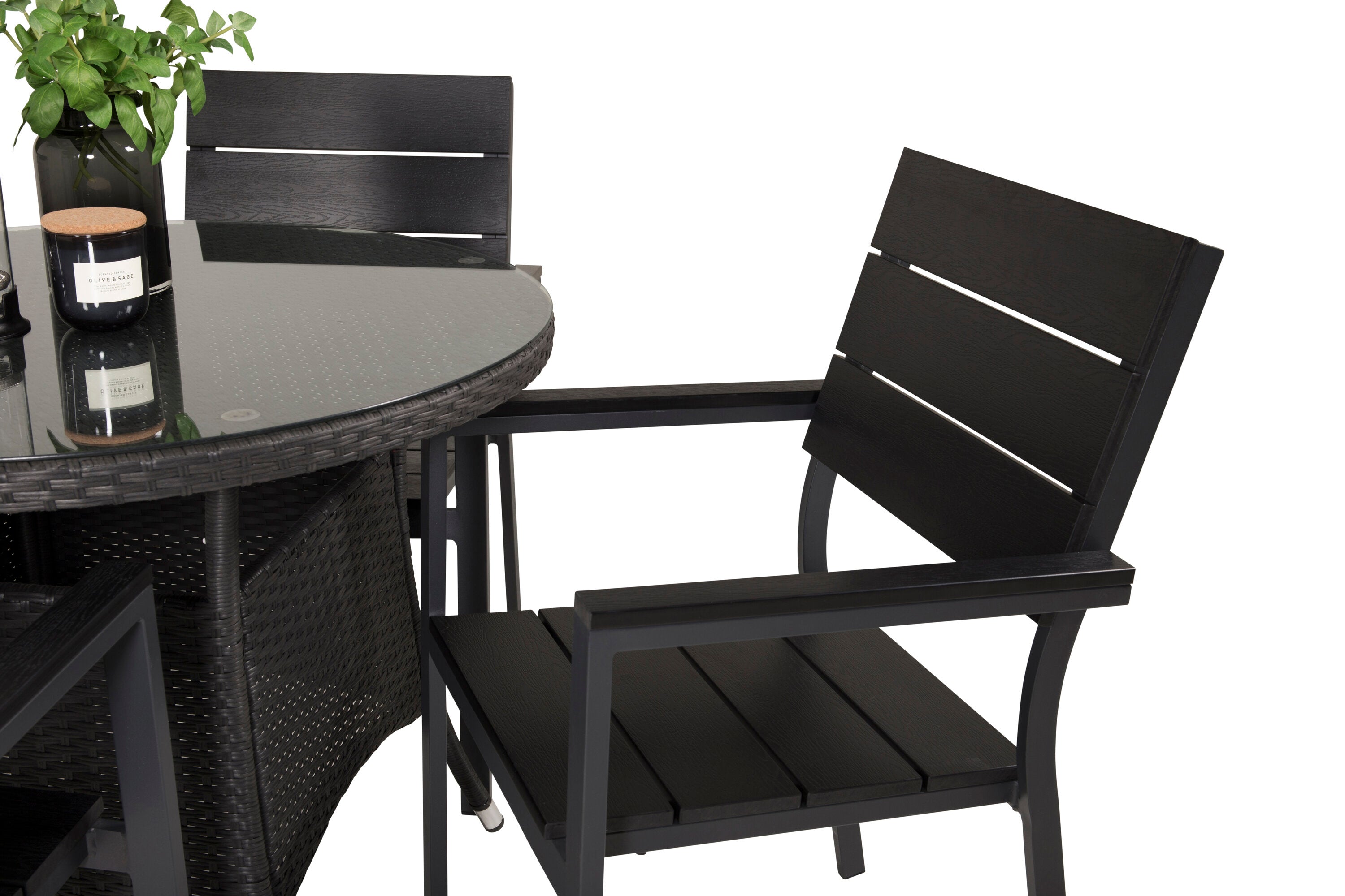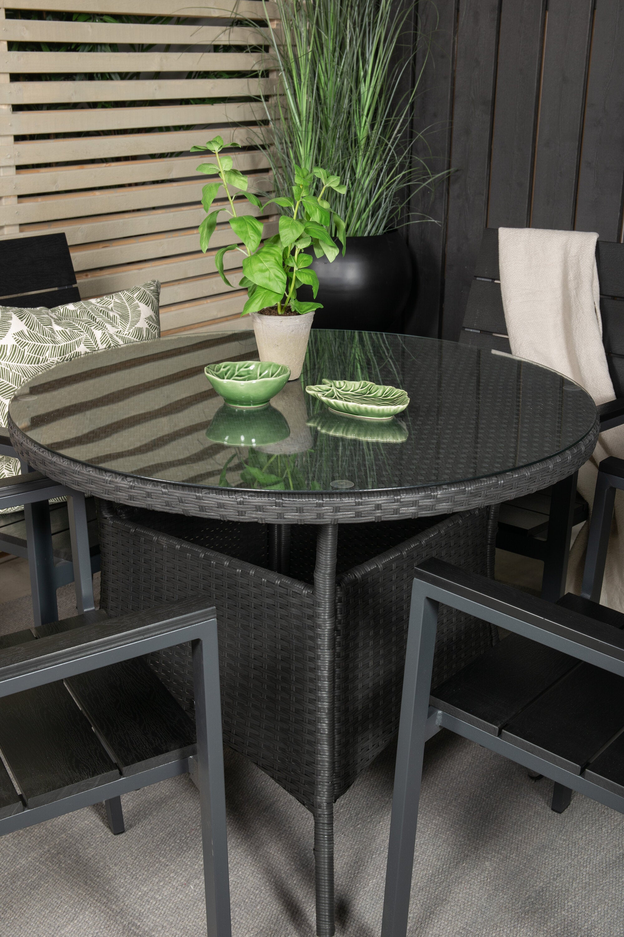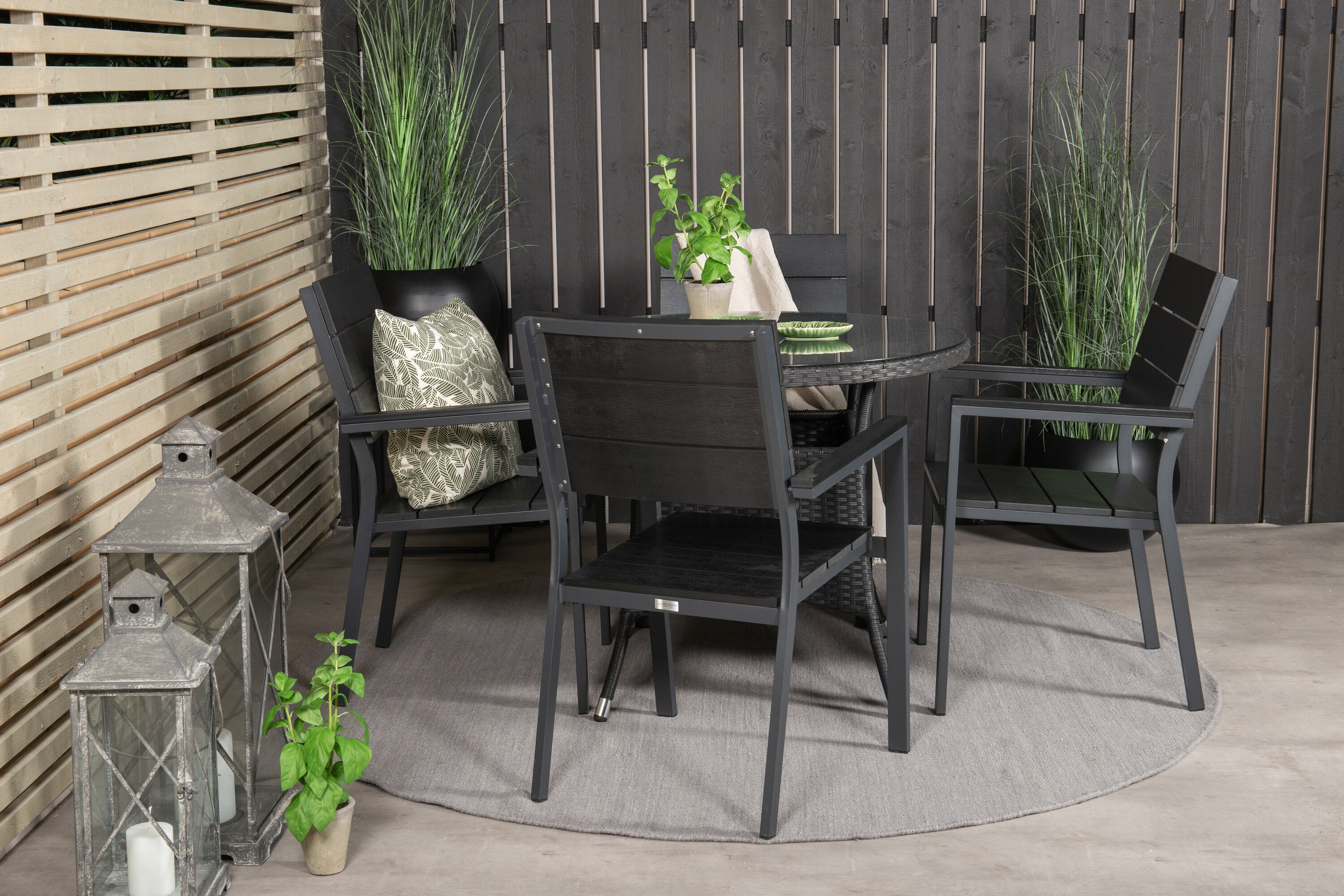 Náš moderní jídelní stůl Volta spolu s klasickými jídelními židlemi ze série Levels. Zde získáte skupinu potravin, která se hodí stejně dobře na balkon jako na balkon. Oblečte svou terasu nebo terasu jiným dekorem všude kolem!
