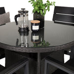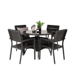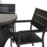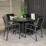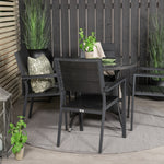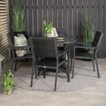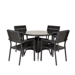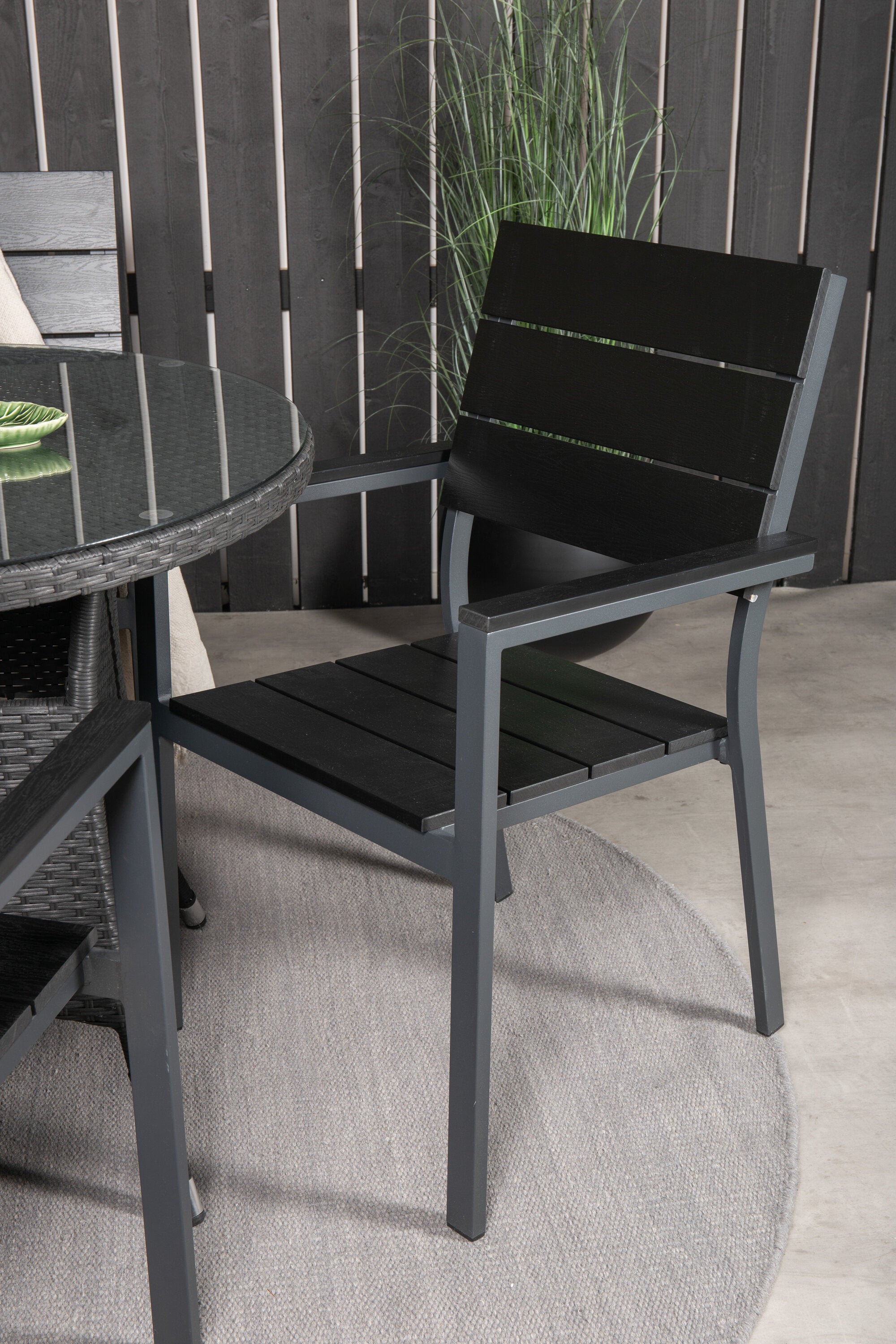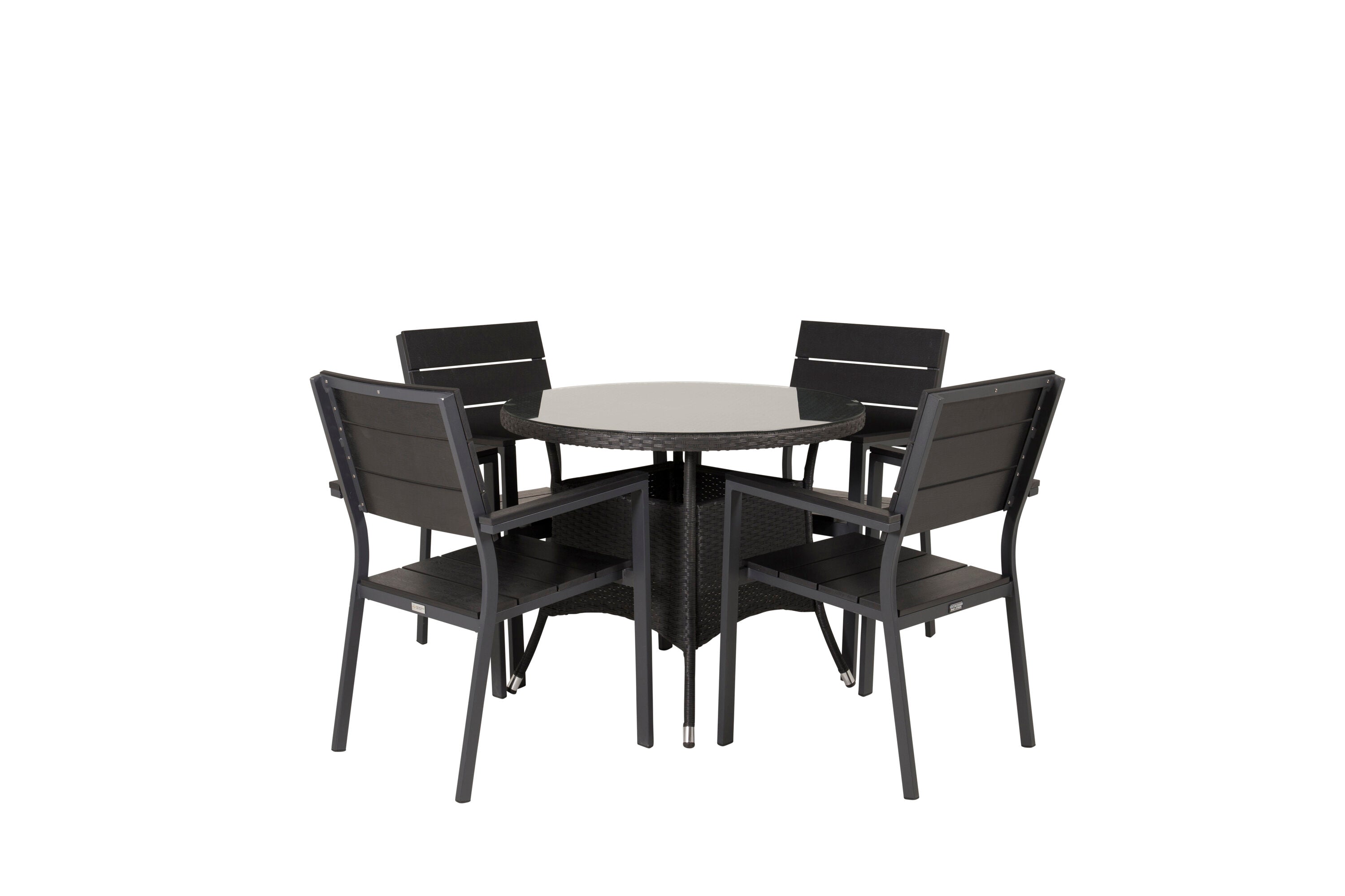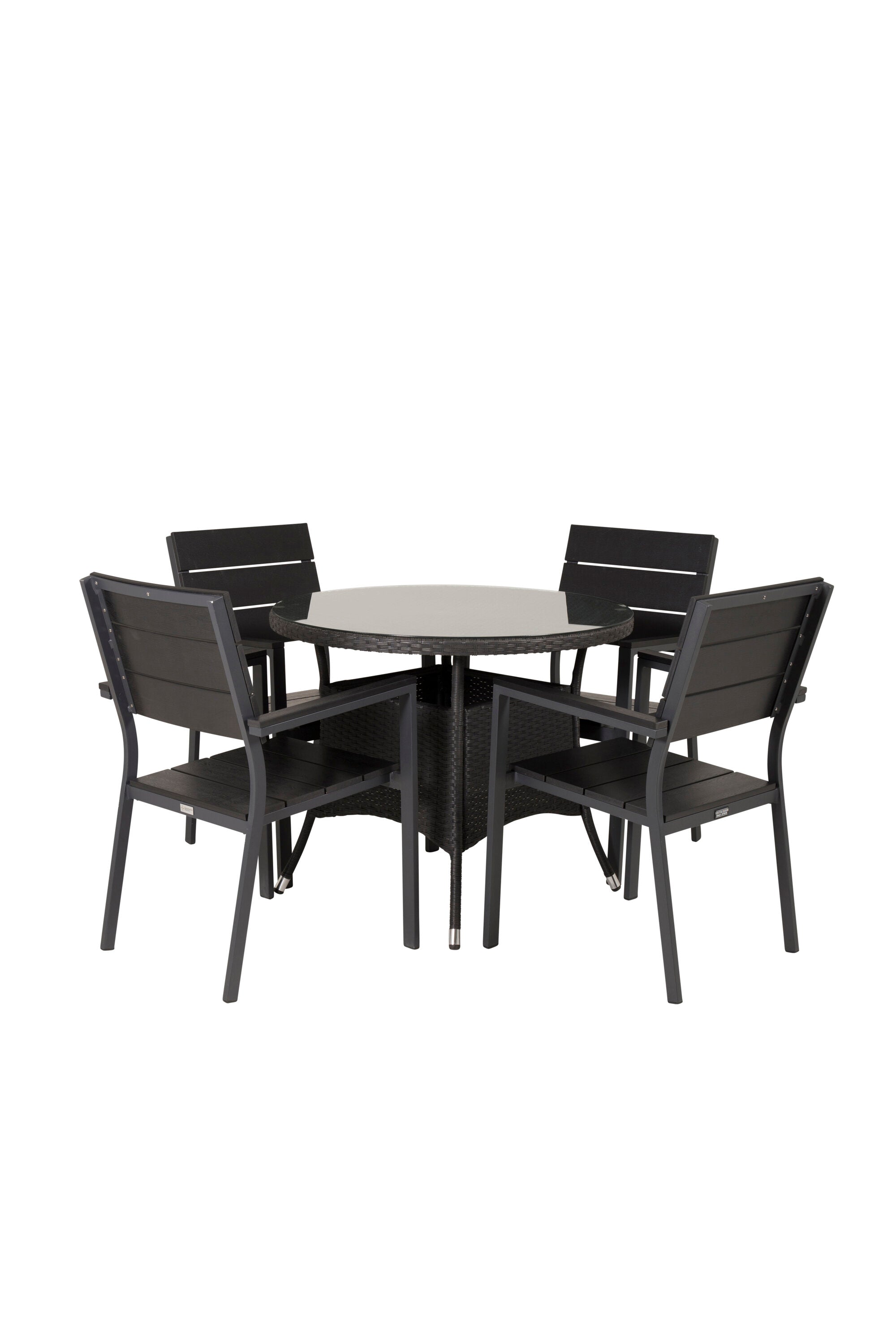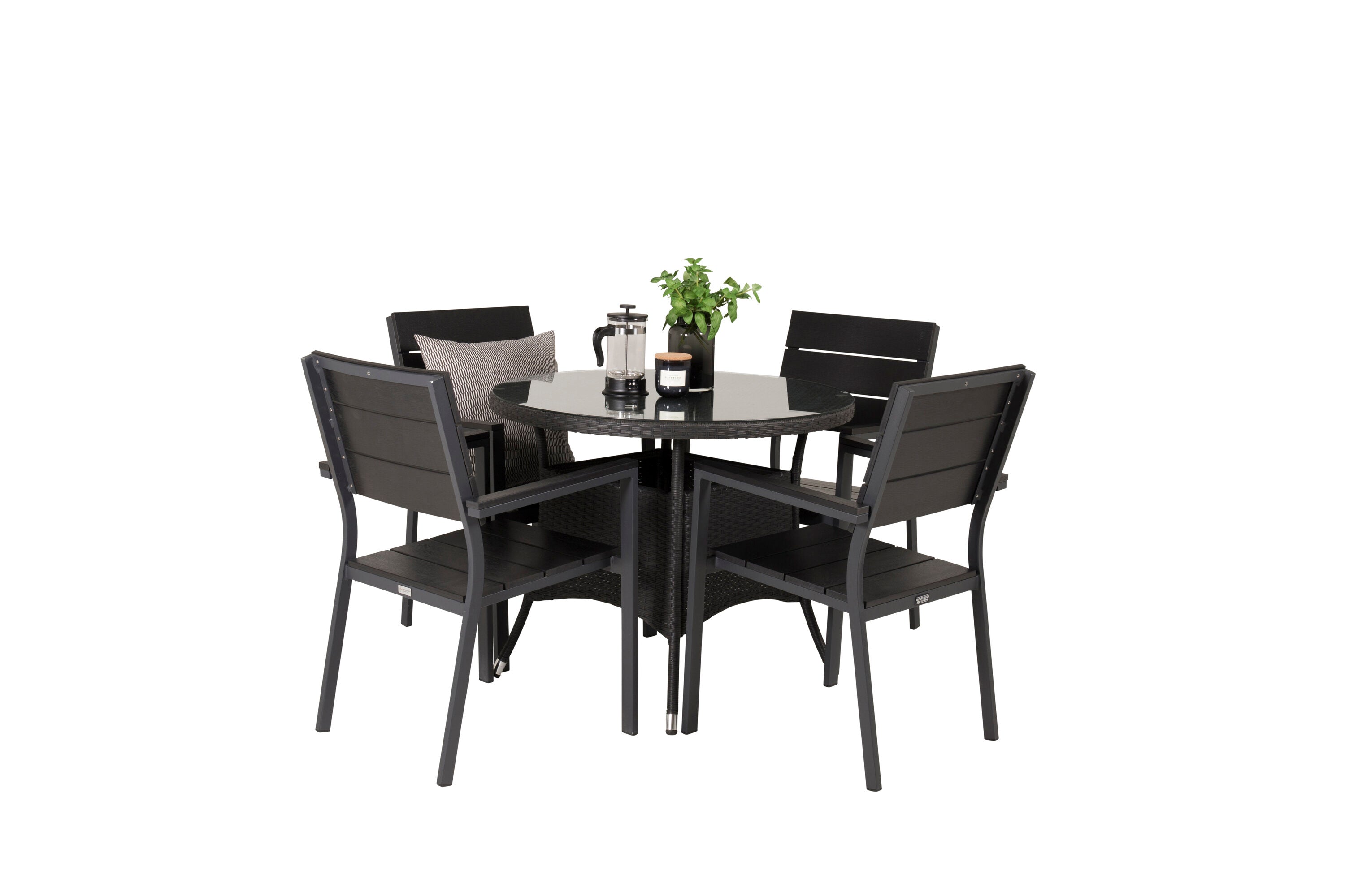 Náš moderní jídelní stůl Volta spolu s klasickými jídelními židlemi ze série Levels. Zde získáte skupinu potravin, která se hodí stejně dobře na balkon jako na balkon. Oblečte svou terasu nebo terasu jiným dekorem všude kolem!