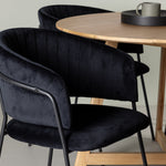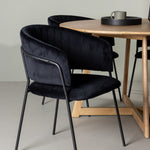 Slušivé černé jídelní židle ze série Selma doplní jídelní stůl tím nejlepším způsobem. Tyto židle mají elegantní a celočalouněný design s mírně zaobleným opěradlem a sedákem z luxusní sametové látky. Krásné dekorativní prošívání dodává extra nádech exkluzivity. Nohy židle jsou úzké a vyrobené z černé oceli, což poskytuje moderní kontrast k měkkému vzhledu židle.