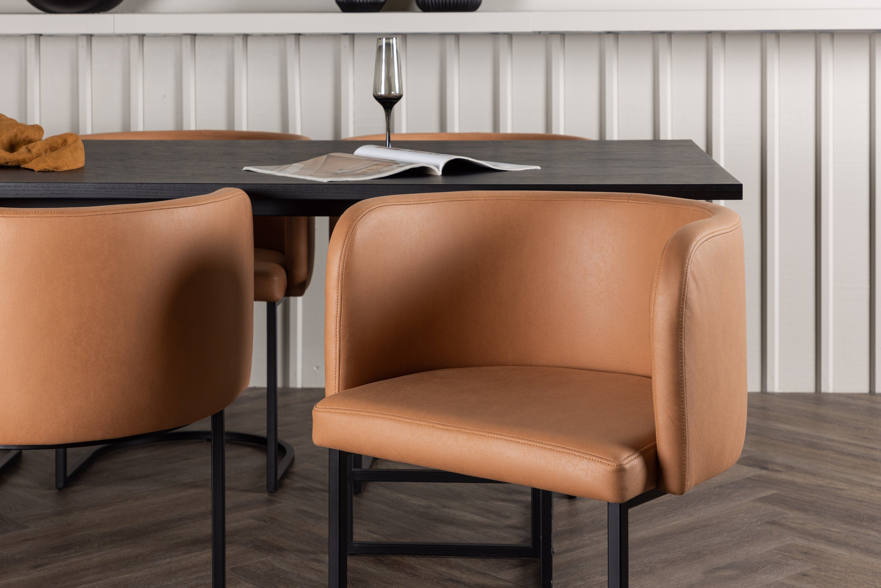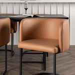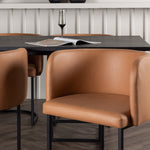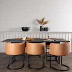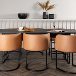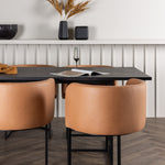 Spolu s obdélníkovým jídelním stolem Ystad přicházejí naše moderní jídelní židle ze série Simrishamn. Tato židle má plně čalouněný sedák z hnědé látky TC a zakřivené opěradlo, které poskytuje optimální pohodlí při jídle. Minimalistický černý ocelový rám židle dodává stylový kontrast a skvěle doplňuje jídelní stůl.