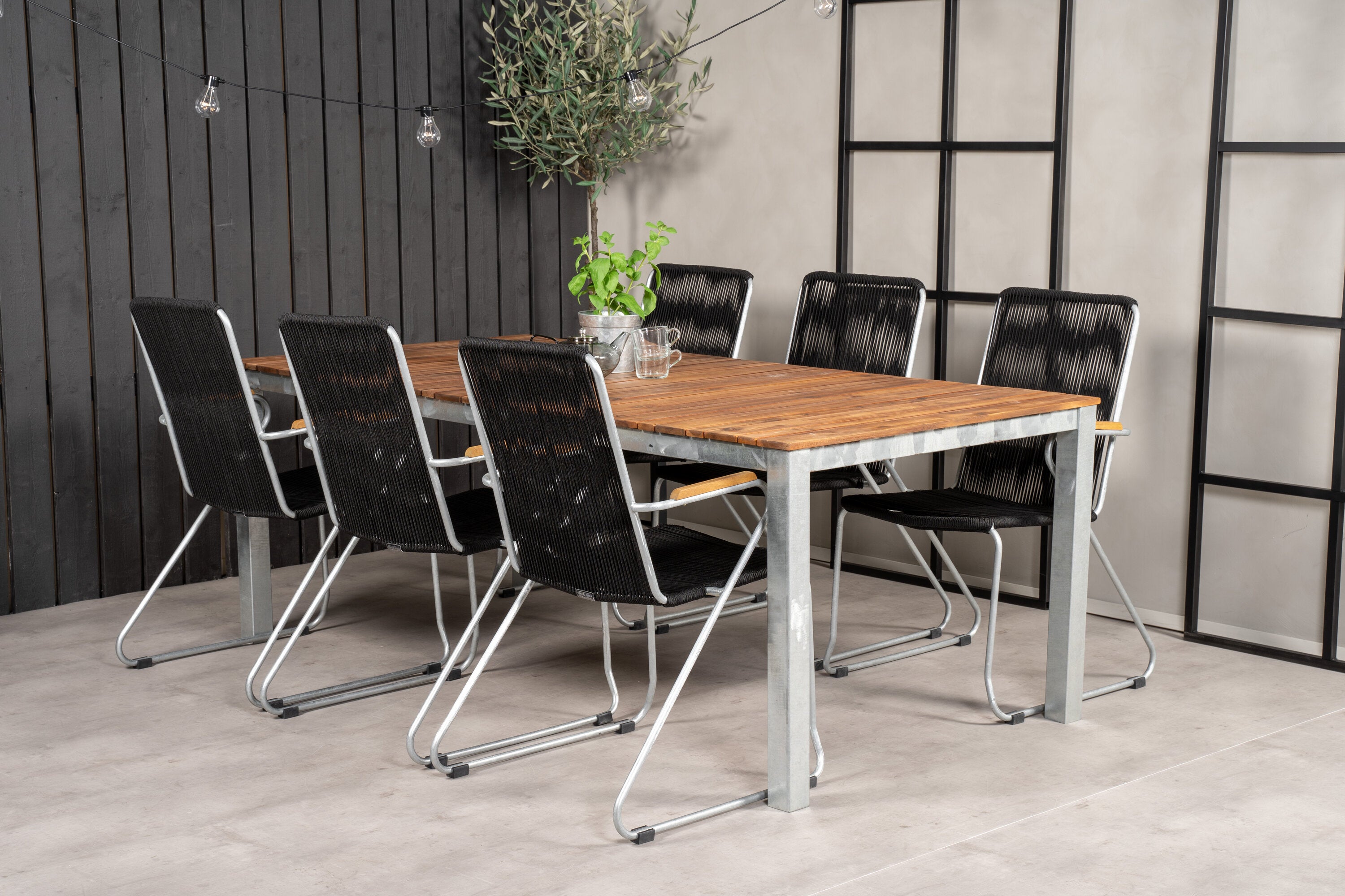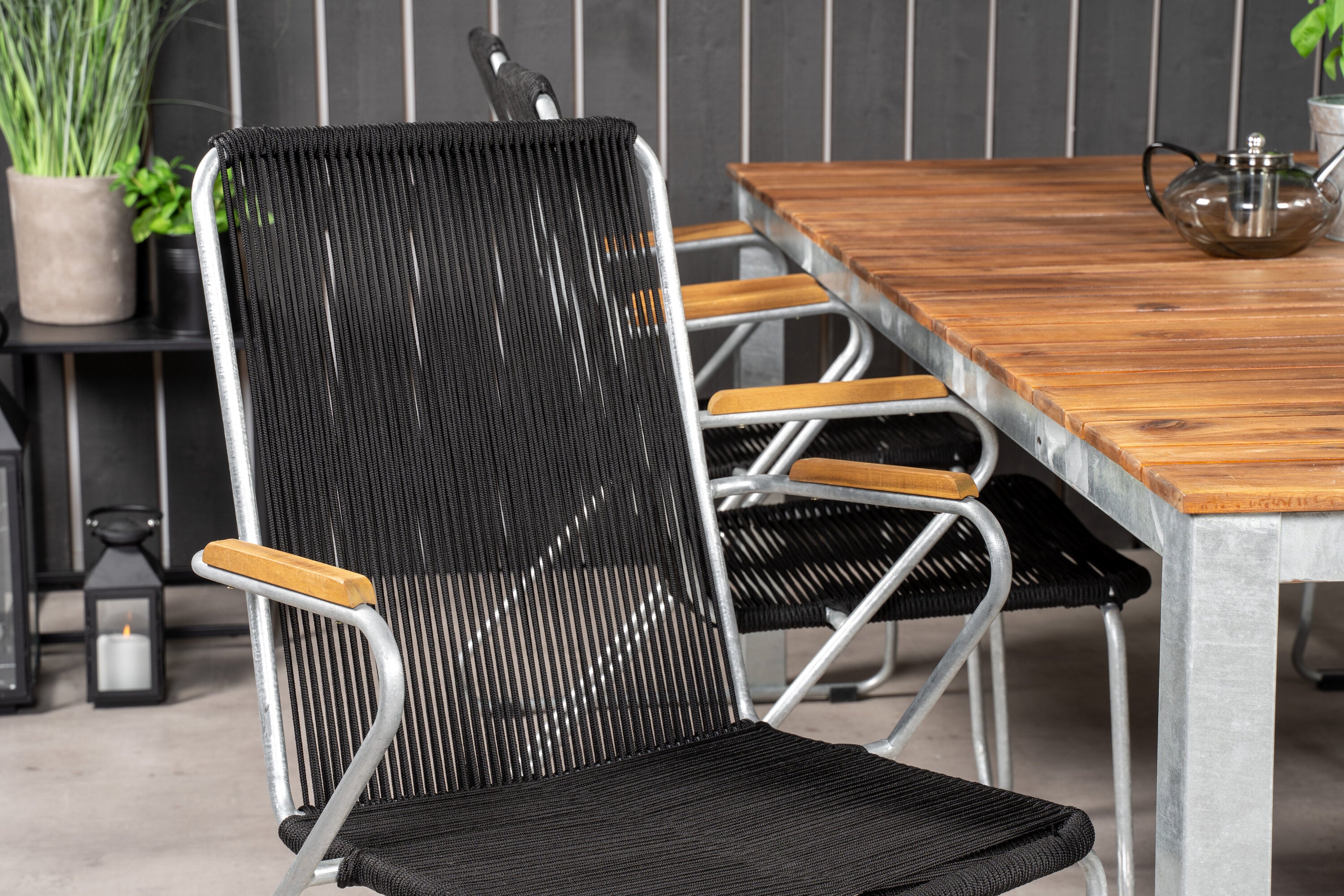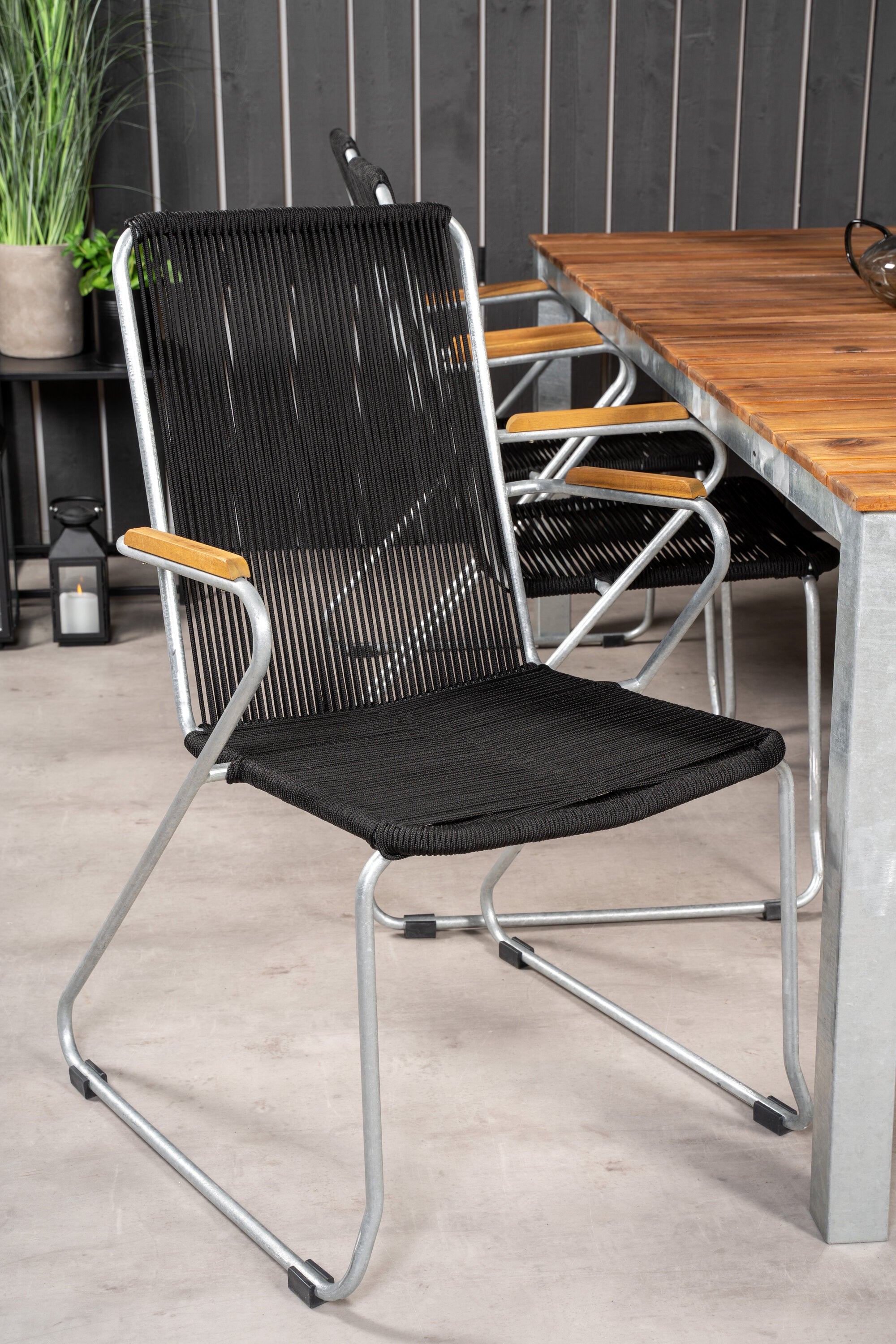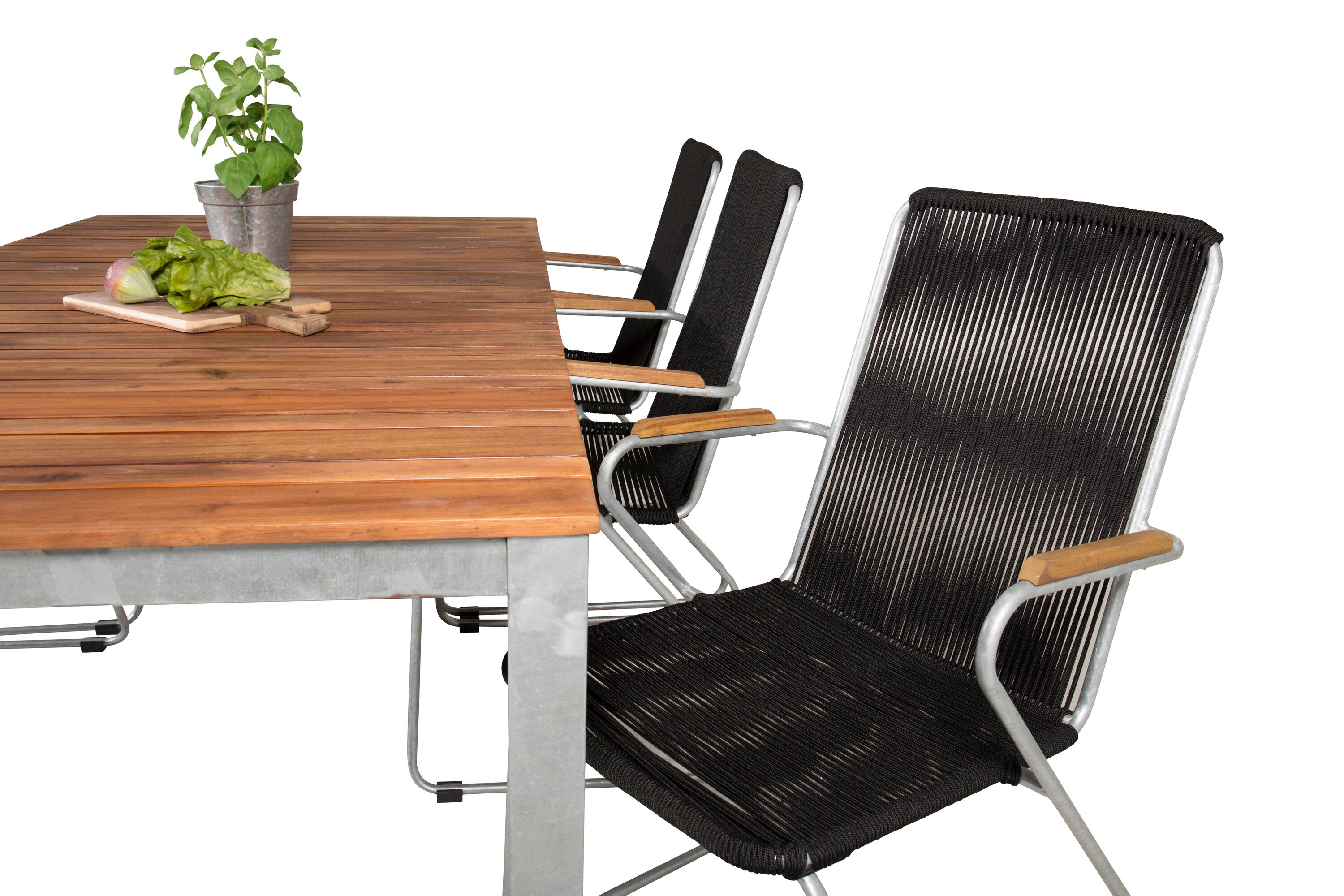 Jídelní stůl Zenia 200*100 - křeslo z akácie / zink+bois - zinek / černé lano / A