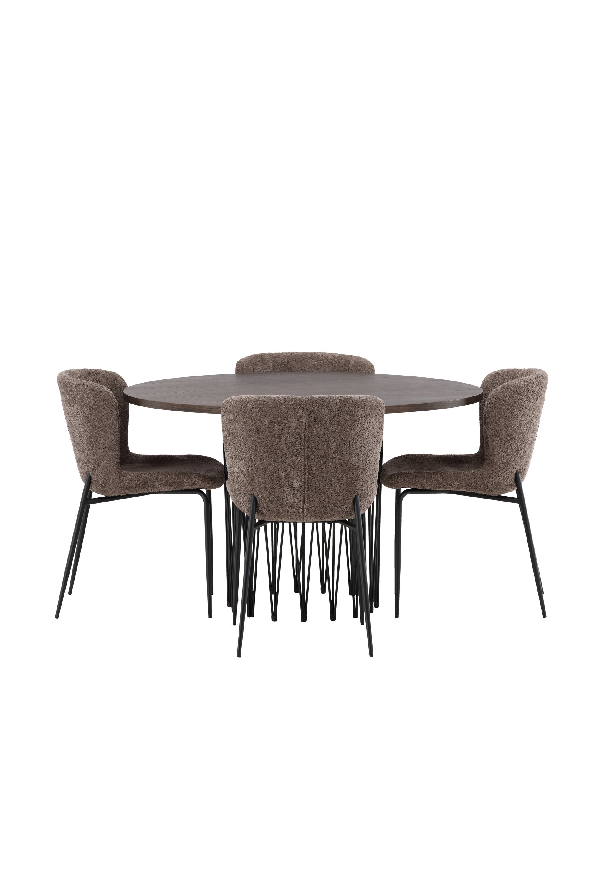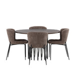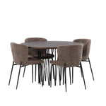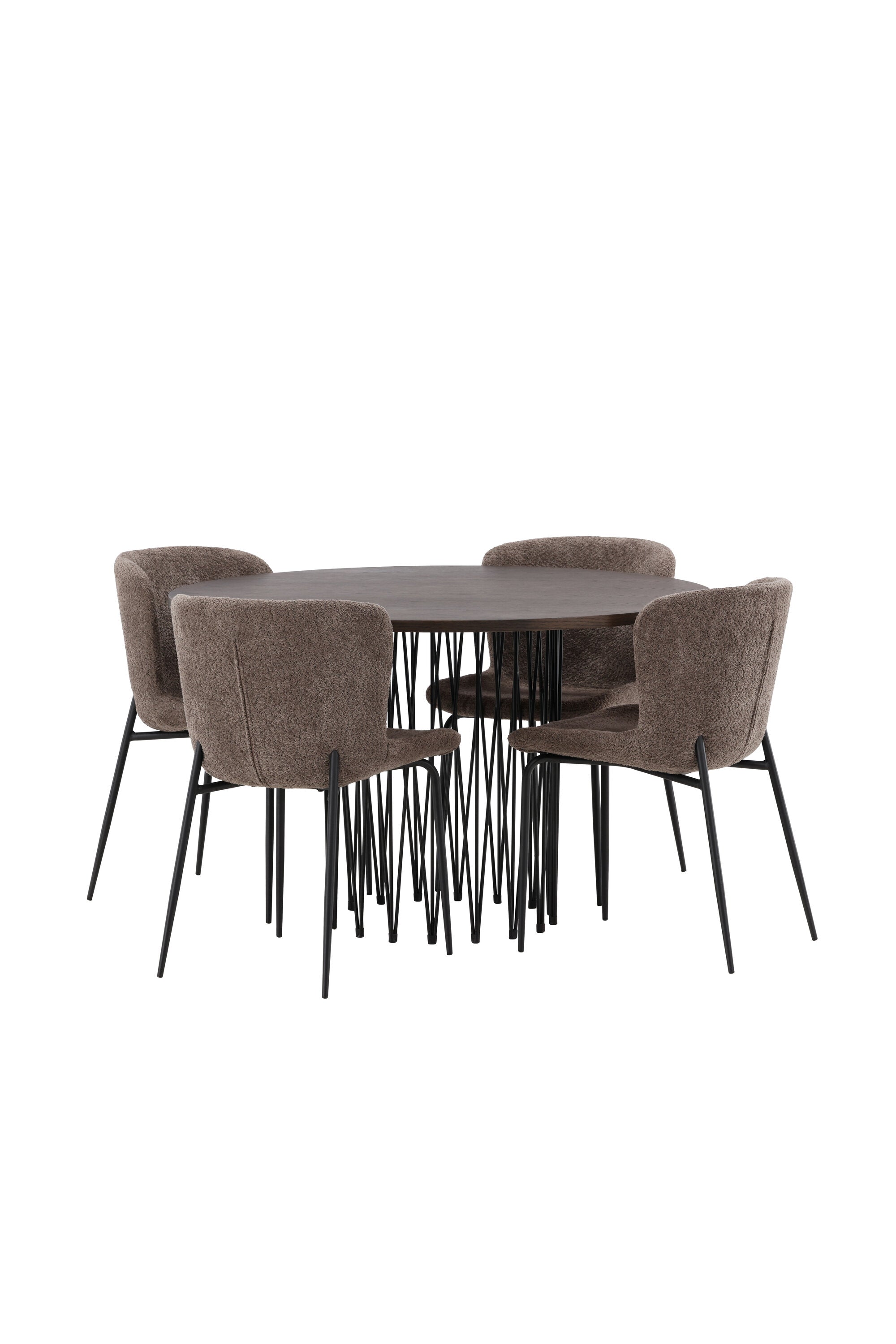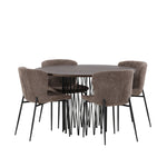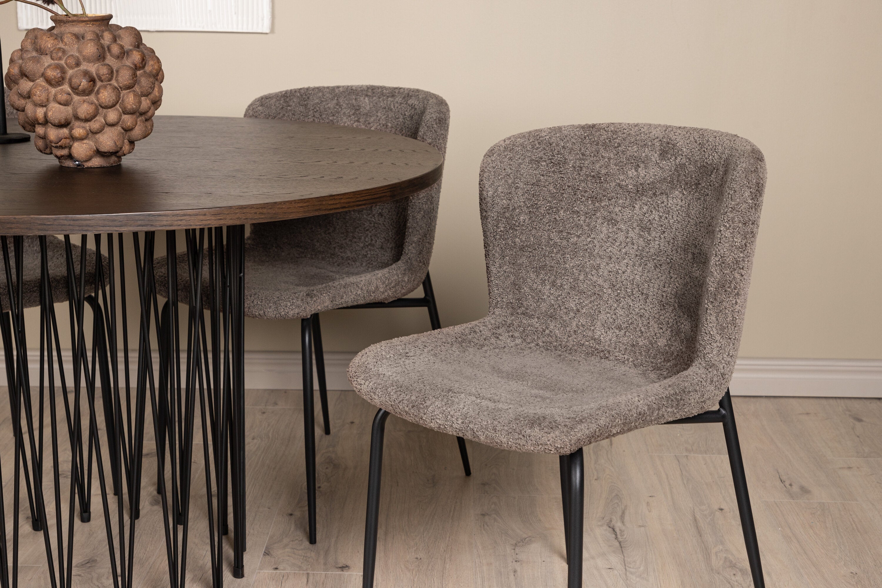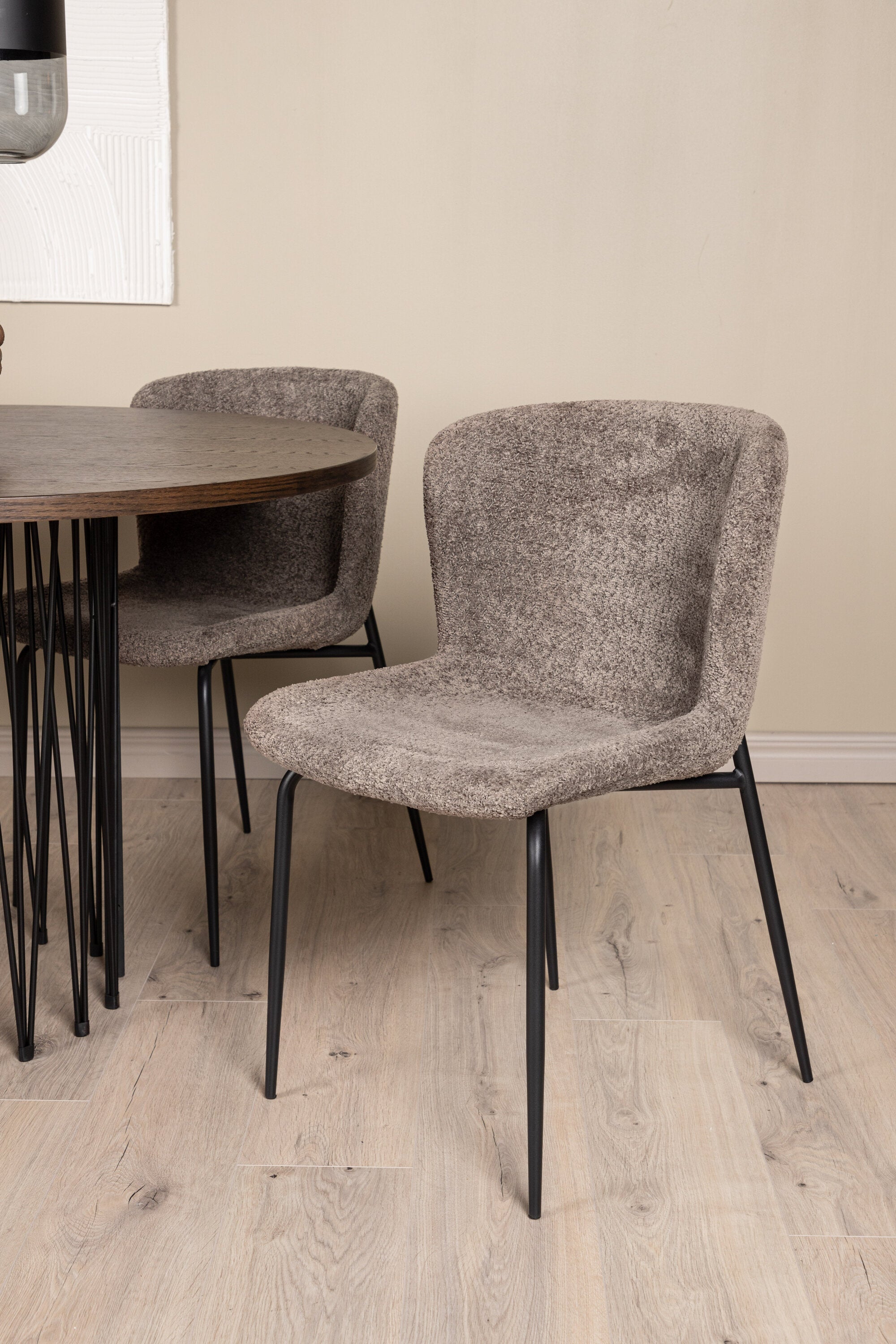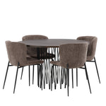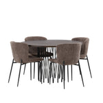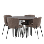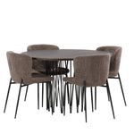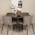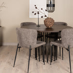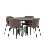 Tato jídelní sestava vyzařuje pohodlí, moderní design a elegantní tvary! Náš kulatý jídelní stůl Stone má fantastický skandinávský design, který se hodí k davu. Stůl má krásnou hnědou desku z MDF s dýhou a ozdobný rám ve tvaru válce z černého kovu. Zde v dokonalé kombinaci s našimi pohodlnými jídelními židlemi ze série Modesto. Židle je celočalouněná šedou látkou bouclé se stylovými minimalistickými nohami v černém kovu. Mírně zaoblená záda a čalouněný sedák poskytují extra pohodlí a rozšiřují příjemné jídlo kolem jídelního stolu. Mělo by být příjemné si na chvíli sednout!
