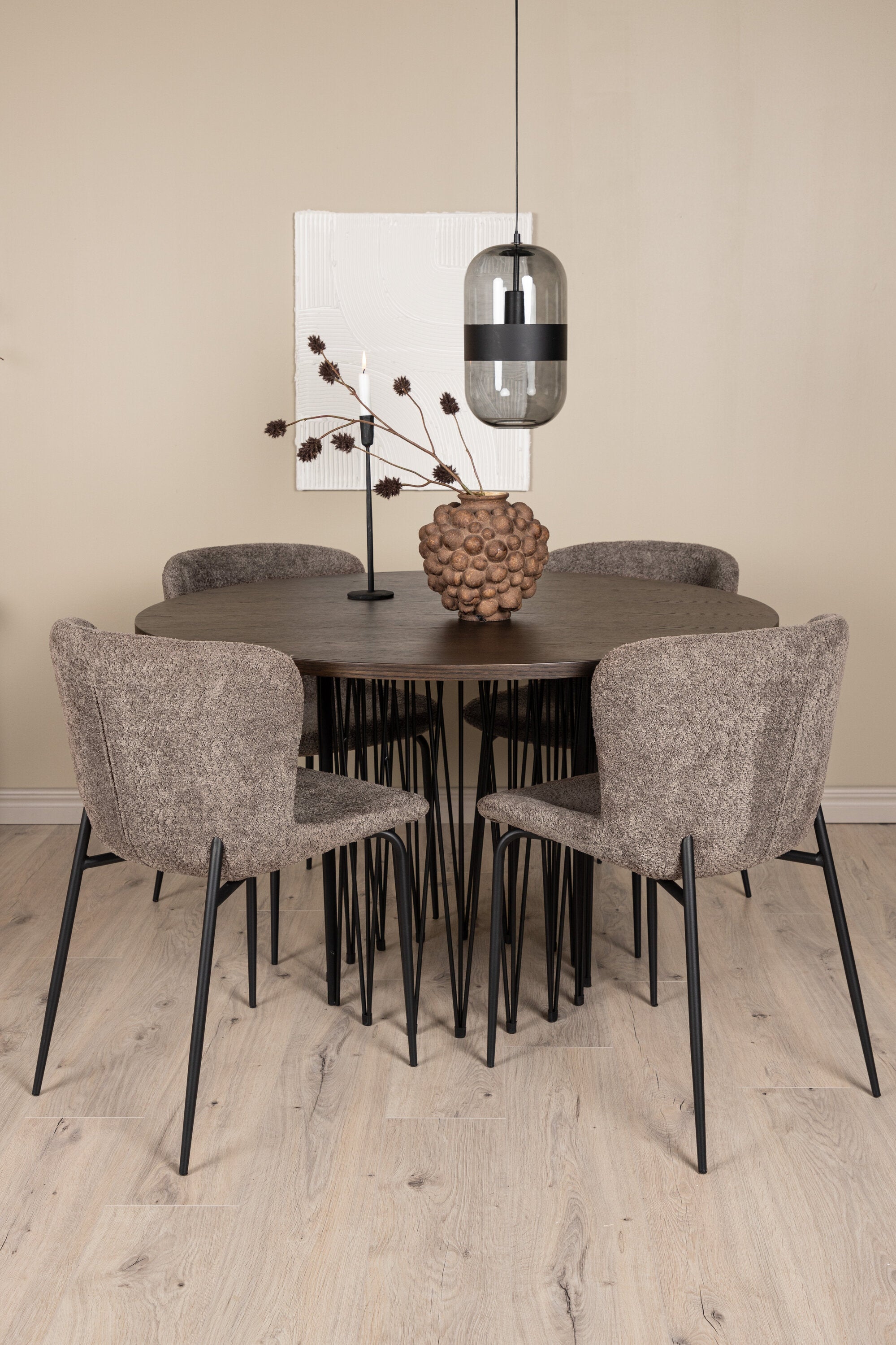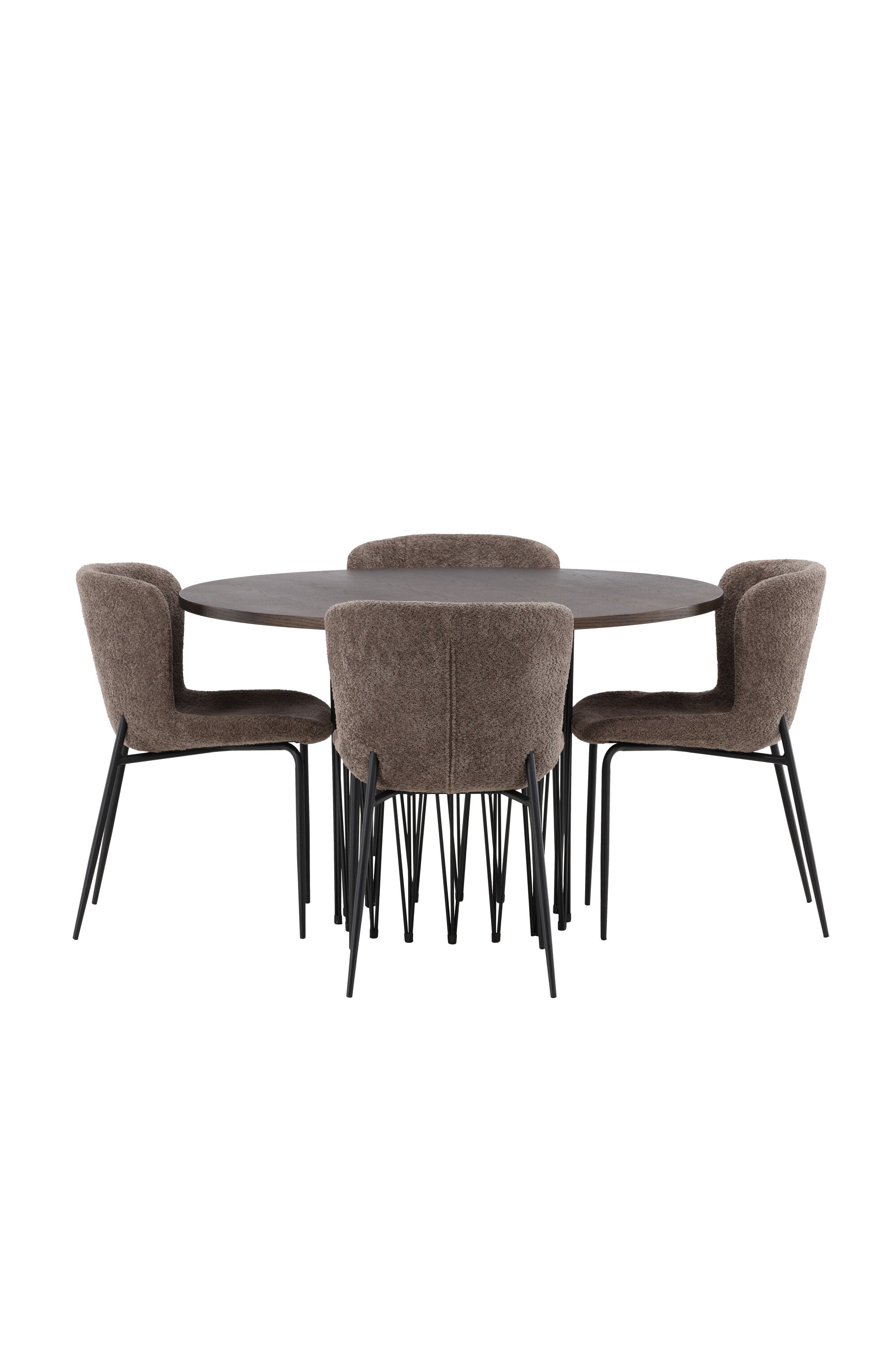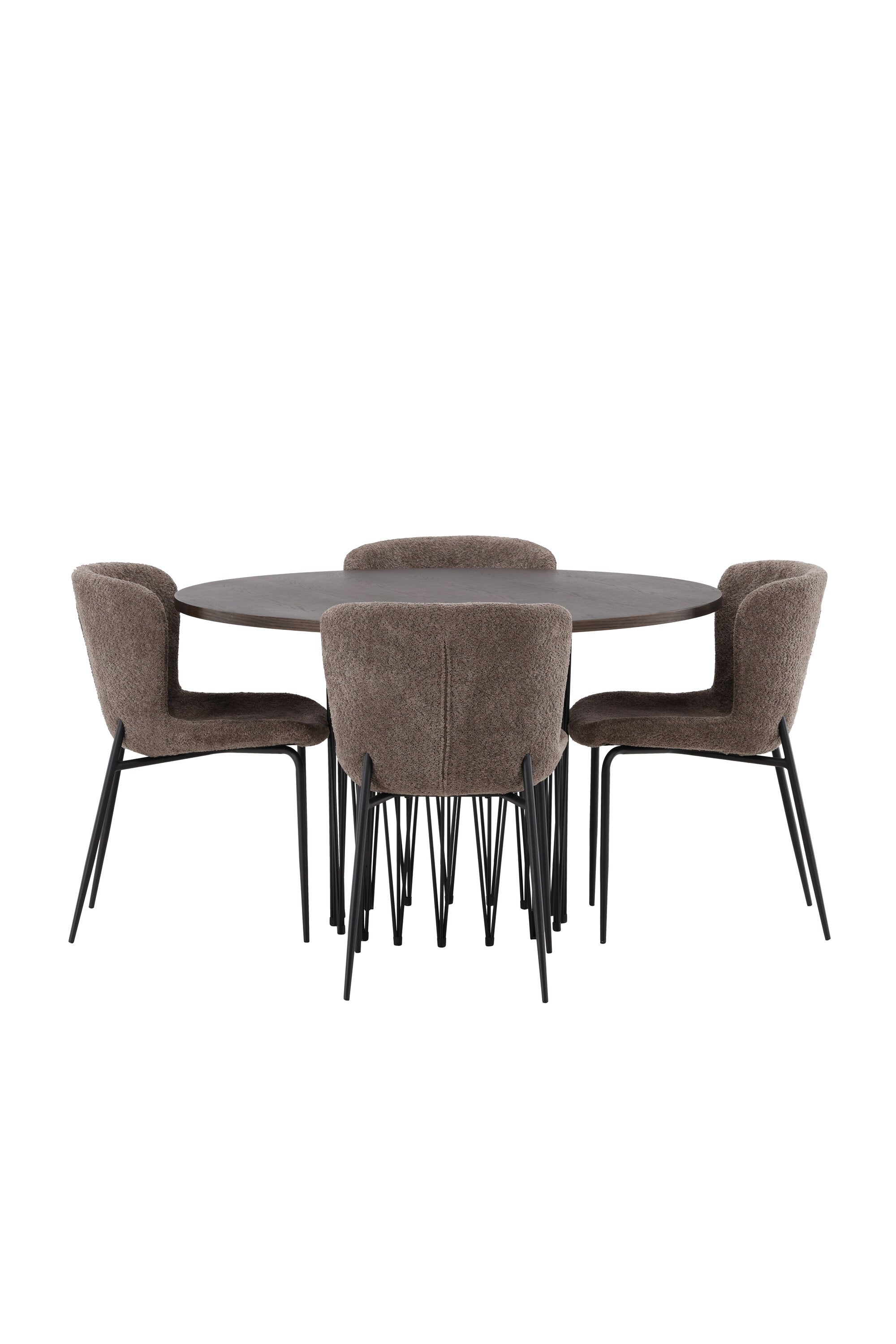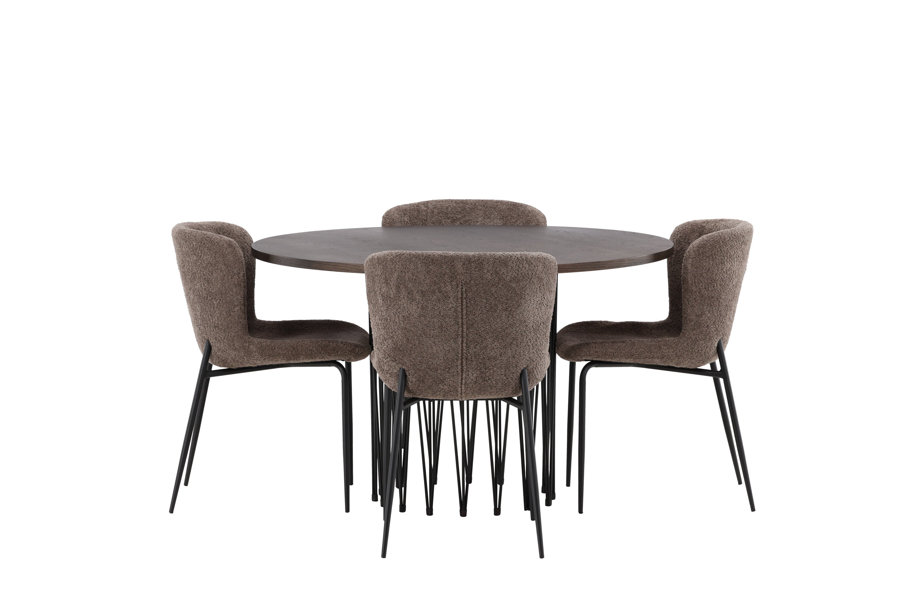Tato jídelní sestava vyzařuje pohodlí, moderní design a elegantní tvary! Náš kulatý jídelní stůl Stone má fantastický skandinávský design, který se hodí k davu. Stůl má krásnou hnědou desku z MDF s dýhou a ozdobný rám ve tvaru válce z černého kovu. Zde v dokonalé kombinaci s našimi pohodlnými jídelními židlemi ze série Modesto. Židle je celočalouněná šedou látkou bouclé se stylovými minimalistickými nohami v černém kovu. Mírně zaoblená záda a čalouněný sedák poskytují extra pohodlí a rozšiřují příjemné jídlo kolem jídelního stolu. Mělo by být příjemné si na chvíli sednout!